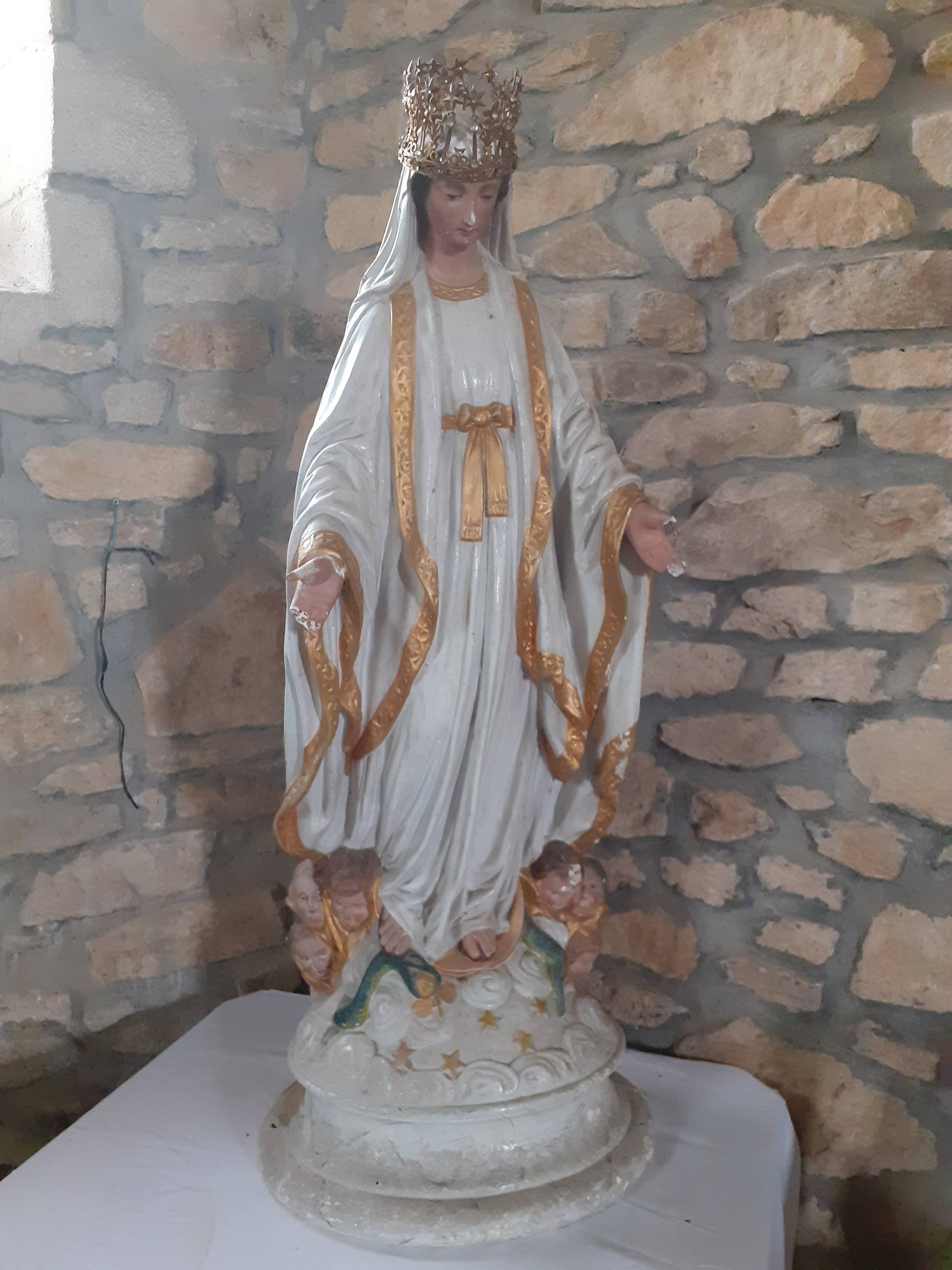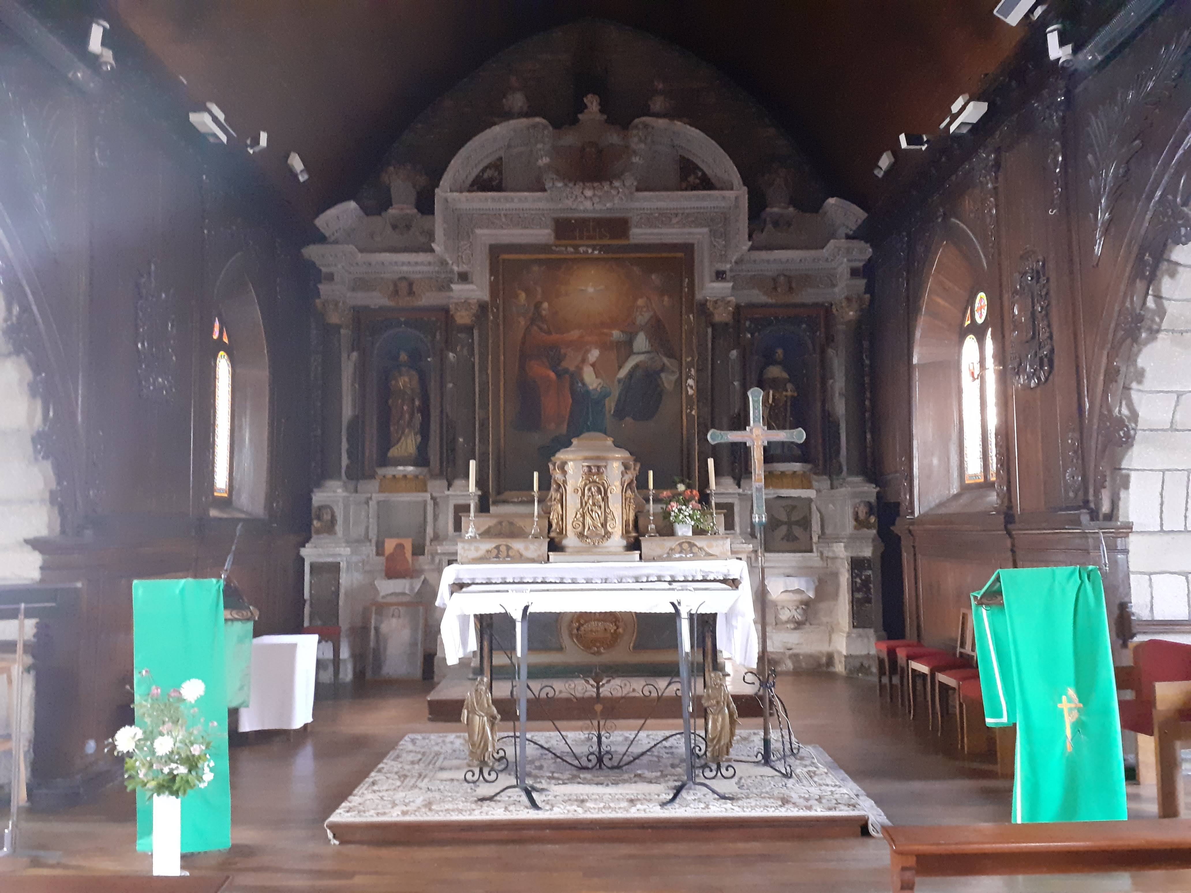 Ptes chapelles, vitraux simples, tribune et quelques tableaux. Beau retable, un léger manque de lumière. Jolie Pietà colorée.