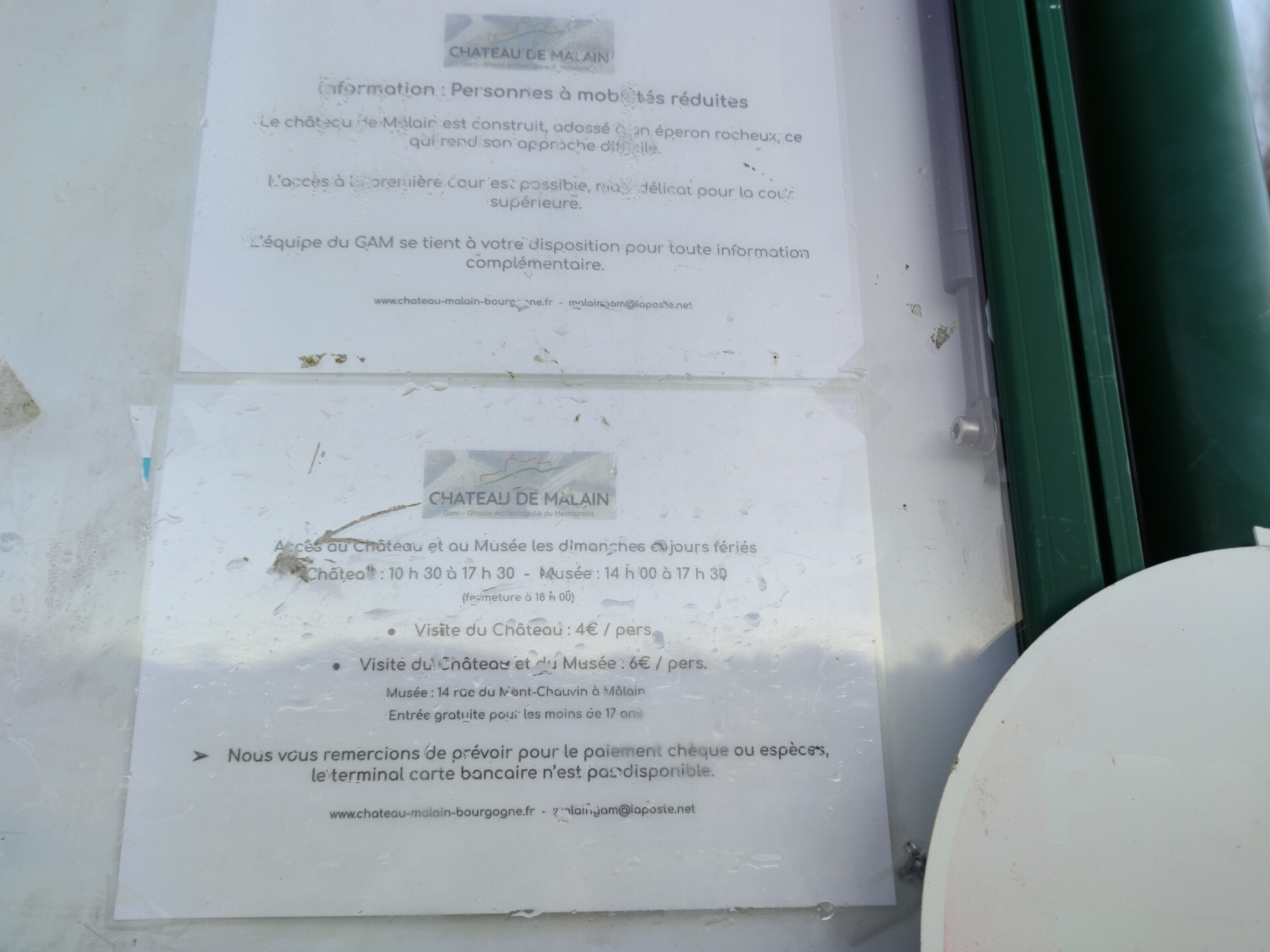 Visite exterieure, fermée.visite du village et un peu de marche pour profiter du soleil que nous n'avions pas à Dijon.retour sur Talant en passant en bas de la colline sur laquelle domine le château de Malain, fermé à cette saison.et retour sur Talant dans un brouillard épais... Bon début d'année à vous tous.