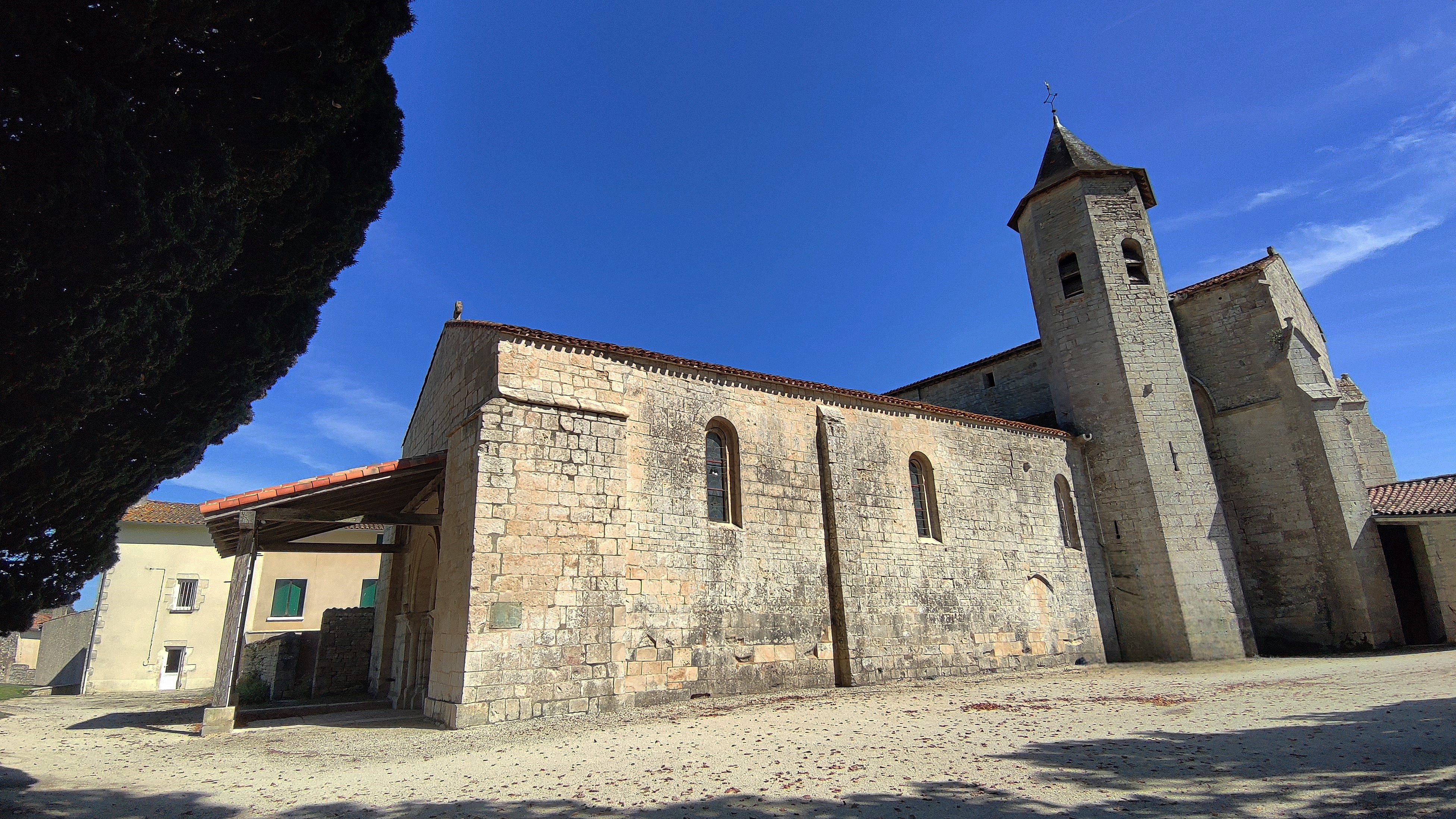 J'ai aimé la visite de cet édifice millénaire, de son austérité émane une forme d'authenticité. On entre à l'Ouest, le portail est protégé par un abri qui invite à la rencontre et à l'échange. Cette église affiche au premier regard diverses époques de construction, la nef est plus basse que les élévations Est du transept et du chœur. La nef du 11è est la partie la plus ancienne, le mur Nord est aveugle, la charpente est apparente. Transept et chœur sont des agrandissements du 15è, ils sont voûtés en croisées d'ogives. Cette église a été fortifiée, son clocher est une belle tour-escalier hexagonale percée d'ouvertures de défense ; il m'a été possible d'aller jusqu'en haut, l'accès à la salle des cloches par une échelle est plus périlleux.