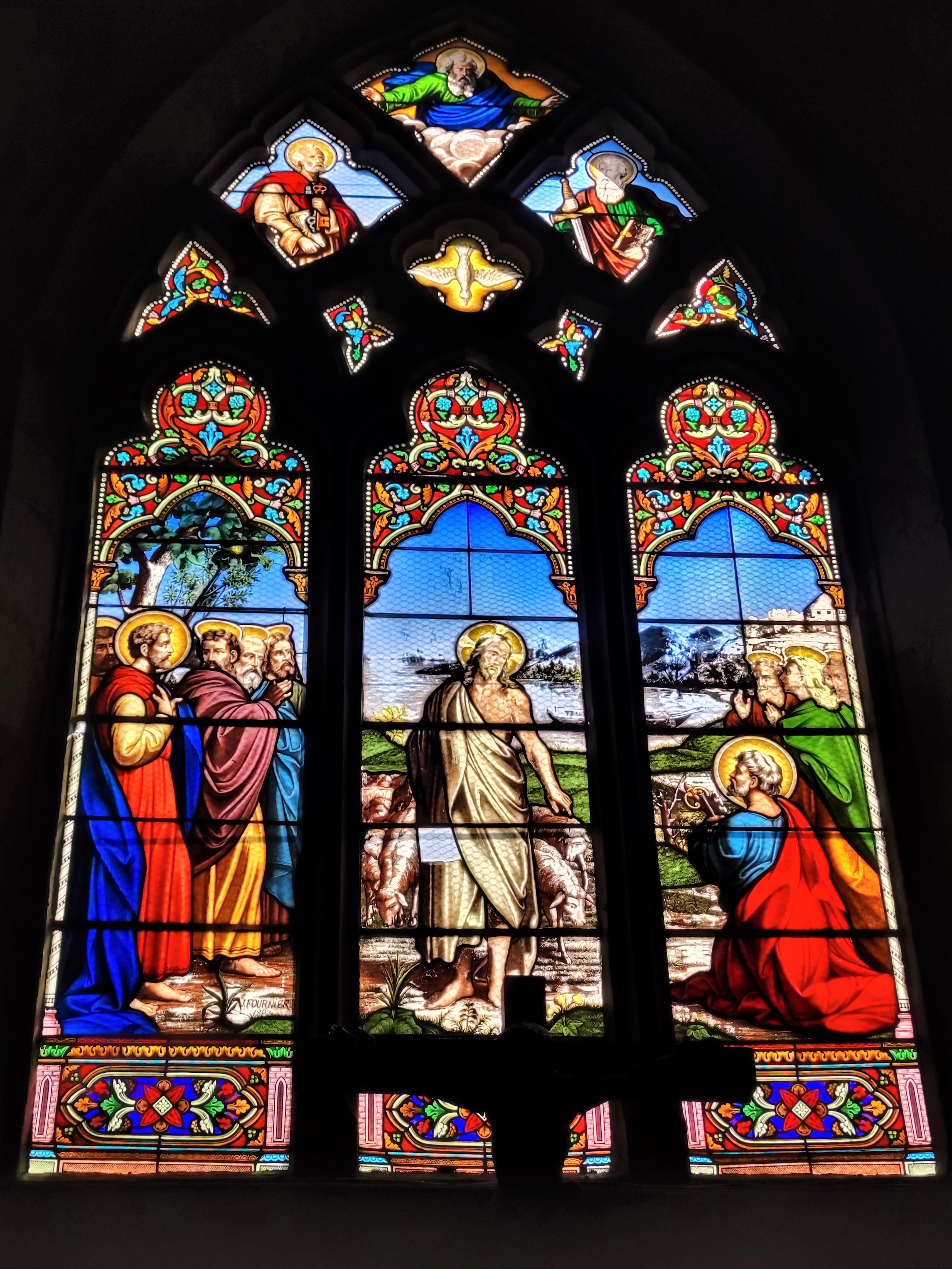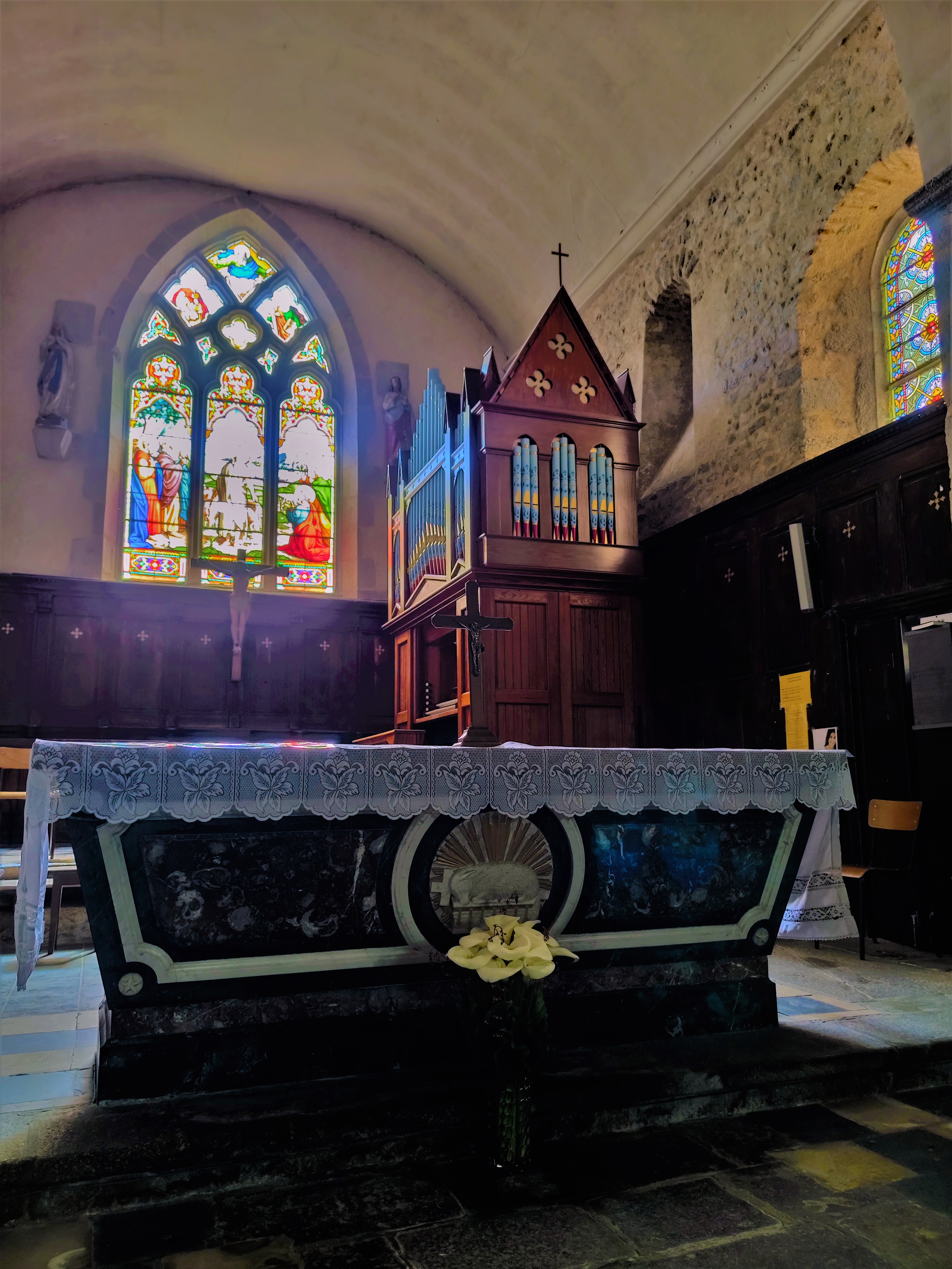 Église installée sur un lieu témoin de 1700 ans d'histoire chrétienne, la voûte en béton m'a choqué. Au 4ème siècle, existait déjà un sanctuaire, Saint-Martin y aurait réalisé quelques miracles. Au 10ème et 11ème siècles, une église fut reconstruite, il reste des vestiges de cette seconde église au niveau du mur Nord de l'église actuelle. Cette dernière a été profondément transformée au 15ème et 16ème et 17ème siècles. Dans sa partie Ouest le clocher a été élevé à ses époques ainsi que le mur gouttereau Sud. Il en fut de même pour la verrière gothique du chœur, à L'Est. Les autels, la statuaire, l'orgue, le christ en croix sont autant d'éléments remarquables, les stalles indiquent que cette église fut une prieurale au début du millénaire. Lieu de culte depuis 1700 ans, l'édifice raconte cette histoire. J'ai été troublé par la voûte en béton de la nef, geste architectural et prouesse technique dans la mode du 20ème siècle, mais d'une laideur insoutenable. Grise et oppressante, elle enlève, à mon avis, une fonction essentielle à cet édifice, qui est de rassembler.