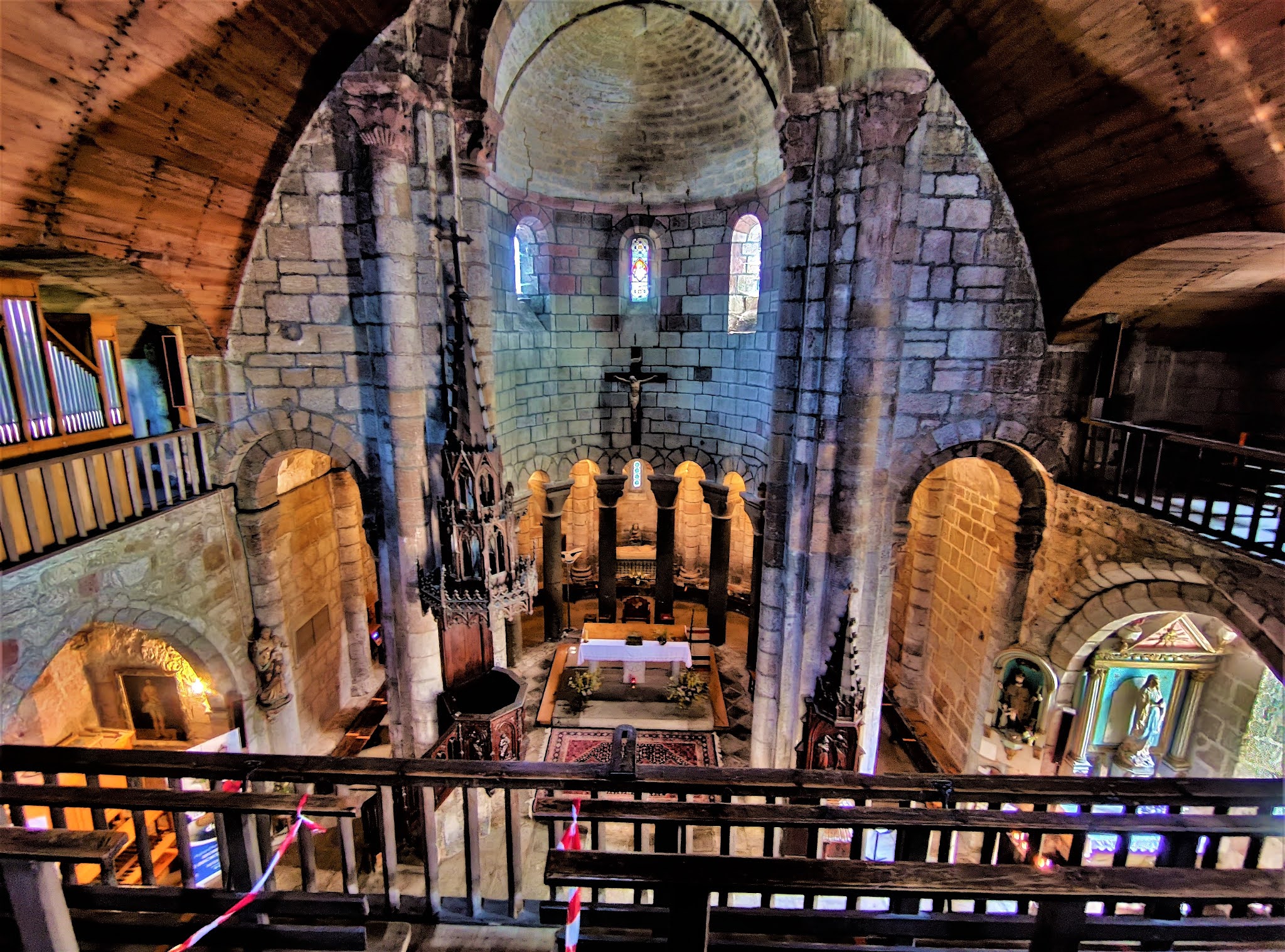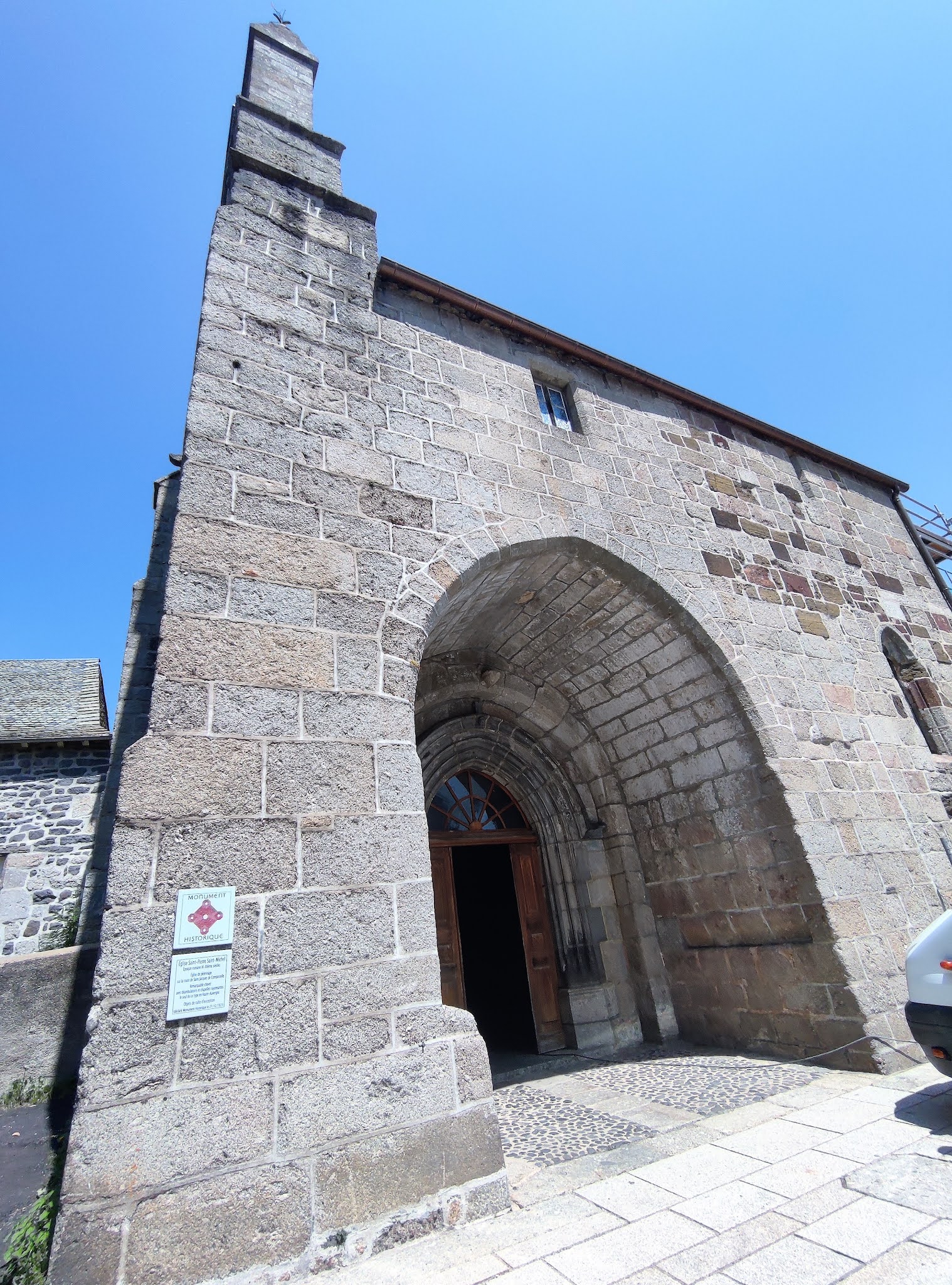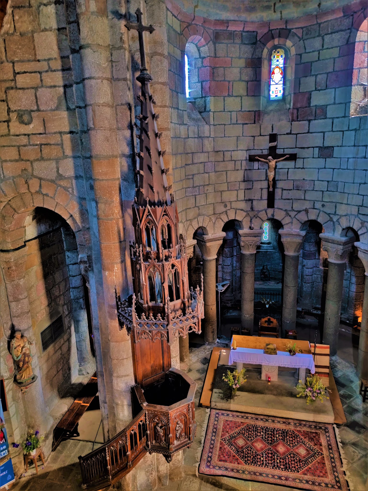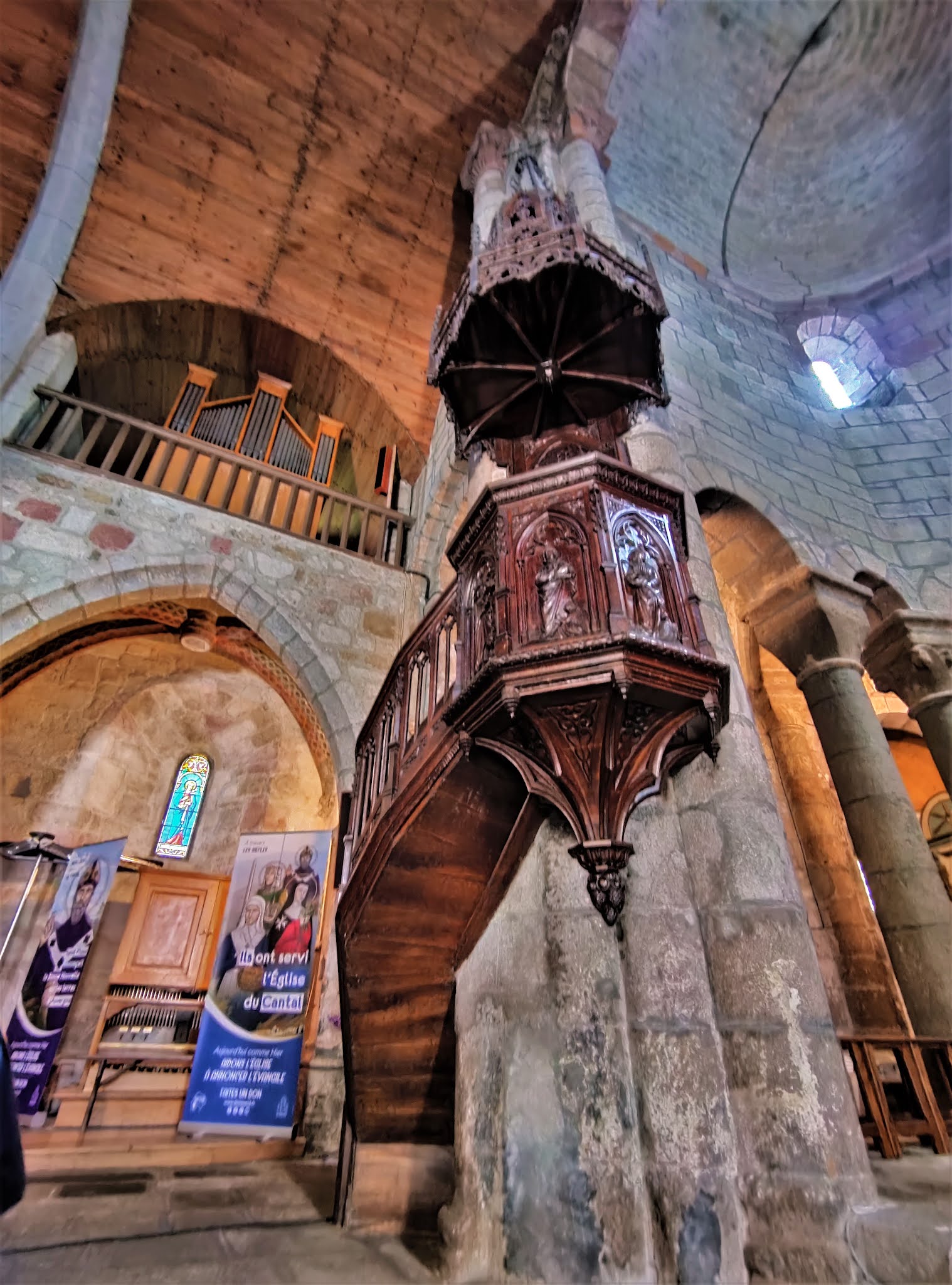 Eglise remarquable, la seule en Haute-Auvergne à posséder un déambulatoire, lieu de pèlerinage sur un des chemins de Compostelle. Elle existait déjà au 11ème siècle, la partie Est, chœur, déambulatoire, chapelles rayonnantes et chevet datent de cette époque. la nef, construite au 14ème et 15ème siècle, est plus large que longue, elle est complétée d'une chapelle au Nord. La vue depuis la tribune permet de mieux visualiser l'ensemble de l'église, l'architecture singulière reflète son usage d'accueillir des pèlerins. Les chapelles rayonnantes abritent des choses intéressantes, les découvrir m'a enthousiasmé, particulièrement la magnifique Piéta en pierre polychrome. L'architecture du sanctuaire et du déambulatoire est somptueuse. Dans ces parties romanes, la disposition des pierres de 2 couleurs, les décors, les voûtes, tout cela est mis en valeur par de superbes éclairages. Les vitraux apportent une touche de couleurs supplémentaires. Une visite s'impose dans cet édifice presque millénaire, construit dans un village de montagne ou le rude climat a forgé les tempéraments.
