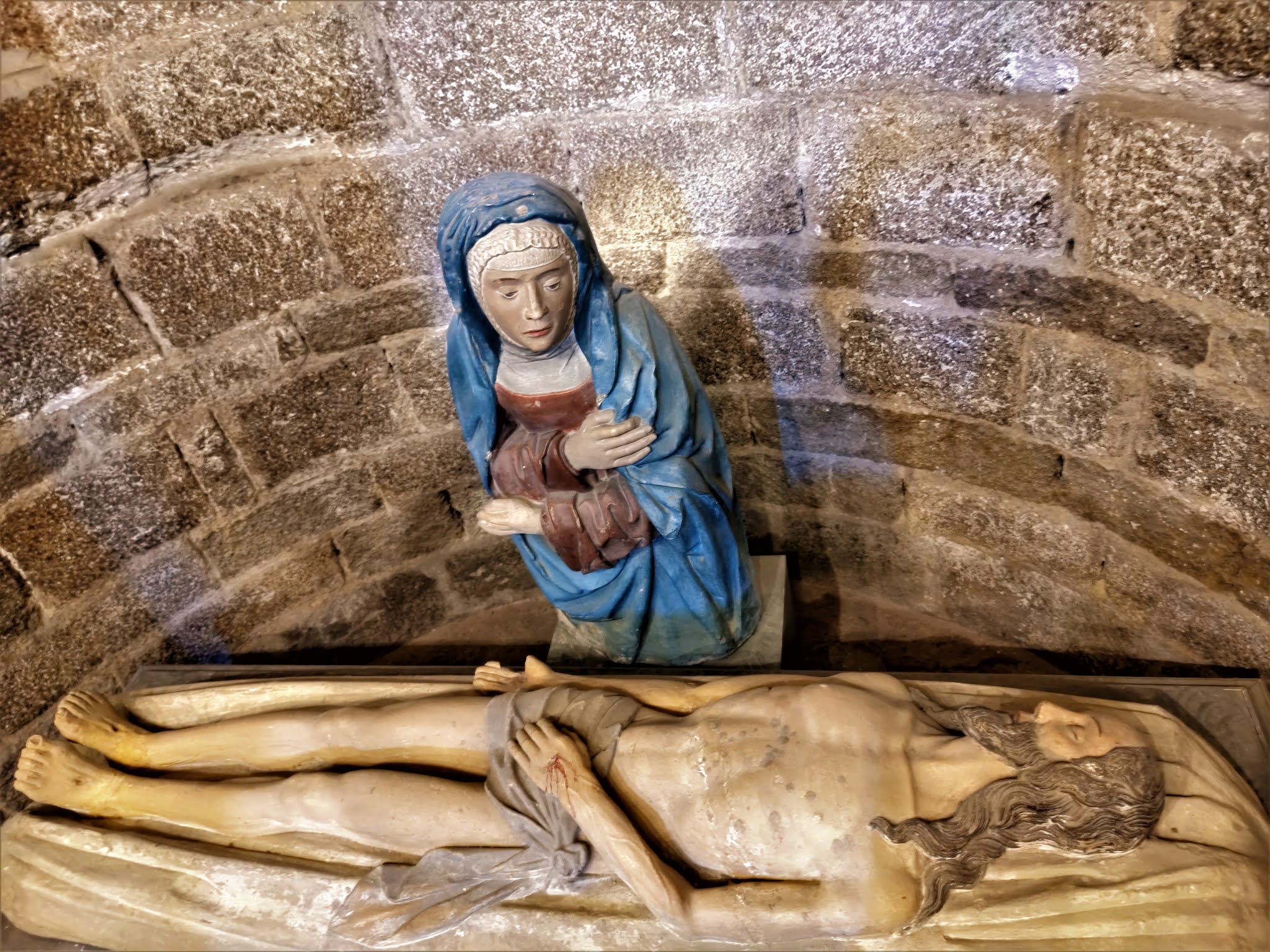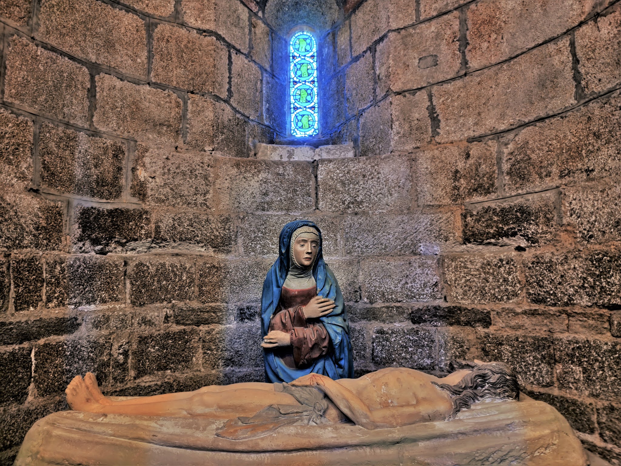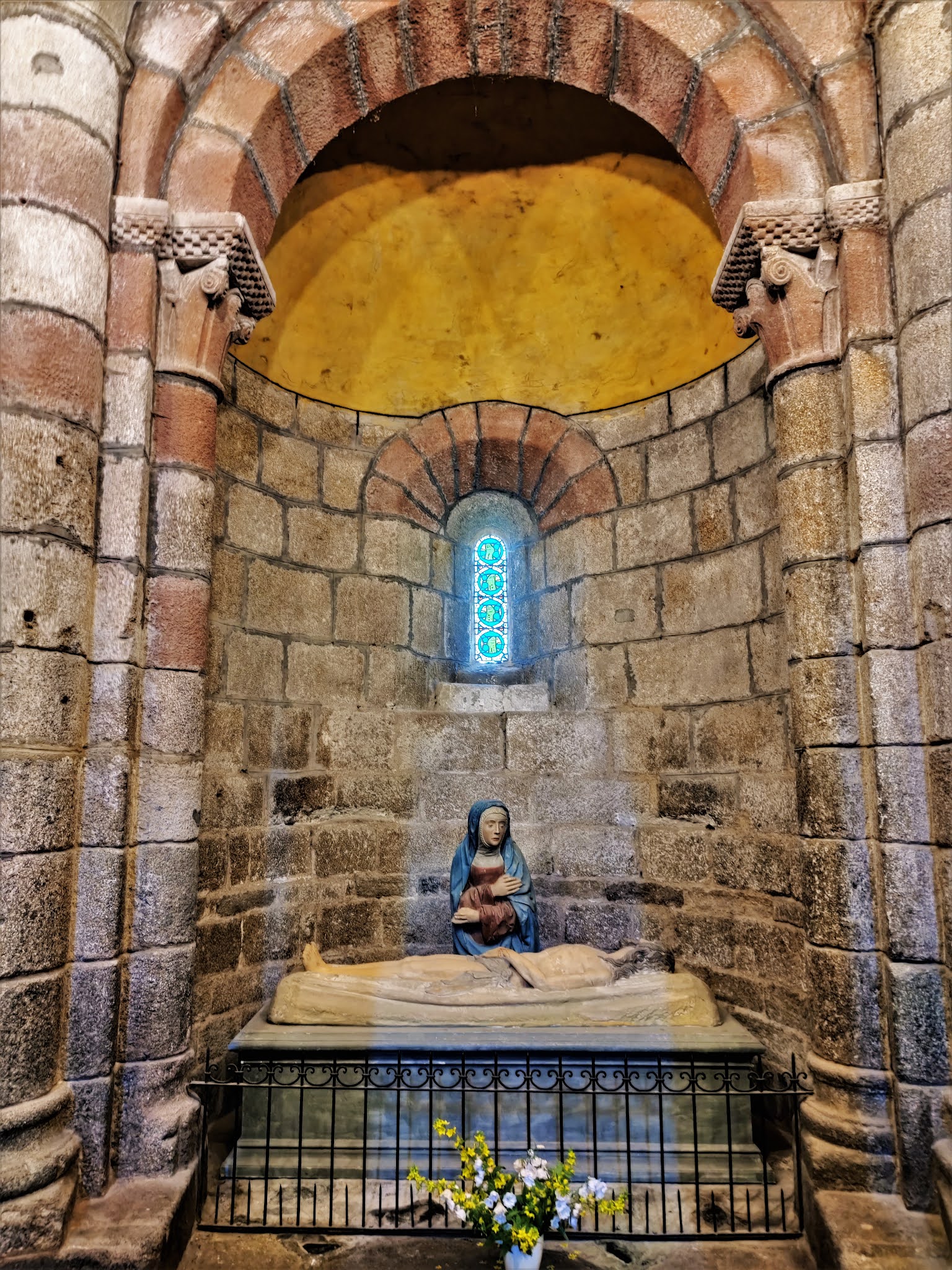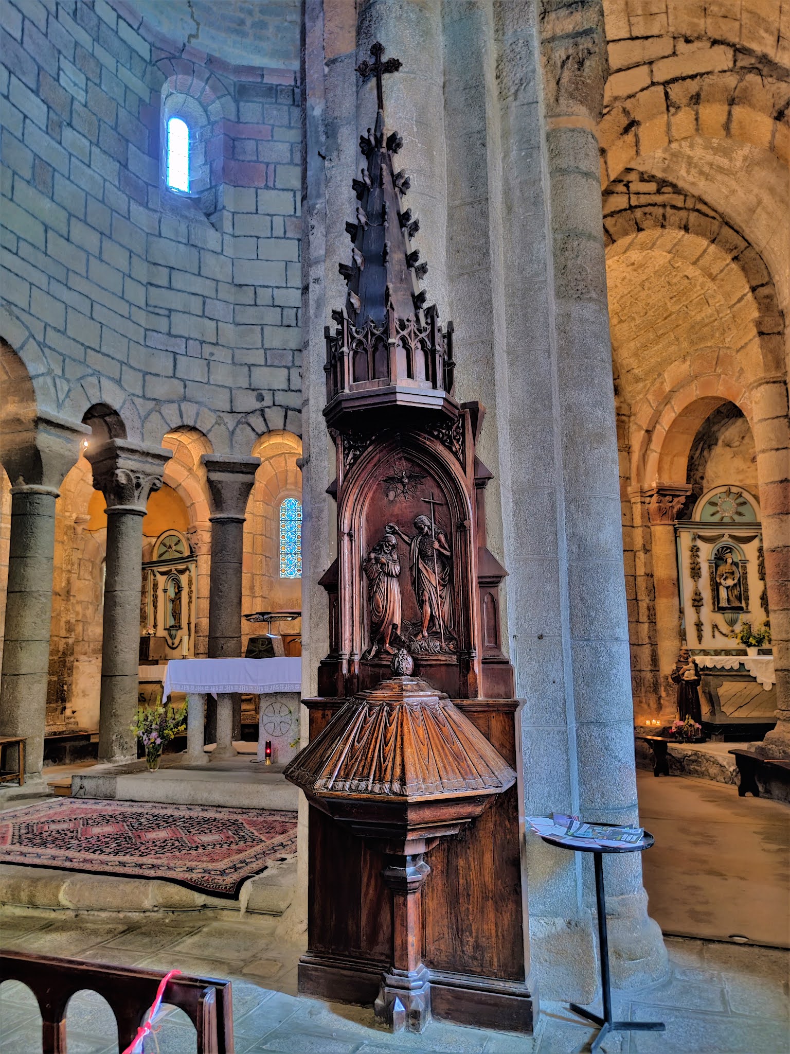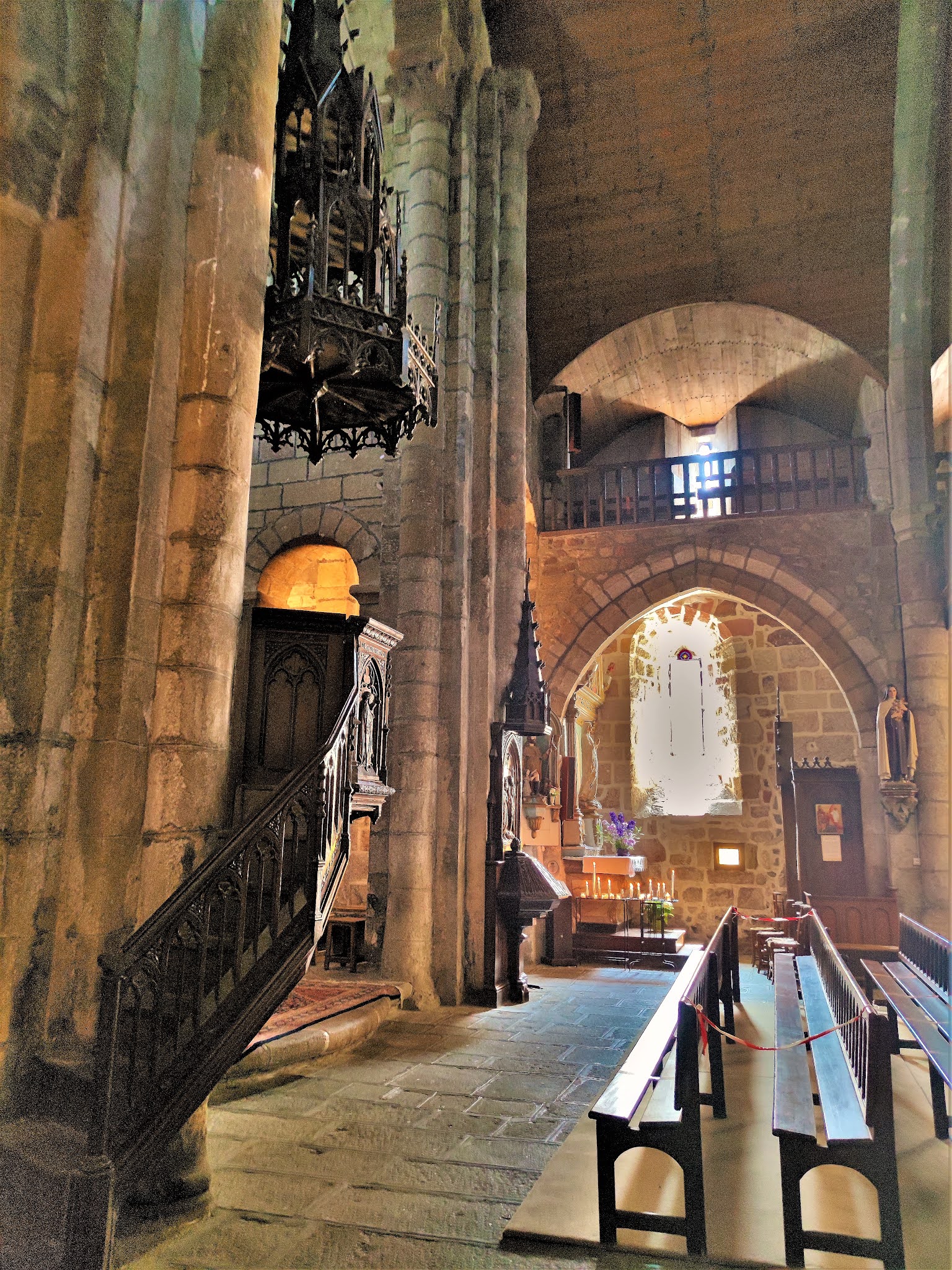 Eglise remarquable, la seule en Haute-Auvergne à posséder un déambulatoire, lieu de pèlerinage sur un des chemins de Compostelle. Elle existait déjà au 11ème siècle, la partie Est, chœur, déambulatoire, chapelles rayonnantes et chevet datent de cette époque. la nef, construite au 14ème et 15ème siècle, est plus large que longue, elle est complétée d'une chapelle au Nord. La vue depuis la tribune permet de mieux visualiser l'ensemble de l'église, l'architecture singulière reflète son usage d'accueillir des pèlerins. Les chapelles rayonnantes abritent des choses intéressantes, les découvrir m'a enthousiasmé, particulièrement la magnifique Piéta en pierre polychrome. L'architecture du sanctuaire et du déambulatoire est somptueuse. Dans ces parties romanes, la disposition des pierres de 2 couleurs, les décors, les voûtes, tout cela est mis en valeur par de superbes éclairages. Les vitraux apportent une touche de couleurs supplémentaires. Une visite s'impose dans cet édifice presque millénaire, construit dans un village de montagne ou le rude climat a forgé les tempéraments.