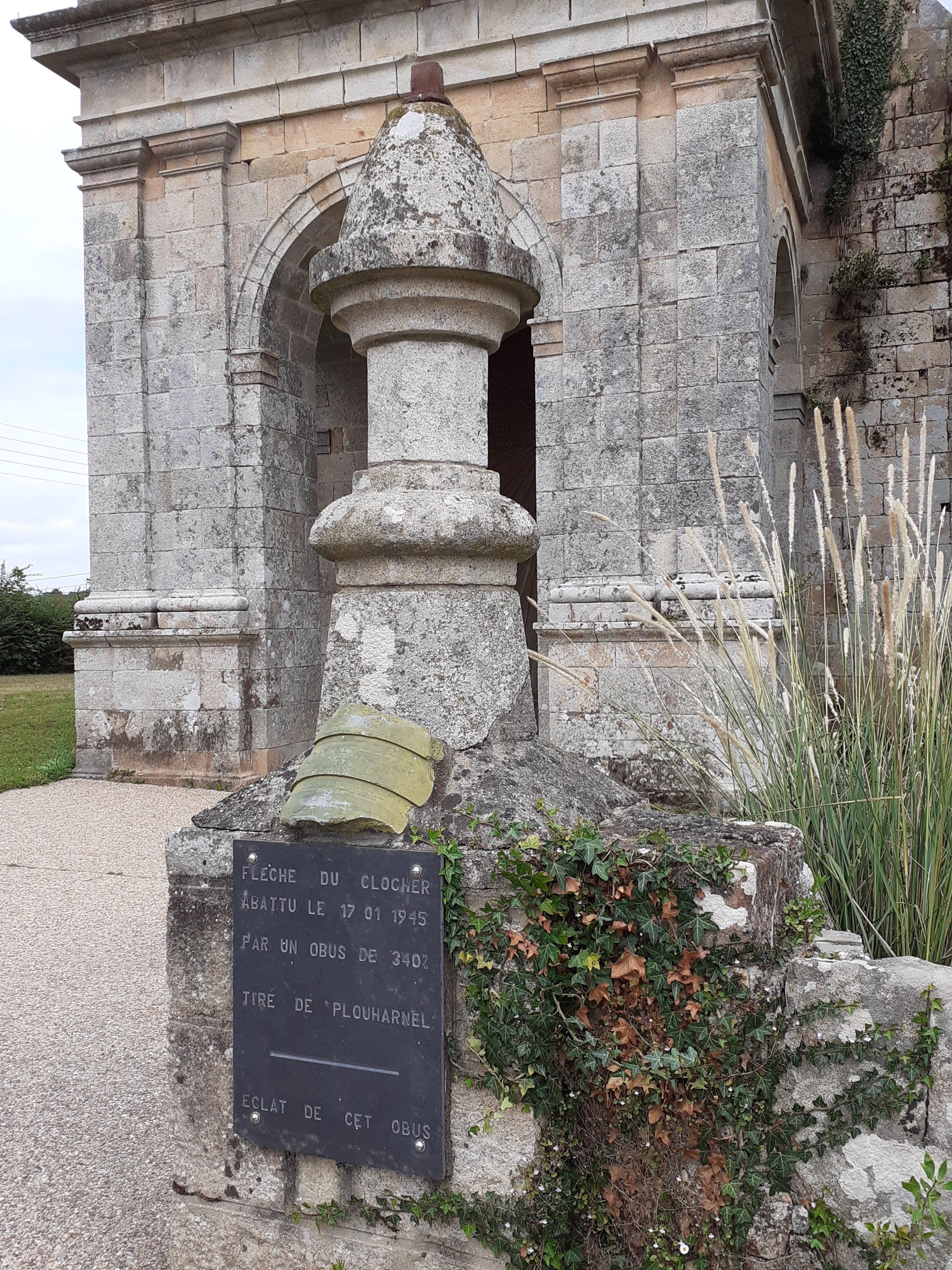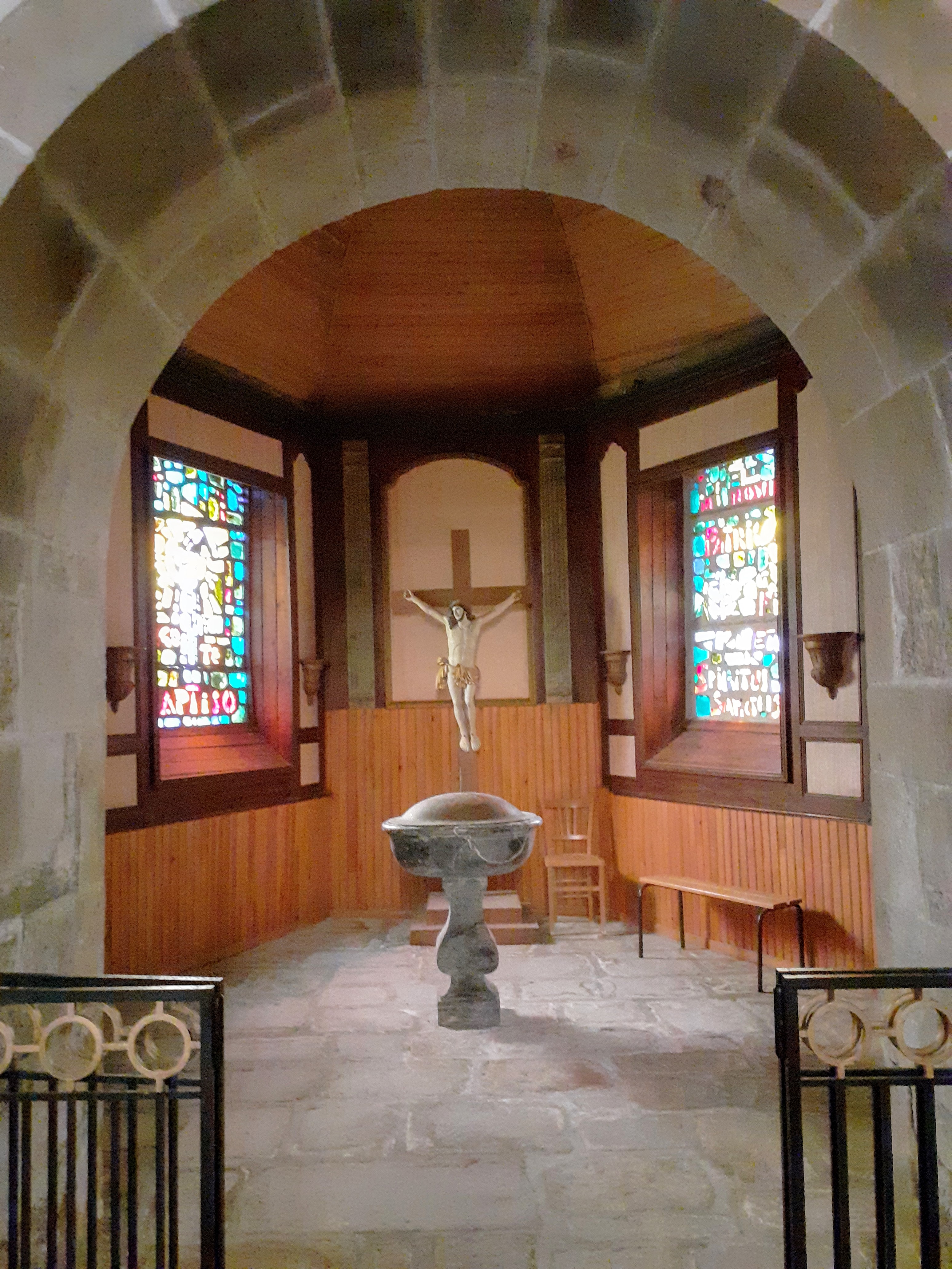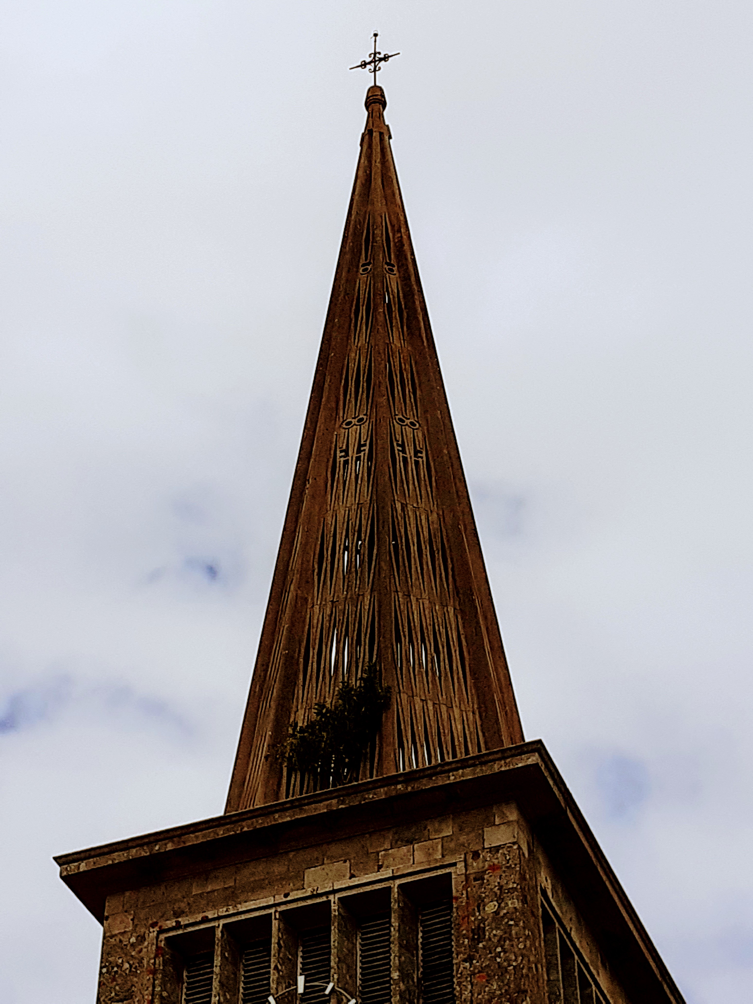 Un intérieur très somble, et malheureusement je n'y ai pas trouvé la lumière . Clocher flèche, très particulier. Jolis vitraux, ciment.