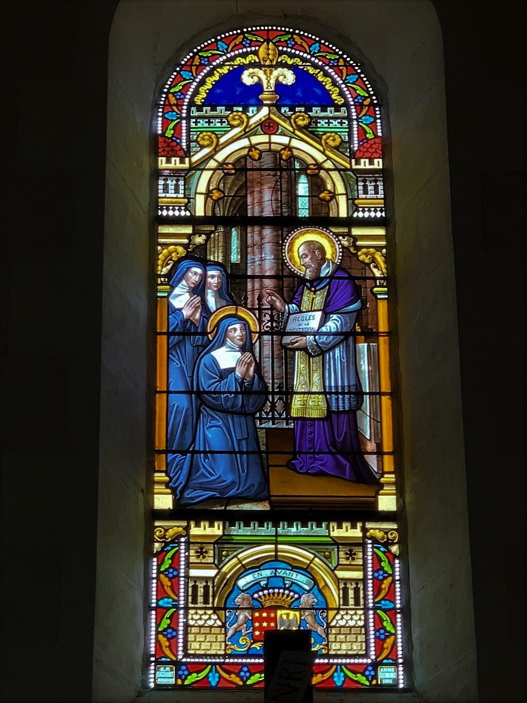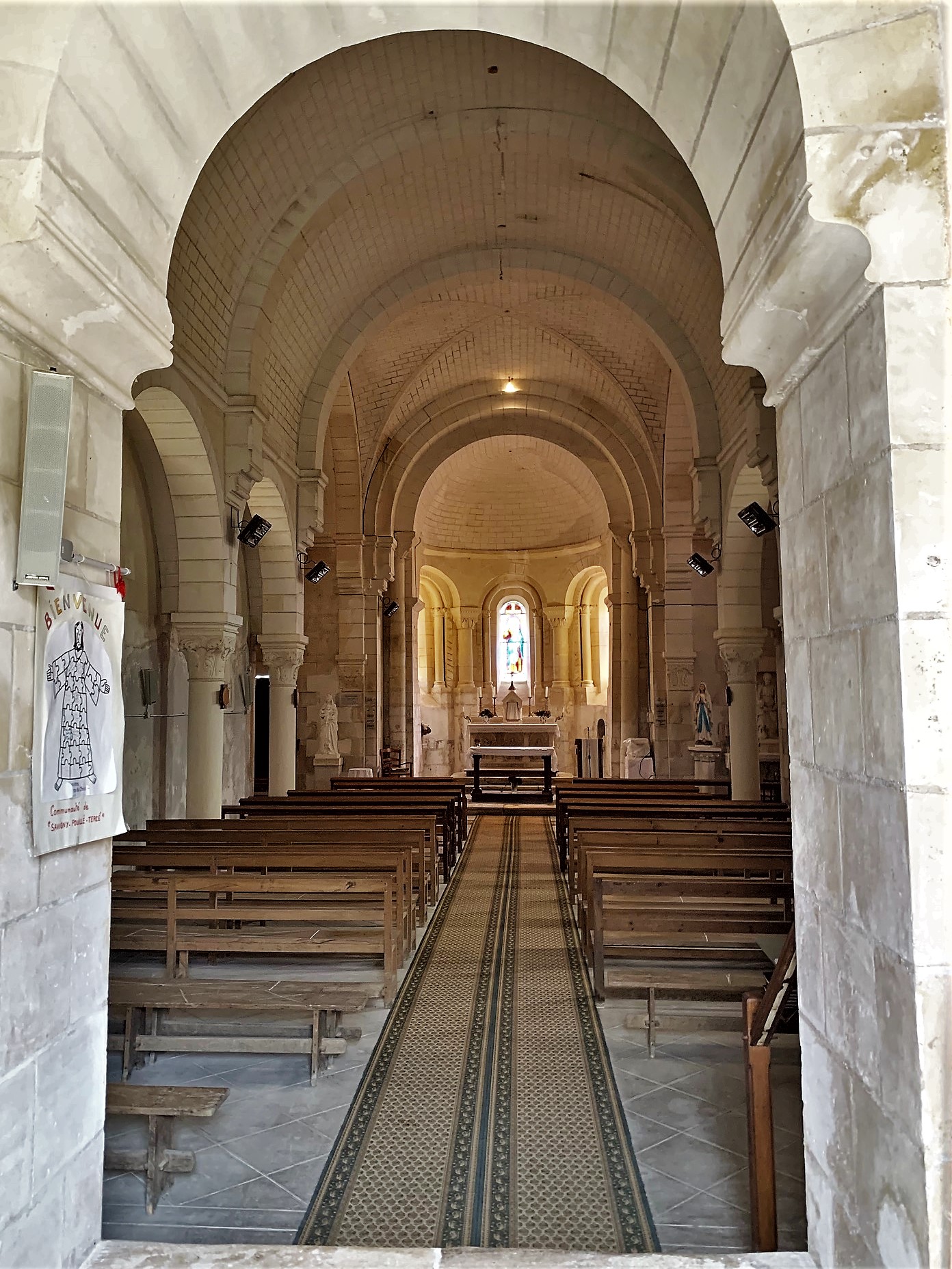 L'église Saint-Pierre et Saint-Paul est accueillante et témoigne de la longue histoire de la paroisse. Le chevet, le chœur, ses chapiteaux sculptés et ses trois élégantes ouvertures, sont les vestiges de l'église primitive du 12ème siècle. Reconstruite au 19ème siècle dans le style néo-roman, on pénètre par un clocher-porche dans une nef à trois travées voûtées en berceaux. Cette voûte repose sur des colonnes qui sont distantes des murs de quelques centimètres. 11 vitraux, offerts par des personnalités, éclairent joliment l'église, ils représentent une impressionnante collection de saints. Témoignages de l'esprit dominant des milieux religieux de la fin du 19ème siècle, ils portent des armoiries. De l'Est à l'Ouest, on trouve une voûte en demie coupole dans le sanctuaire, des voûtes en berceaux dans les bras du transept, une voûte d'arrêtes dans la croisée, et des voûtes en berceaux dans la nef. Remarque : Le nom de la cité peut s'écrire aujourd'hui de deux façons différentes, Savigny-Lévescault ou Savigny-l'Évescault. Au cours du dernier millénaire, le nom a évolué : en l'an 1000, Saviniacum, puis en 1100, Saviniaco, ensuite en 1793, Savigny Levescault, et enfin en 1801, Savigny-Lévescault.