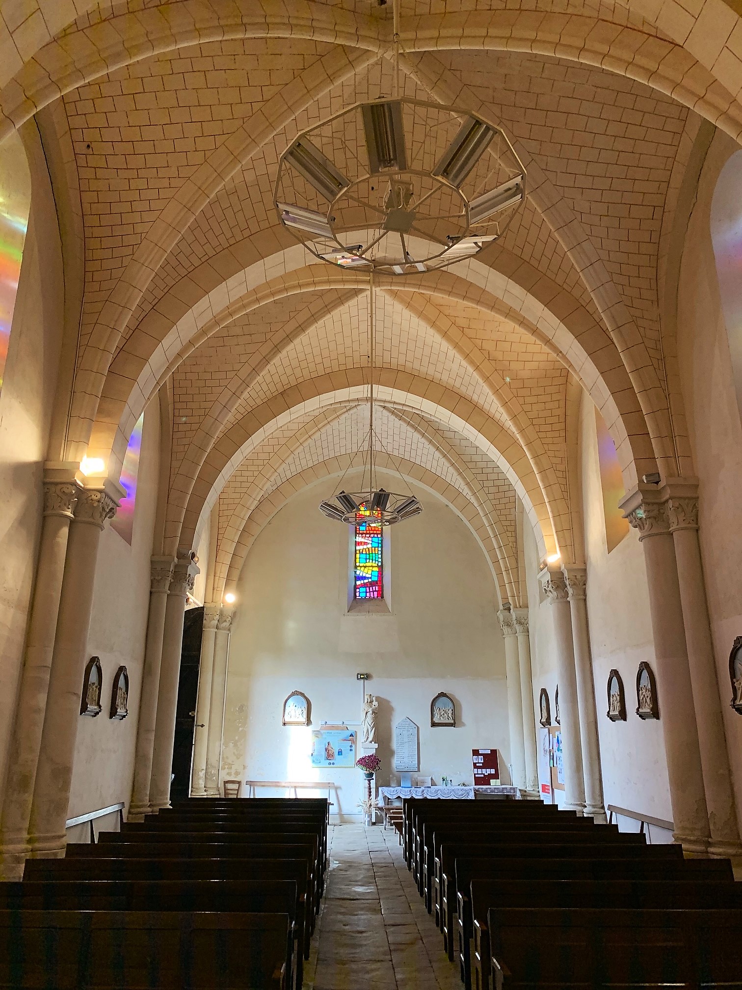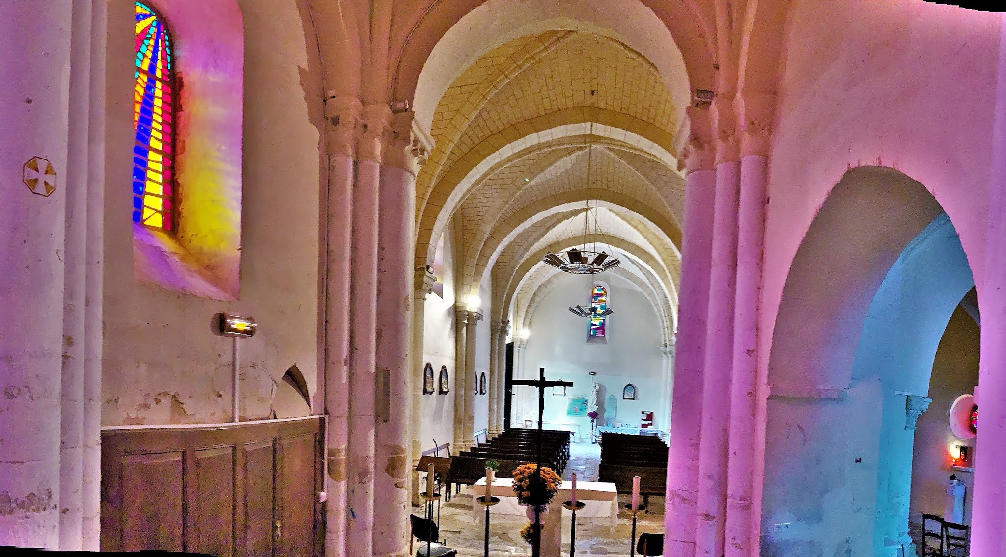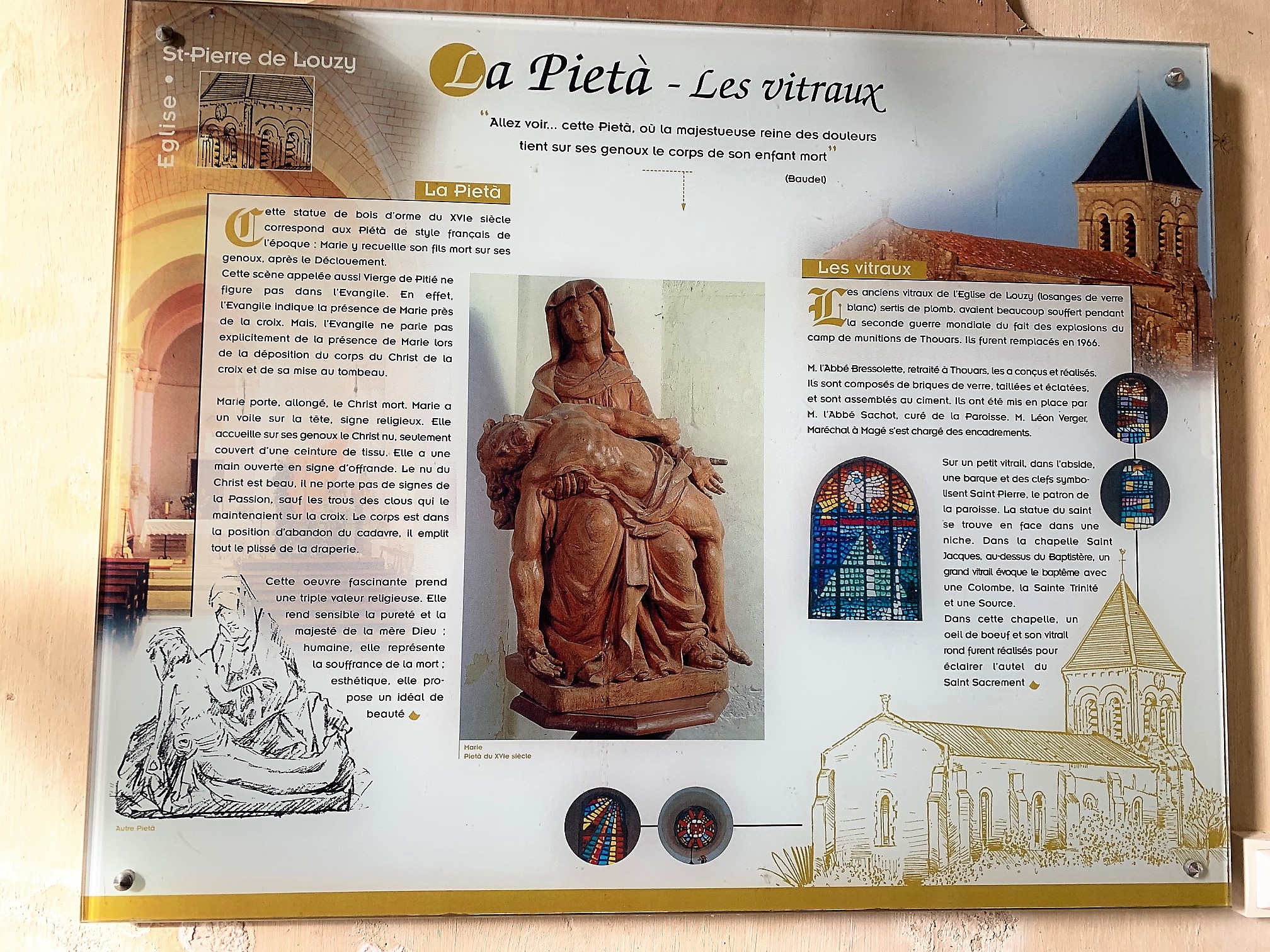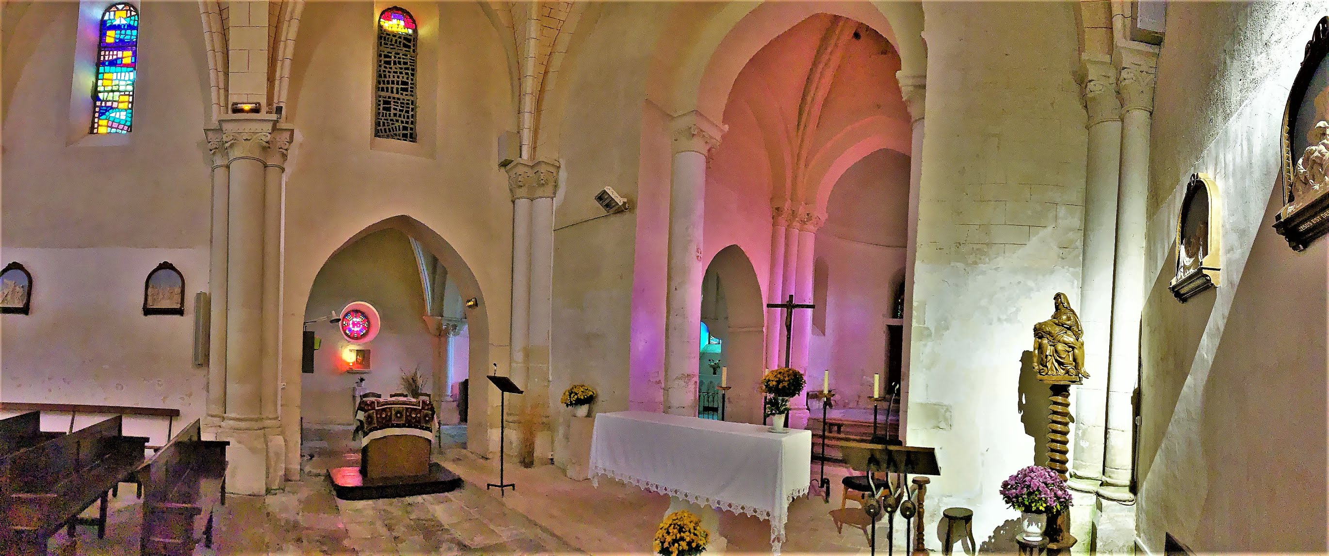 Une église simple, joliment éclairée, située près d'un pigeonnier, le cadre est charmant. L'édifice a été mis en valeur au centre du village, la place et et les constructions proches ont bénéficié de l'attention et des soins des responsables locaux. Pour visiter l'église, il faut s'adresser à la mairie, située à 200 m, une personne vous redirigera vers le détenteur des clefs. En fait, cela est très simple, la dame de la mairie est courtoise et efficace, le détenteur abrite tout près de l'église. Cette dernière fut construite au 12ème, souvent remaniée, elle a gardé, son clocher, son chœur et son abside du bâtiment primitif. Des vitraux modernes, en dalles de verre retaillées, éclairent de façon intéressante et colorée la nef. Une chapelle, consacrée à Saint-Jacques, est de belle importance, cet édifice était une étape importante pour les pèlerins sur la route de Saint-Jacques-de-Compostelle. Le clocher, restauré au 19ème, est situé au dessus du chœur, ce dernier est prolongé à l'est par l'abside. A l'entrée du chœur, une pietà du 16ème, en bois d'orme, restaurée et magnifique est l'objet prestigieux de cette église.