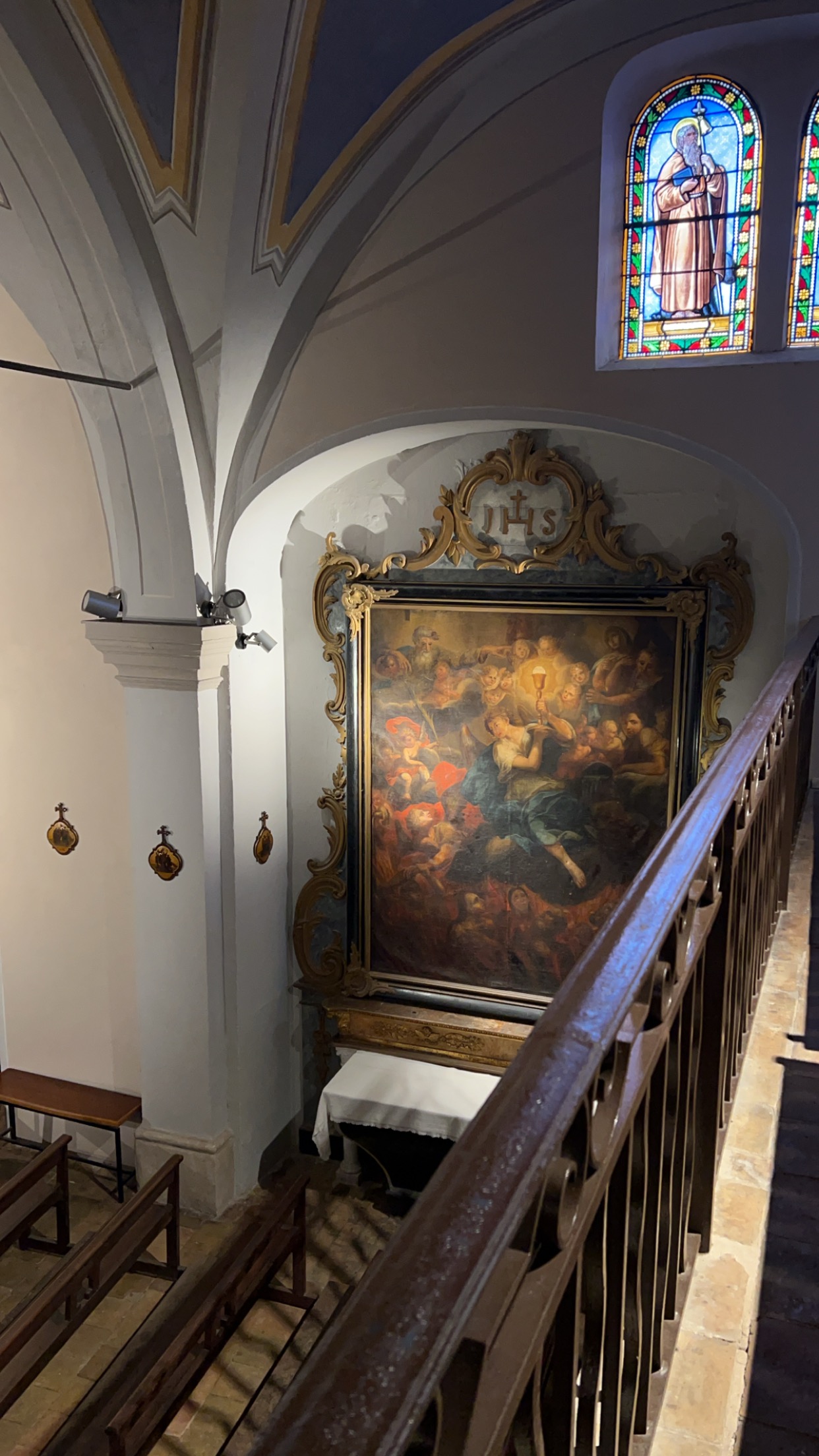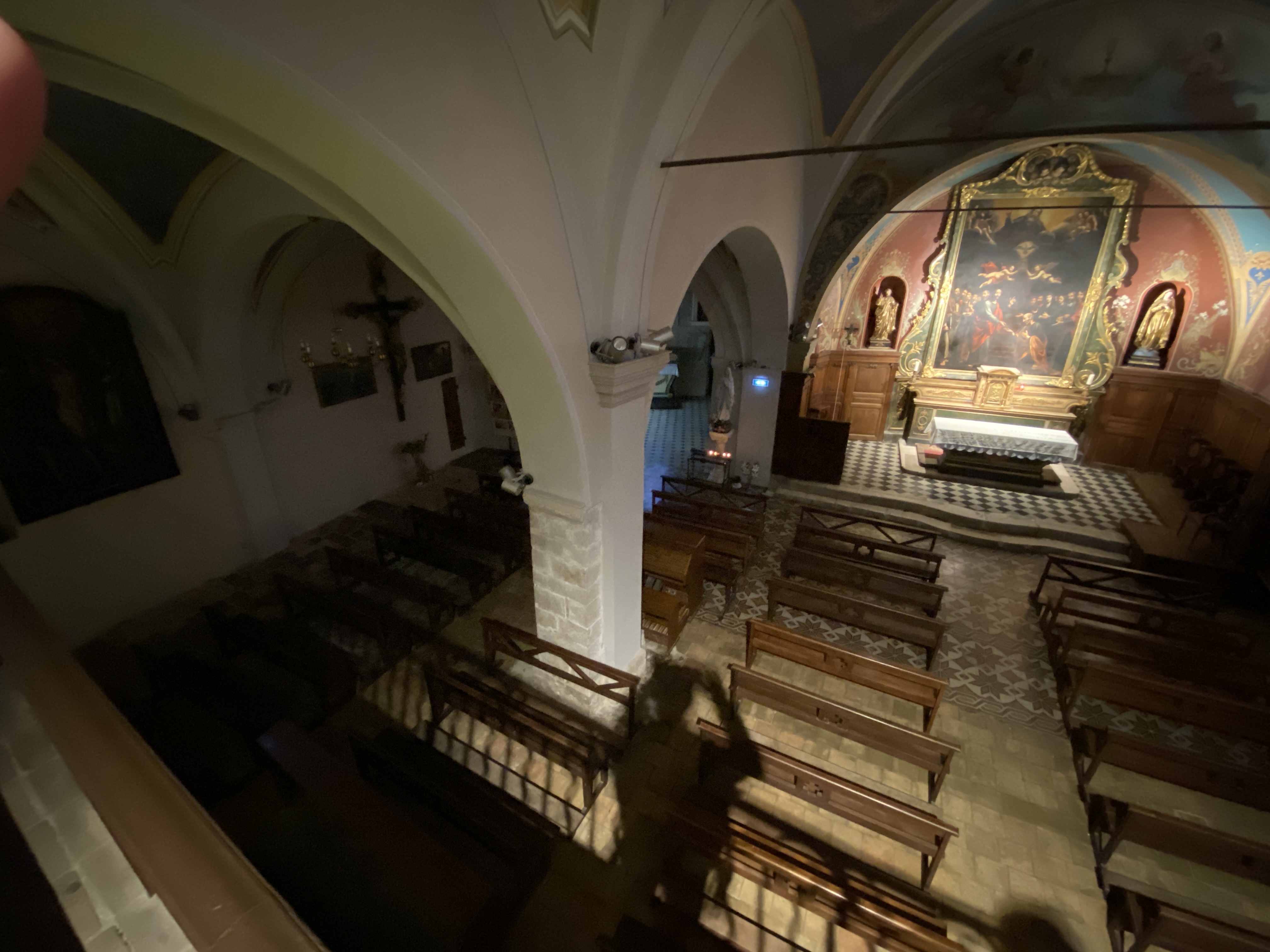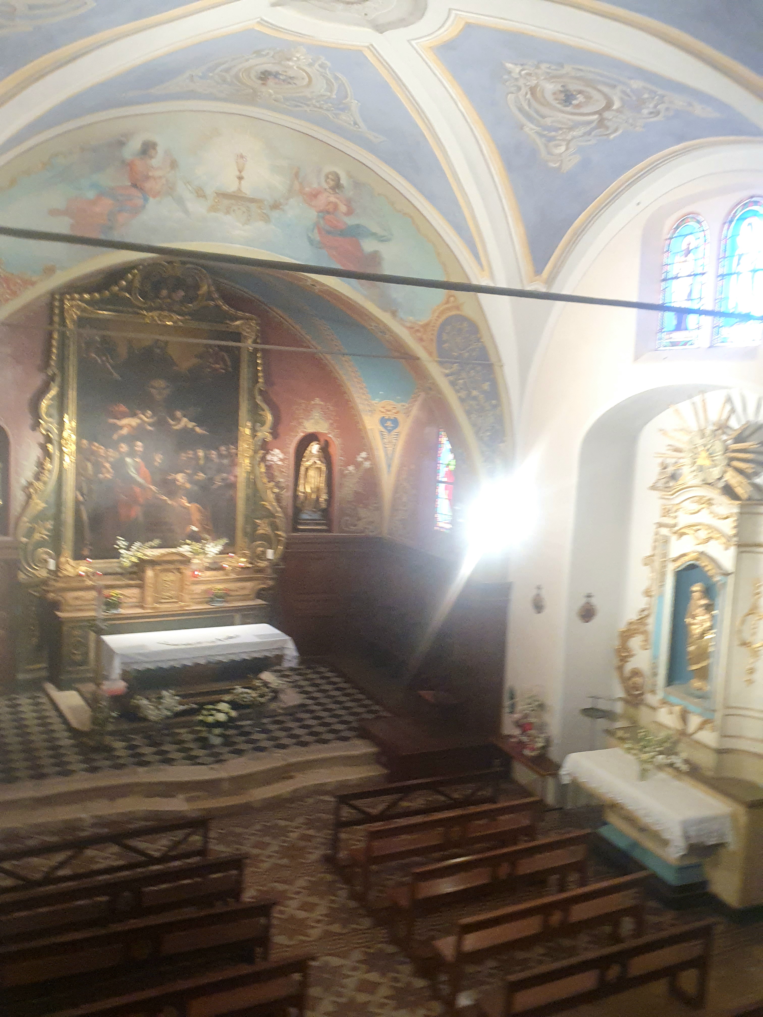 C'est l'une des églises les plus particulières que j'ai jamais vues : on entre par le haut puis on descend un escalier pour accéder aux deux nefs de l'église. C'est surprenant. Ça vaut vraiment le détour. DESCRIPTION L'église actuelle date du XVIIIe siècle. Façade très simple, précédée d'une toiture en bois. L'intérieur est divisé en 2 nefs, de style néoclassique avec des œuvres et fresques du XVIIIe siècle. Entrée libre.