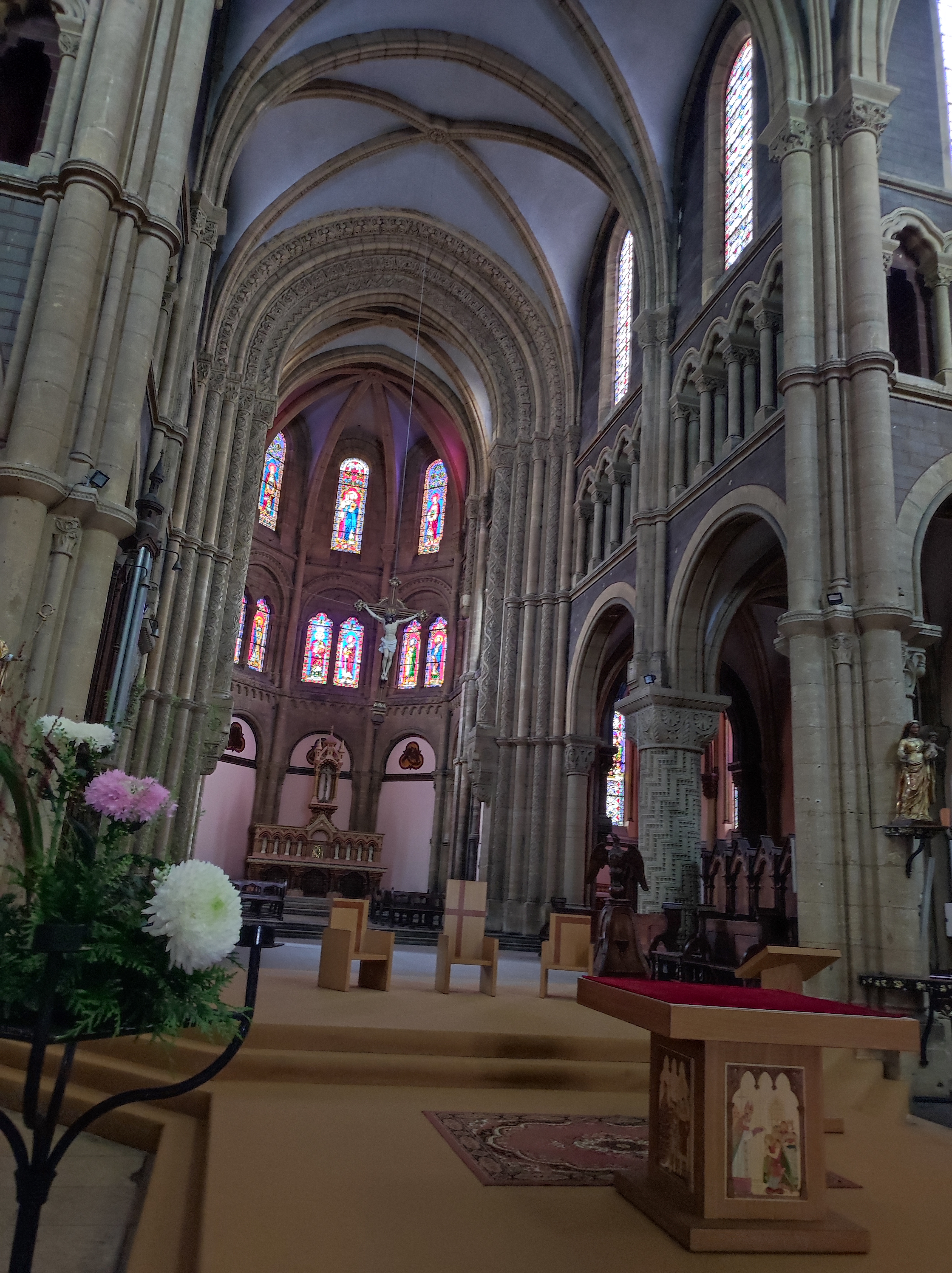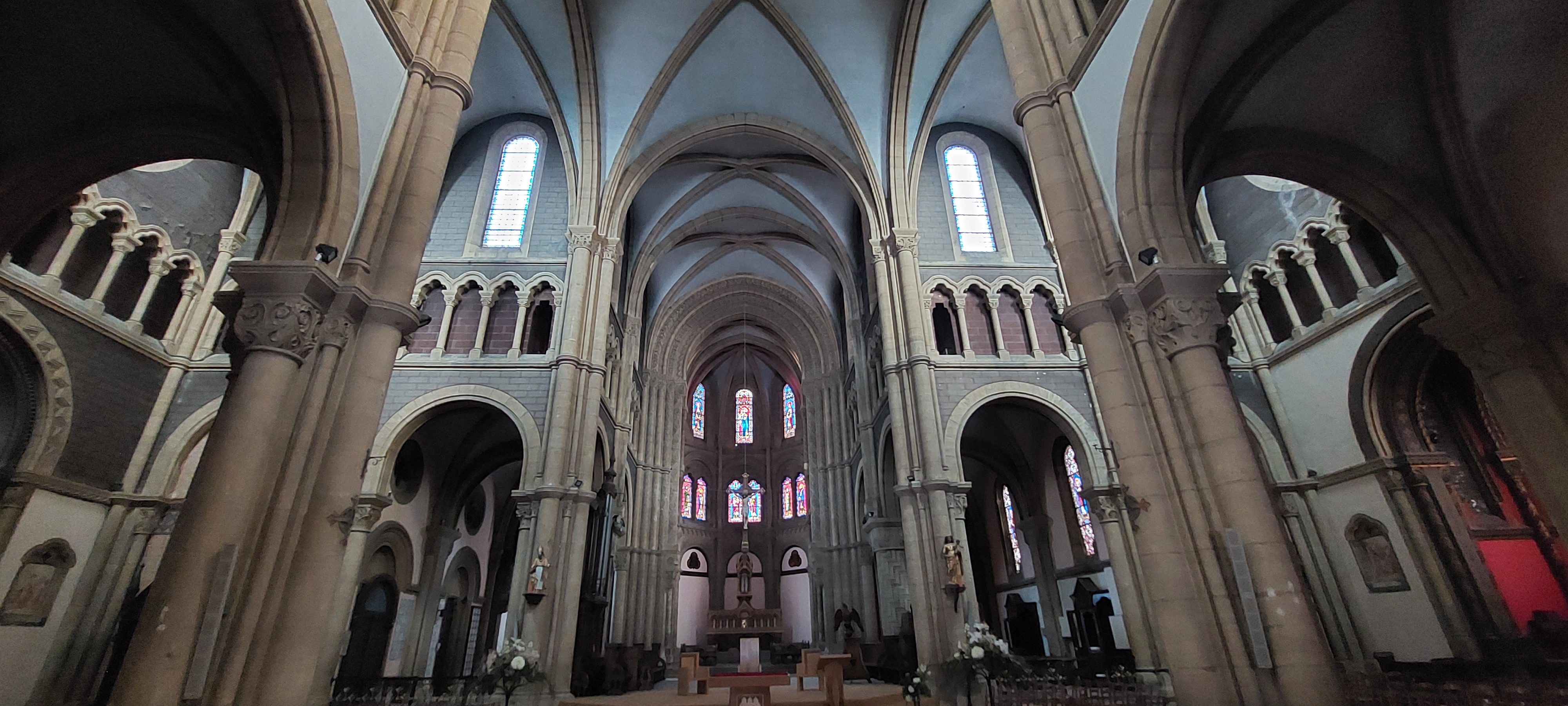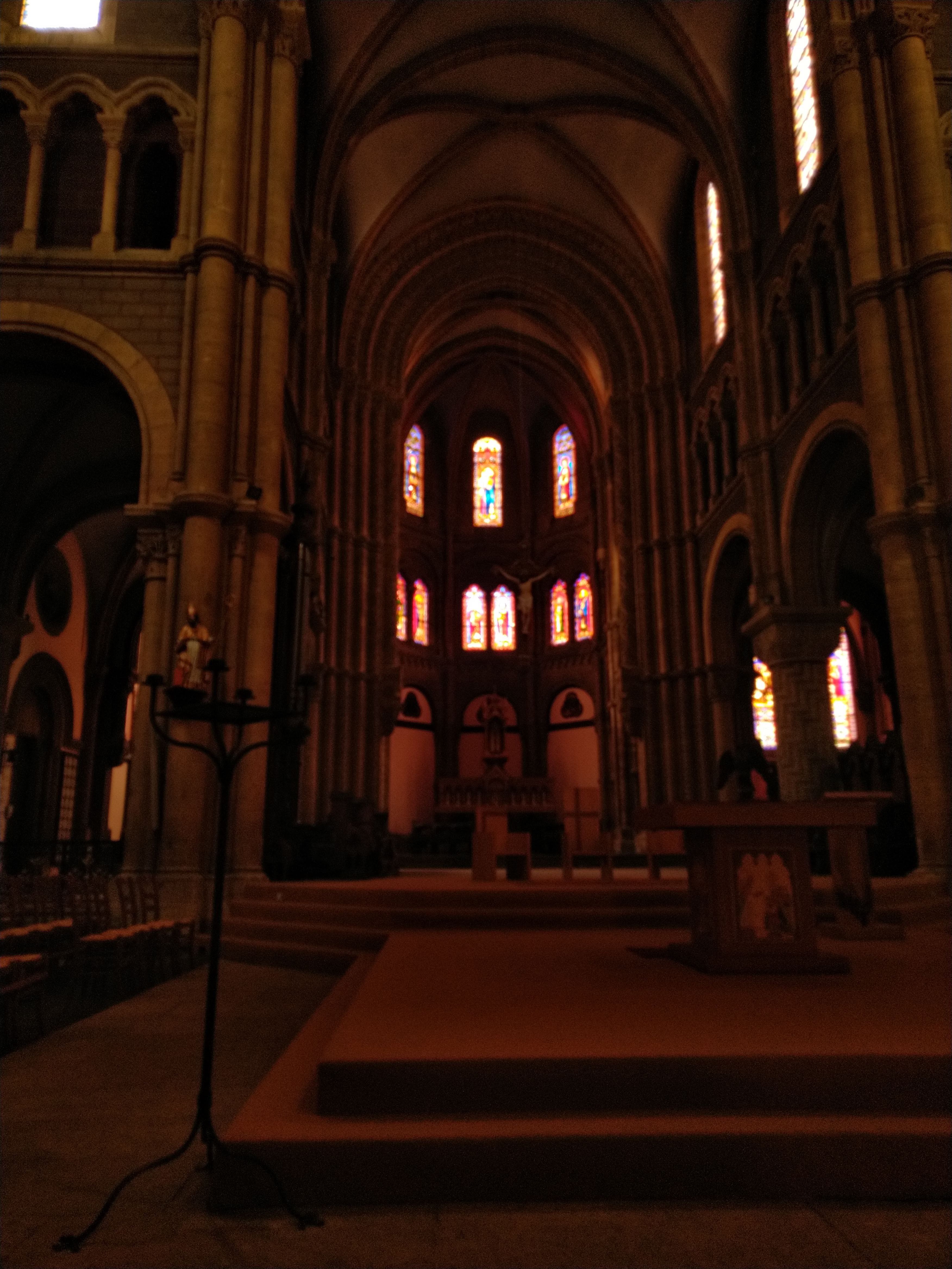 Il me devient difficile d'être surpris par les églises et cathédrales tant il m'est été possible d'en visiter. Ce fut pourtant une agréable surprise que de pénétrer à l'intérieur de celle-ci. On est loin de se douter au dehors de trouver un univers intérieur aussi surprenant. On remarque rapidement, après avoir été absorbé par la beauté de l'imposant prétoire aux couleurs acajou la richesse du travail réalisé sur colonnes et chapiteaux. Les vitraux sont magnifiques de couleurs et détails, le buffet d'orgue tout à la hauteur de l'ensemble. L'autre particularité de cette église étant la beauté et la mise en valeur de ses chapelles, ses colonnes tout de bois sculpté, des couleurs leur donnant un style byzantin rappelant de mémoire les chapelles de la cathédrale Saint Corenthin de Quimper.