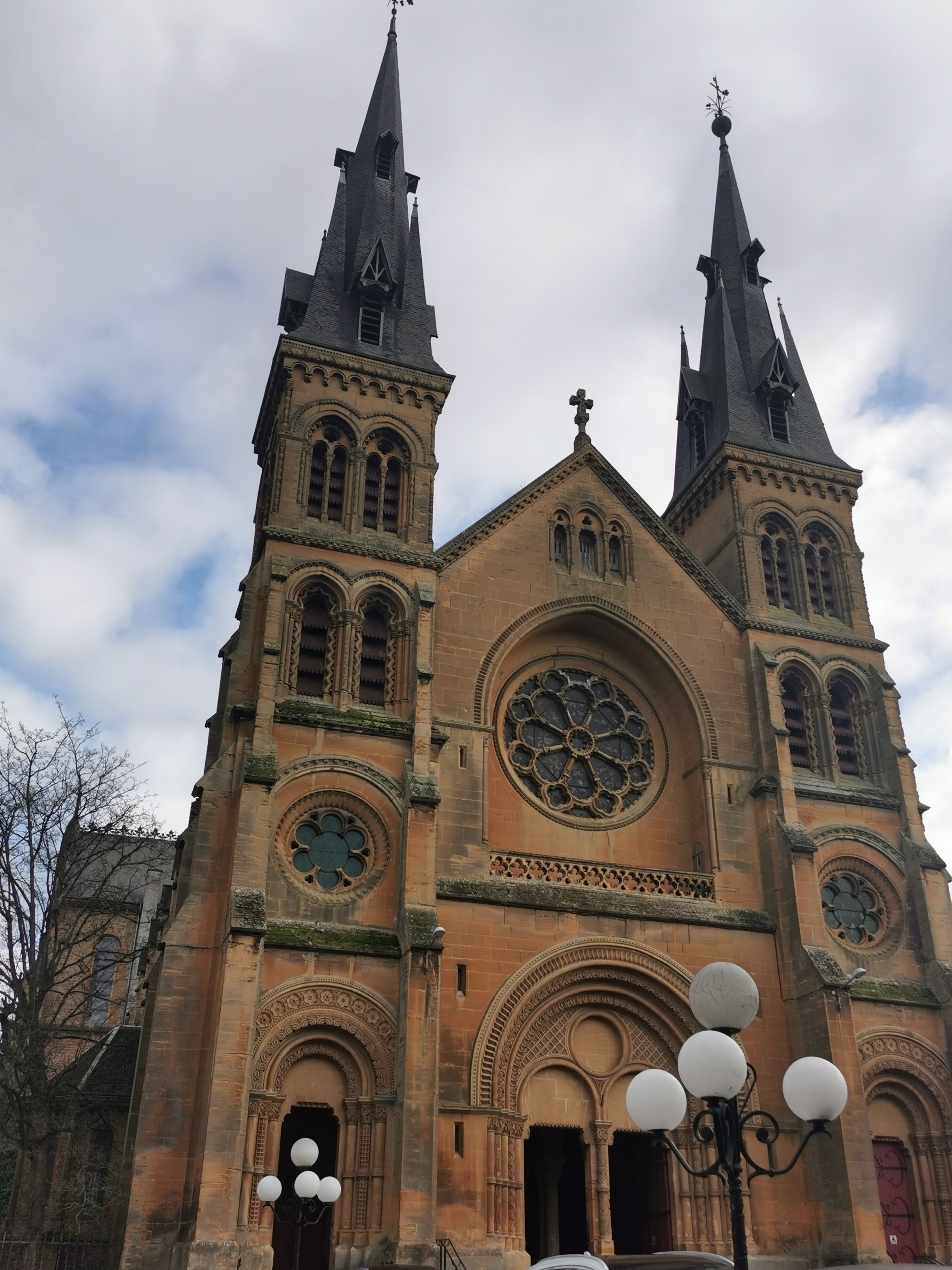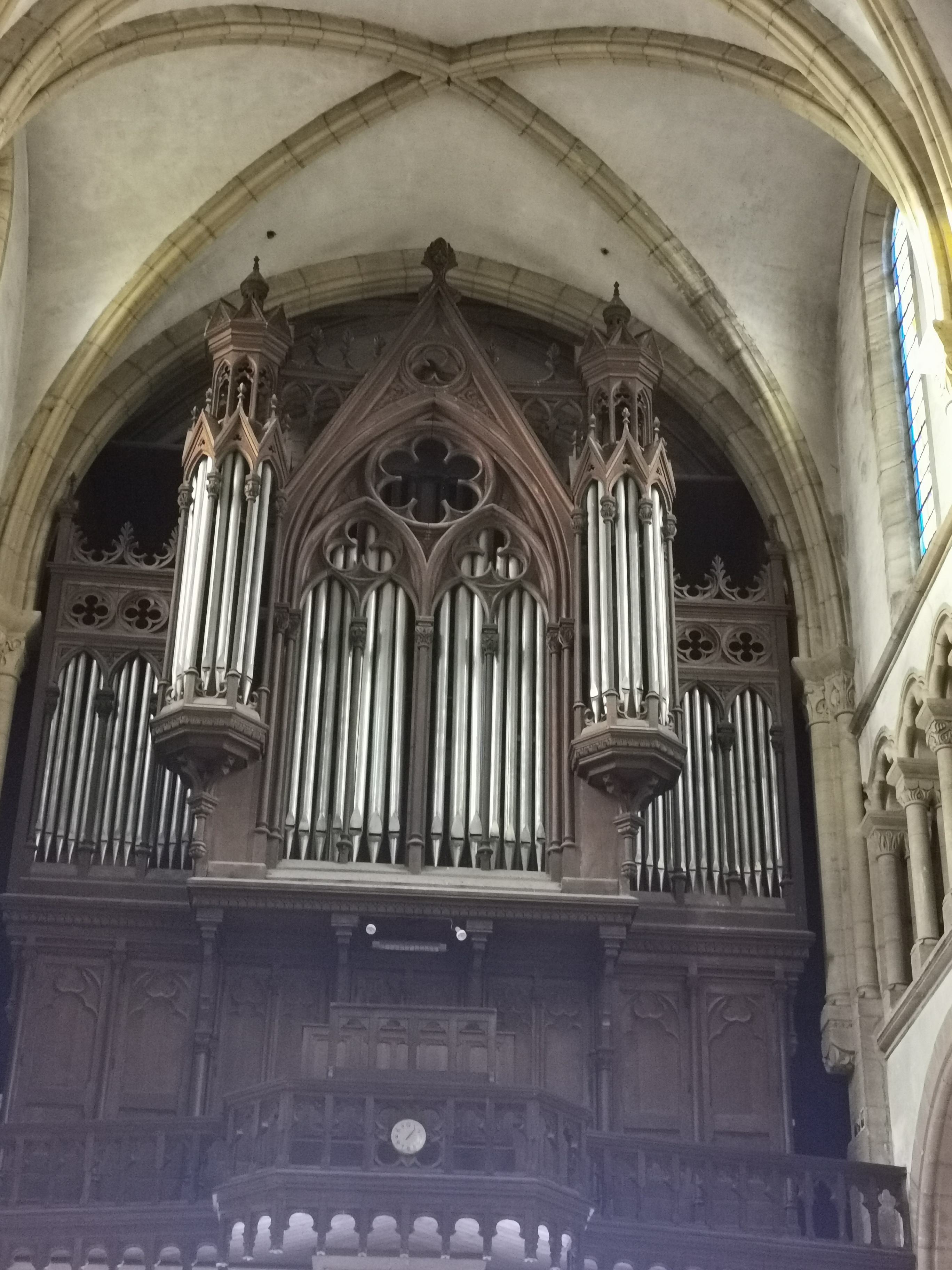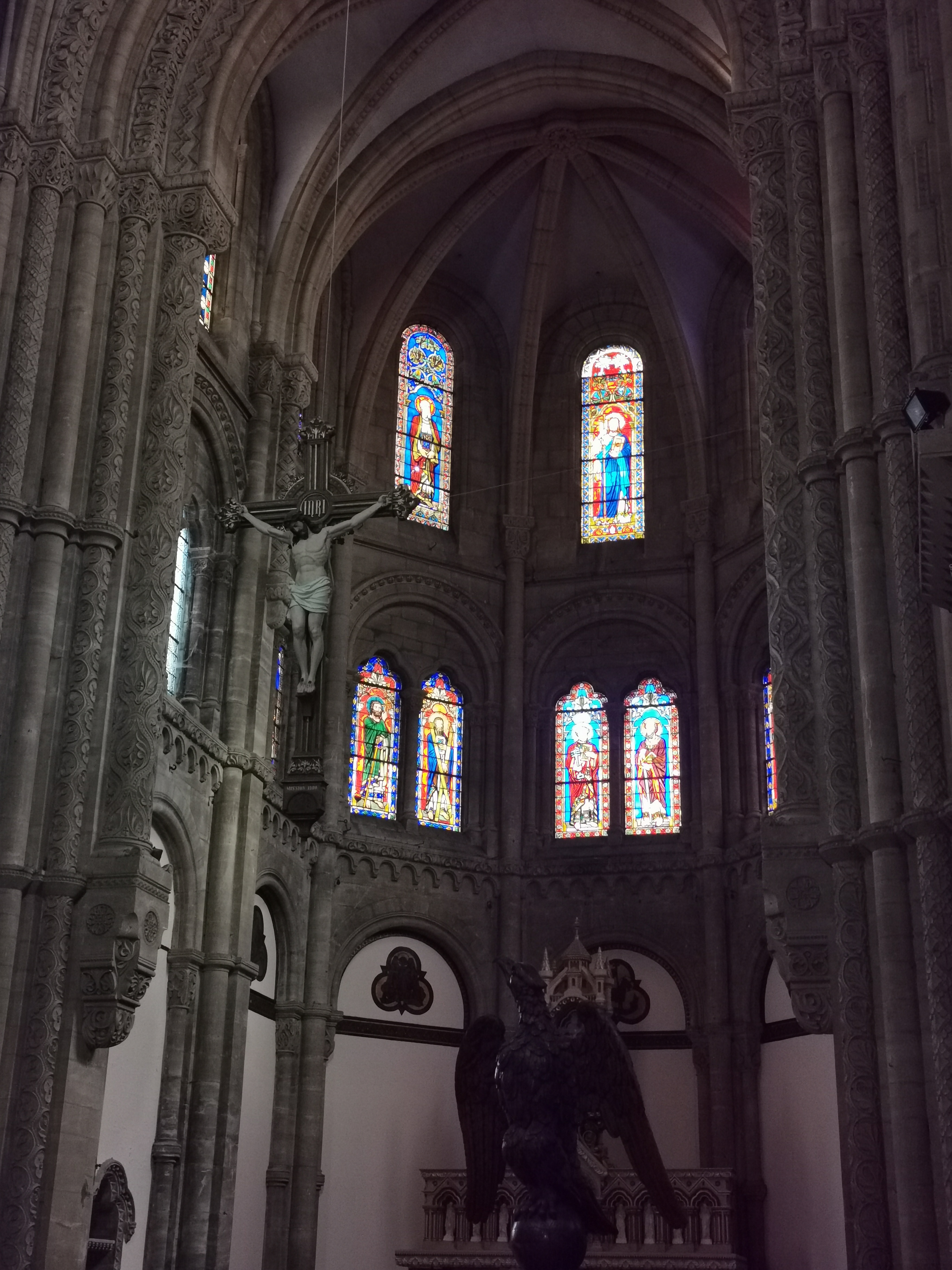 Il me devient difficile d'être surpris par les églises et cathédrales tant il m'est été possible d'en visiter. Ce fut pourtant une agréable surprise que de pénétrer à l'intérieur de celle-ci. On est loin de se douter au dehors de trouver un univers intérieur aussi surprenant. On remarque rapidement, après avoir été absorbé par la beauté de l'imposant prétoire aux couleurs acajou la richesse du travail réalisé sur colonnes et chapiteaux. Les vitraux sont magnifiques de couleurs et détails, le buffet d'orgue tout à la hauteur de l'ensemble. L'autre particularité de cette église étant la beauté et la mise en valeur de ses chapelles, ses colonnes tout de bois sculpté, des couleurs leur donnant un style byzantin rappelant de mémoire les chapelles de la cathédrale Saint Corenthin de Quimper.