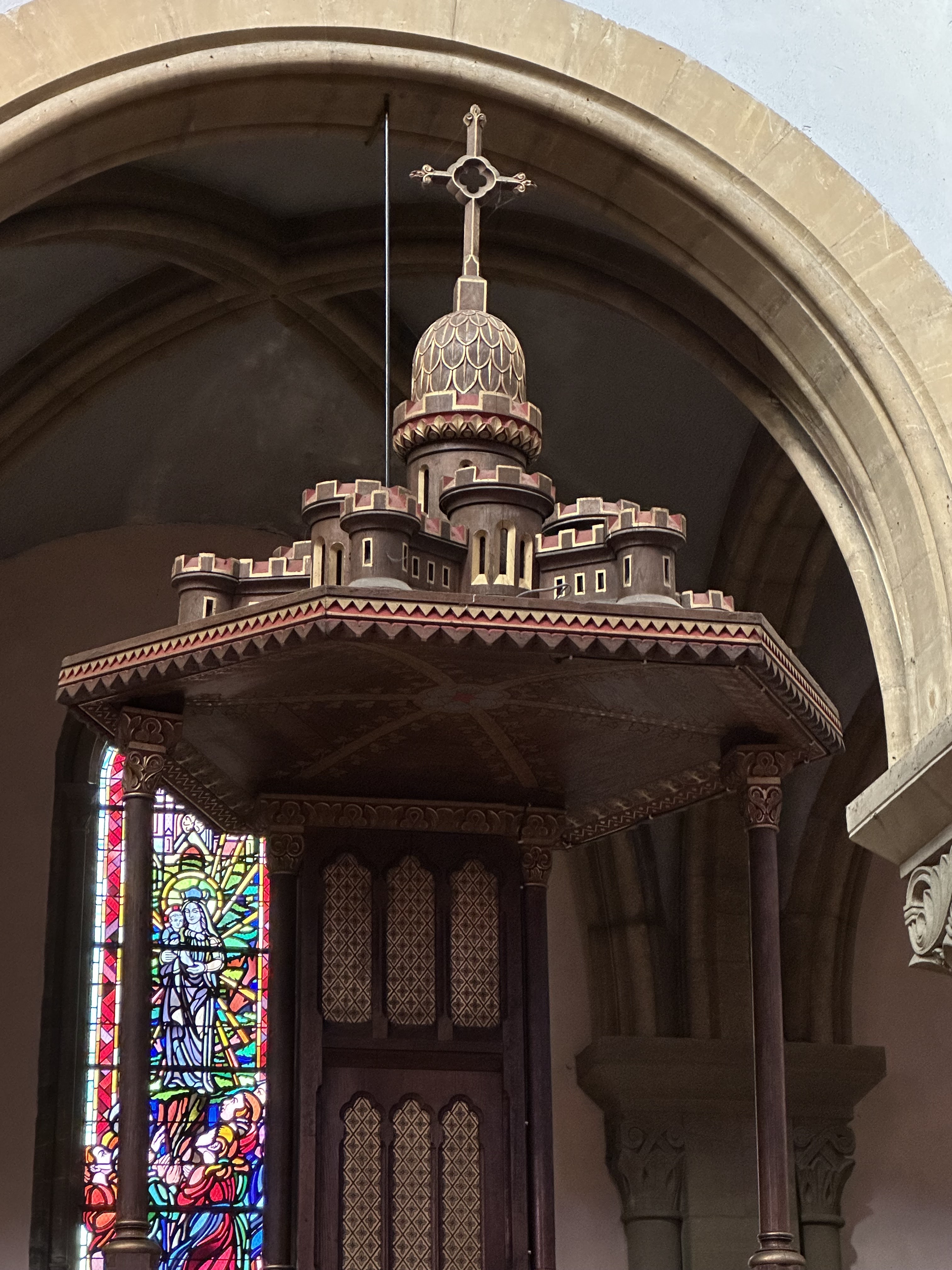 Ambiance assez austère mais les fenêtres la brisent avec des rayons de lumière colorés. Chaire très inhabituelle. Une vaste échelle peu appréciée de l’extérieur.