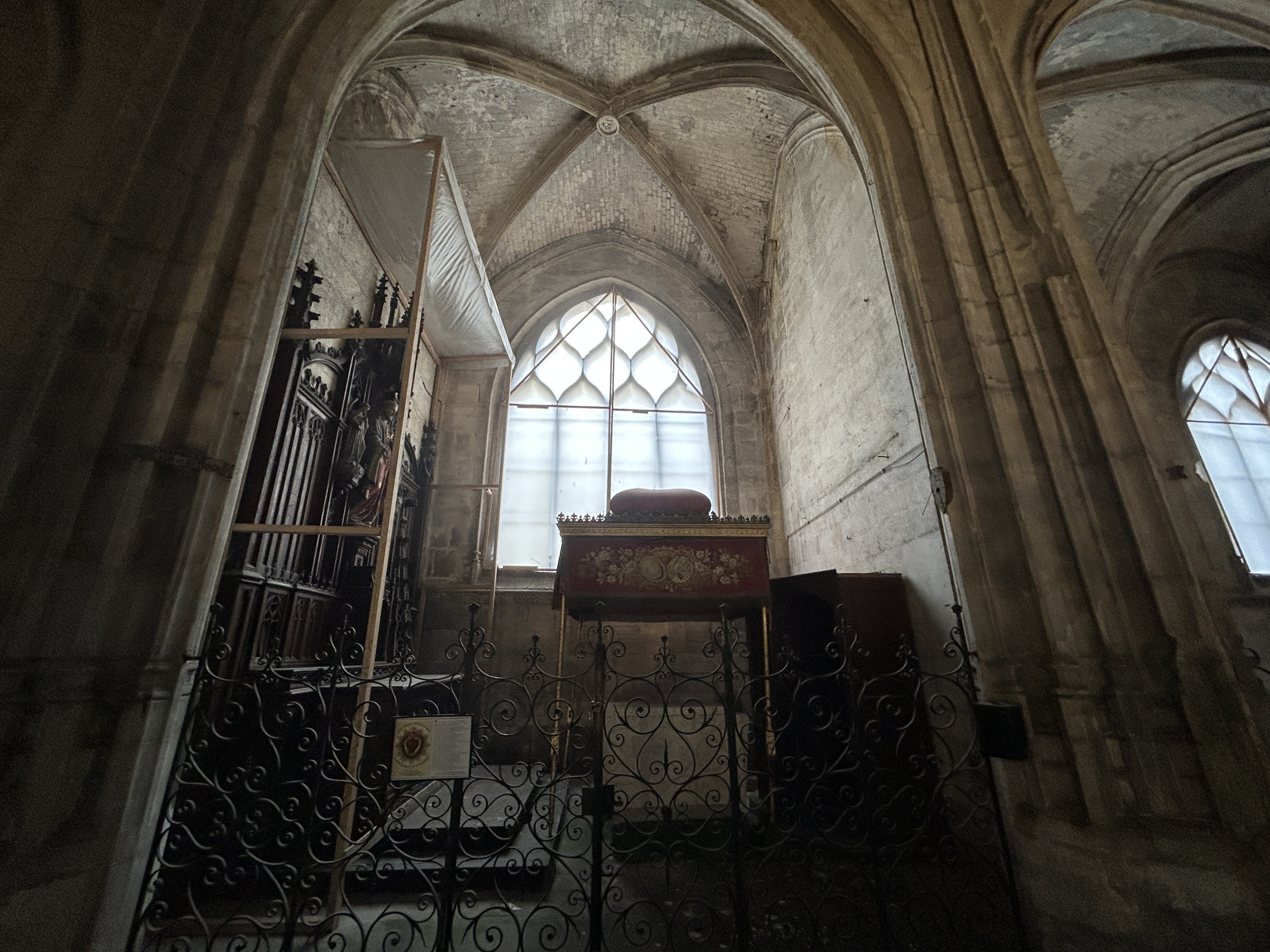 Sérieusement en mauvais état, mais travaux de rénovation en cours. Belle chapelle au fond du chœur.