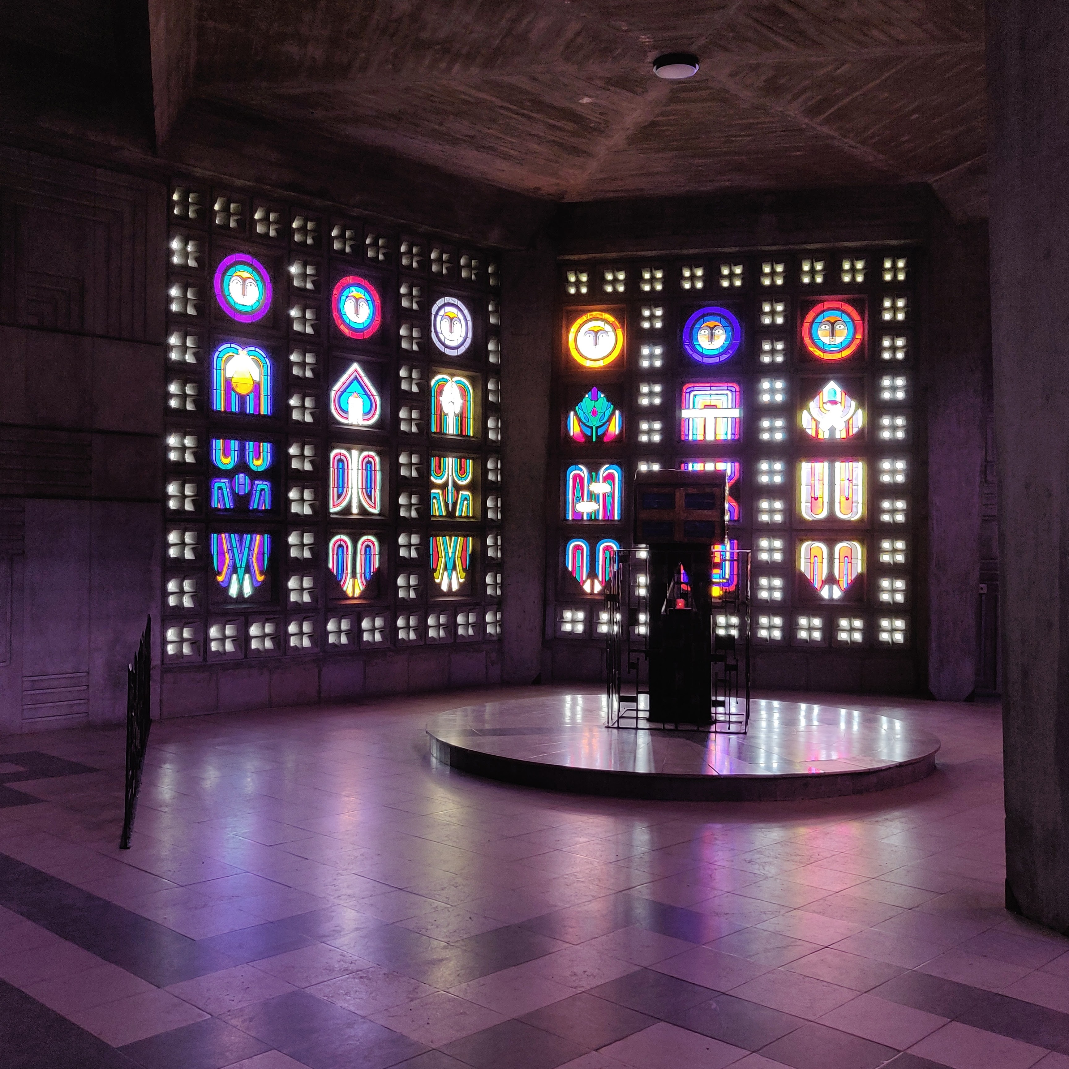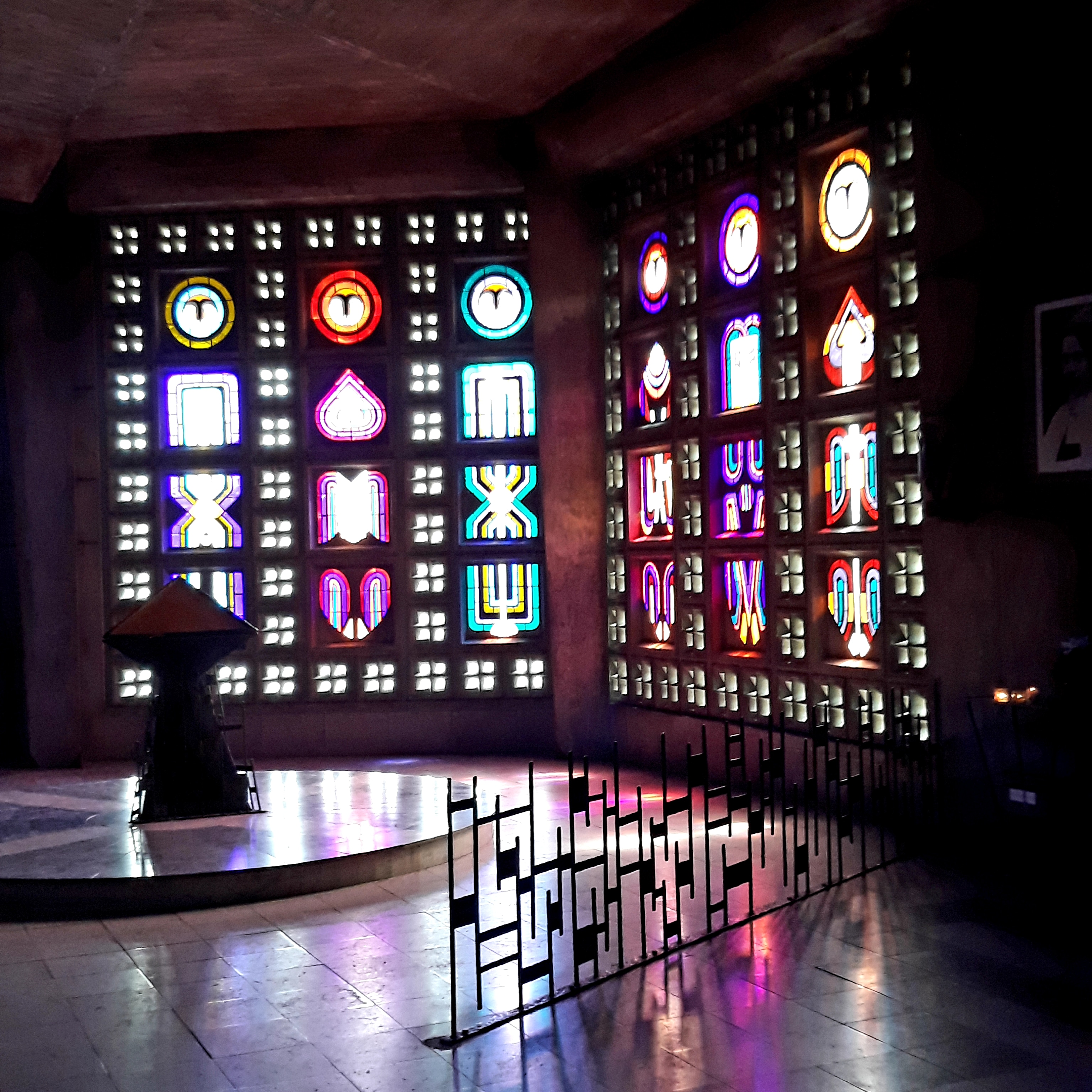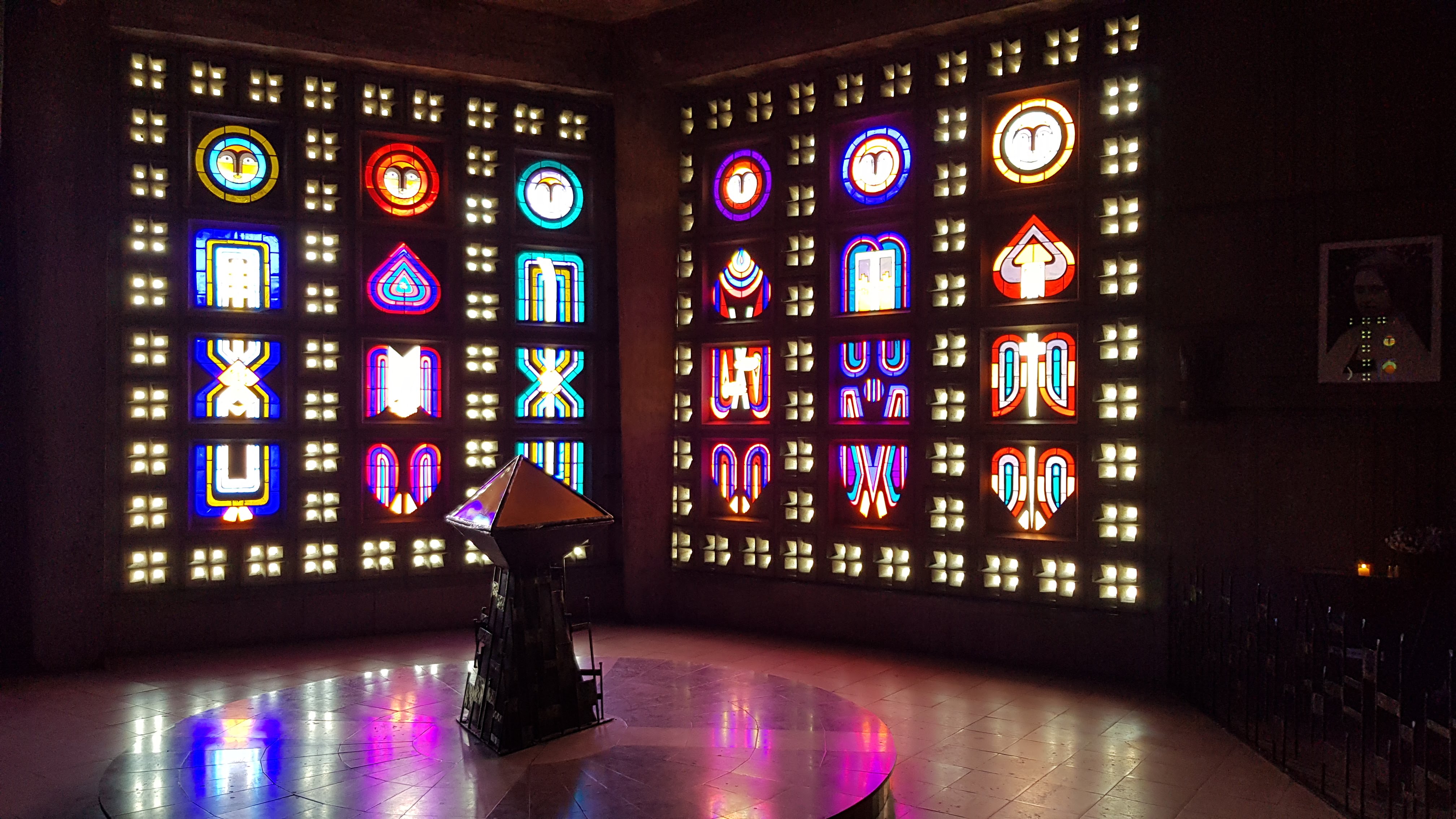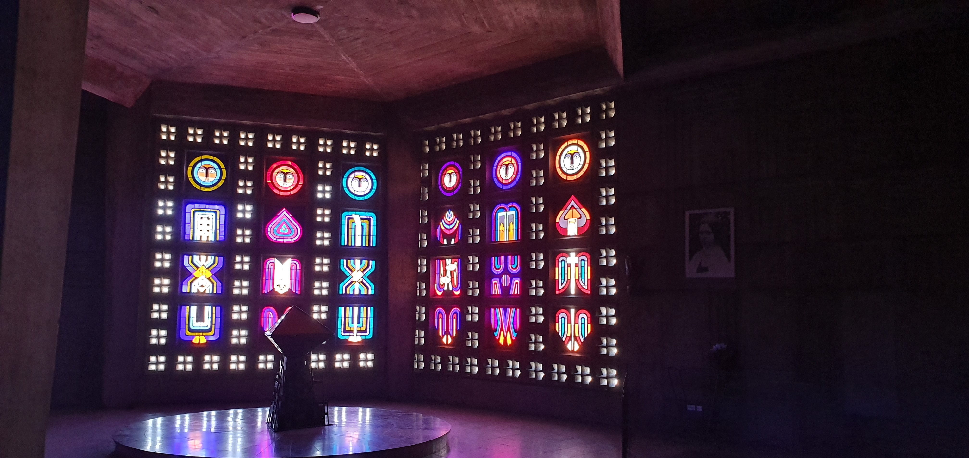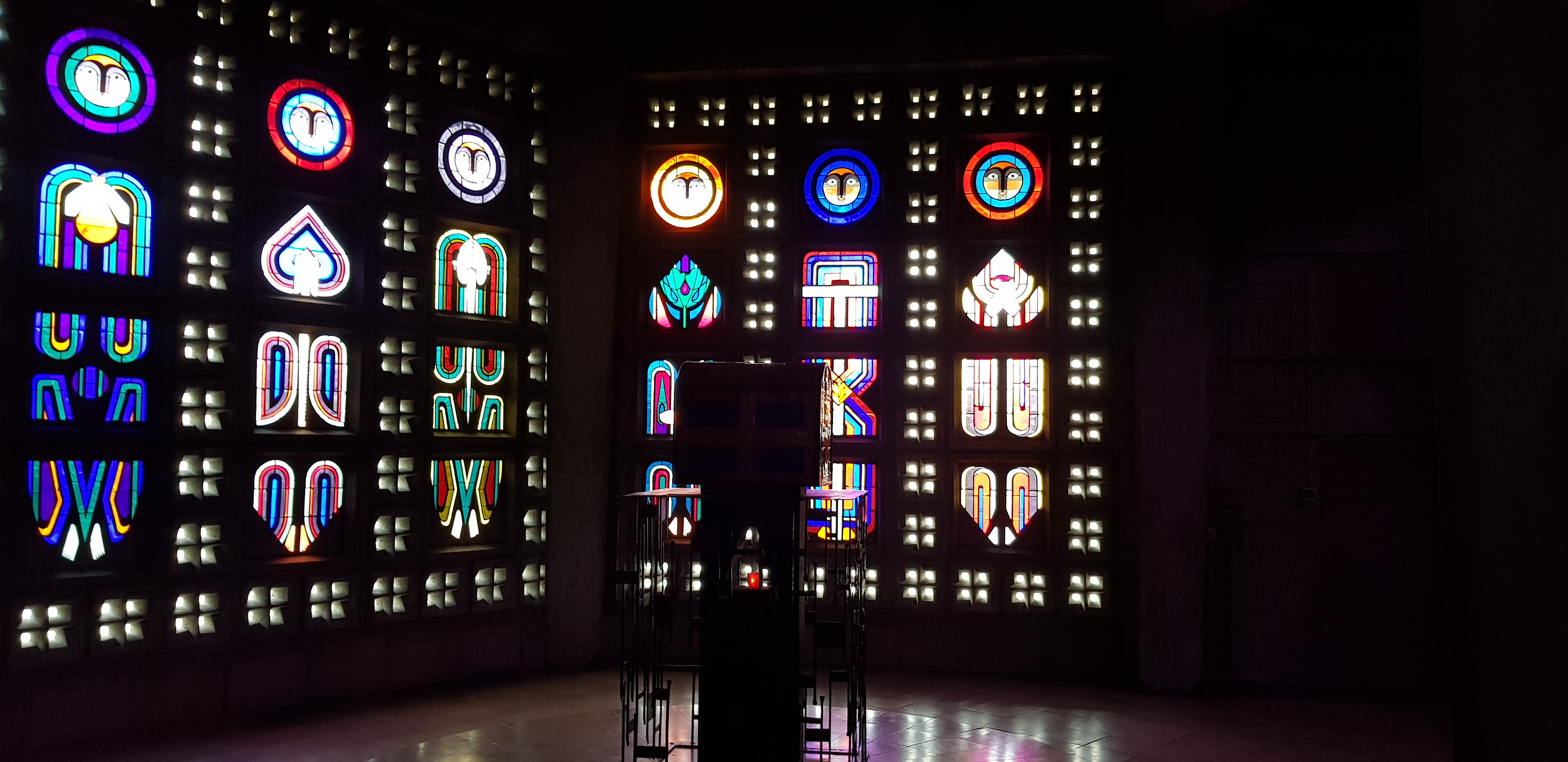Lieu sobre, moderne, nous transportant pas ses éclats de couleurs grâce aux vitraux
