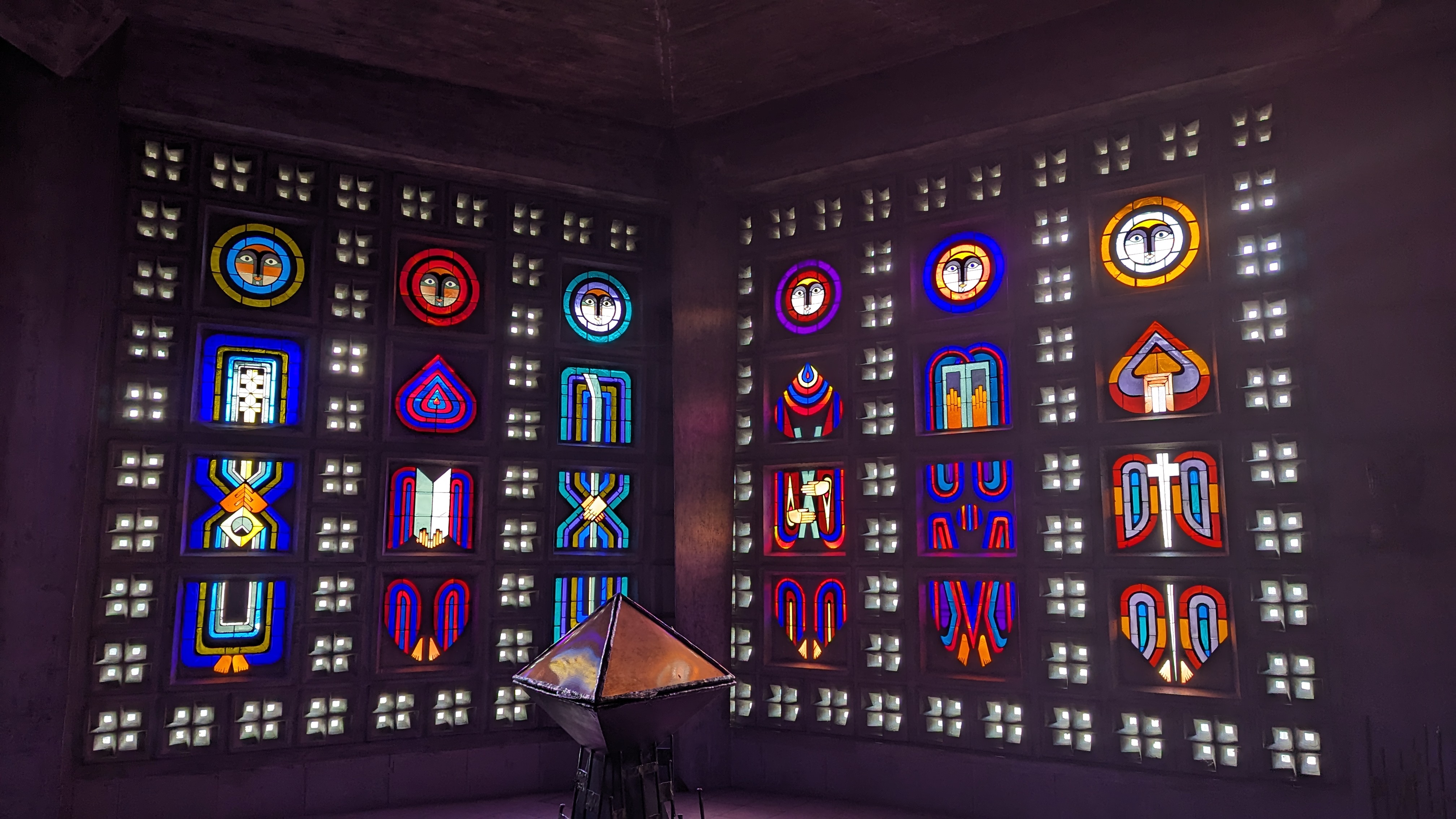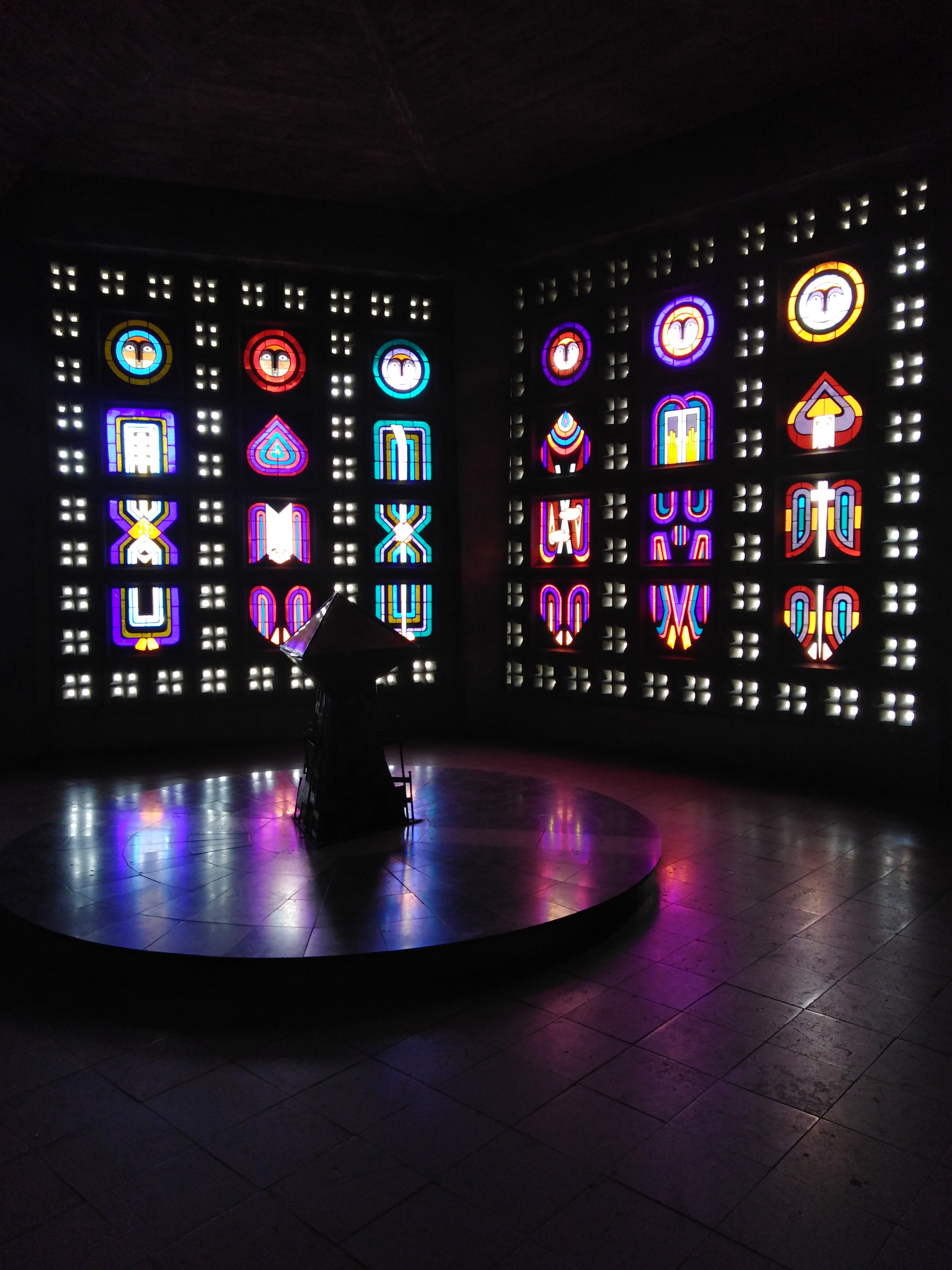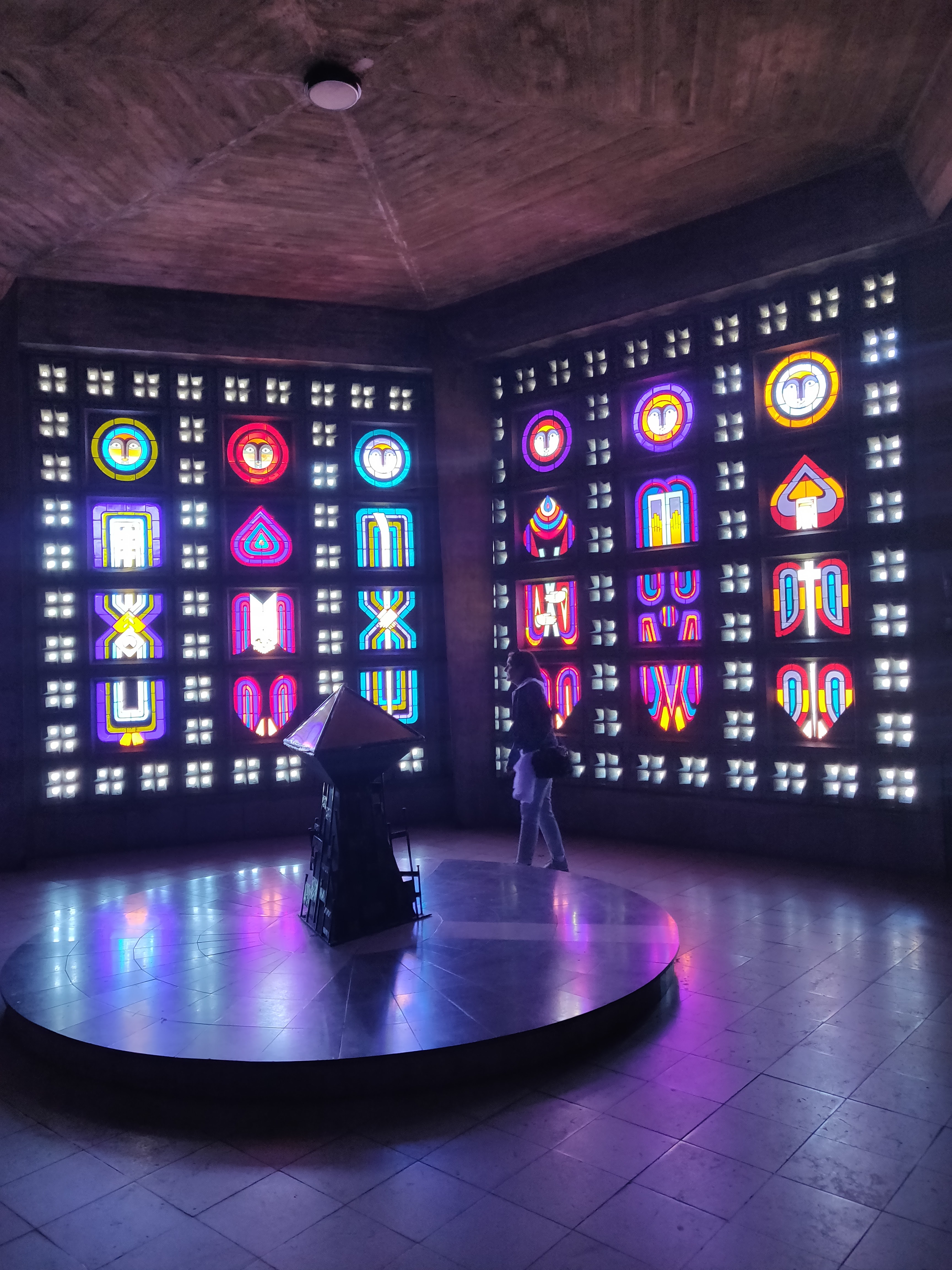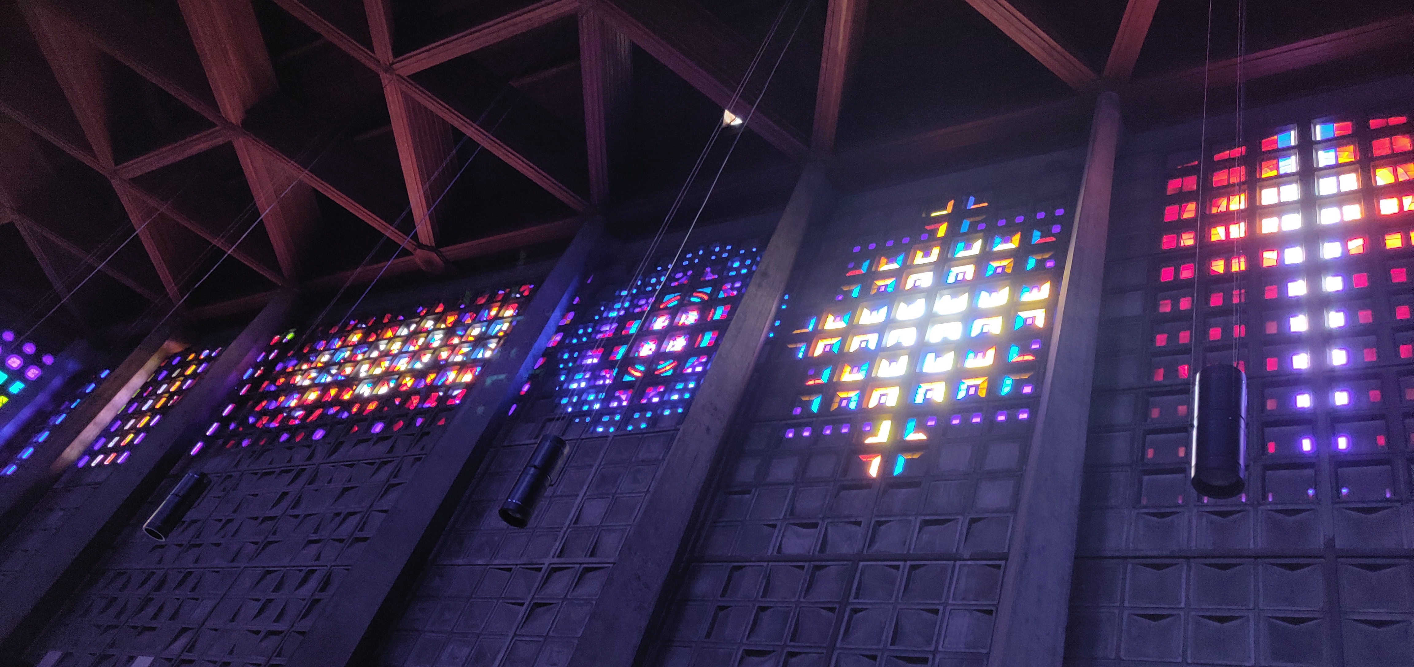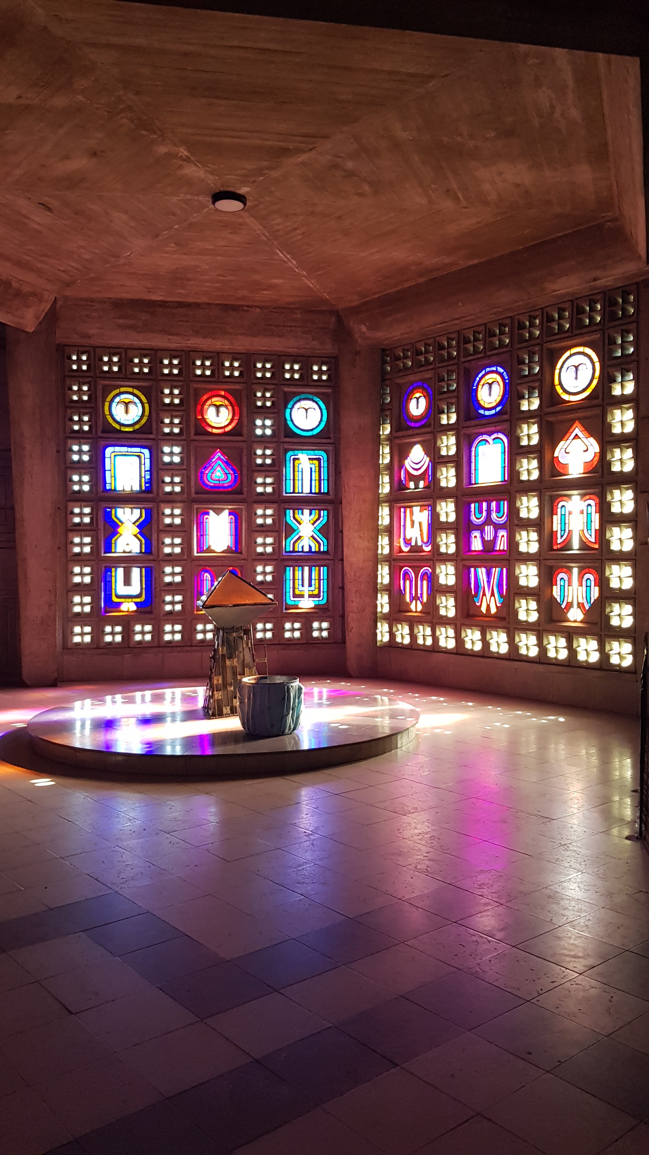 Lieu sobre, moderne, nous transportant pas ses éclats de couleurs grâce aux vitraux