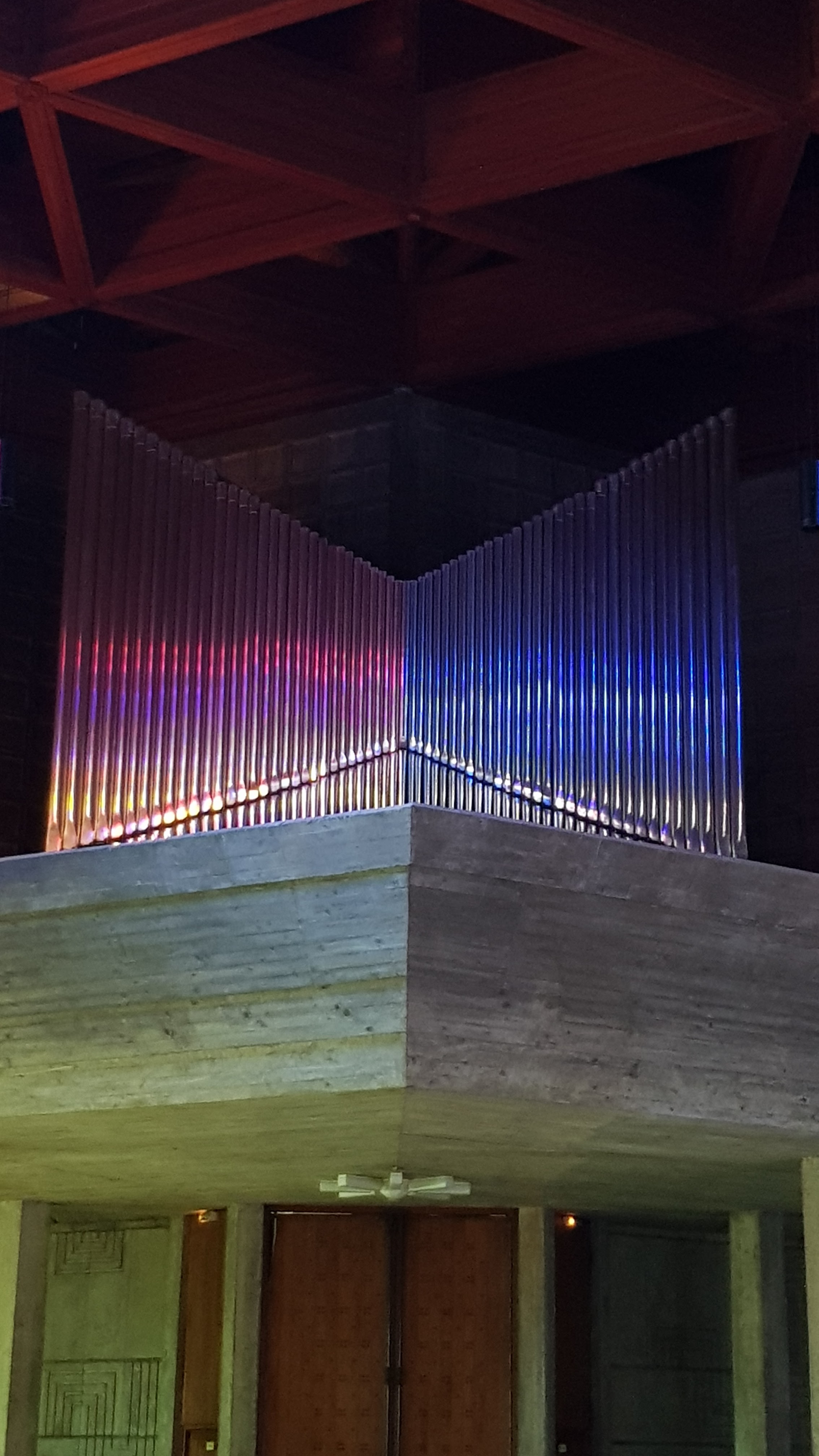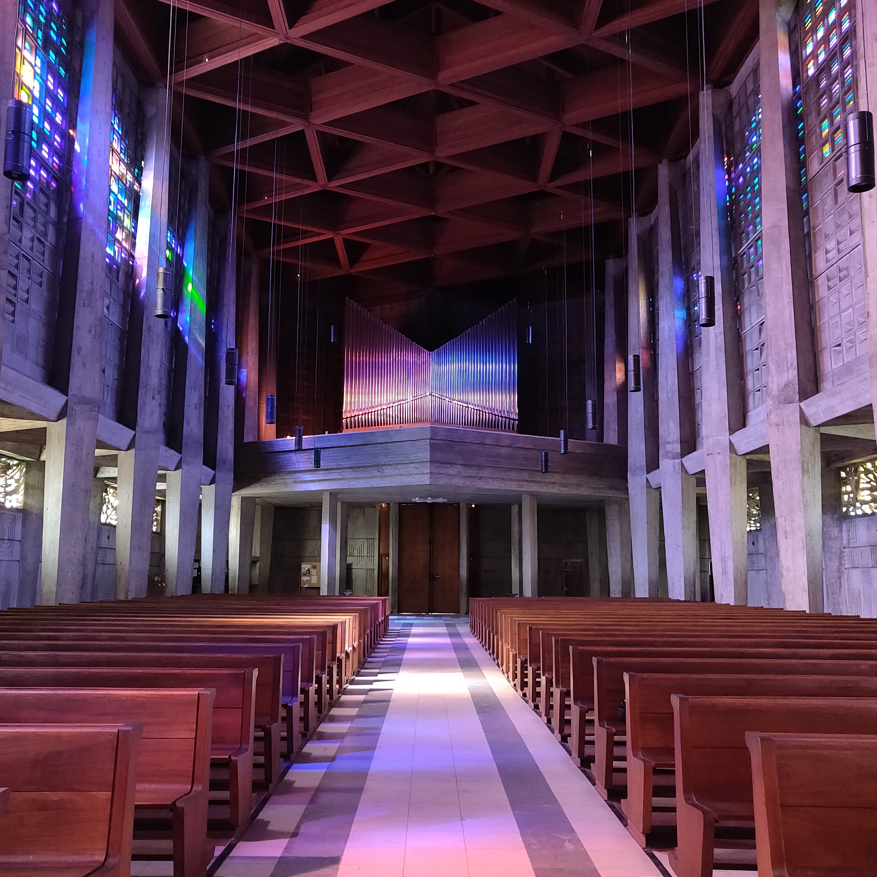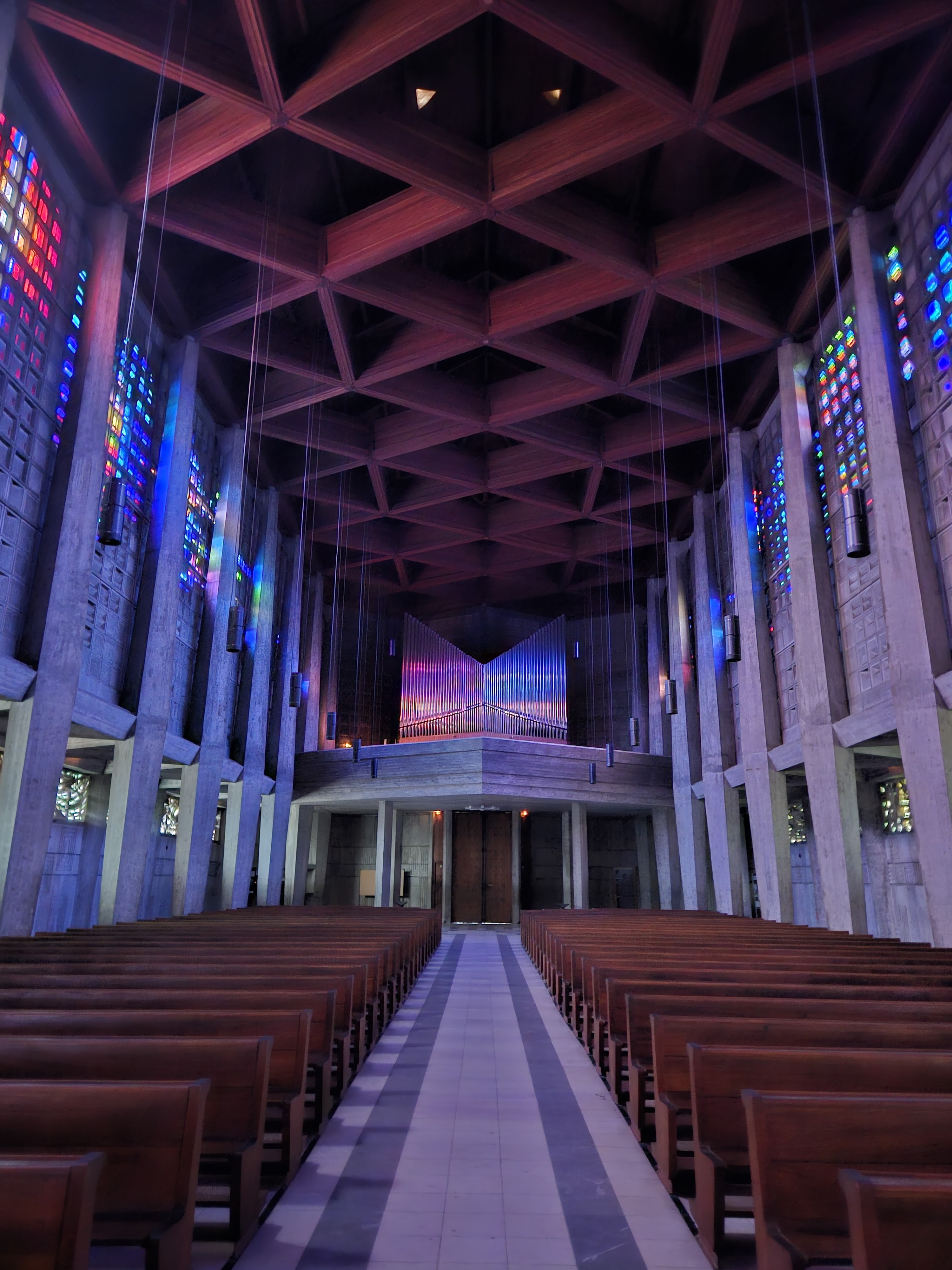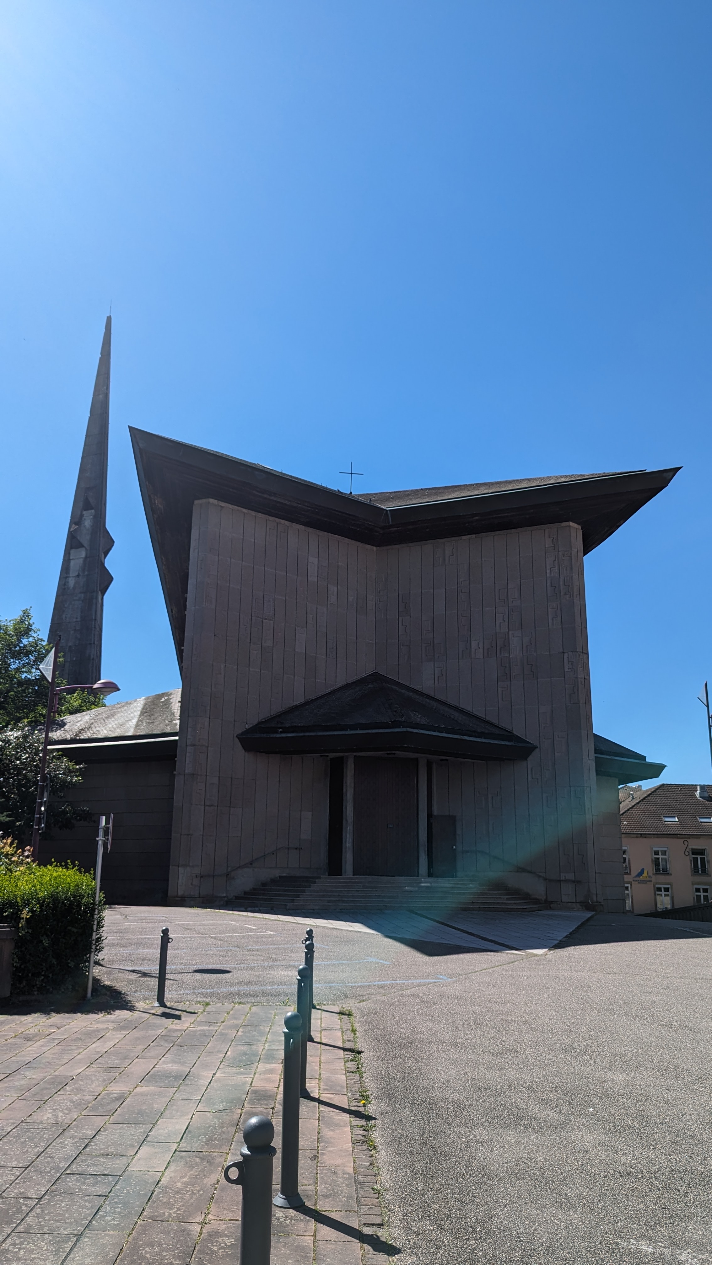 Très belle église, dont les vitraux sont en cristal de Baccarat. Sur les piliers en béton, on peut voir les traces laissé par les planches de coffrages. Ce qui me fait penser à des arbres fossilisés.