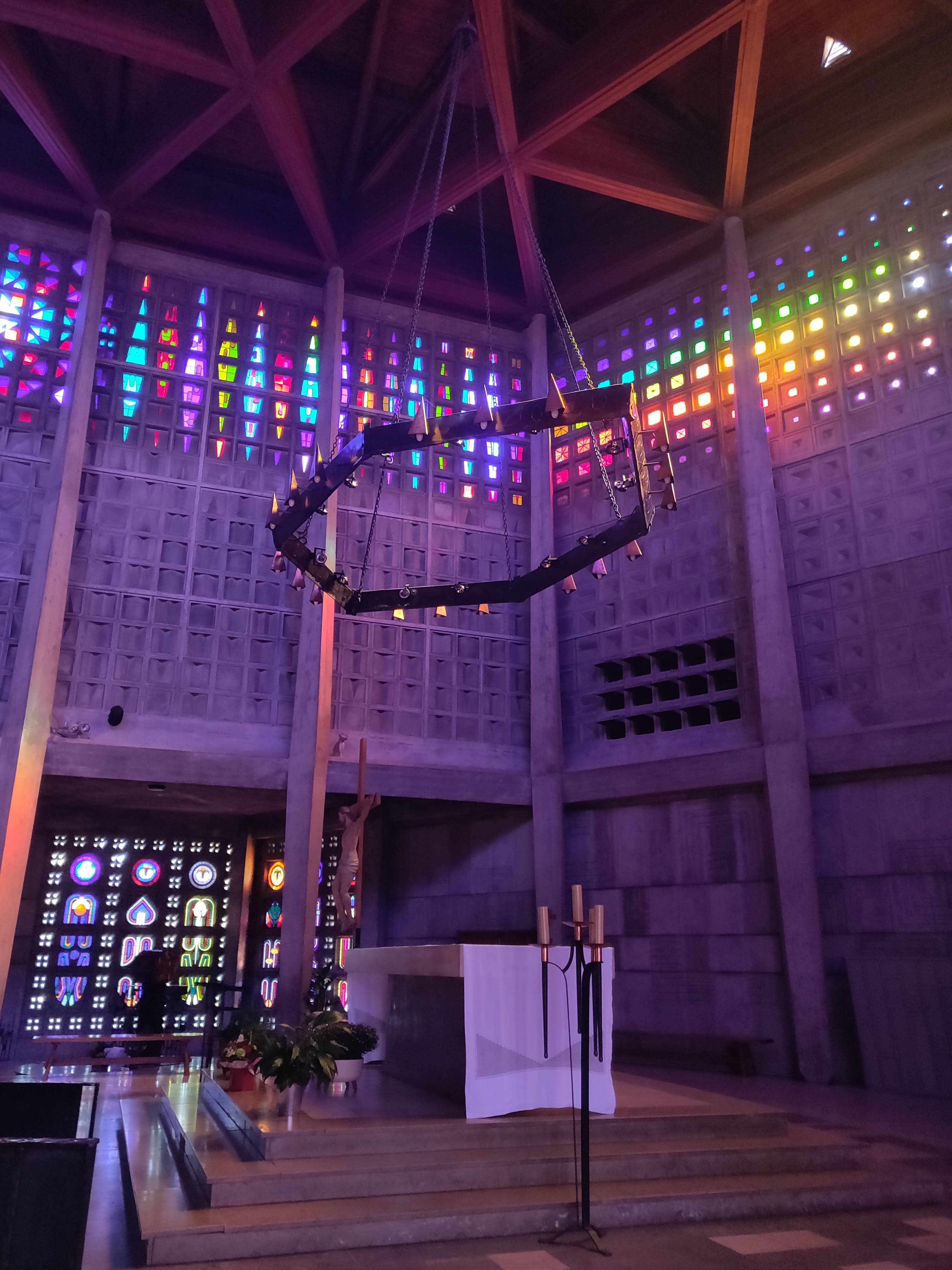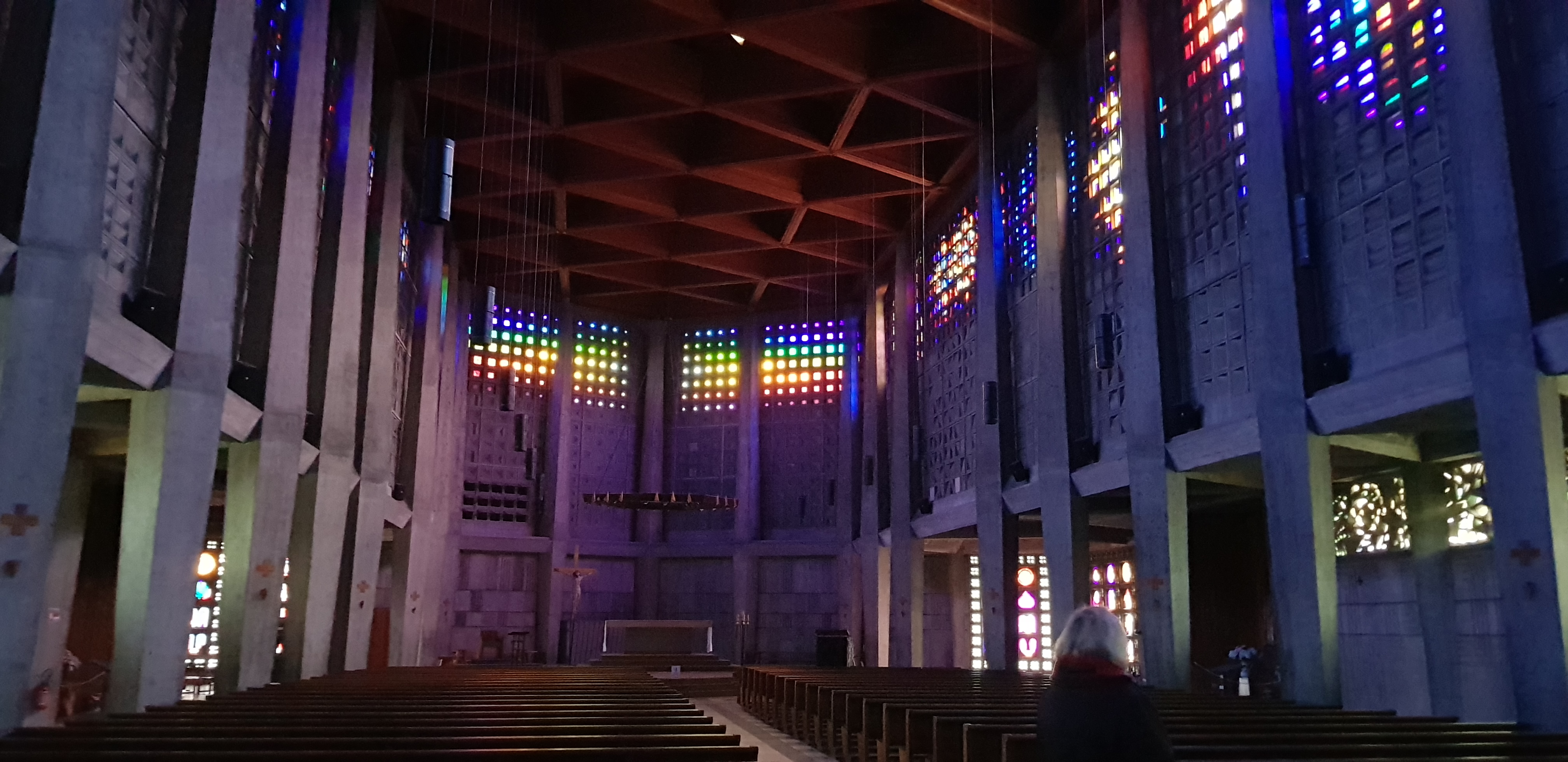 Si vous avez déjà vu l'exposition de verre à proximité, vous devez absolument vous rendre dans cette église. Des effets de lumière merveilleusement colorés, surtout lorsque le soleil brille. Et pour une fois, le béton apparent a été traité de manière à ne pas vous faire froid dans le dos.