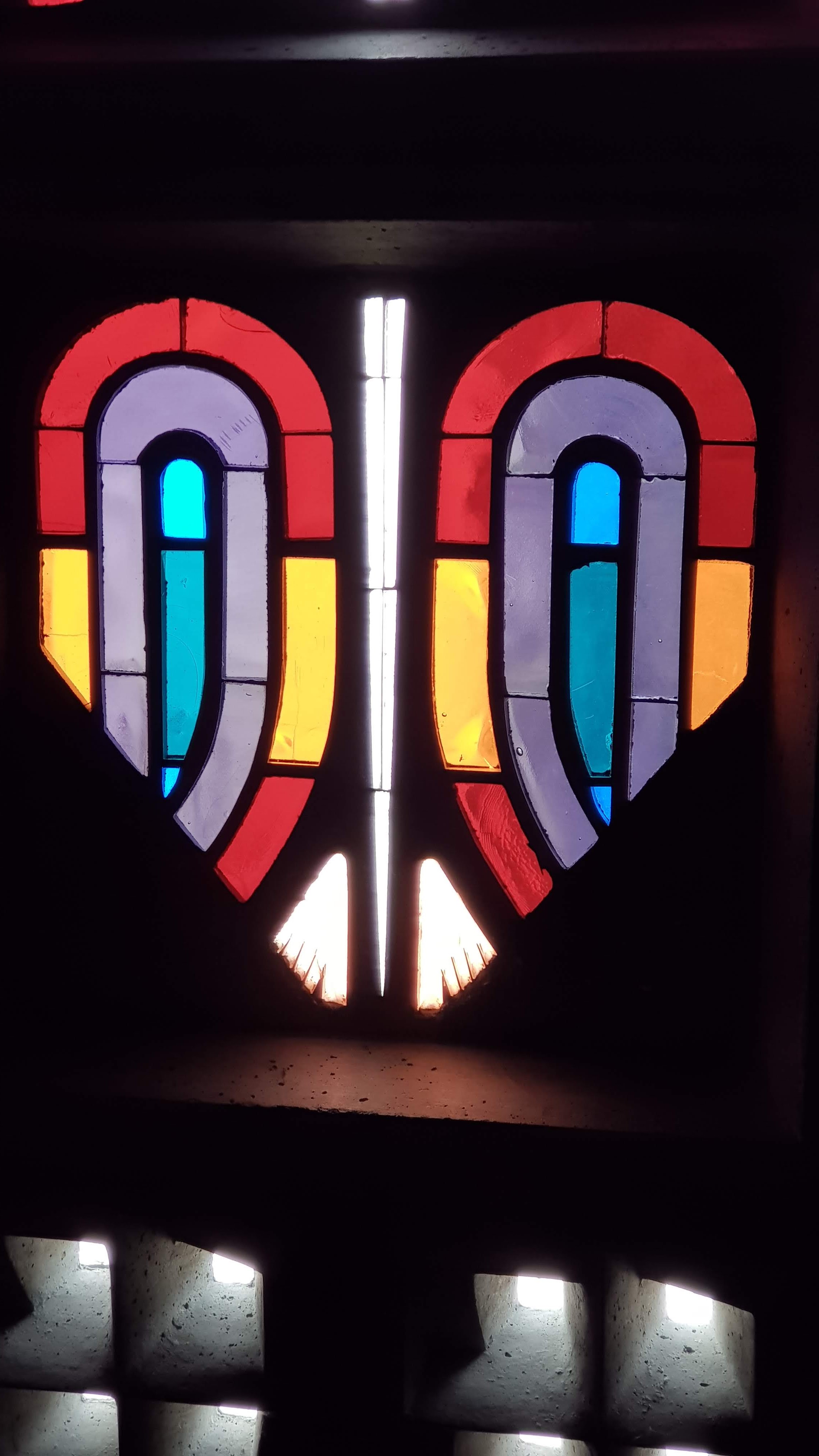 Église très originale. Intérieur sombre avec des vitraux sur le thème de la création du monde et avec une représentation dzs apôtres d'inspiration byzantine derrière la sacristie.