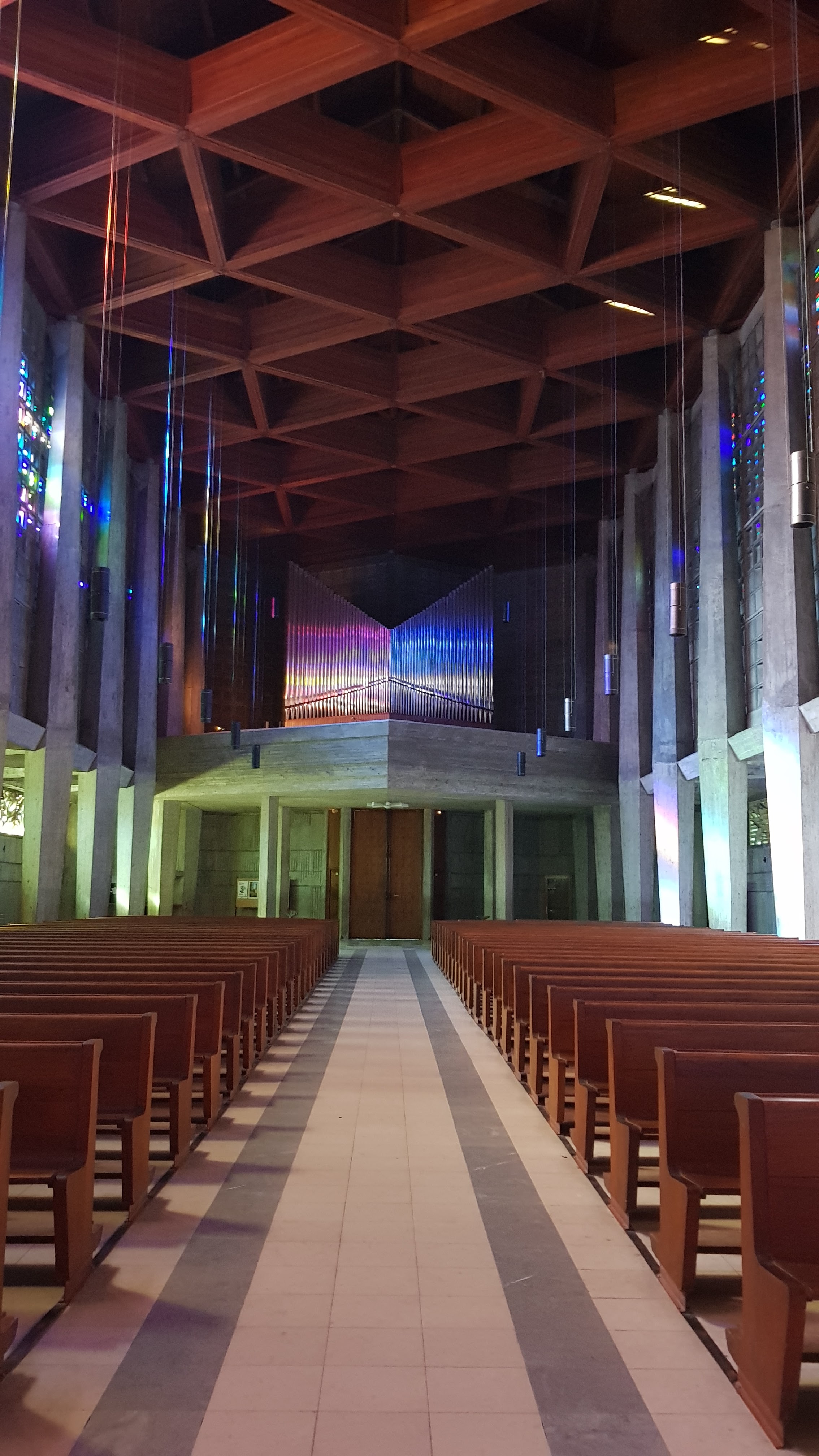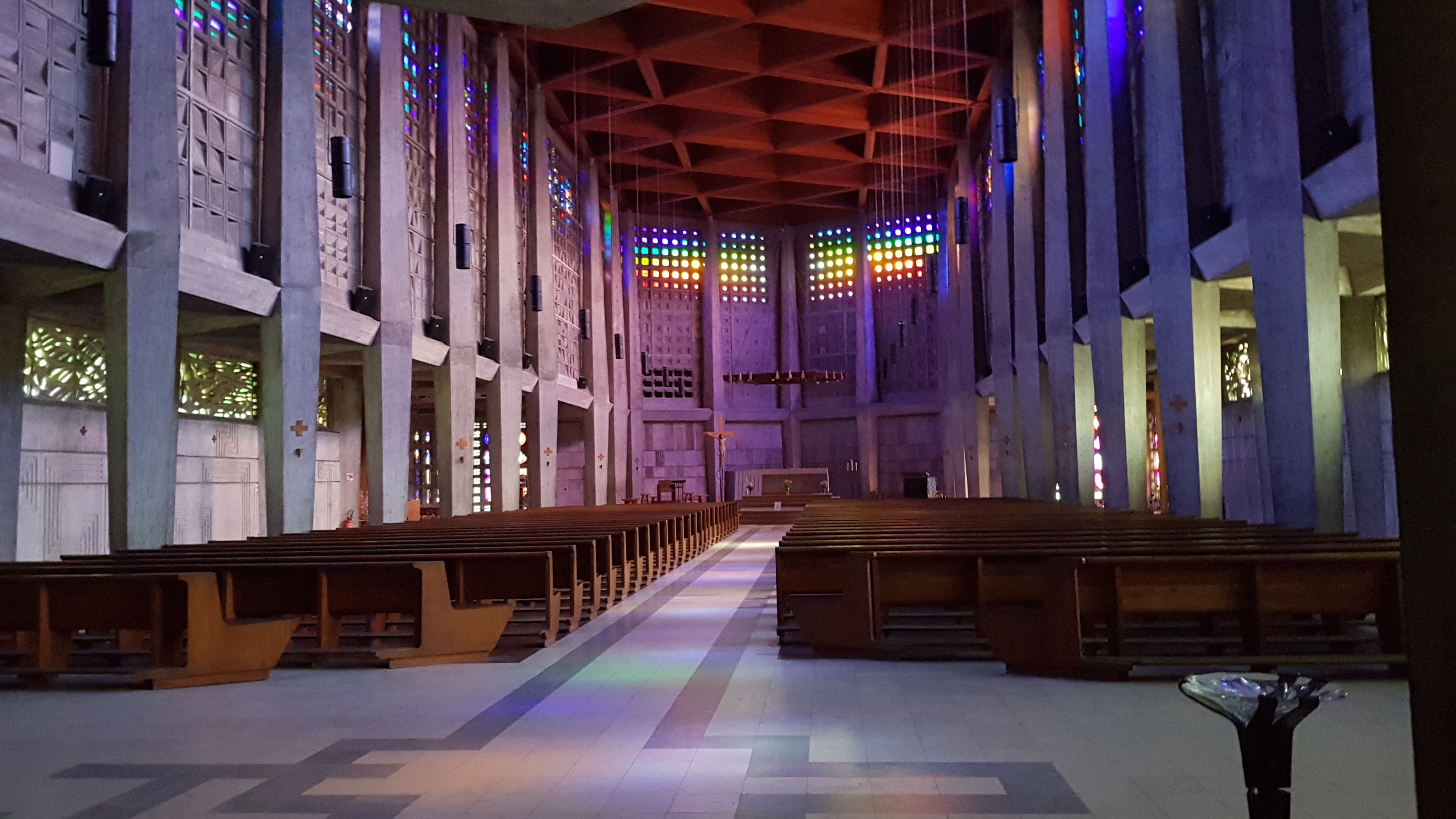 Endroit surprenant du faît de son moderniste, très peu d'ornements. Ici pas de vitraux, ils sont remplacés par du cristal, les bénitiers sont également en cristal.