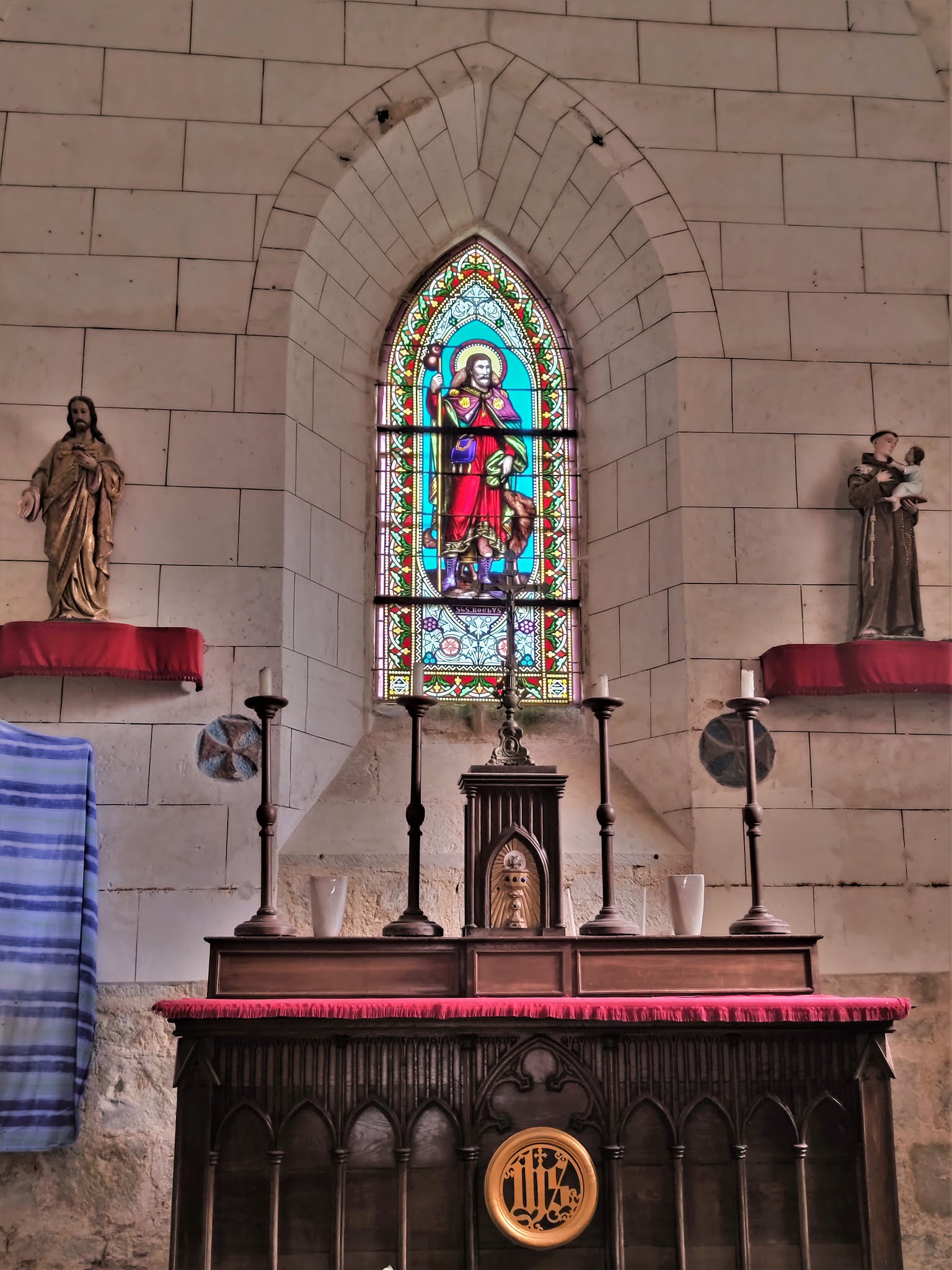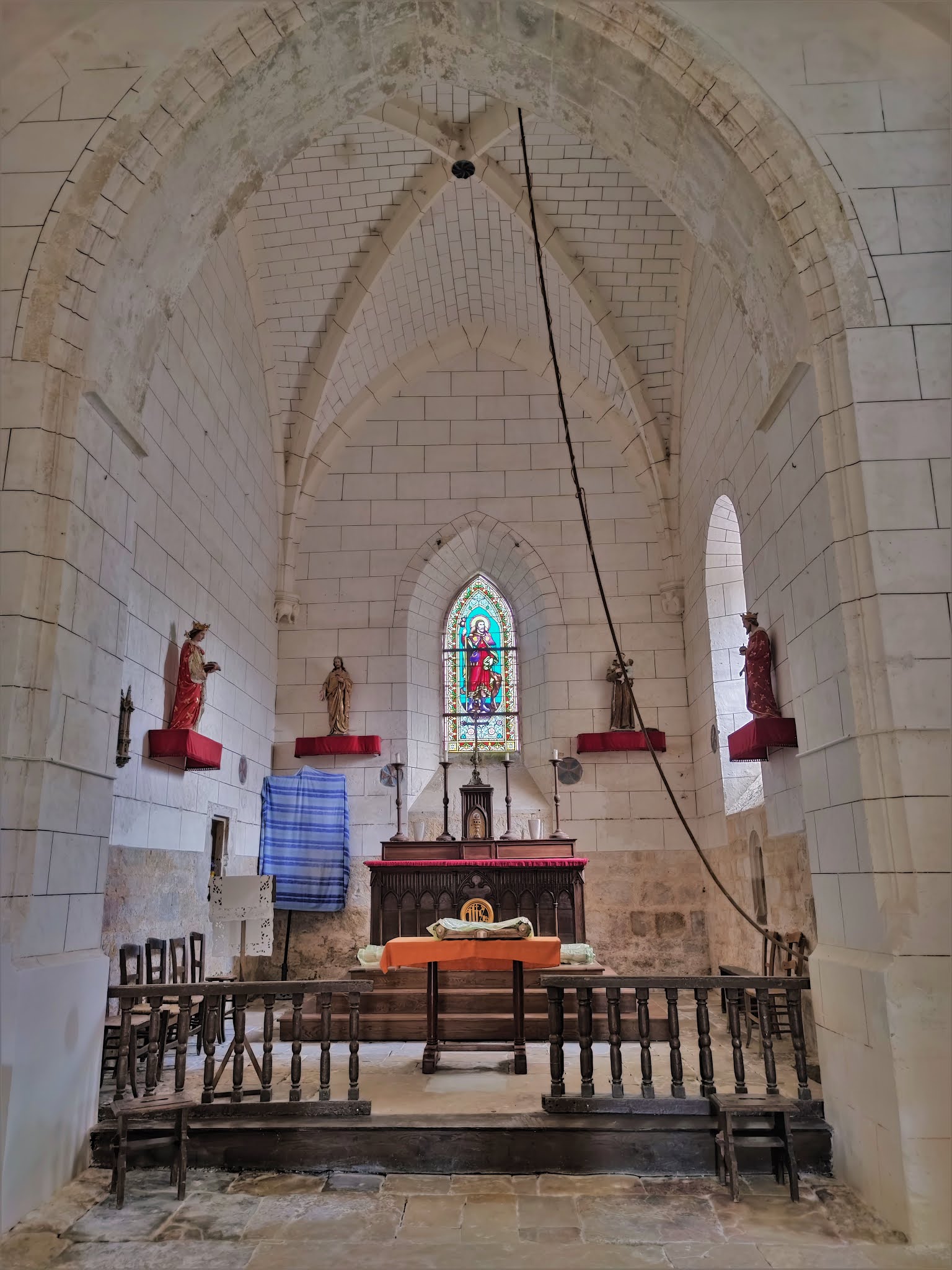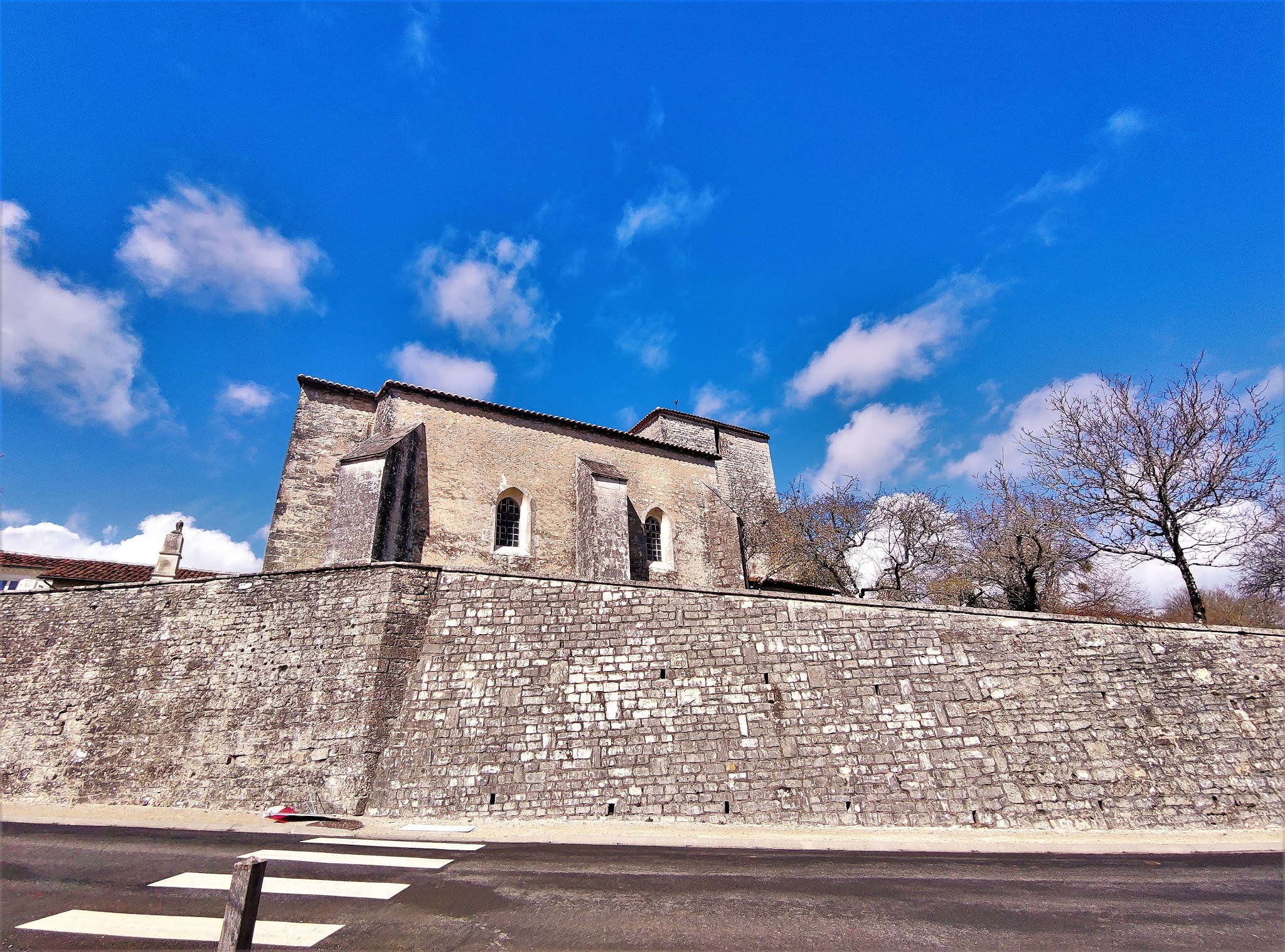 Par la volonté d'un bourg de 150 habitants et d'une association, une église retrouve un avenir. Modeste église d'origine romane, placée sur un petite surélévation, au bord de la D15, au milieu du bourg de Parzac, c'est la curiosité qui m'a incité à m'arrêter. Par chance, une dame m'a dirigé vers sa voisine, détentrice des clés. Cette voisine, participante active de l'association Patrimoine de Parzac, m'a gratifié d'une visite et d'une présentation de l'édifice. Cette église Saint-Roch a été modifiée et agrandie d'une chapelle au Sud à la fin du 15ème siècle. Au 19ème siècle, elle reçoit des voûtes en briques et le vitrail du chœur célébrant le Patron de l'église. Puis il faudra attendre 2013 pour une réfection de la toiture, grâce à la mobilisation de la population (150 habitants), de l'association Patrimoine de Parzac et de la Fondation du Patrimoine. Evidemment, la toiture en mauvais état avant sa réfection a eu pour conséquence des infiltrations, la chapelle a beaucoup souffert. Mais l'action des habitants et de l'association Patrimoine de Parzac a offert un avenir à cette petite église. Des travaux de réfection, menés par l'association, sont en cours ou en voie d'achèvement : réfections des enduits de la chapelle, maître-autel, sacristie, valorisation de la sépulture de Catherine de Curzay, etc... Les travaux indispensables de remise en état étant avancés, un projet d'embellissement a vu le jour. Ce sera la pause de vitraux dans les ouvertures de la chapelle, qui devrait s'effectuer durant l'année 2021. Les maîtres verriers de l'Atelier Pinto, à Bordeaux, assemblent actuellement les quatre vitraux de la chapelle Notre-Dame.