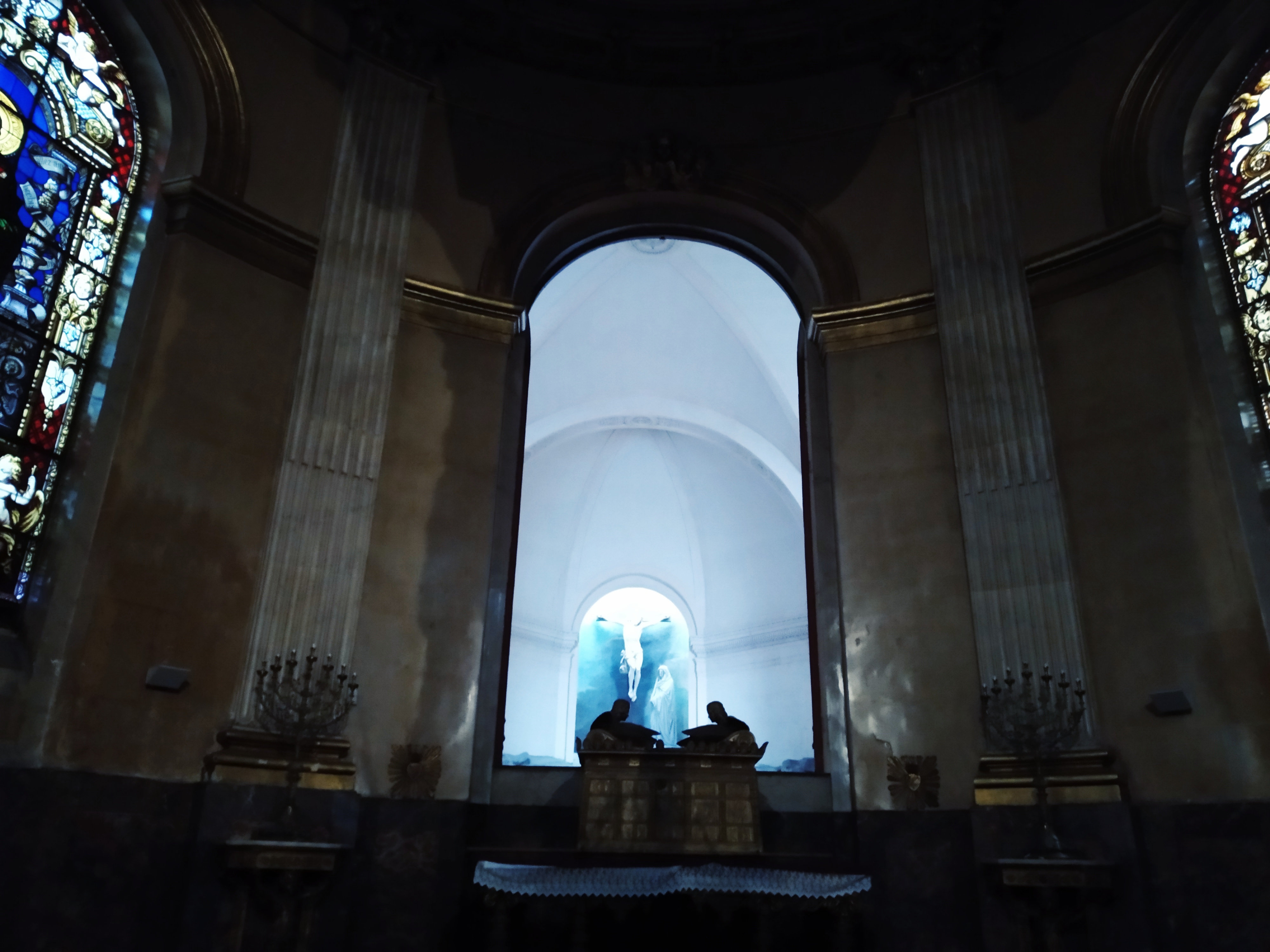 La statue du christ crucifié au fond de la cathédrale ,sous une pluie de lumière est à voir et à revoir