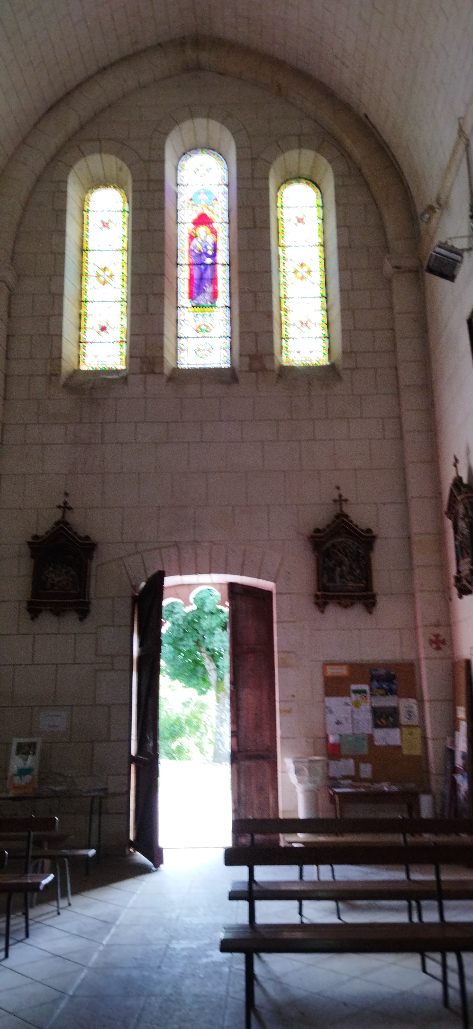 Allez-y, elle est ouverte dans la journée, merci au bénévole. Très belle architecture, un extérieur soigné avec des modillons, une façade ouest sculptée, un élégant clocher, on n'imagine pas au premier regard que cette église fut reconstruite au 19ème siècle. A l'intérieur, un escalier en colimaçon s'élève jusqu'à une tribune qui supporte un orgue. Lorsque l'on y accède depuis la place du village, on monte à l'église, d'abords par une route pentue et ensuite par un escalier de 77 marches en trois paliers. Cette église, les escaliers d'accès et les sols environnants sont inscrits aux M.H. depuis le 03/02/2012. Sur le site de la mairie de Villebois-Lavalette, cette église entre dans le cadre d'un circuit patrimoine qui y est proposé.