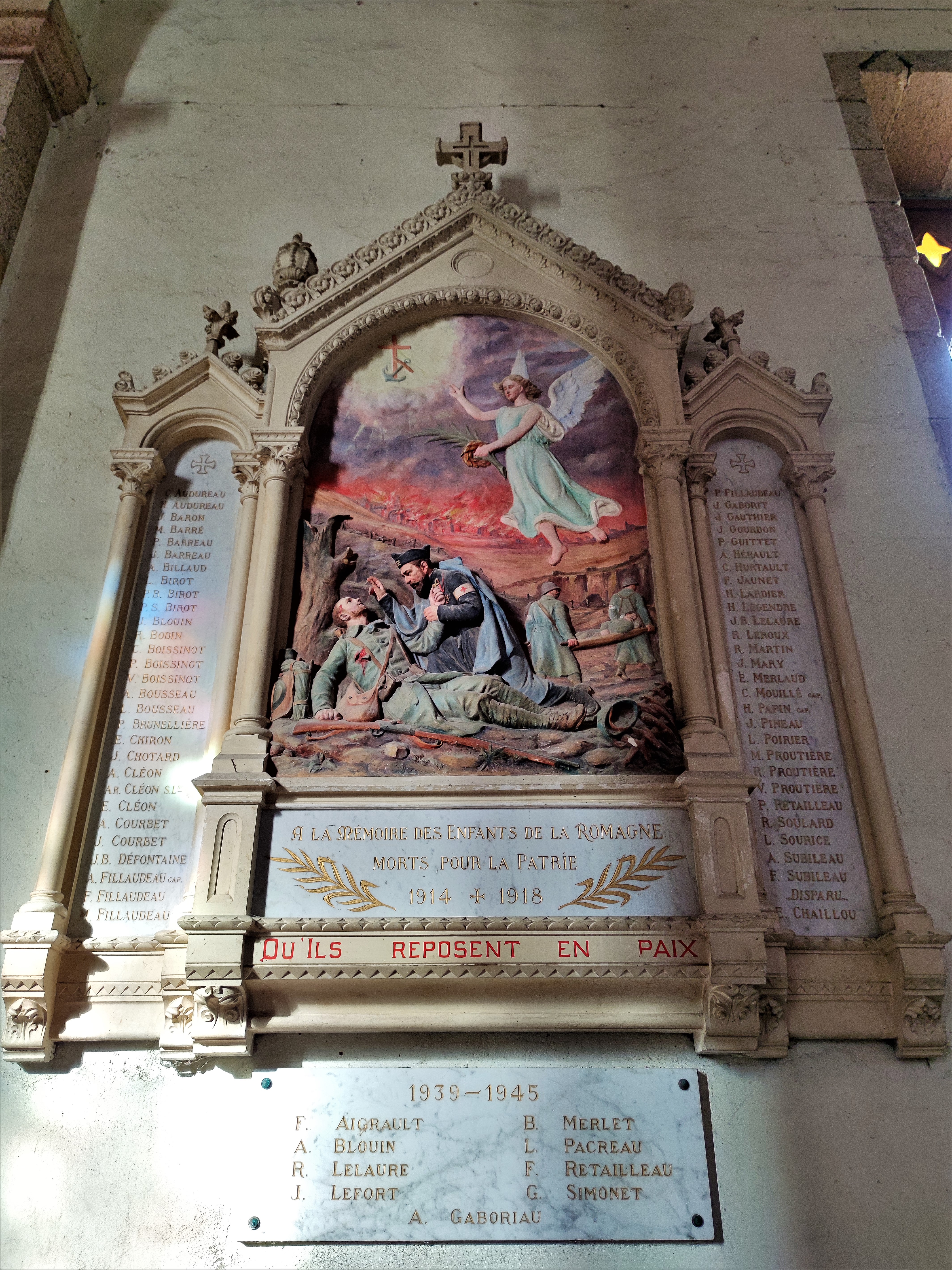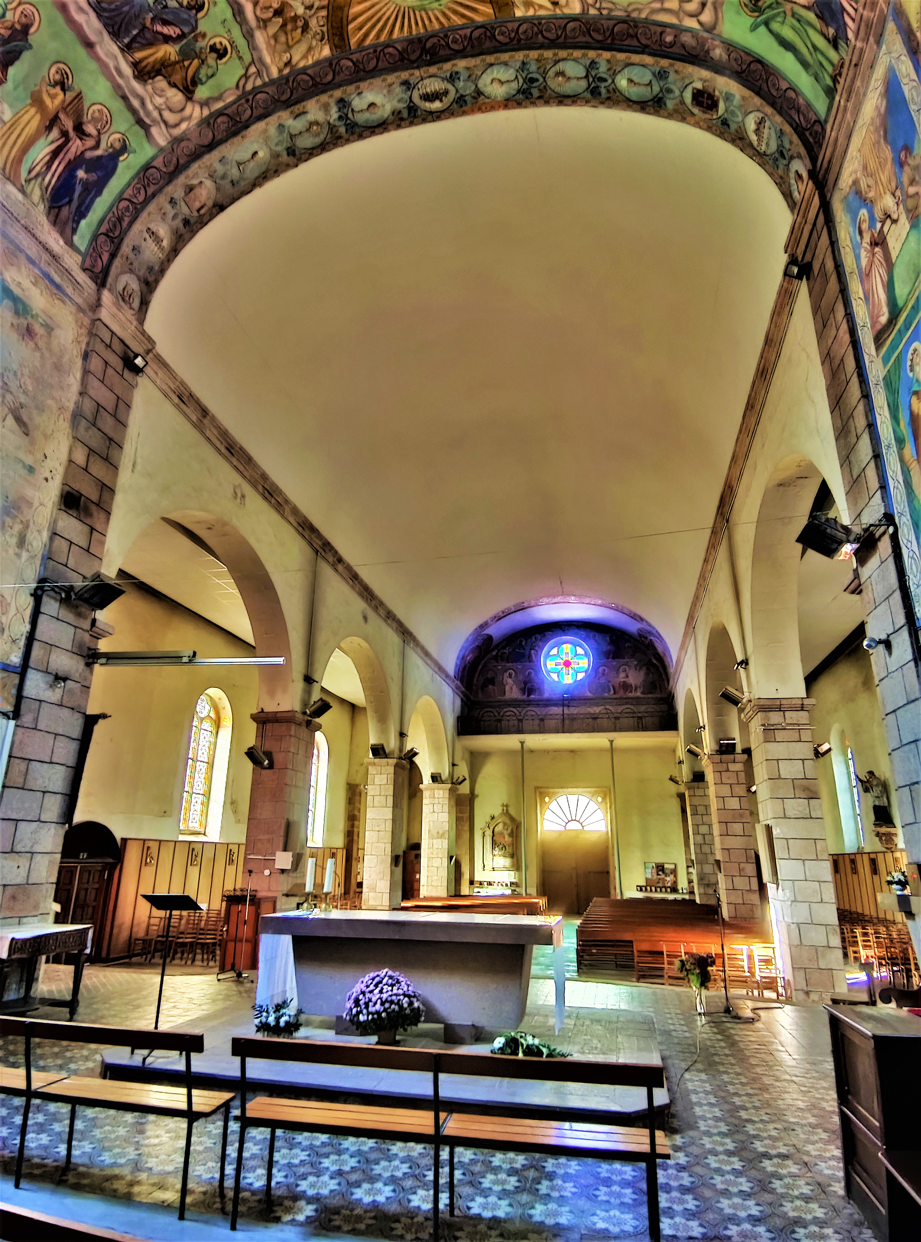 L'extérieur austère de cette église n'annonce pas un intérieur aussi chaleureux. Ouverte et accueillante, comme la chapelle Saint-Joseph située à proximité, cette église du 19ème a remplacé la précédente, détruite pendant la Guerre de Vendée, sommairement restaurée et trop petite pour le nombre de paroissiens. Y entrer, c'est découvrir un édifice orienté dont le chœur, à l'Est, et les superbes décors peints monopolisent l'attention. L'espace, à l'Ouest, au-dessus de la tribune a aussi été décoré. L'abbé Joseph Bourigaud (1821-1910) en est l'auteur. La façade à pignon est encadrée de deux tours, la nef, voûtée en berceau, est entourée de collatéraux plafonnés. Les trois vaisseaux séparés par des arcades en plein cintre s'ouvrent sur deux absidioles voûtées en berceau et une abside voûtée en demi-coupole. Un endroit propice à des instants d'intériorité, de détente ou de relaxation. L'œuvre de l'abbé Joseph Bourigaud est évocatrice et d'une grande maîtrise picturale. Quelques restaurations semblent nécessaires mais l'état général est bon.