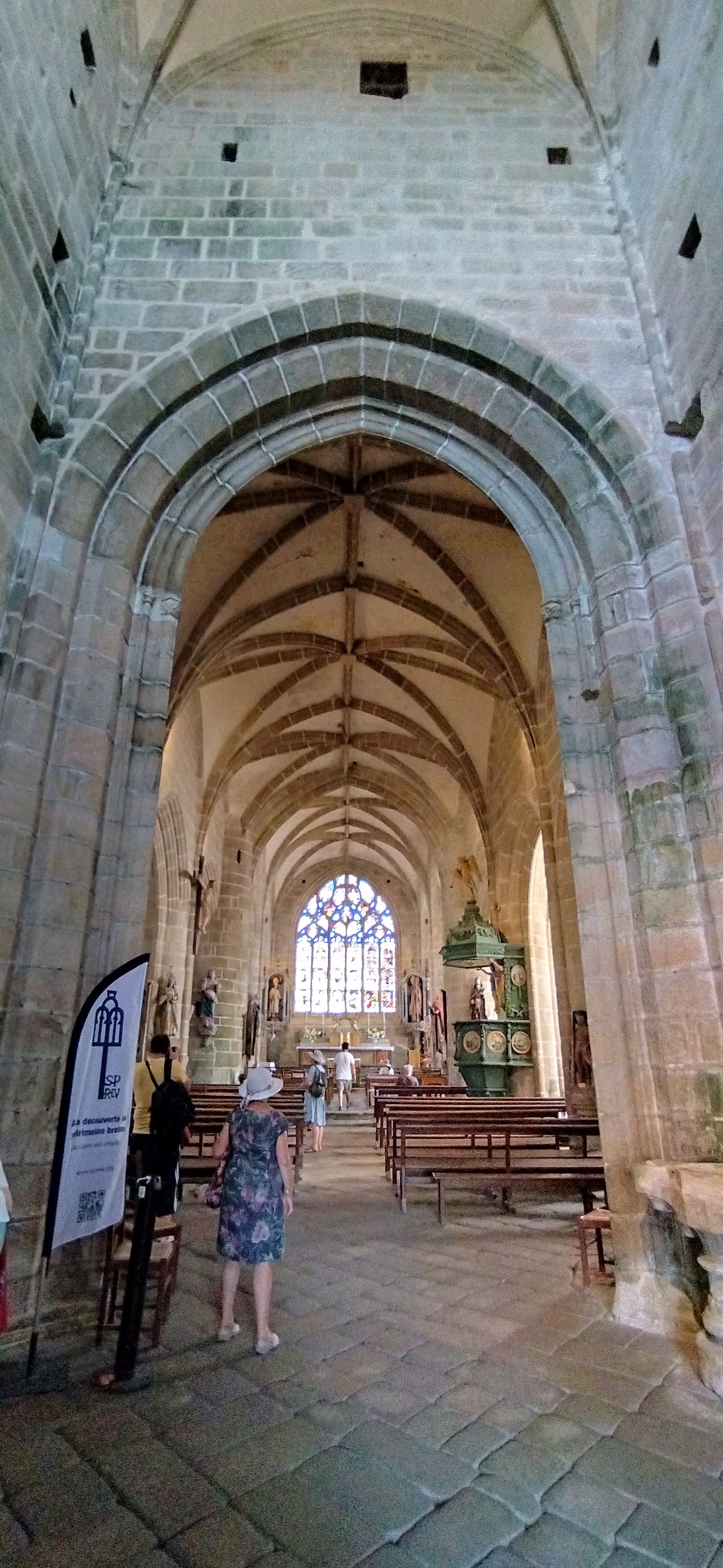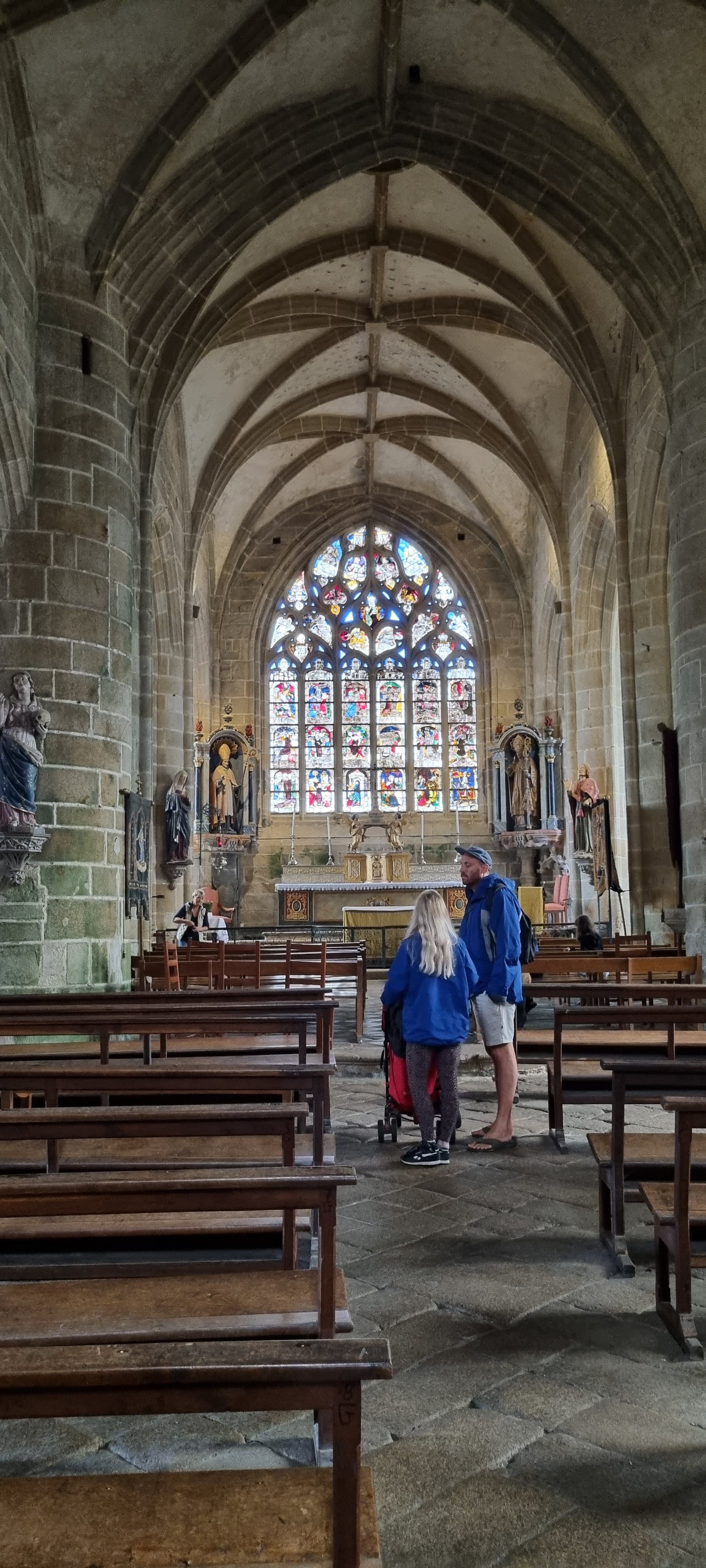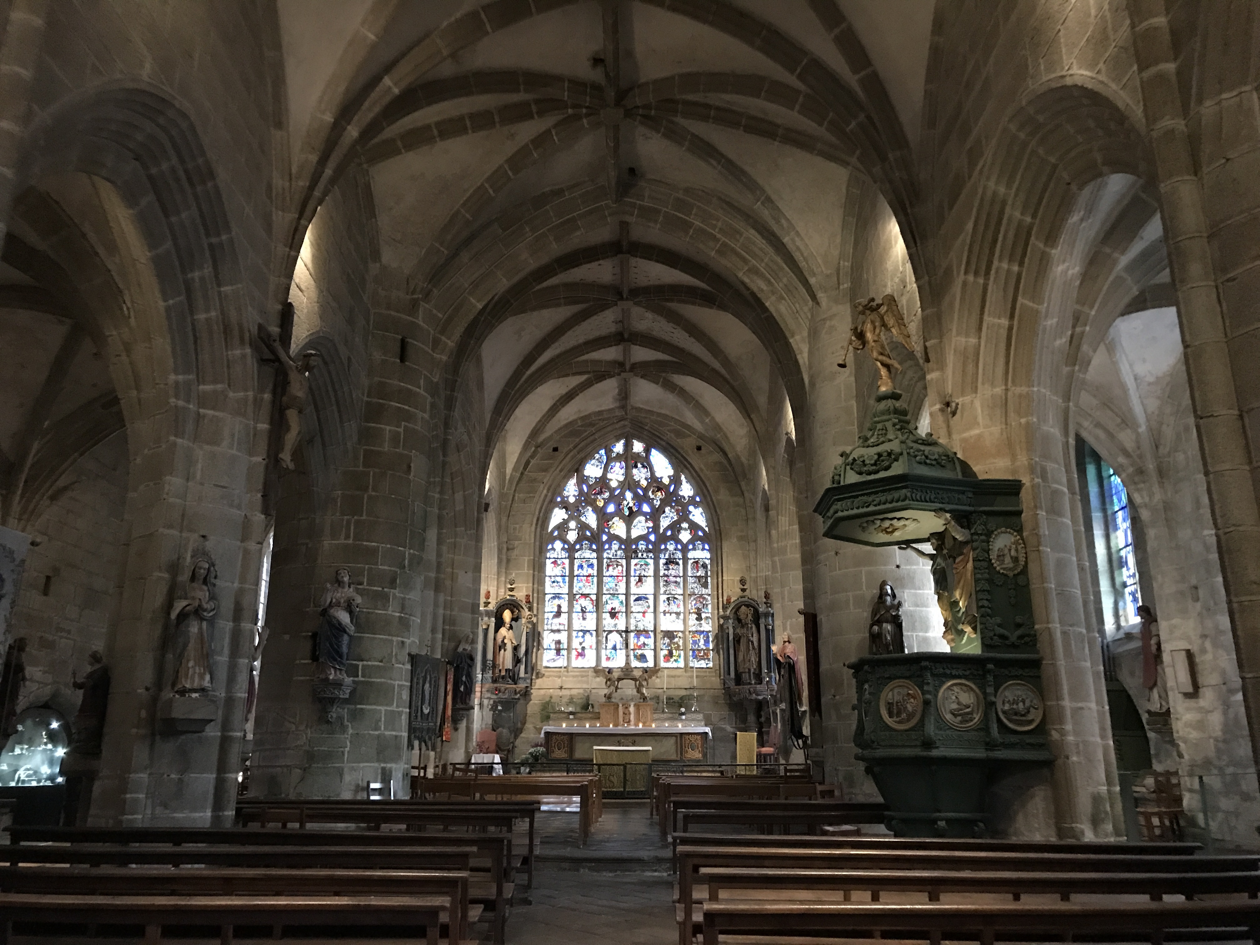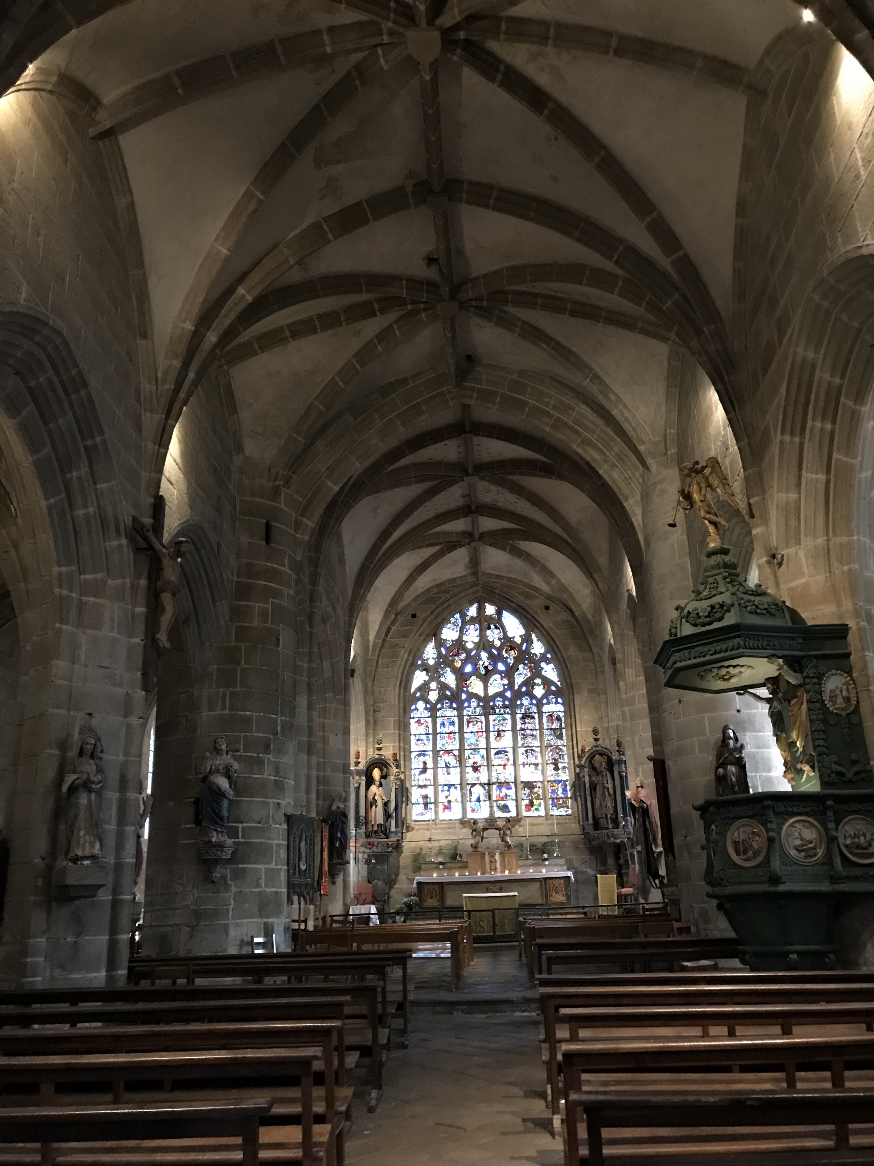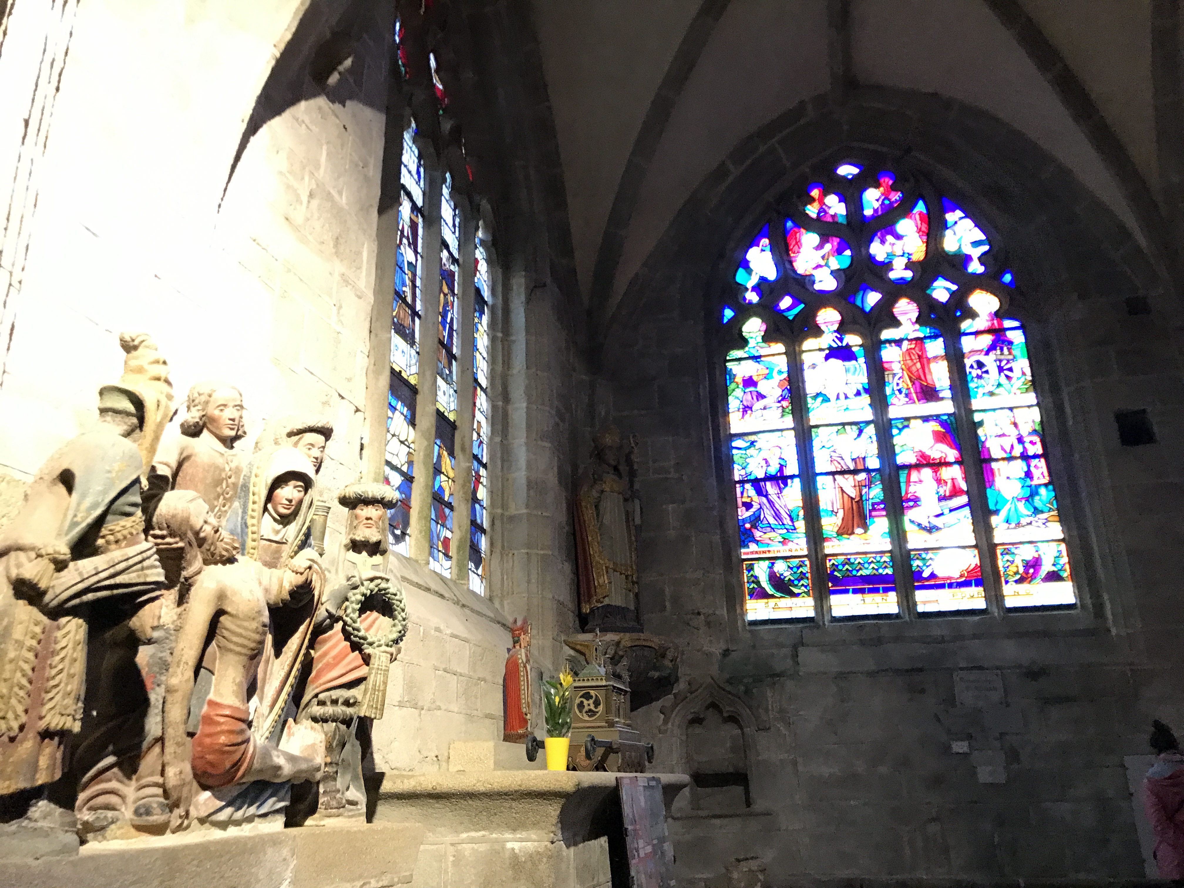 Époustouflante église dans le style typiquement breton avec des couleurs, des vitraux et des effigies tout à fait magnifique ! Je n'ai vu de pareil retable qu'en Italie ou en Alsace : il y a même le tombeau de Ronan ainsi que ces côtes dans un reliquaire ... Ouvrez bien les yeux, vous pourrez admirer des détails dans les peintures ou les vitraux qui sont incroyables ! Tout cela dans une ambiance musicale délicieuse !