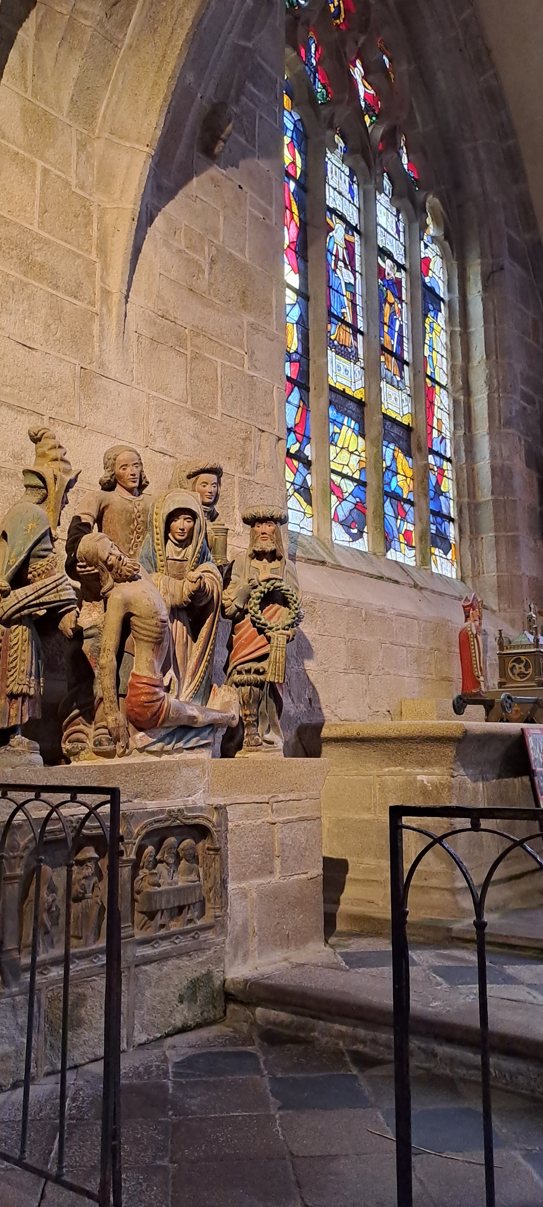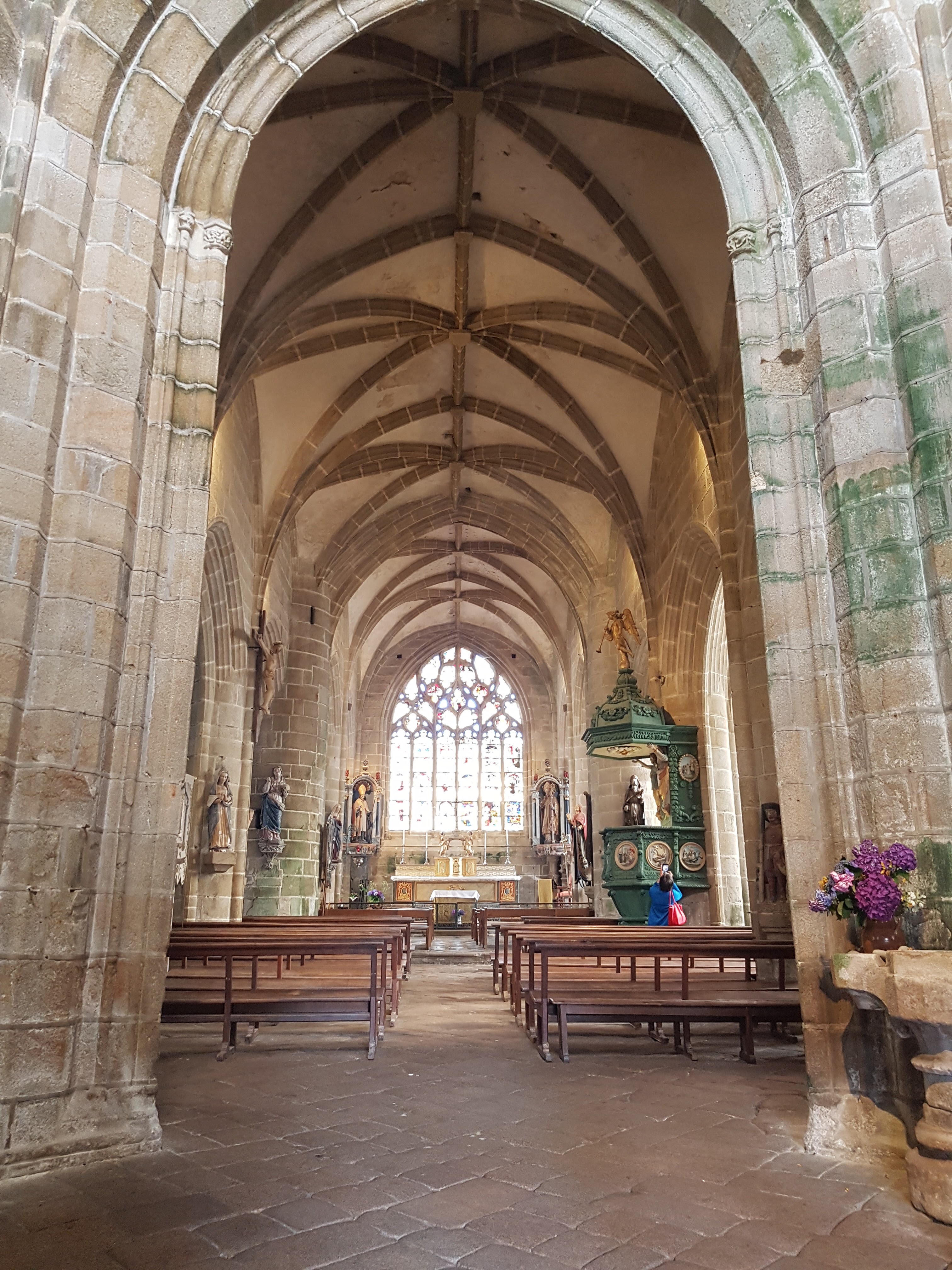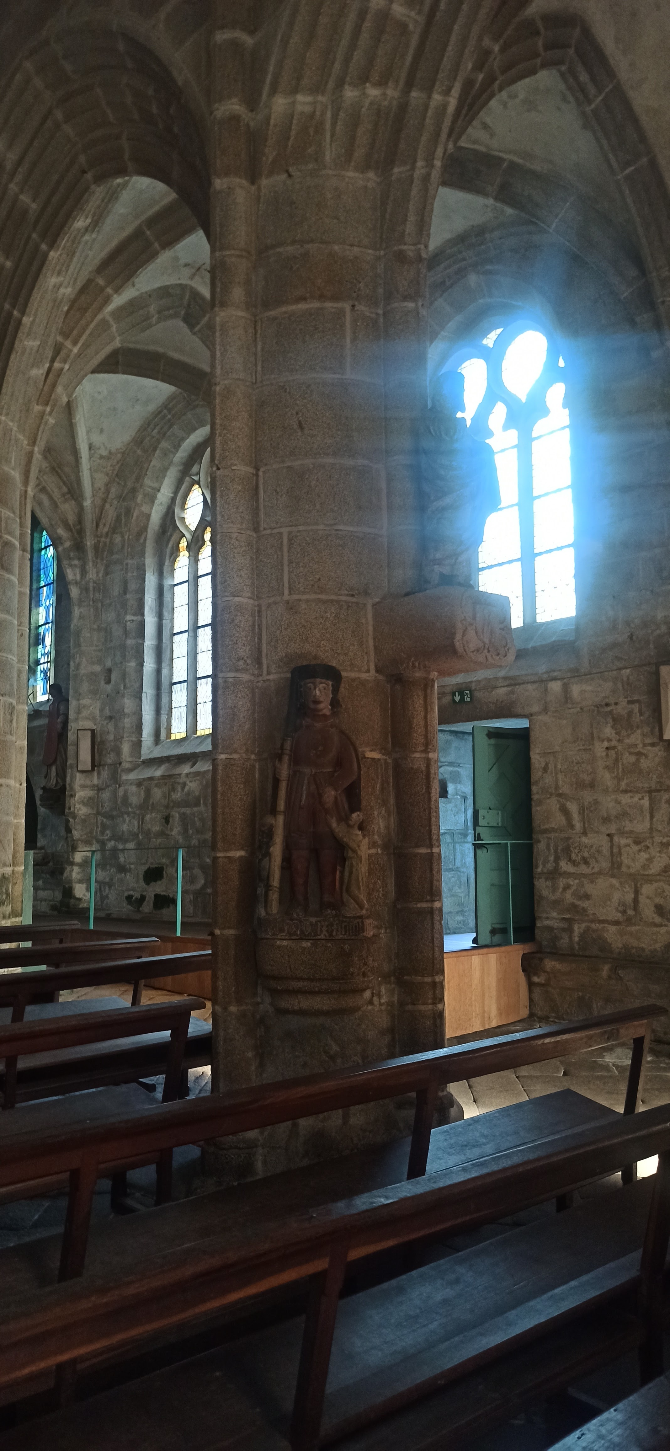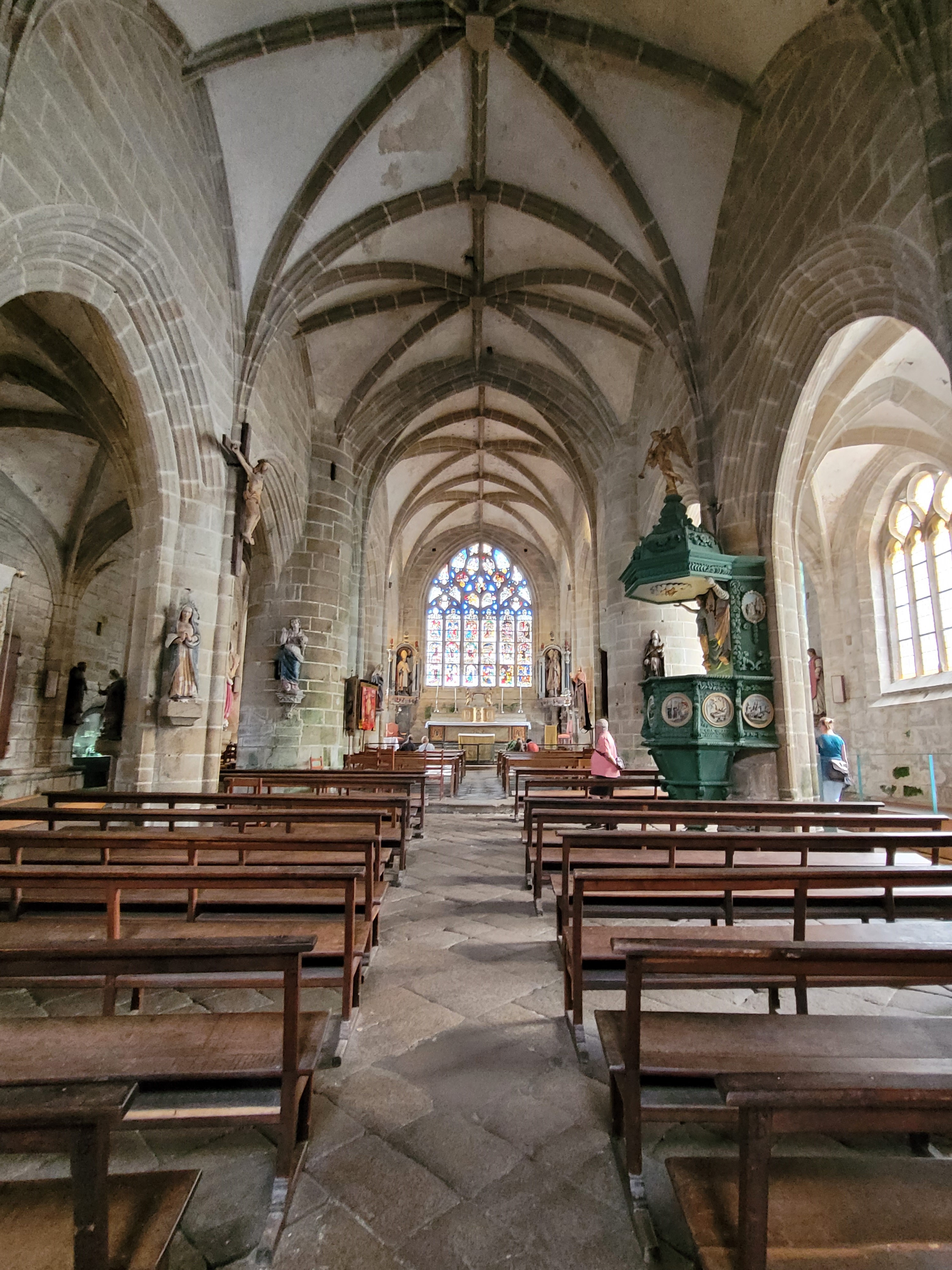 Époustouflante église dans le style typiquement breton avec des couleurs, des vitraux et des effigies tout à fait magnifique ! Je n'ai vu de pareil retable qu'en Italie ou en Alsace : il y a même le tombeau de Ronan ainsi que ces côtes dans un reliquaire ... Ouvrez bien les yeux, vous pourrez admirer des détails dans les peintures ou les vitraux qui sont incroyables ! Tout cela dans une ambiance musicale délicieuse !
