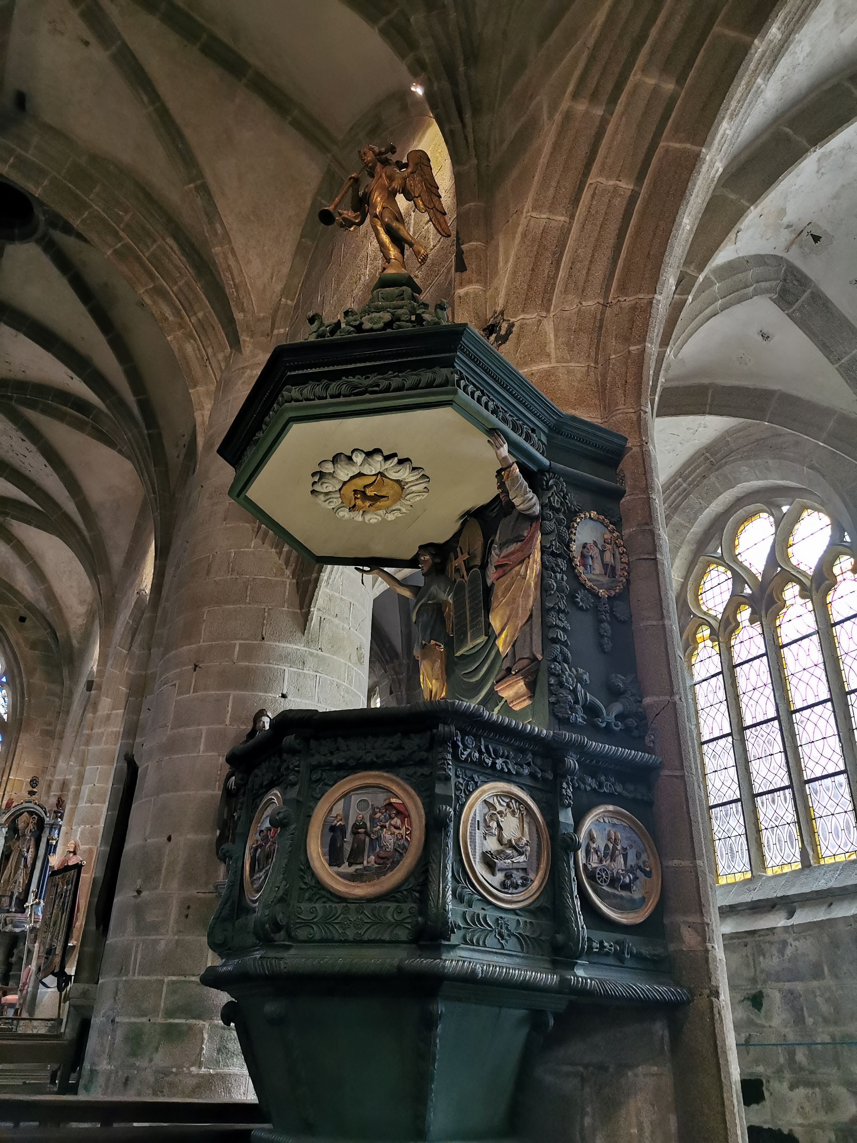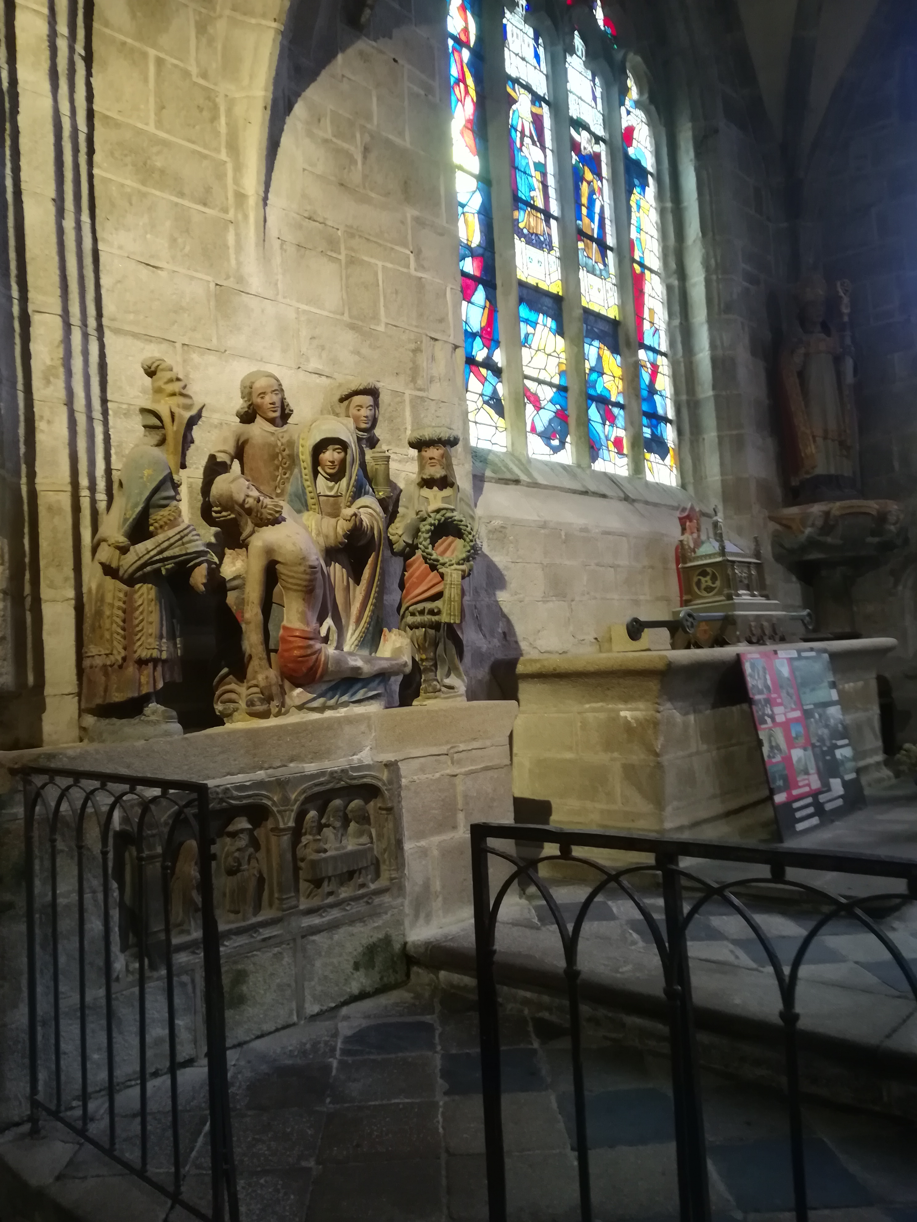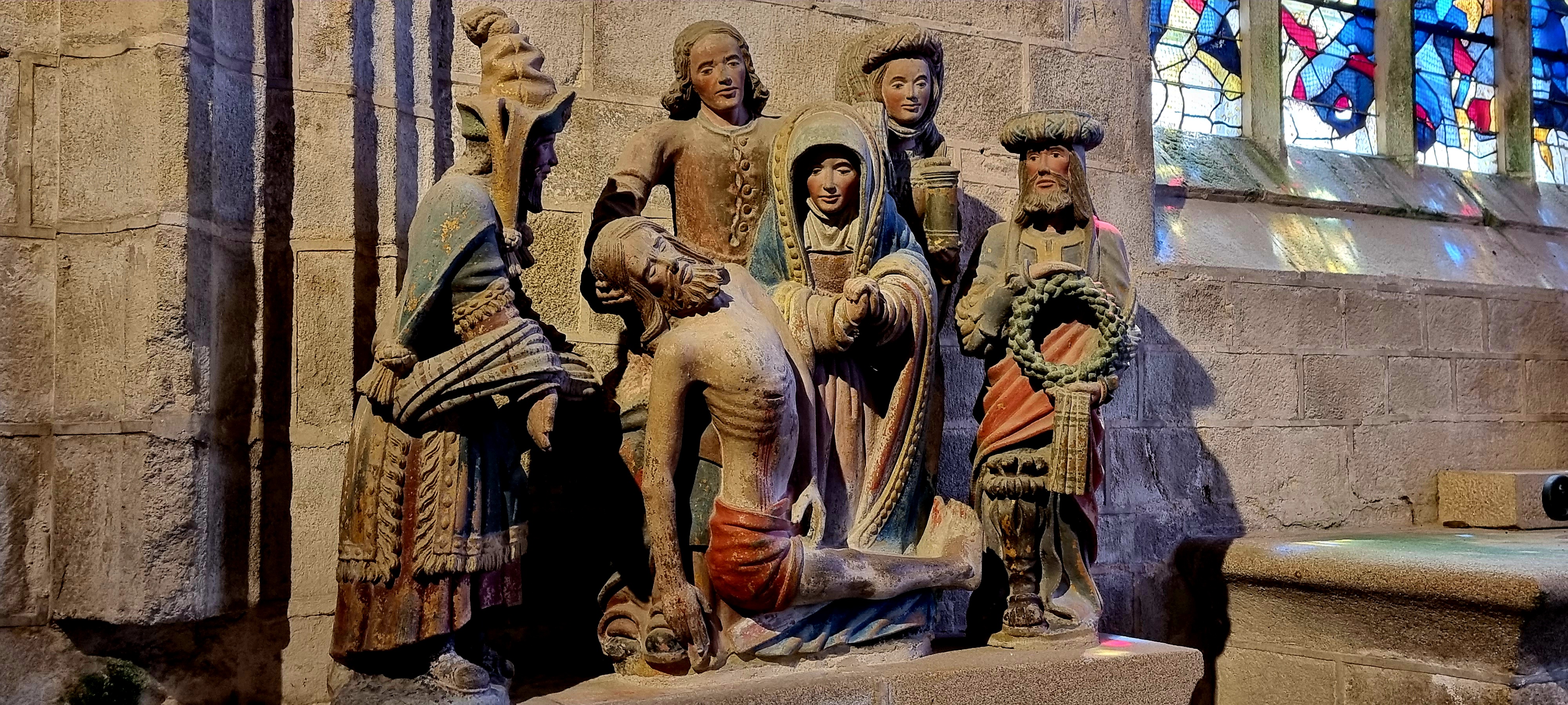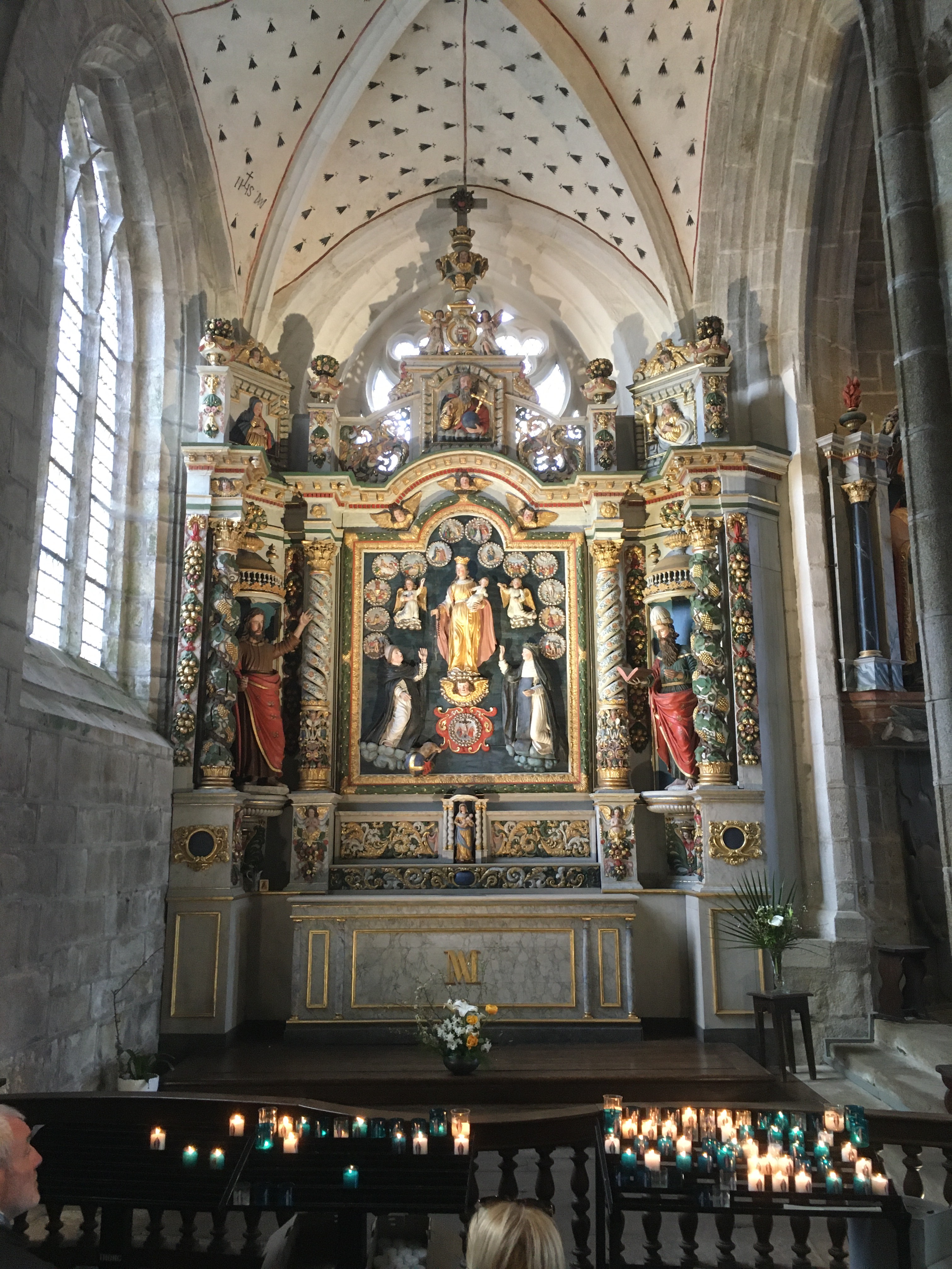 Époustouflante église dans le style typiquement breton avec des couleurs, des vitraux et des effigies tout à fait magnifique ! Je n'ai vu de pareil retable qu'en Italie ou en Alsace : il y a même le tombeau de Ronan ainsi que ces côtes dans un reliquaire ... Ouvrez bien les yeux, vous pourrez admirer des détails dans les peintures ou les vitraux qui sont incroyables ! Tout cela dans une ambiance musicale délicieuse !