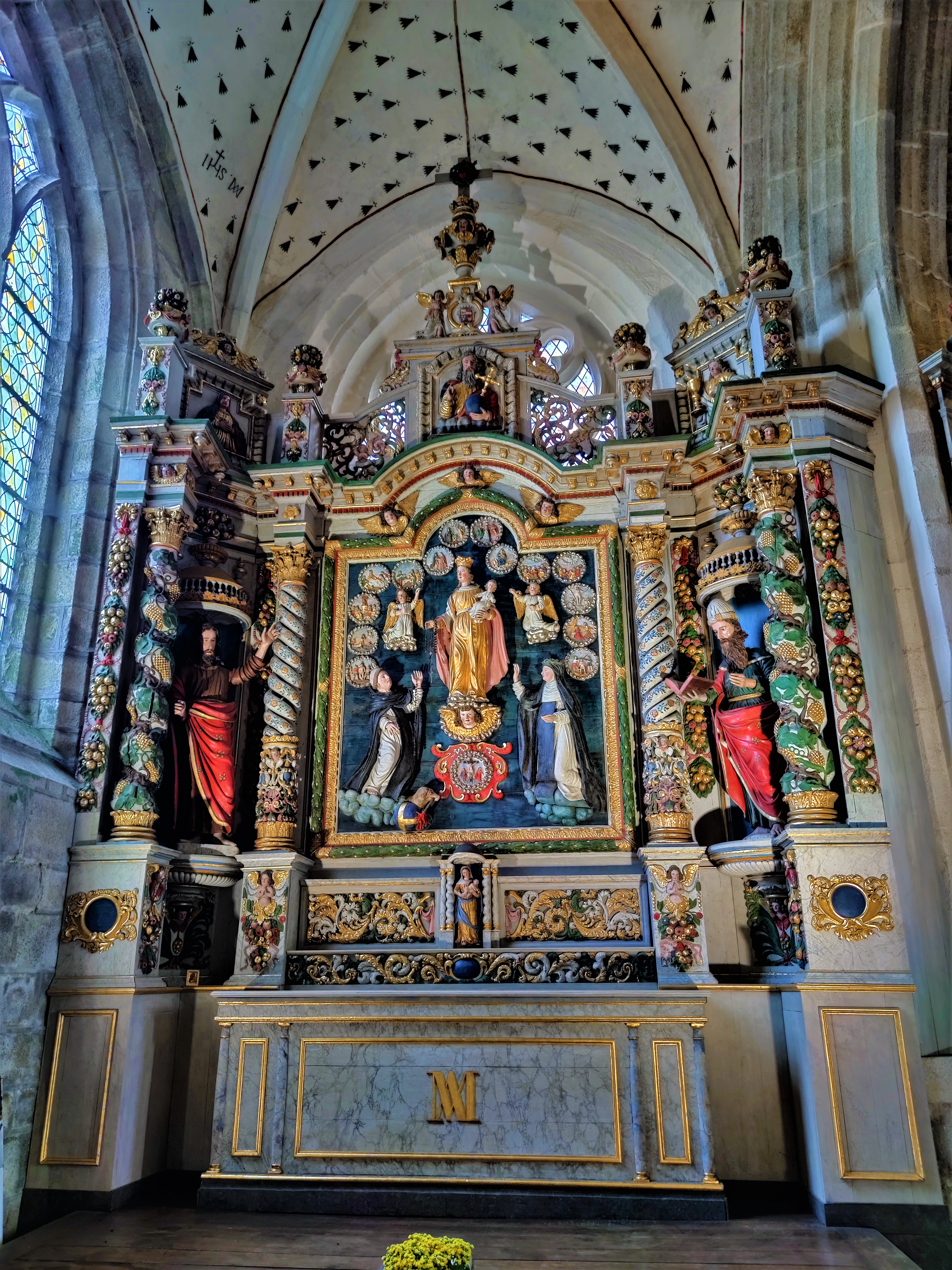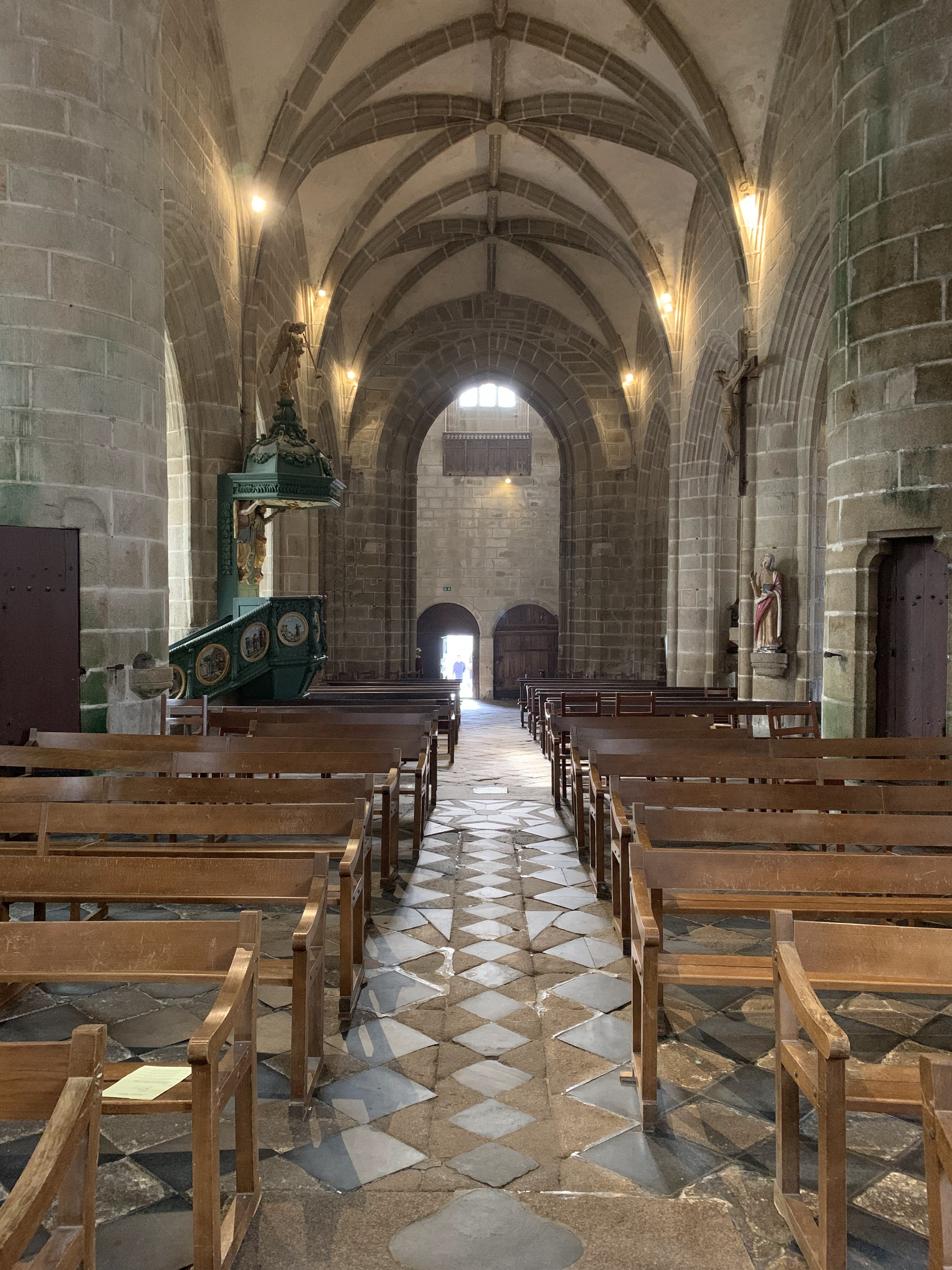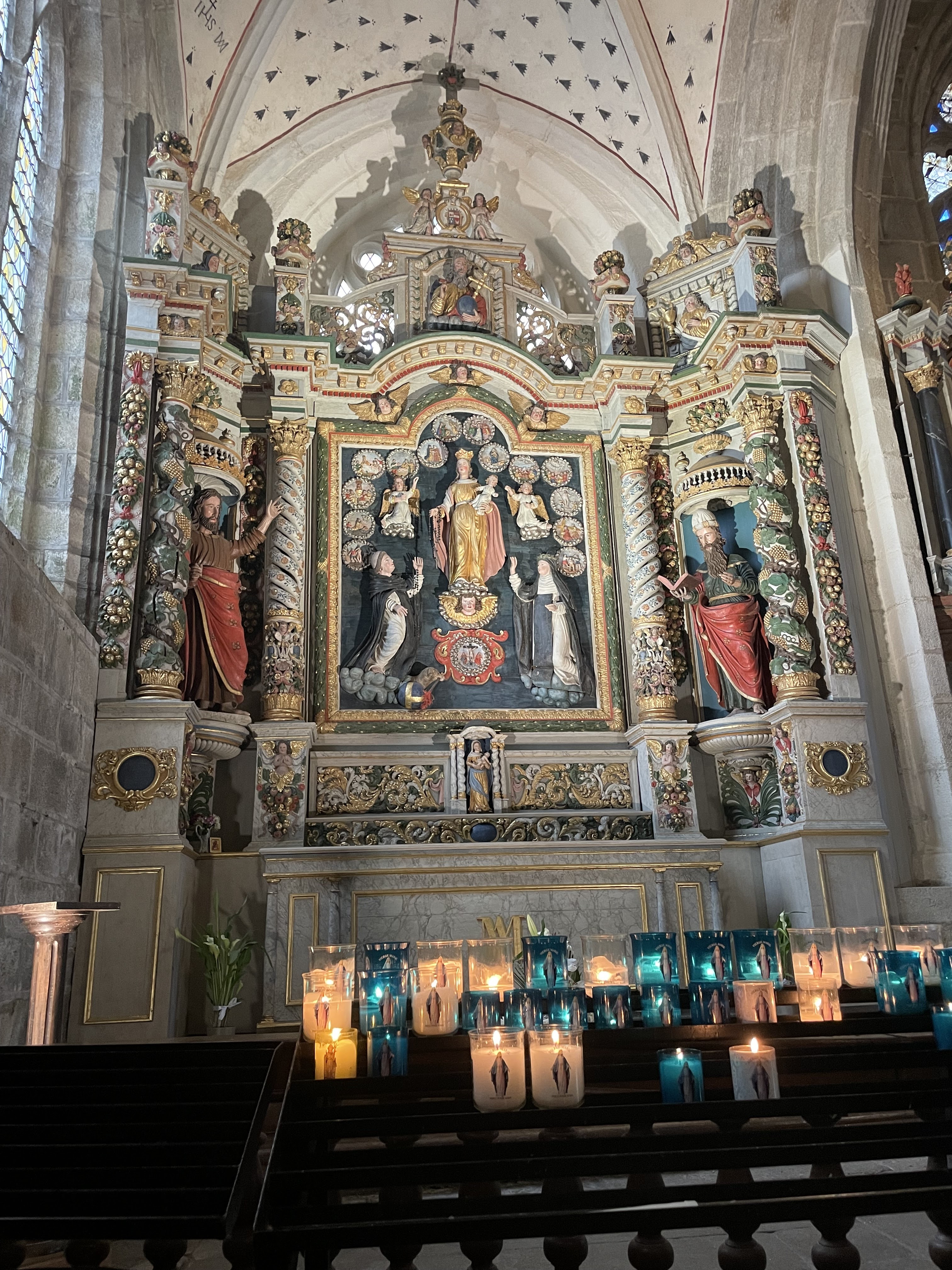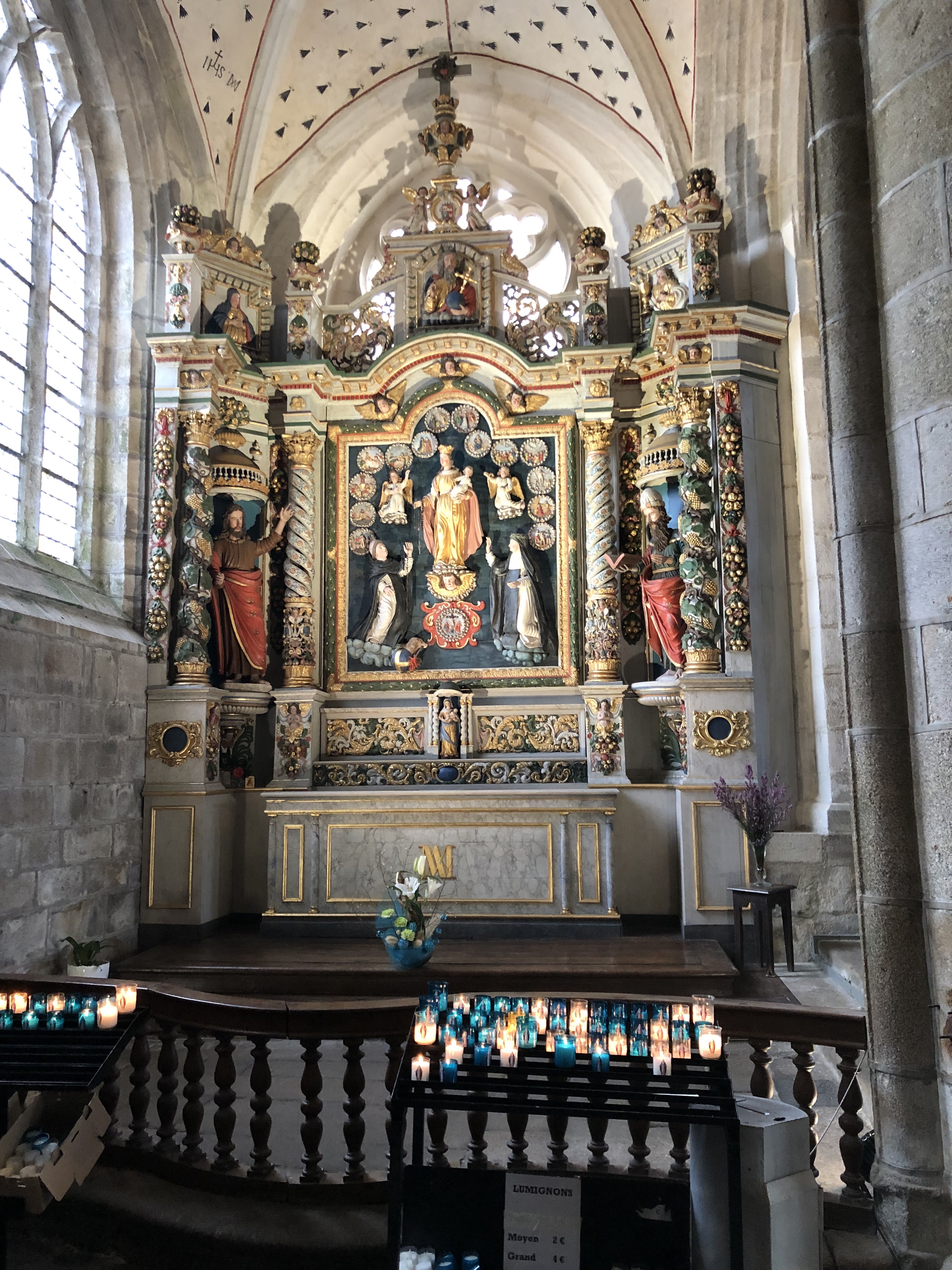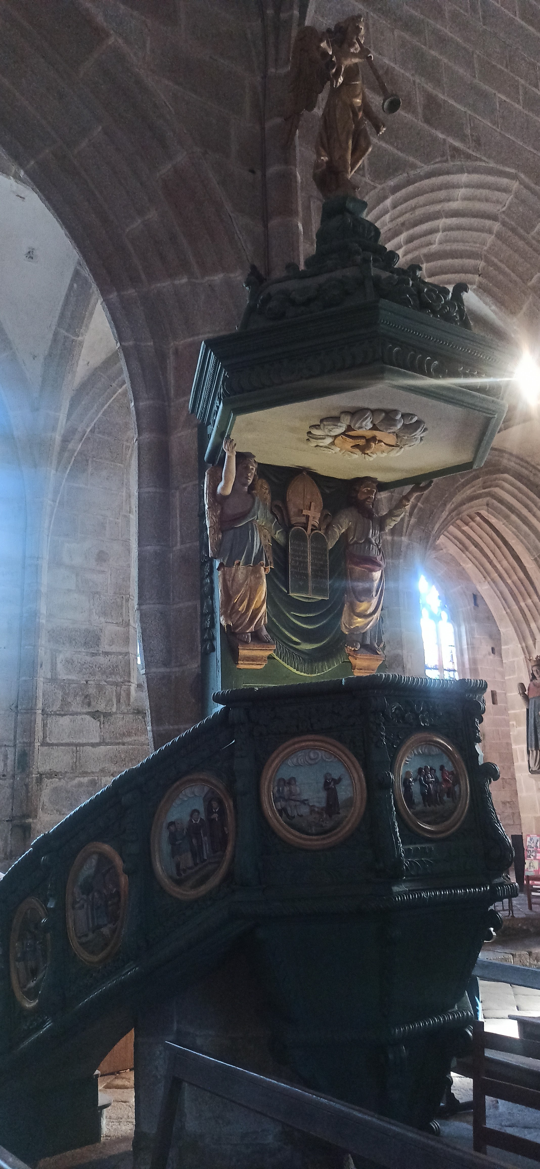 Époustouflante église dans le style typiquement breton avec des couleurs, des vitraux et des effigies tout à fait magnifique ! Je n'ai vu de pareil retable qu'en Italie ou en Alsace : il y a même le tombeau de Ronan ainsi que ces côtes dans un reliquaire ... Ouvrez bien les yeux, vous pourrez admirer des détails dans les peintures ou les vitraux qui sont incroyables ! Tout cela dans une ambiance musicale délicieuse !