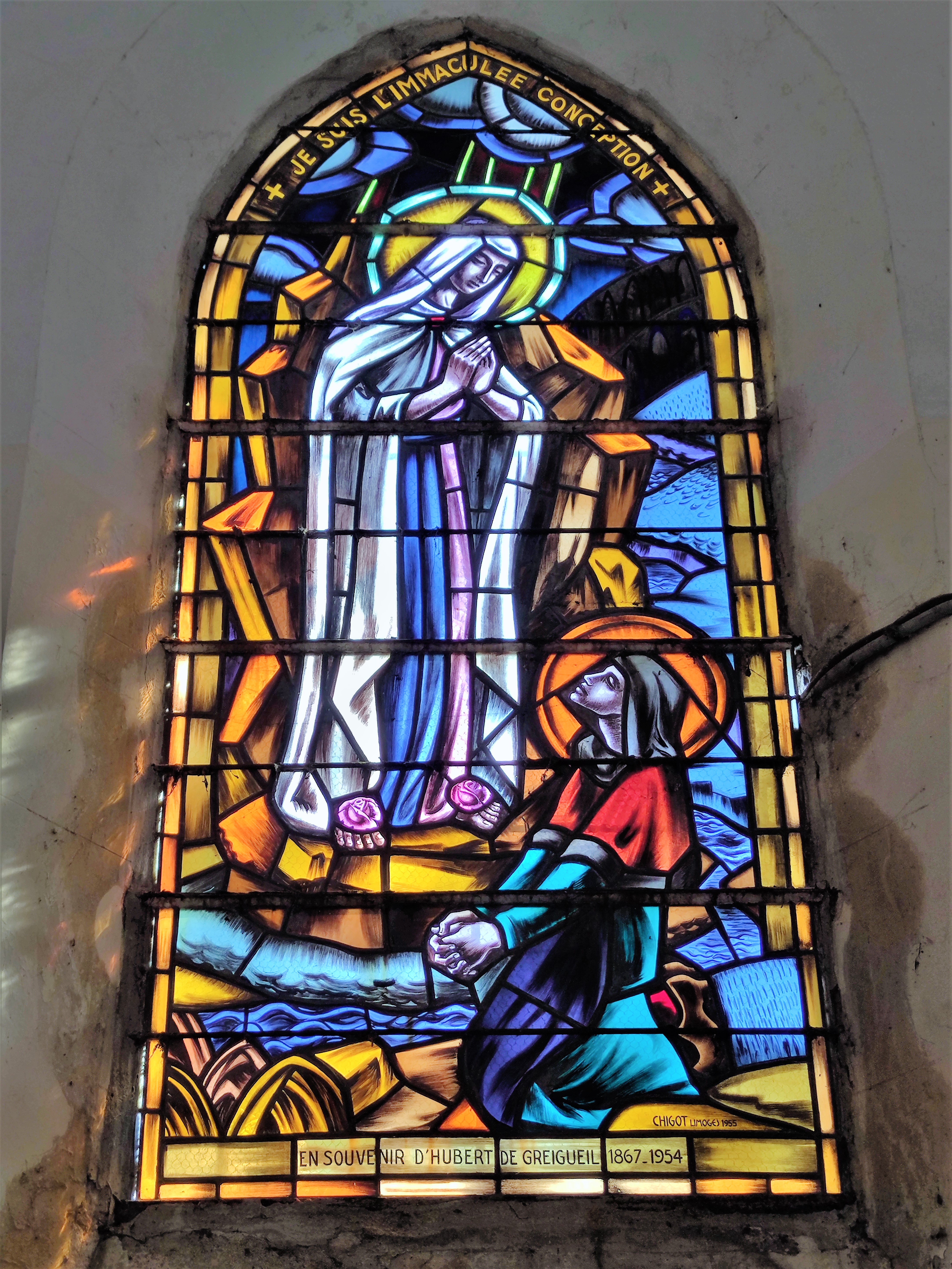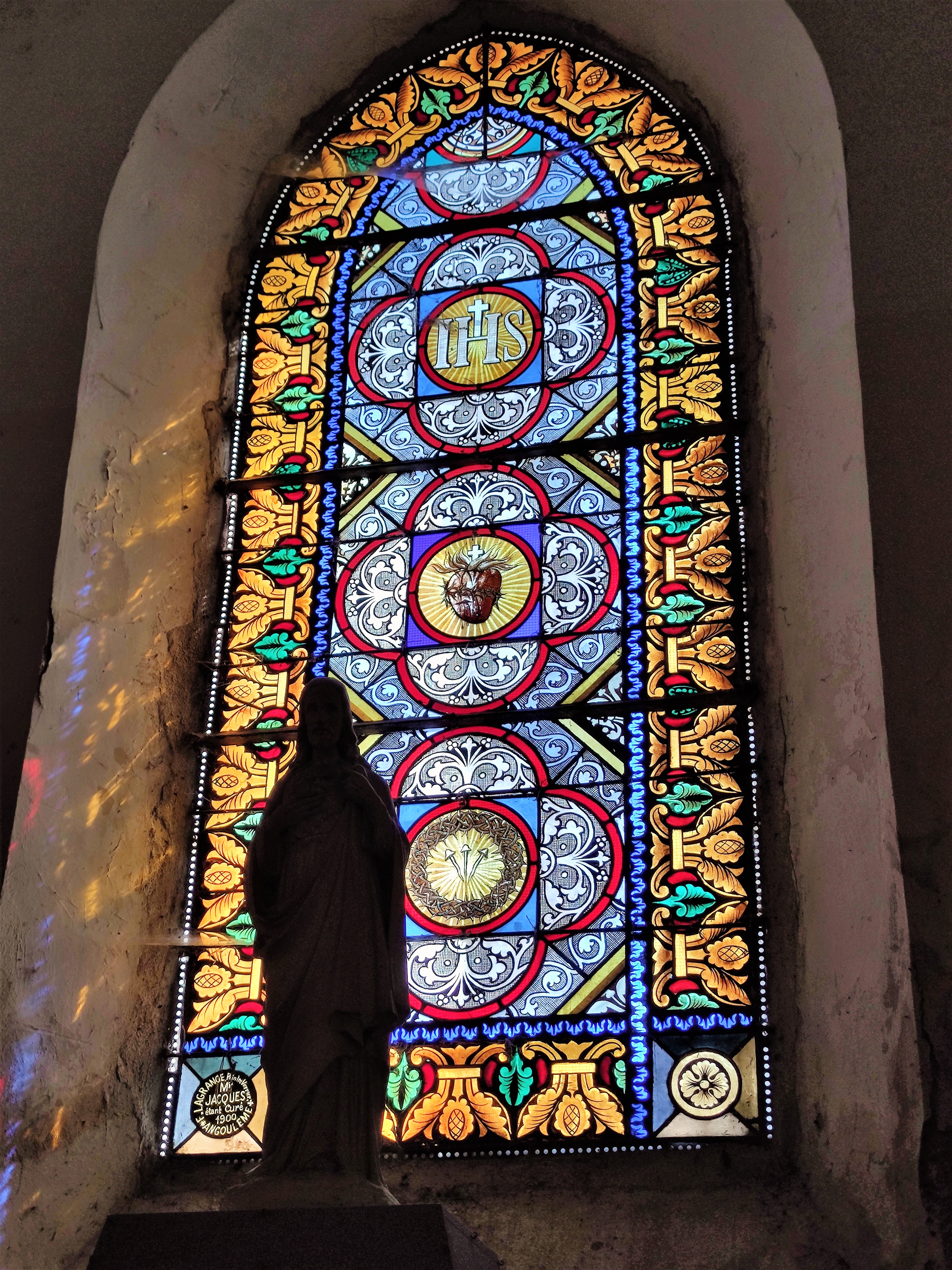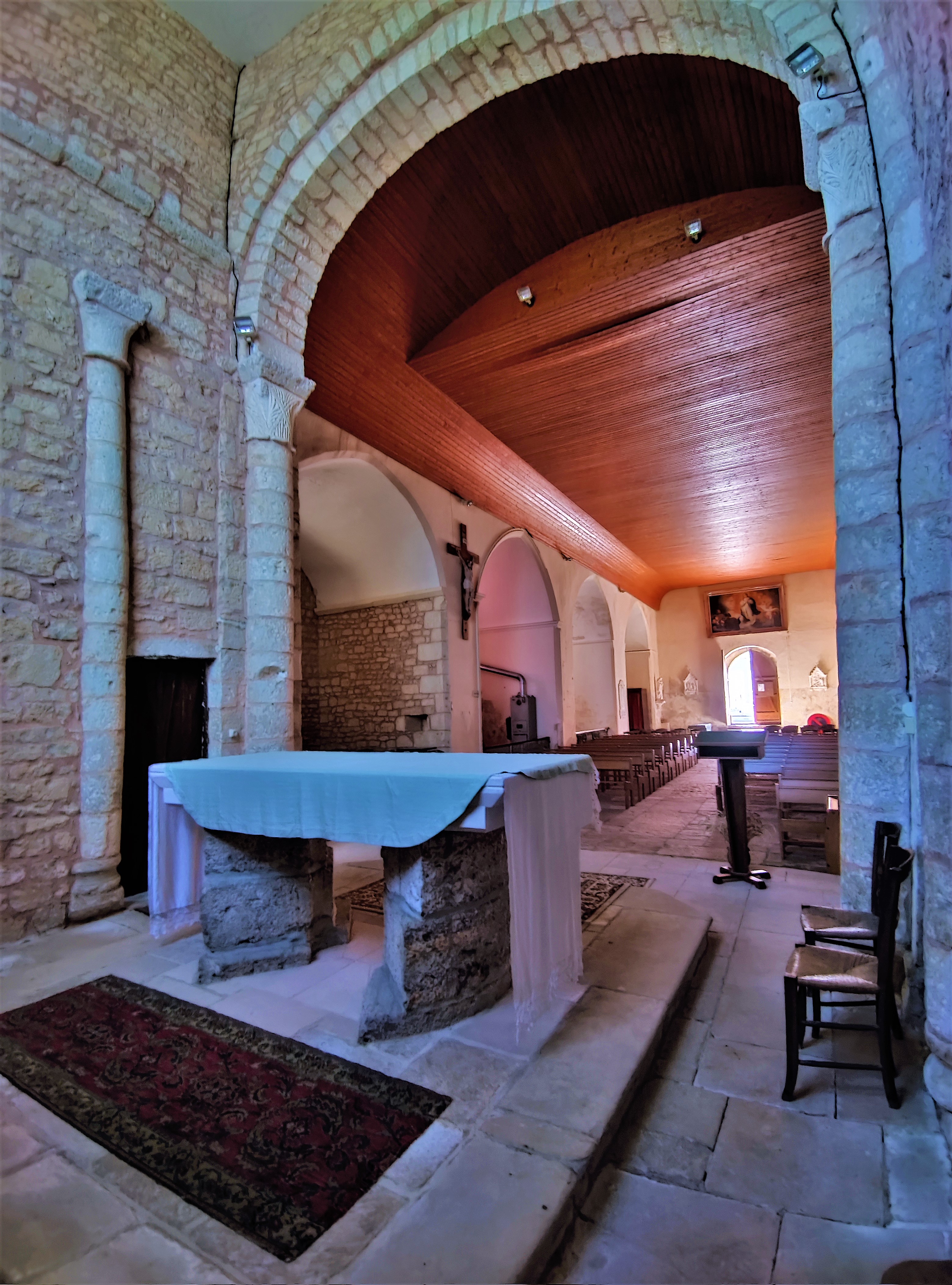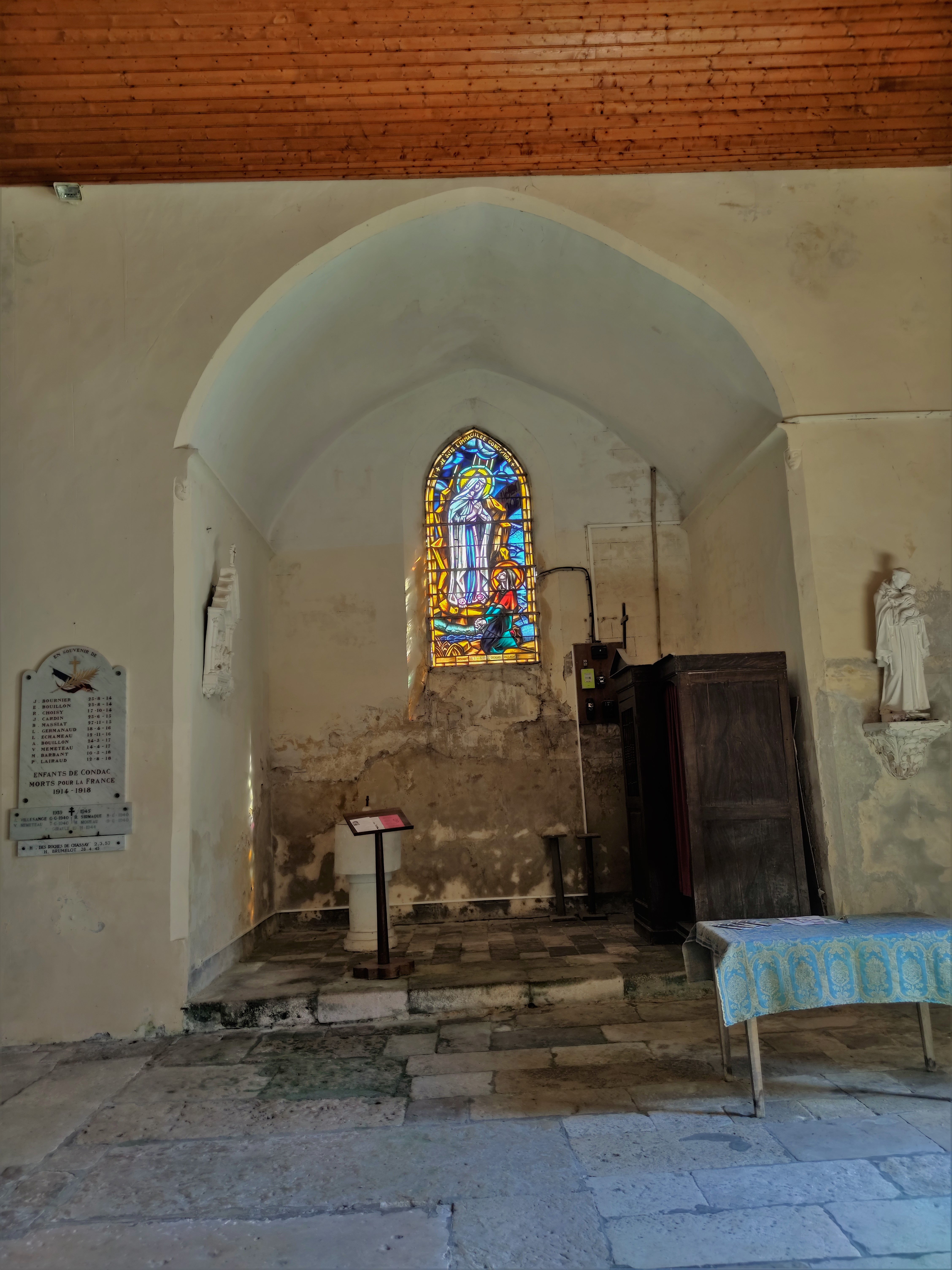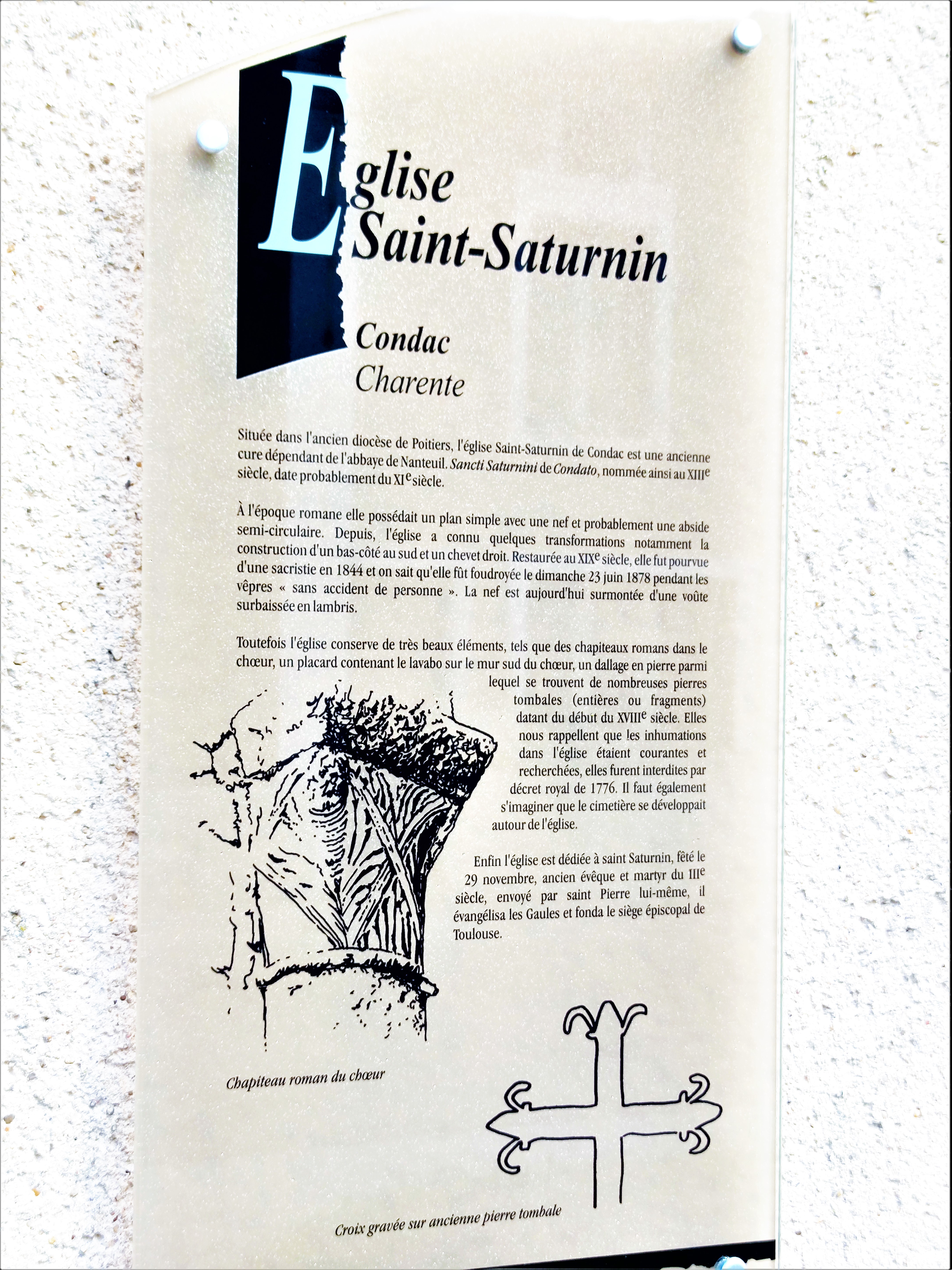 Témoin millénaire, ce fut une découverte intéressante, modeste héritage de nos anciens, prodigieux bâtisseurs. Construite probablement au 11ème siècle, il en reste quelques traces romanes dans le chœur. Cette église fut modifiée et renommée Saint-Saturnin à la fin du 13ème siècle. Comme un collatéral, une série de chapelles a été ajoutée au Sud, leurs vitraux apportent la lumière à la nef, le mur Nord est aveugle. La verrière du chœur honore Saint-Saturnin (Saturninus) et Saint-Ausone (Ausonius), deux personnages importants de la période Gallo-Romaine. Un cimetière de cette période a été découvert à Condac fin 19ème siècle. Peuplée depuis très longtemps, cet endroit était déjà une viguerie (juridiction administrative) avant l'an 1000.