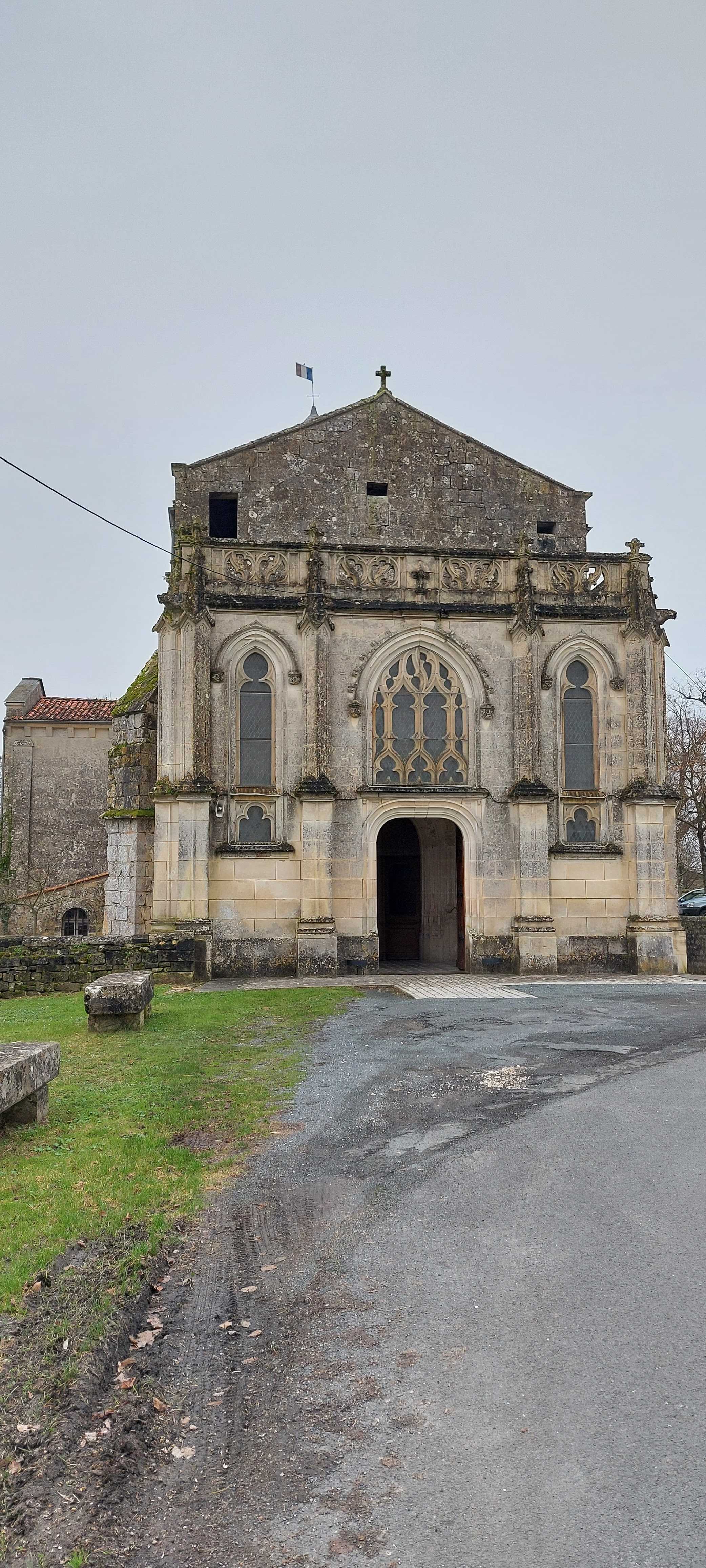 Une église romane du 12è, rehaussée au 15è, fortifiée au 16è, la façade gothique est du 19è. L'église était close lors de mon passage, la mairie l'était aussi, je repasserai voir l'intérieur mais l'extérieur est déjà superbe. L'endroit ne manque ni de charme ni d'intérêt, il loge 3 monuments, 2 maisons fortes sont disposées au nord-est et au sud-est de l'église. Faire le tour de cette dernière permet de découvrir les différentes époques de construction. Les vestiges romans apparaissent tout autour, rangées de modillons sur les murs gouttereaux et les croisillons, ainsi que l'architecture et les décors sculptés du chevet. Les travaux des fortifications défensives avec chemin de ronde, témoignent des guerres de religions très actives dans la région. La façade du 19è est superbe, elle précède l'ancienne façade romane modifiée en style gothique au 15è. La profanation avec dégradation dont l'église fut victime en février 2020, plus sa situation un peu isolée, sont peut-être les causes de sa fermeture.