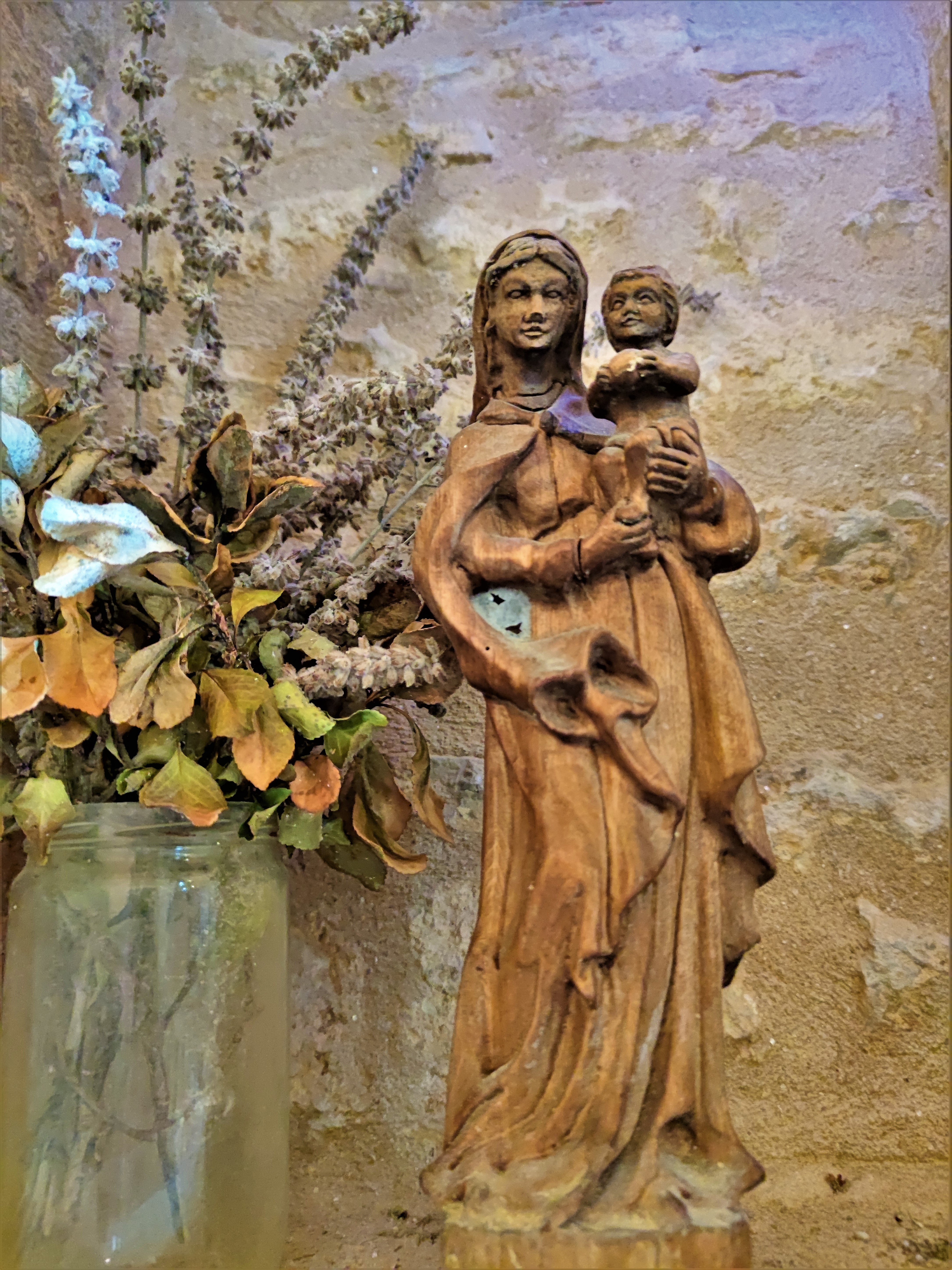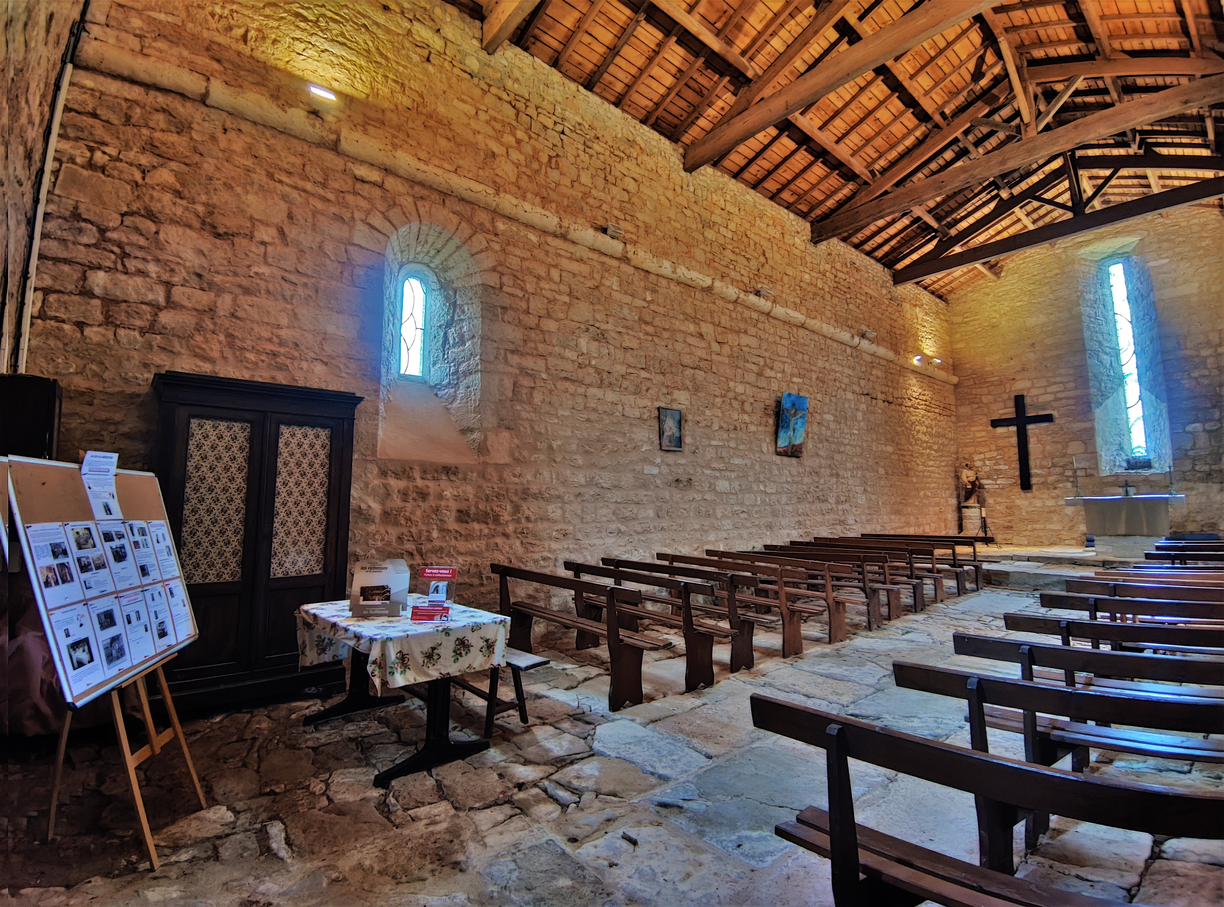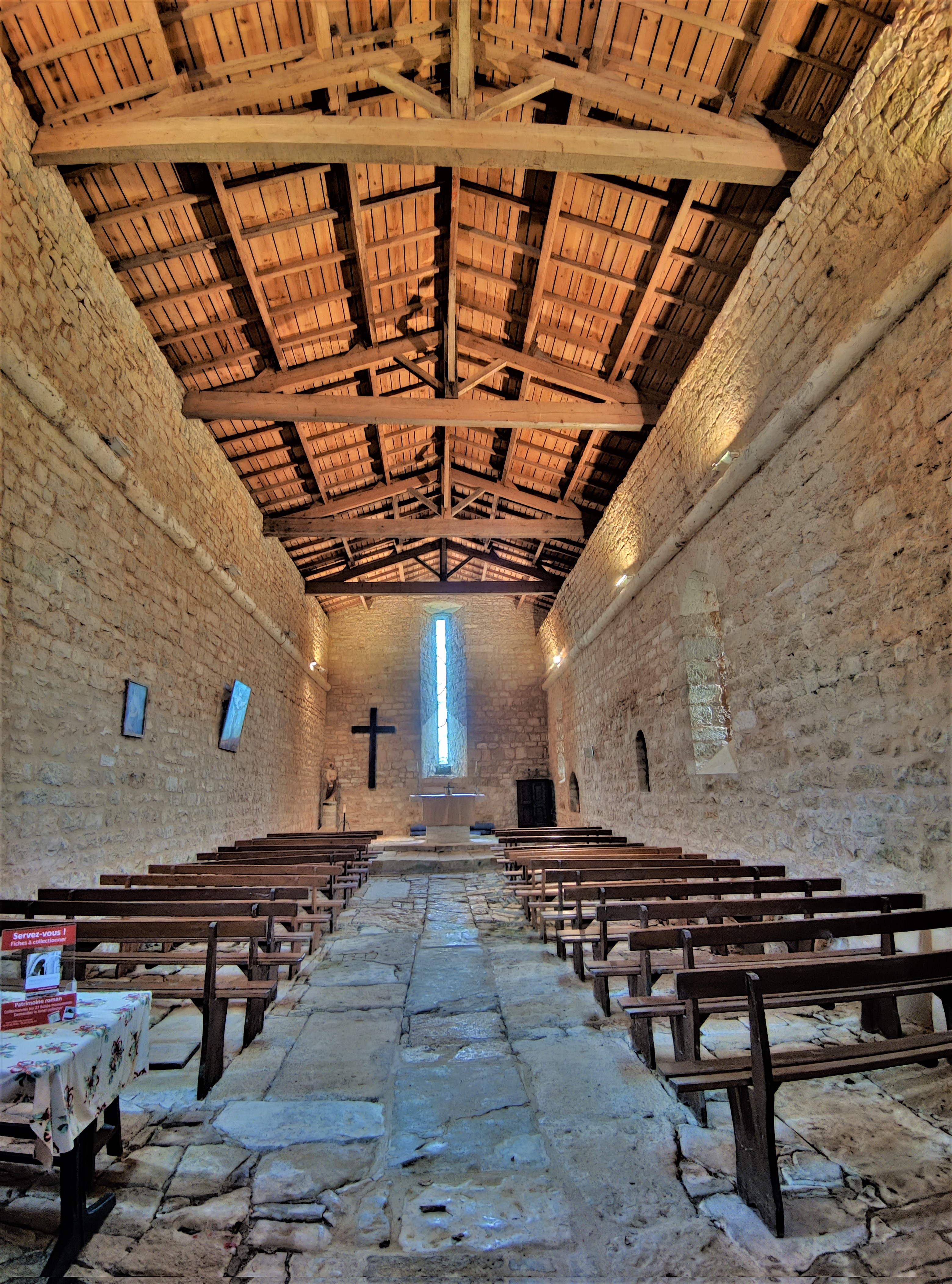 Pour les amoureux des vieilles pierres et de pureté, l'antithèse de la somptuosité et du prestige. Protégée depuis 1950 par les Monuments Historiques (Inscription) cette église est l'occasion d'un voyage dans le temps de mille ans. Une commune toute petite, 282 h. en 1841, 31 h. aujourd'hui, paroisse minuscule souvent rattachée à une paroisse voisine. Conséquemment, son église du 11ème siècle a survécu à plusieurs périodes qui auraient pu la conduire à la ruine. La simplicité et l'économie ont été les maîtres-mots qui ont présidé à sa construction et à son entretien. En bel état aujourd'hui, je l'ai trouvée ouverte et accueillante, elle est accolé à la mairie. La charpente apparente laisse voir le départ de la voûte primitive. J'ai été comblé par cette découverte, surprenante mais d'une stupéfiante authenticité. Agora que l'on peut imaginer aujourd'hui telle qu'elle fut, il y a 1000 ans, bruissante des paroles des paroissiens, lieu de décision et de spiritualité.