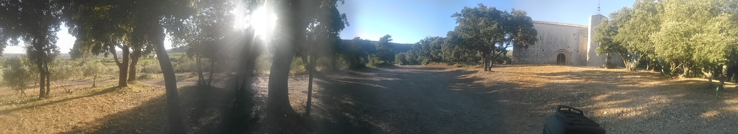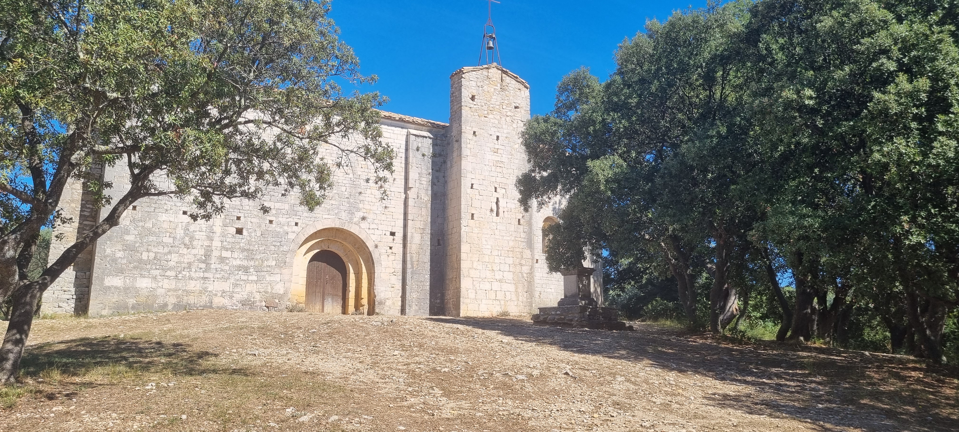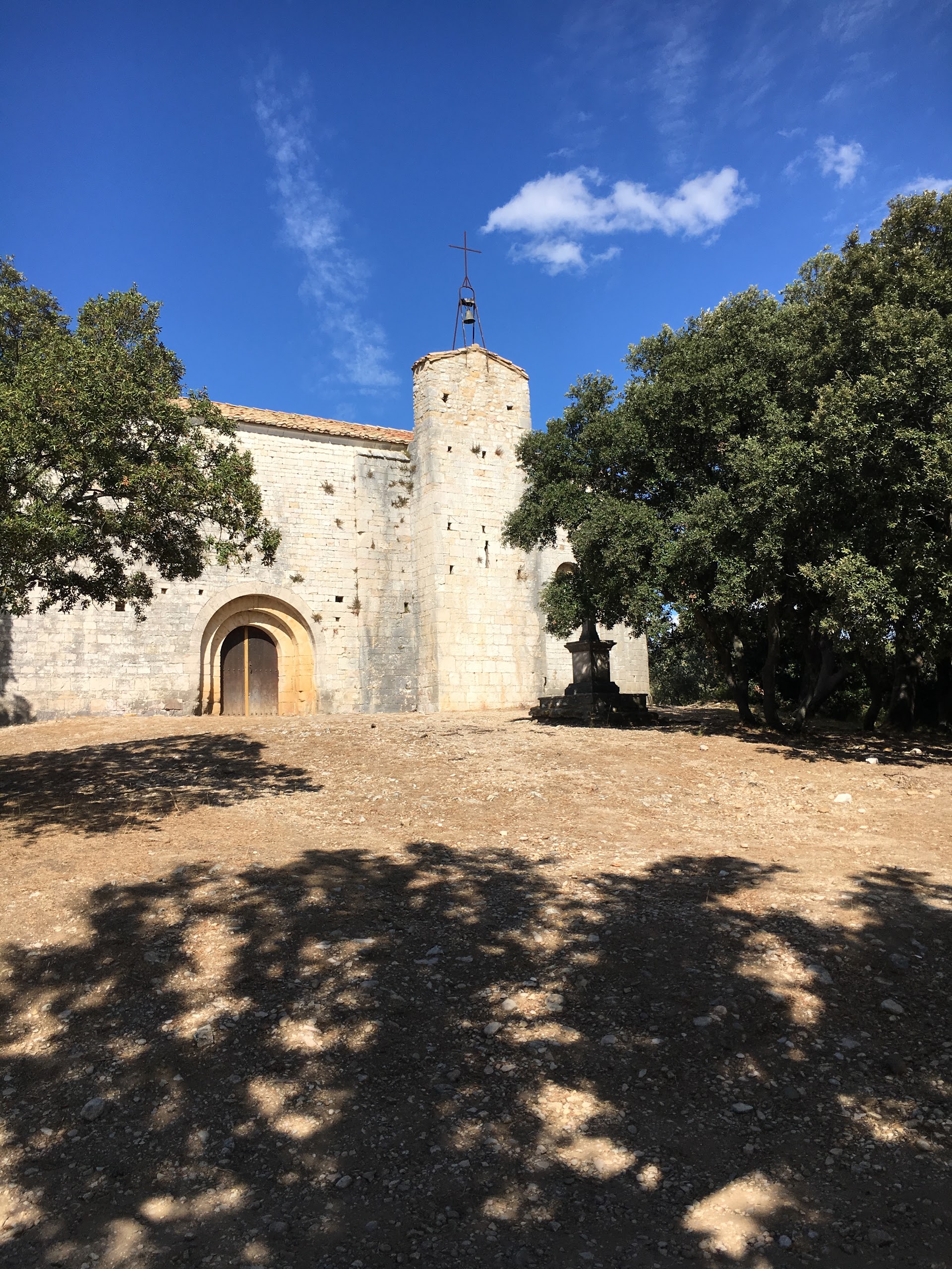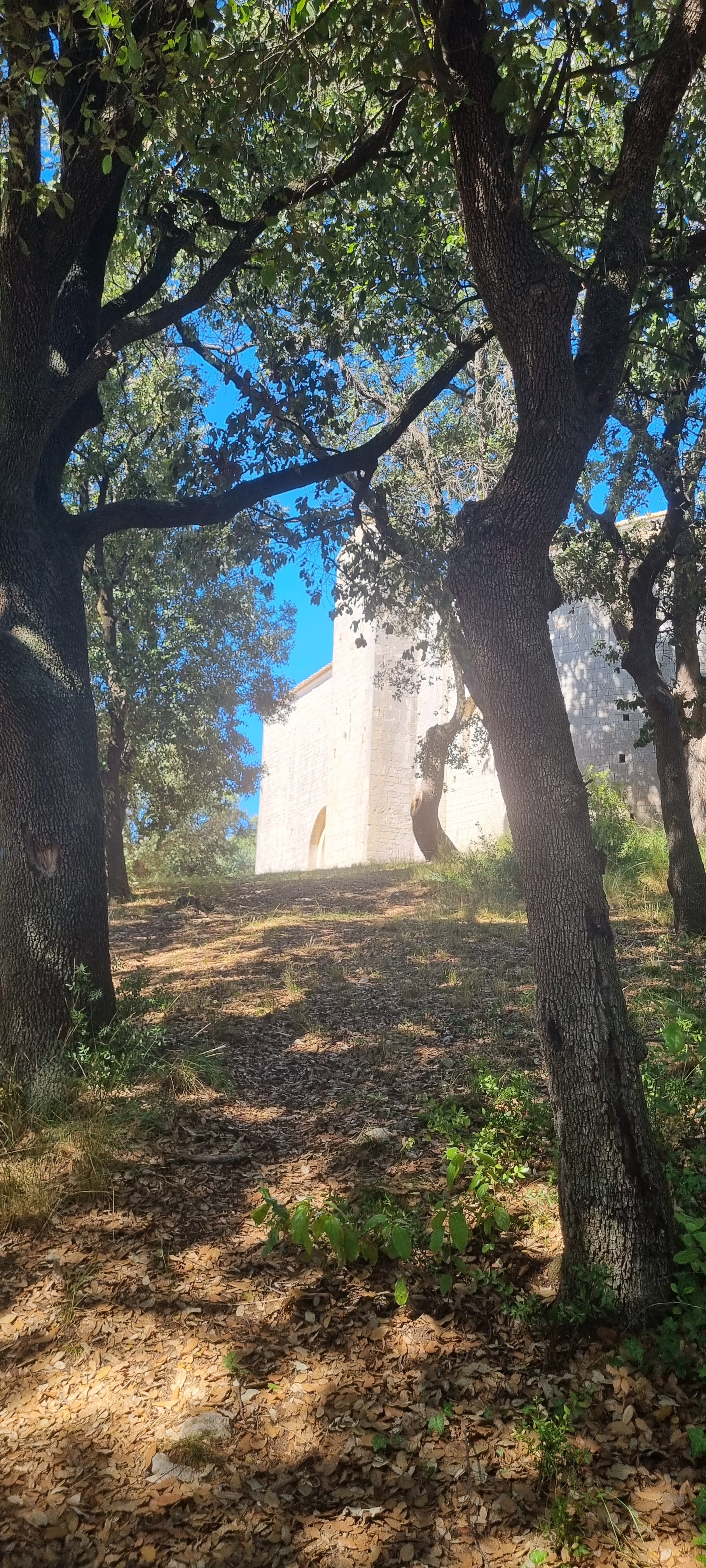 Église imposante érigée au milieu d'une belle forêt de chênes, aux abords de vignes et de champs d'oliviers.