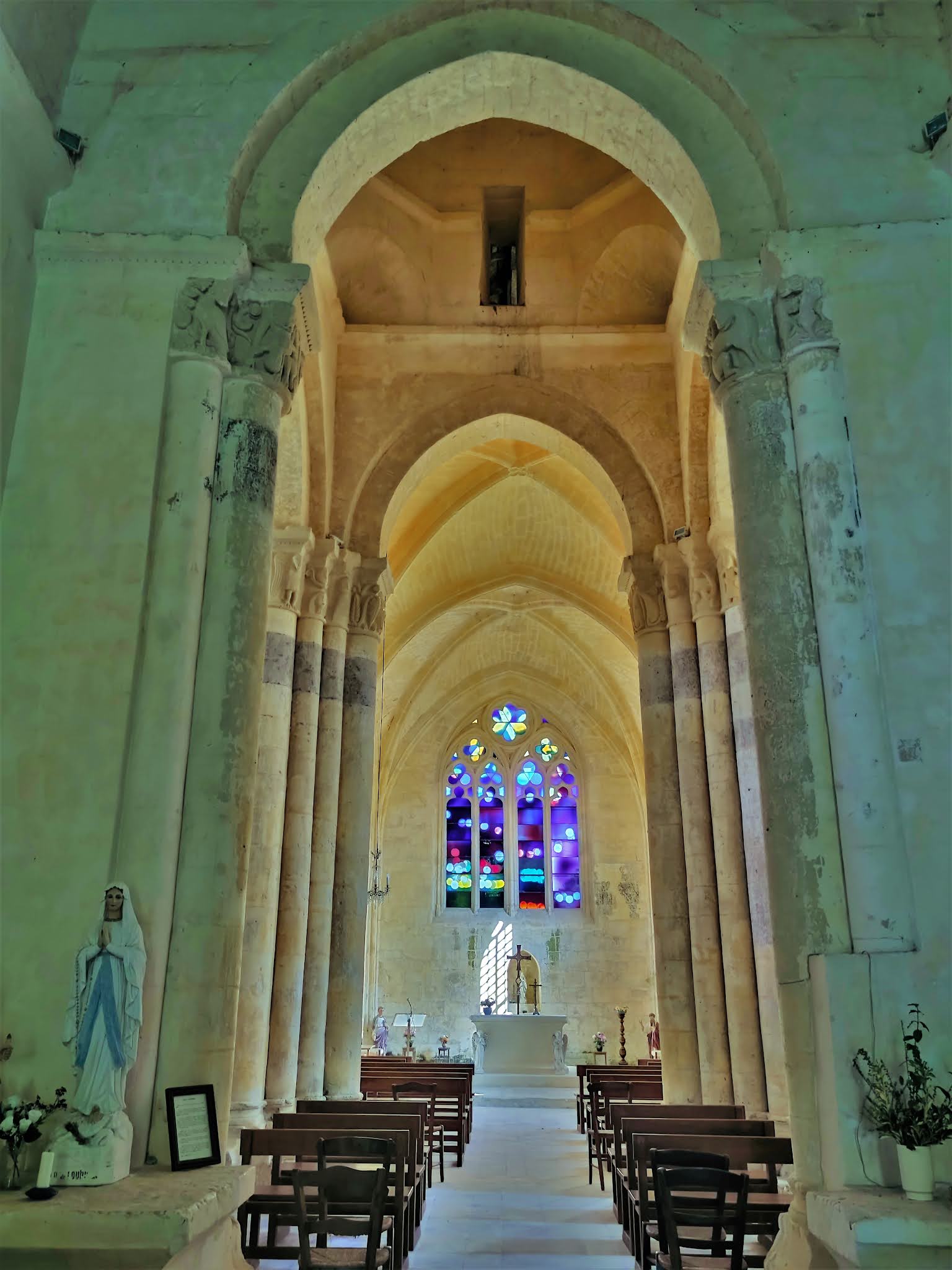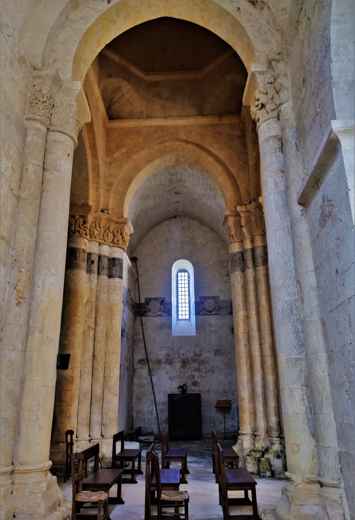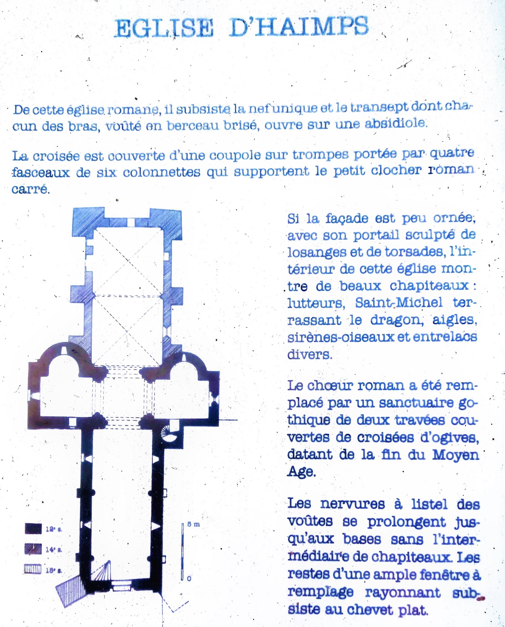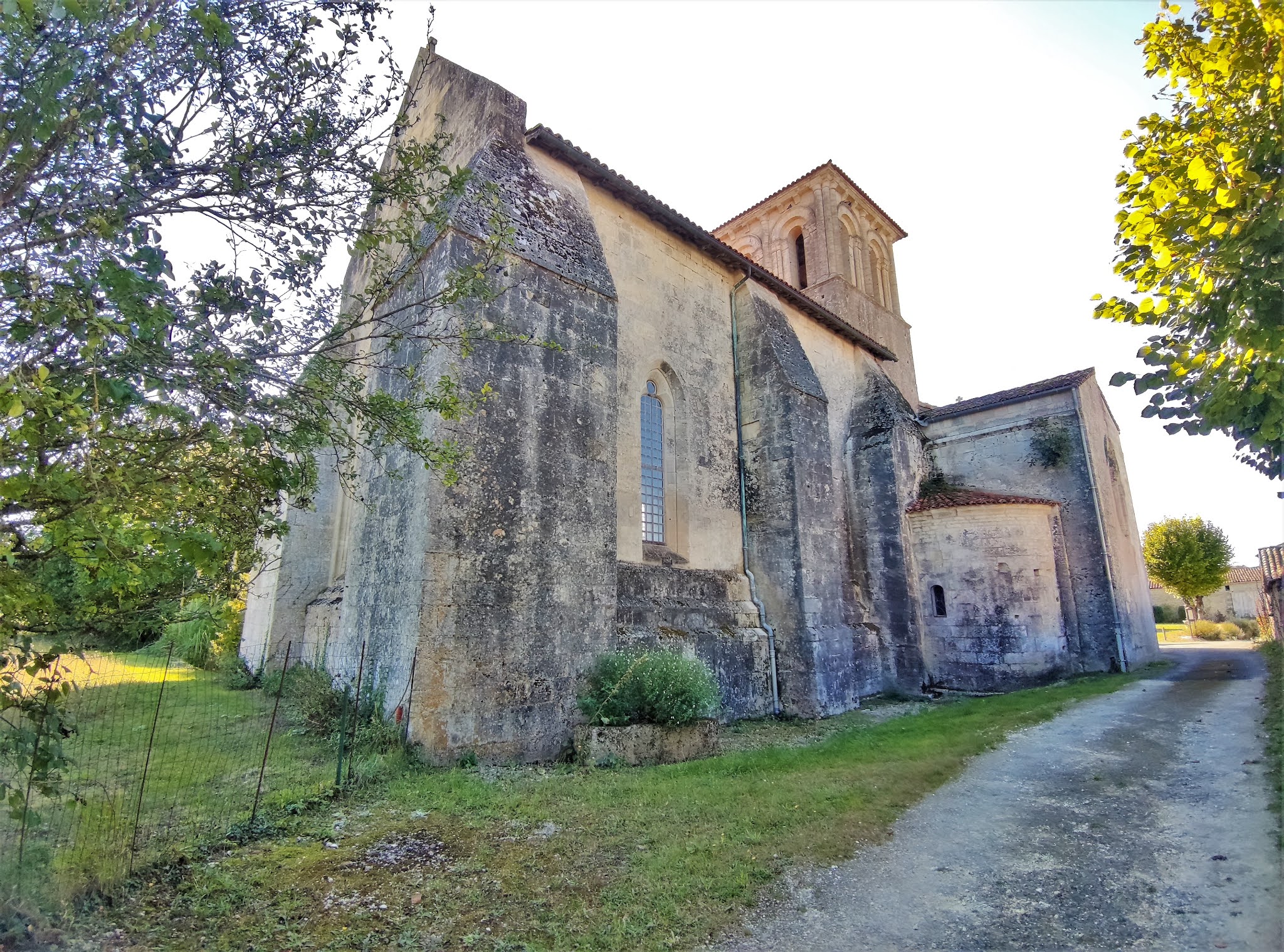 Ouverte et accueillante, son clocher, son élévation à la croisée, ses décors sculptés méritent que l'on fasse un détour. Cette église bénéficie depuis 35 ans d'un plan de restaurations, son bel état témoigne de l'attachement de la collectivité à cet édifice. Son histoire est superbement racontée sur le site de la mairie. Elle changea souvent de dépendance de 1101 jusqu'à 1161 lors de sa donation à l'abbaye de Saint-Jean d'Angély. Elle devint alors église de la communauté religieuse bénédictine de Haimps. Cette église romane souffrit des conflits féodaux de la guerre de cent ans et des guerres de religions. Des transformations ou reconstructions eurent lieu, conséquences des différentes dégradations ou destructions opérées par les Anglais et les protestants. Au 15ème siècle, un chœur gothique à deux travées voûtées d'ogives, aussi long que la nef, a été construit. Son chevet plat est ouvert d'une grand baie gothique, équipée d'un vitrail contemporain posé en 2011, œuvre de Pascale Remita des Atelier FLEURY. La nef romane a conservé de sa voûte primitive les colonnes engagées aux chapiteaux sculptés qui la supportaient. Aujourd'hui recouverte d'une charpente apparente, ses baies romanes en plein cintre ont été préservées. Elle s'ouvre sur la magnifique croisée du transept. L'élévation vers la coupole à trompes qui porte le beau clocher roman m'a subjugué par son élégance, et la qualité des décors sculptés qui ornent les chapiteaux. Les croisillons voûtés en berceau possèdent chacun une absidiole. Des peintures du 15ème, dégagées de l'enduit posé à la révolution, sont visibles.