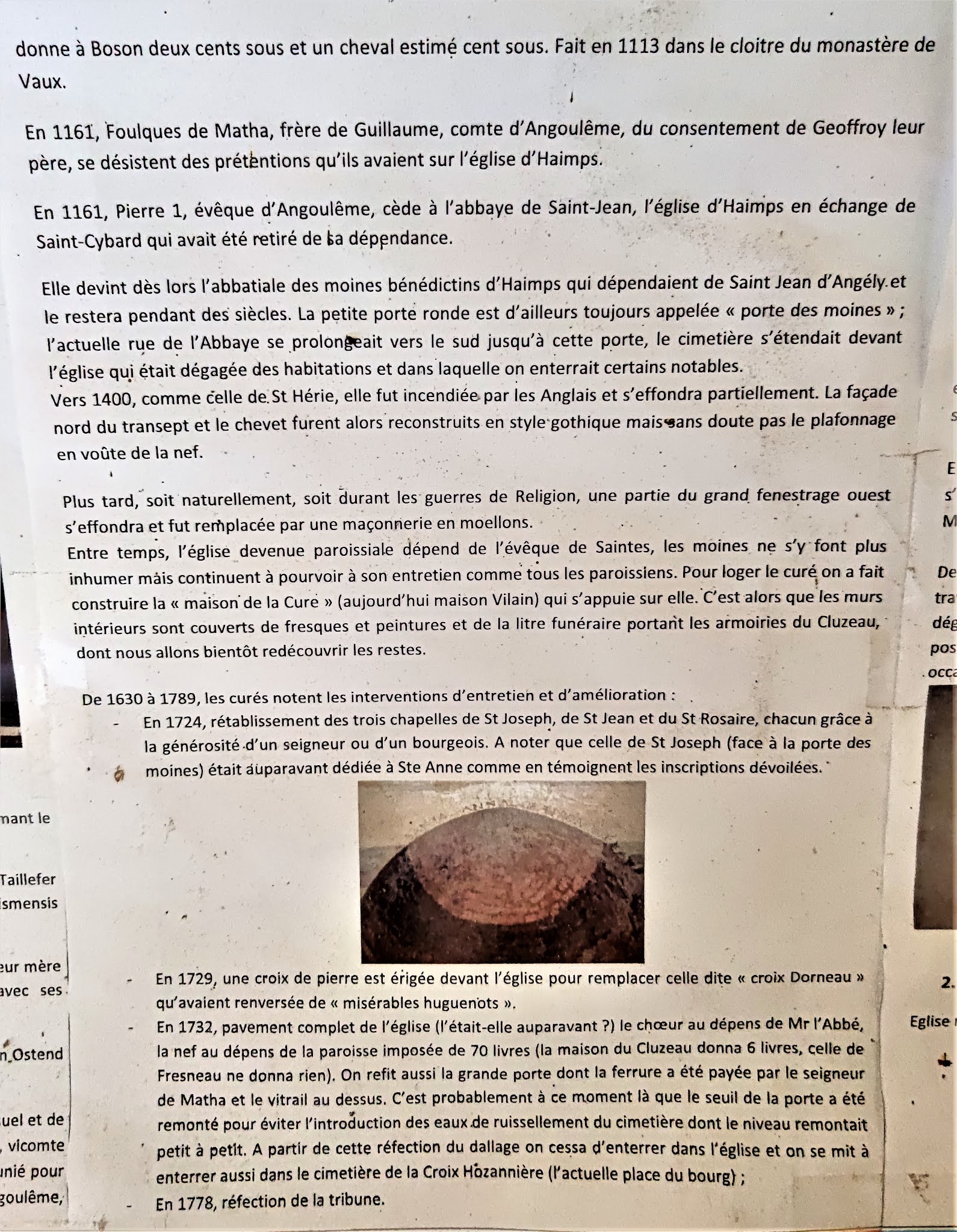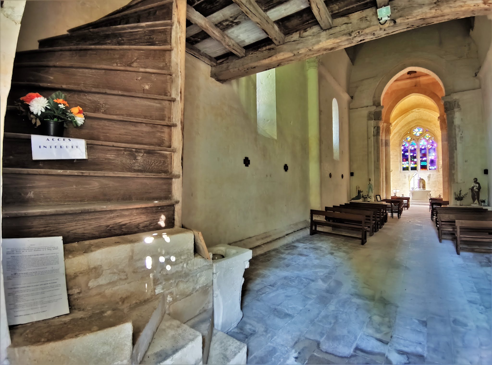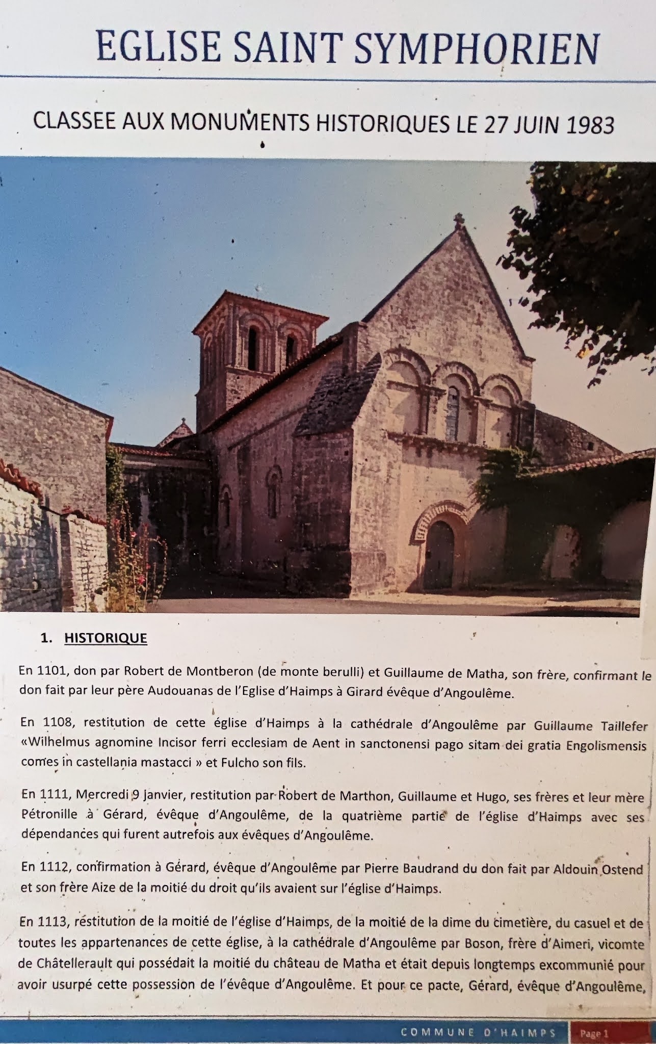 Ouverte et accueillante, son clocher, son élévation à la croisée, ses décors sculptés méritent que l'on fasse un détour. Cette église bénéficie depuis 35 ans d'un plan de restaurations, son bel état témoigne de l'attachement de la collectivité à cet édifice. Son histoire est superbement racontée sur le site de la mairie. Elle changea souvent de dépendance de 1101 jusqu'à 1161 lors de sa donation à l'abbaye de Saint-Jean d'Angély. Elle devint alors église de la communauté religieuse bénédictine de Haimps. Cette église romane souffrit des conflits féodaux de la guerre de cent ans et des guerres de religions. Des transformations ou reconstructions eurent lieu, conséquences des différentes dégradations ou destructions opérées par les Anglais et les protestants. Au 15ème siècle, un chœur gothique à deux travées voûtées d'ogives, aussi long que la nef, a été construit. Son chevet plat est ouvert d'une grand baie gothique, équipée d'un vitrail contemporain posé en 2011, œuvre de Pascale Remita des Atelier FLEURY. La nef romane a conservé de sa voûte primitive les colonnes engagées aux chapiteaux sculptés qui la supportaient. Aujourd'hui recouverte d'une charpente apparente, ses baies romanes en plein cintre ont été préservées. Elle s'ouvre sur la magnifique croisée du transept. L'élévation vers la coupole à trompes qui porte le beau clocher roman m'a subjugué par son élégance, et la qualité des décors sculptés qui ornent les chapiteaux. Les croisillons voûtés en berceau possèdent chacun une absidiole. Des peintures du 15ème, dégagées de l'enduit posé à la révolution, sont visibles.
