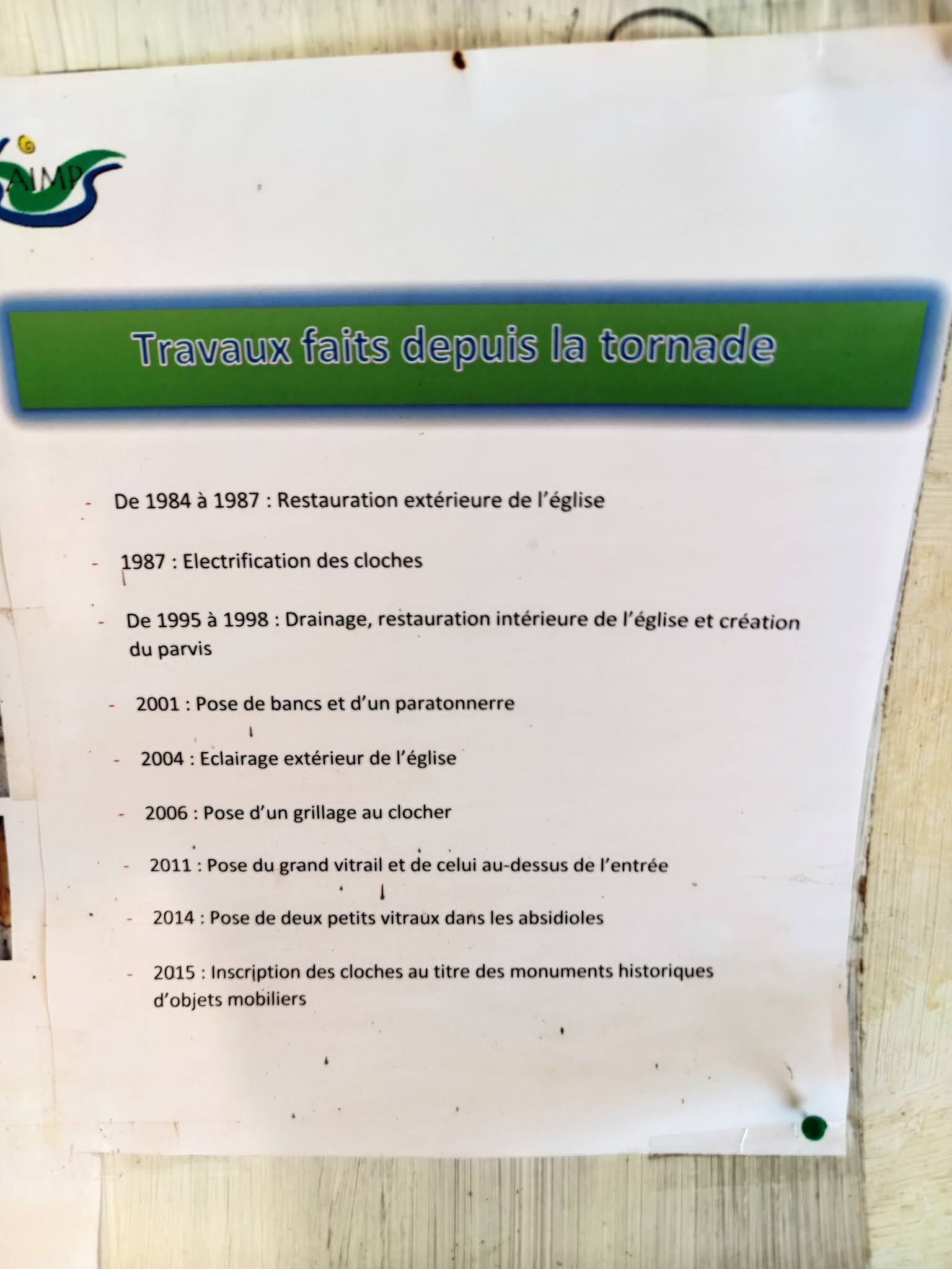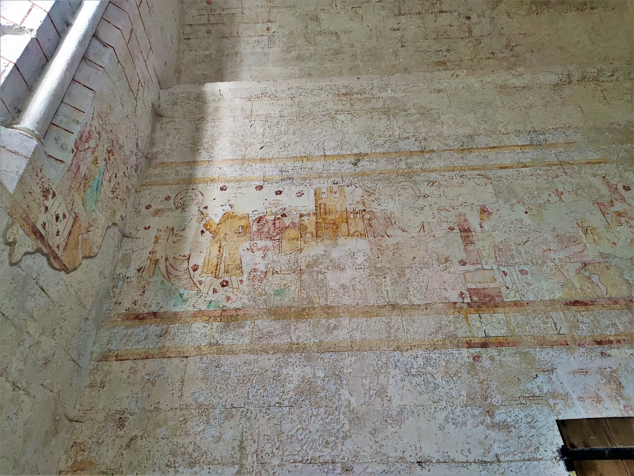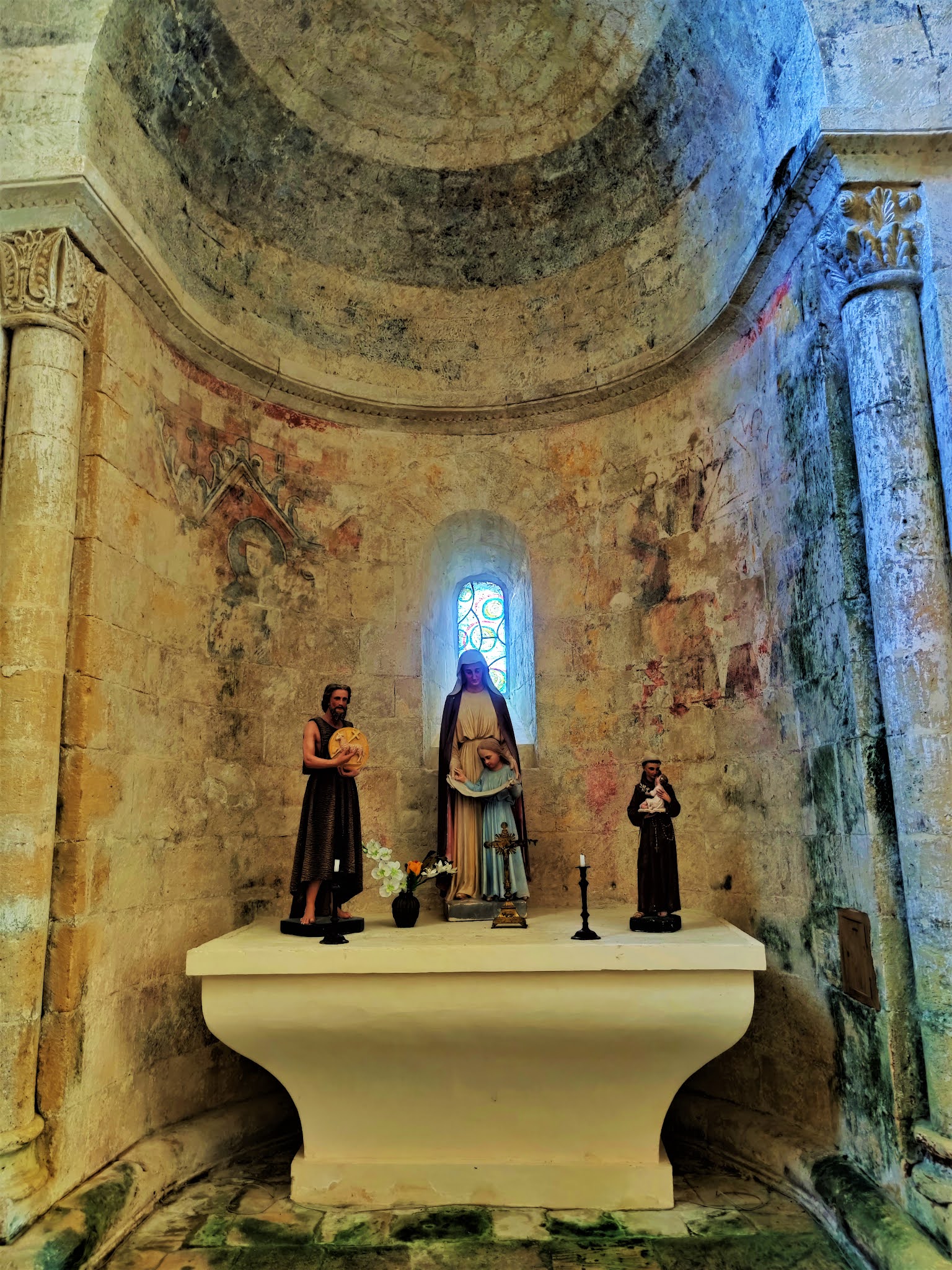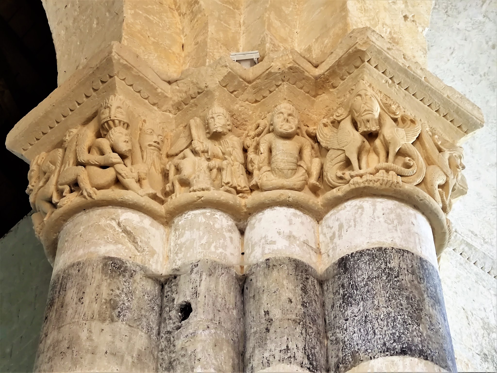 Ouverte et accueillante, son clocher, son élévation à la croisée, ses décors sculptés méritent que l'on fasse un détour. Cette église bénéficie depuis 35 ans d'un plan de restaurations, son bel état témoigne de l'attachement de la collectivité à cet édifice. Son histoire est superbement racontée sur le site de la mairie. Elle changea souvent de dépendance de 1101 jusqu'à 1161 lors de sa donation à l'abbaye de Saint-Jean d'Angély. Elle devint alors église de la communauté religieuse bénédictine de Haimps. Cette église romane souffrit des conflits féodaux de la guerre de cent ans et des guerres de religions. Des transformations ou reconstructions eurent lieu, conséquences des différentes dégradations ou destructions opérées par les Anglais et les protestants. Au 15ème siècle, un chœur gothique à deux travées voûtées d'ogives, aussi long que la nef, a été construit. Son chevet plat est ouvert d'une grand baie gothique, équipée d'un vitrail contemporain posé en 2011, œuvre de Pascale Remita des Atelier FLEURY. La nef romane a conservé de sa voûte primitive les colonnes engagées aux chapiteaux sculptés qui la supportaient. Aujourd'hui recouverte d'une charpente apparente, ses baies romanes en plein cintre ont été préservées. Elle s'ouvre sur la magnifique croisée du transept. L'élévation vers la coupole à trompes qui porte le beau clocher roman m'a subjugué par son élégance, et la qualité des décors sculptés qui ornent les chapiteaux. Les croisillons voûtés en berceau possèdent chacun une absidiole. Des peintures du 15ème, dégagées de l'enduit posé à la révolution, sont visibles.