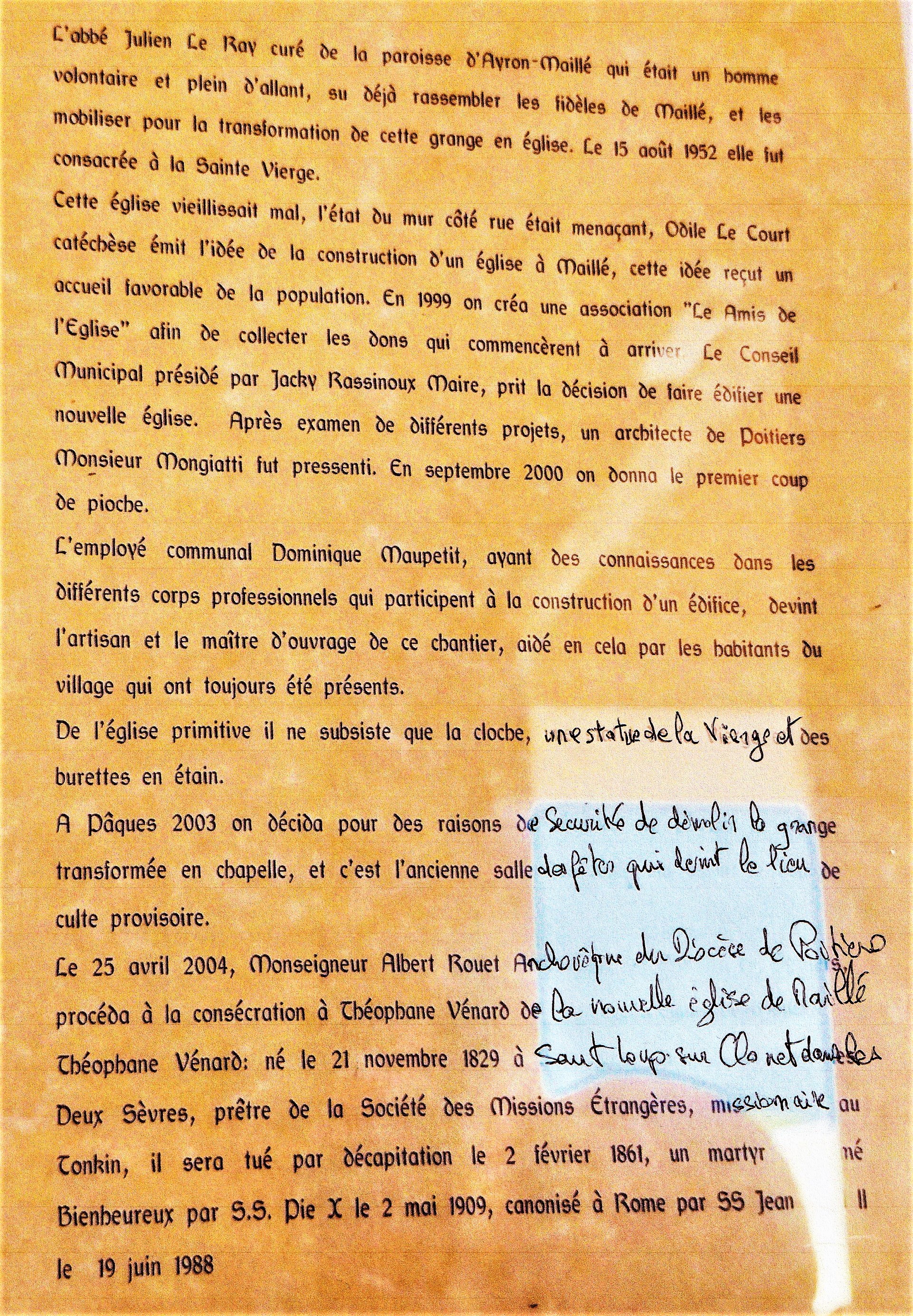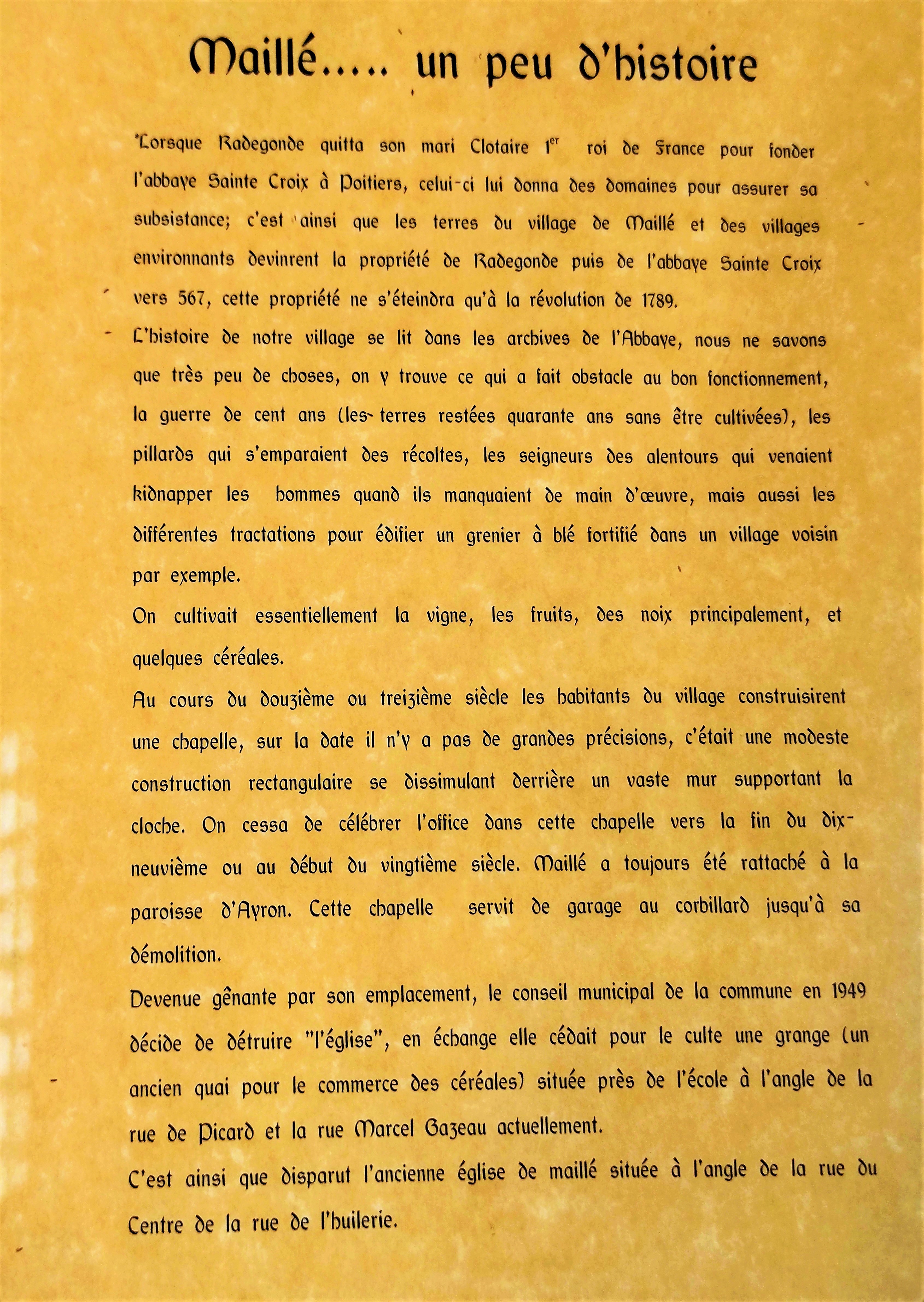 Une église consacrée en 2007 qui a succédé à 2 chapelles aménagées dans des granges, qui avaient elles-mêmes remplacé une chapelle du 12ème démolie en 1949. Cette église du 20ème est moderne comme le centre du village, la mairie, l'école, la salle communale. L'ensemble est harmonieux, ce cœur de village est charmant. Les habitants ont beaucoup participé depuis longtemps à la construction de cette cité. Cette coopération a créé une véritable communauté villageoise. L'église qui est traditionnellement depuis plus de mille ans le point de repère dans un village ne fait pas exception à Maillé. Lumineuse et colorée, ce fut un plaisir de la découvrir.
