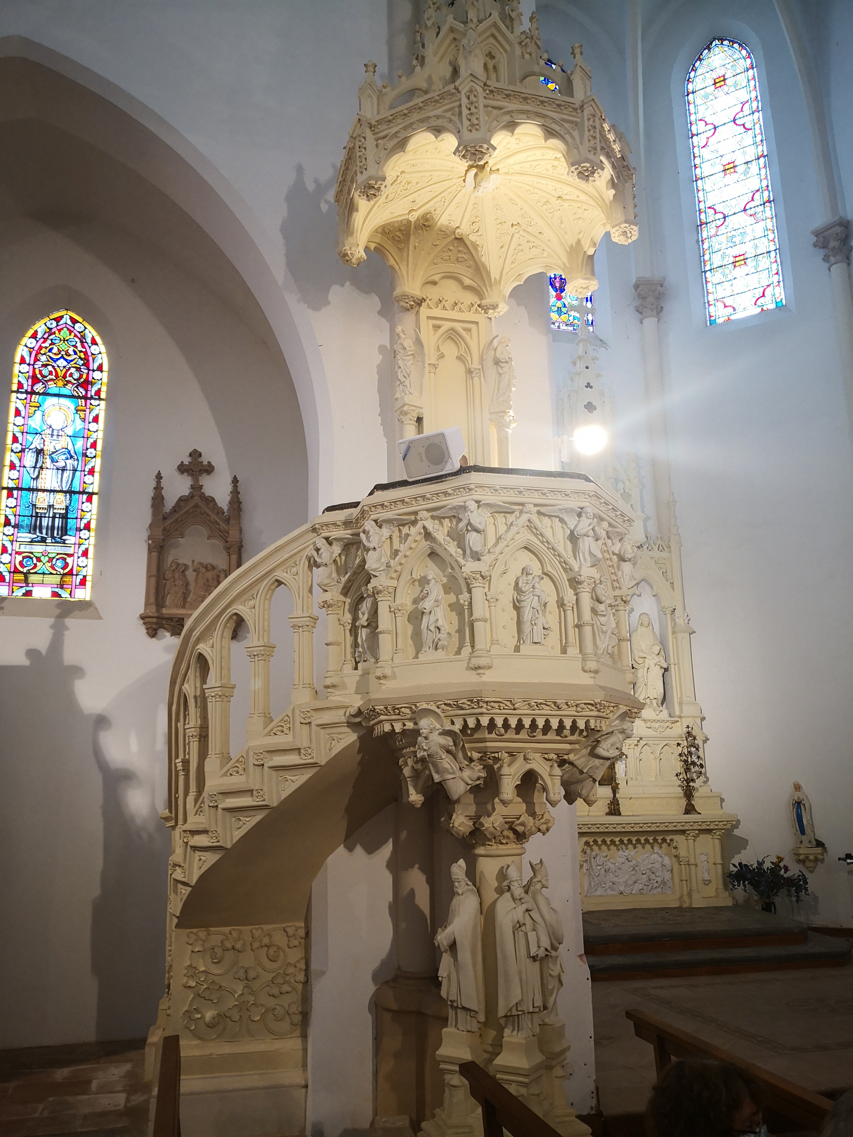 Petit joyau, extrêmement bien restauré. L'histoire des vitraux mériterait d'être étudiée. Ils sont pour la plupart, des dons de familles entre 1935 et 1955..la chaire en pierre et plâtre est à l'unisson des autres paroies blanches. L'autel baroque en impose. Ce soir là un concert très éclectique y était donné.. Un moment très privilégié..