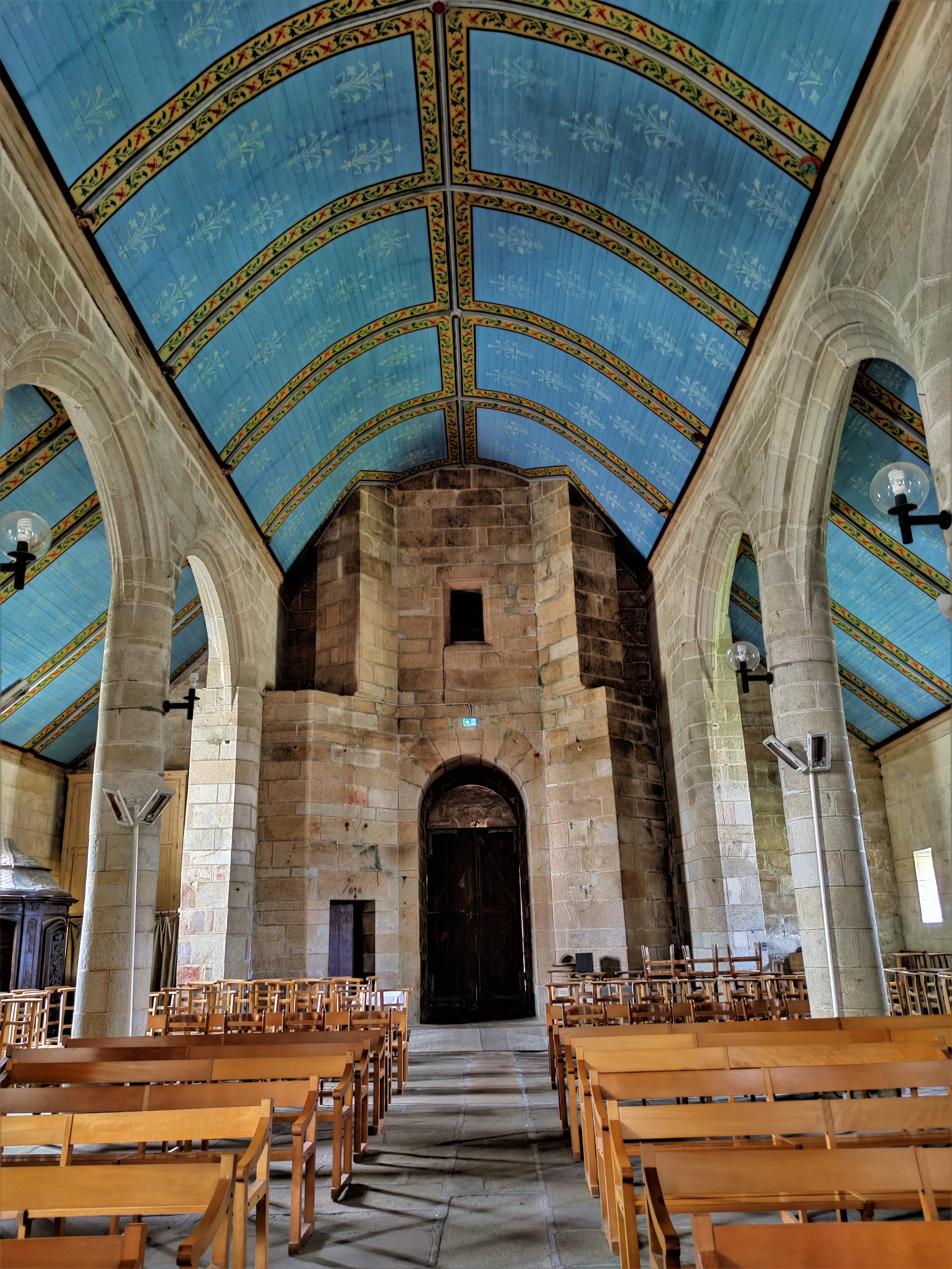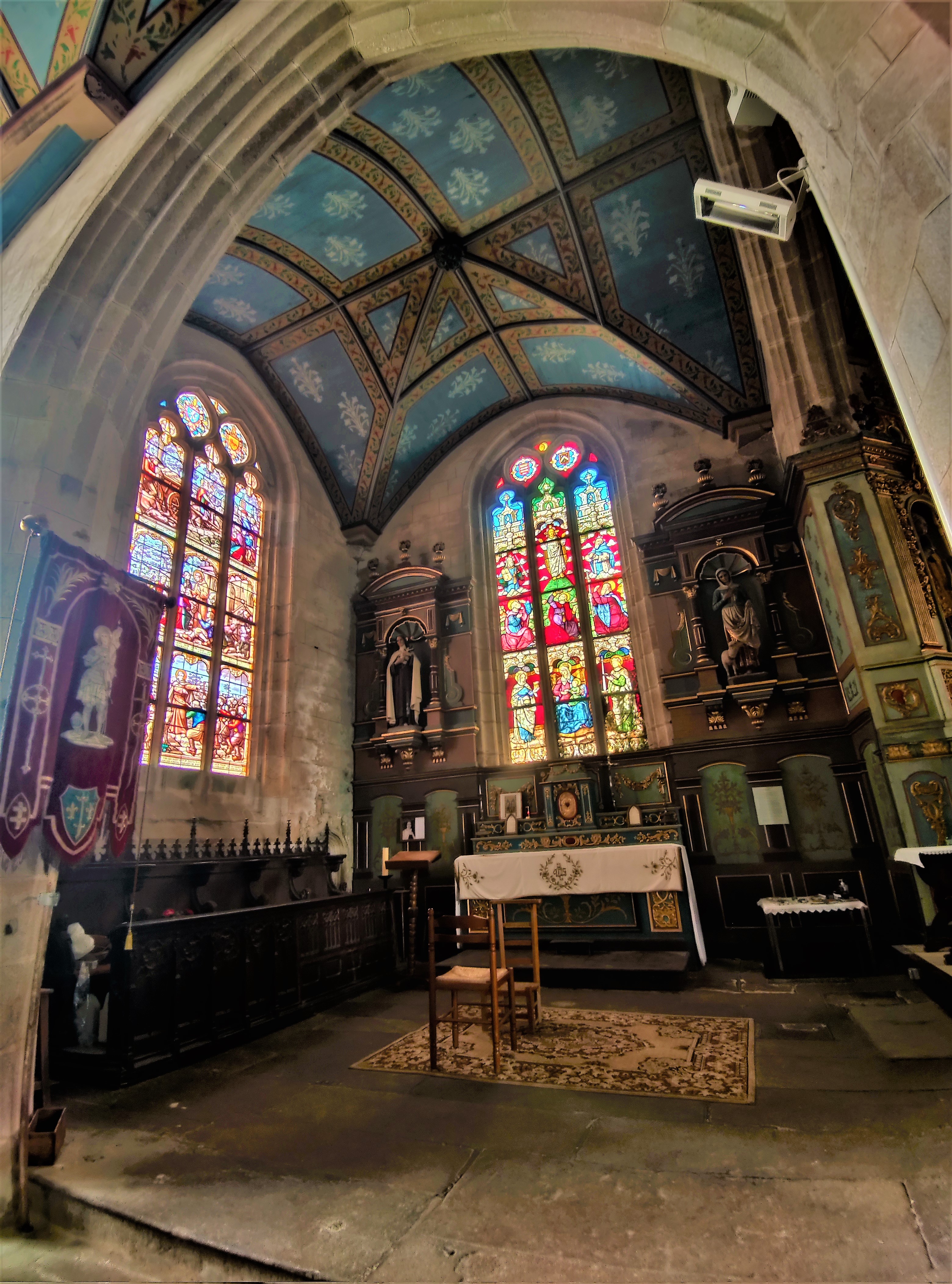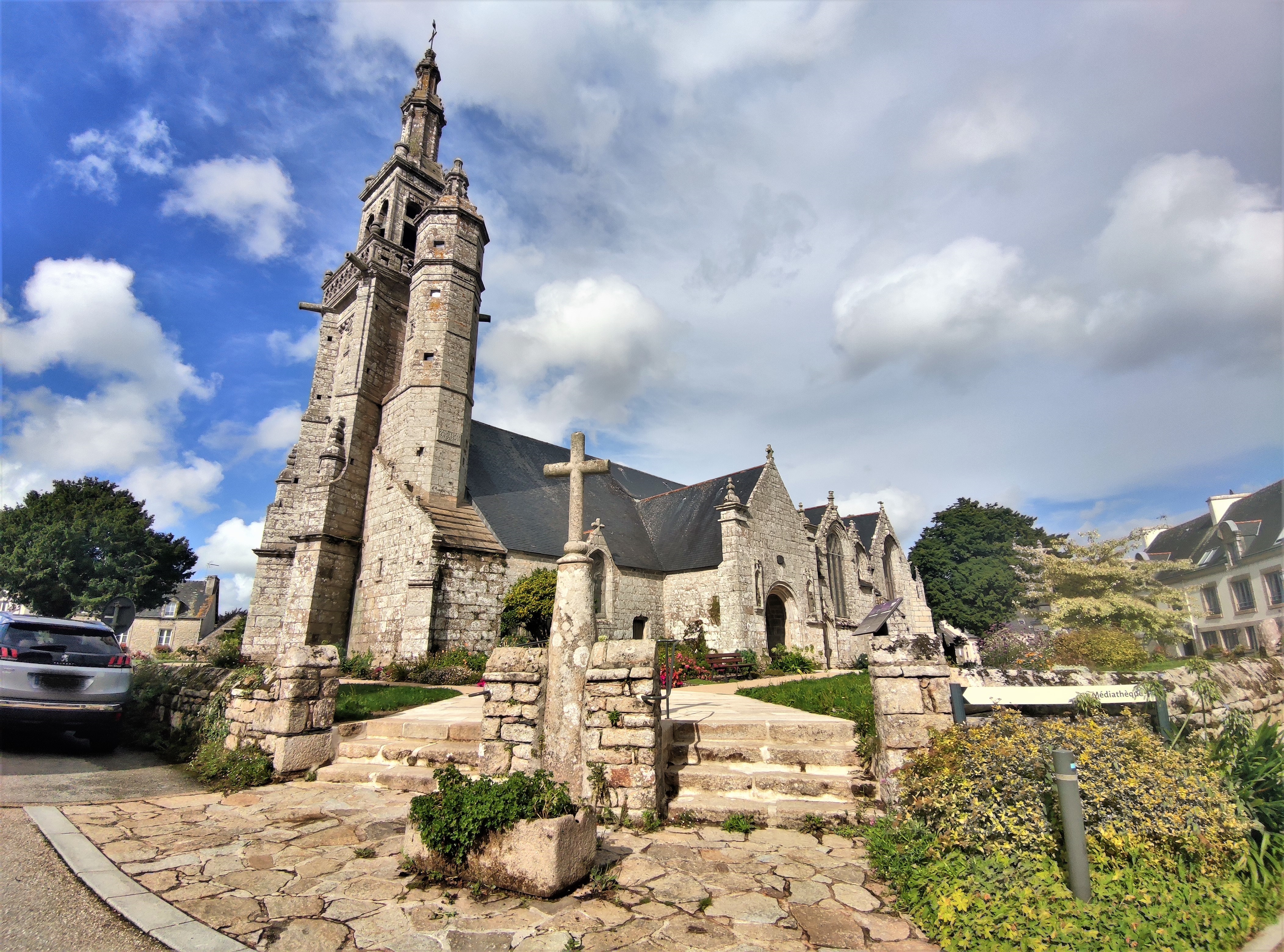 Une église magnifique dans un enclos breton typique, patrimoine fort bien préservé. L'enclos paroissial est aujourd'hui triangulaire, à chaque angle se dresse un bâti, un monument au morts, un arc de triomphe et un escalier double encadrant une croix. Seuls, le porche et le portail Sud désignent les origines romanes de cette église. Construite au 15ème, 16ème et 17ème, les pignons marquant chaque travée lui donnent une allure élégante et particulière. La nef possède deux collatéraux qui s'élargissent dans les travées Est. Elle se prolonge d'un transept et d'un chœur à chevet plat. L'éclairage est superbe. Tableaux, statuaire, mobiliers, vitraux sont autant de choses remarquables à découvrir. La beauté, expression de la Foi, est bien présente dans les objets comme dans l'architecture.