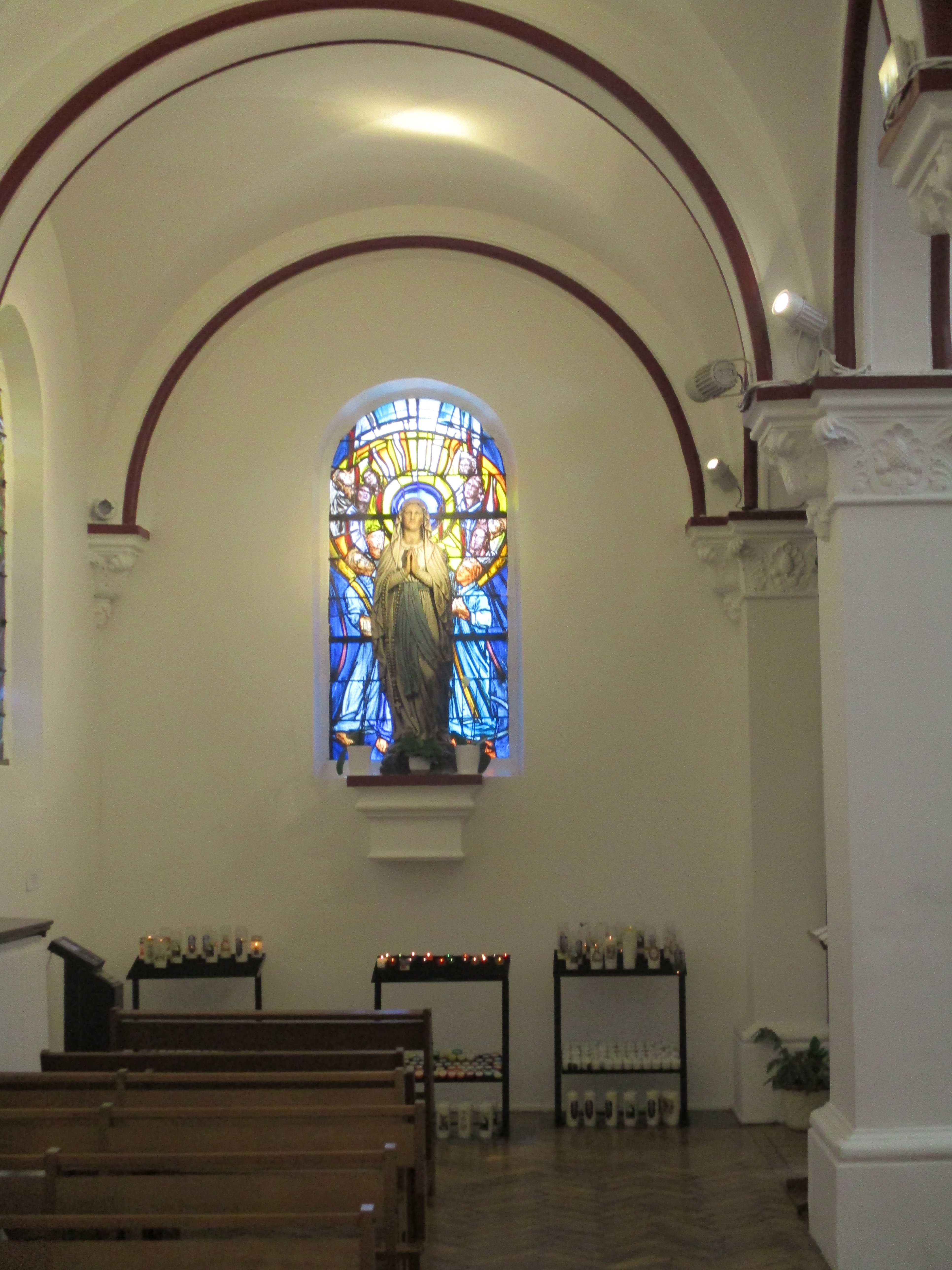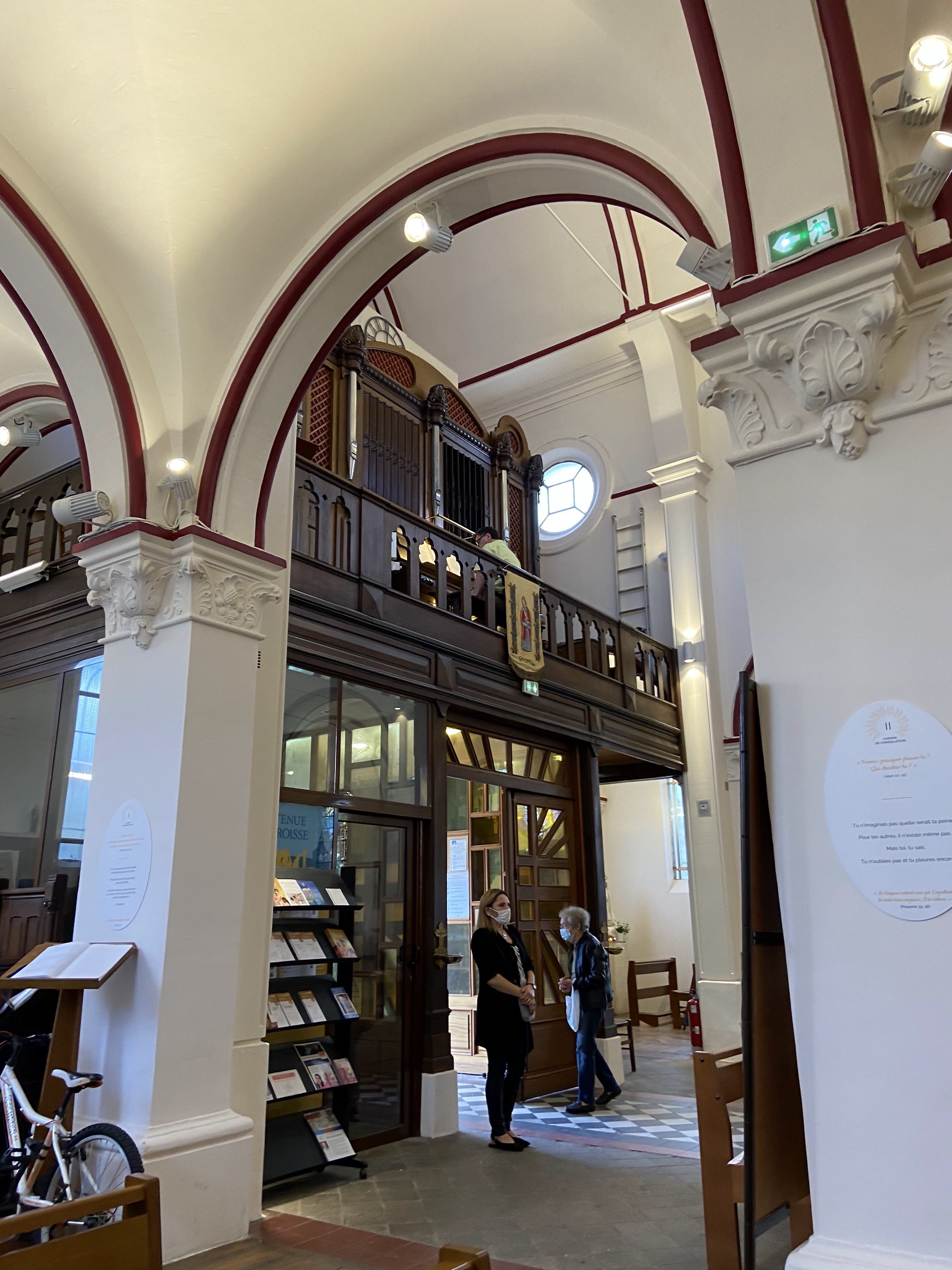 Belle église très bien entretenue aussi bien à l'extérieur qu'à l'intérieur. C'est la première fois que je voyais un intérieur peint en blanc avec un liseré rouge. C'est une des caractéristiques qui en fait son charme. Les vitraux sont colorés et en bon état : je les ai admirés. La sortie sur le parvis est sympa avec une grande hall couverte et les jeux de jets d'eau.