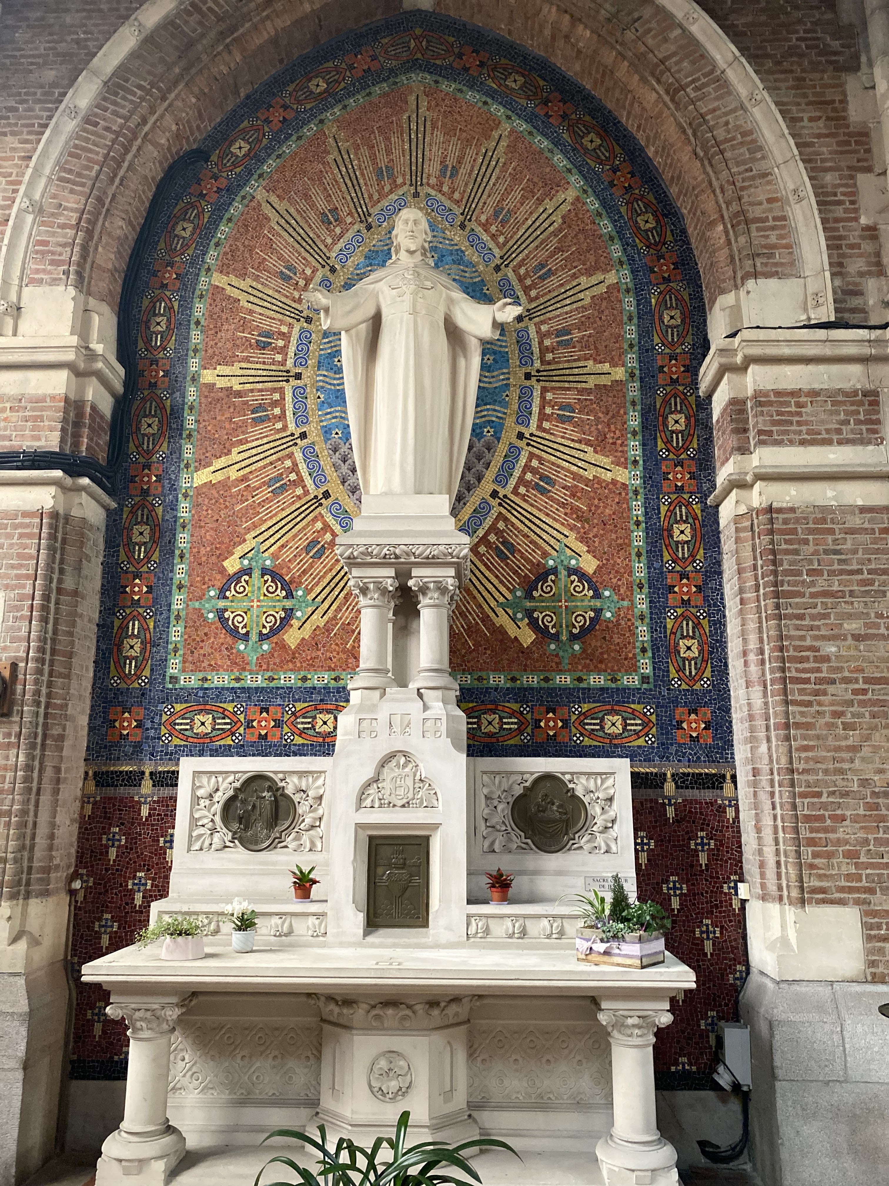 Cette église possède de très beaux vitraux et spéciaux. Nous en avons ajouté des photos. L'église est très bien entretenue. Les travaux sont en cours en septembre 2019. L'entrée principale n'est pas accessible aux utilisateurs de fauteuils roulants. Il y a une entrée latérale sur la droite. Vous y trouverez également des sculptures intéressantes. Les murs en briques ne sont pas enduits. La civelle au-dessus des fonts baptismaux a pour sujet le baptême de Jésus. Une statue de Sint-Elooi est placée sous une civelle ayant le même sujet.