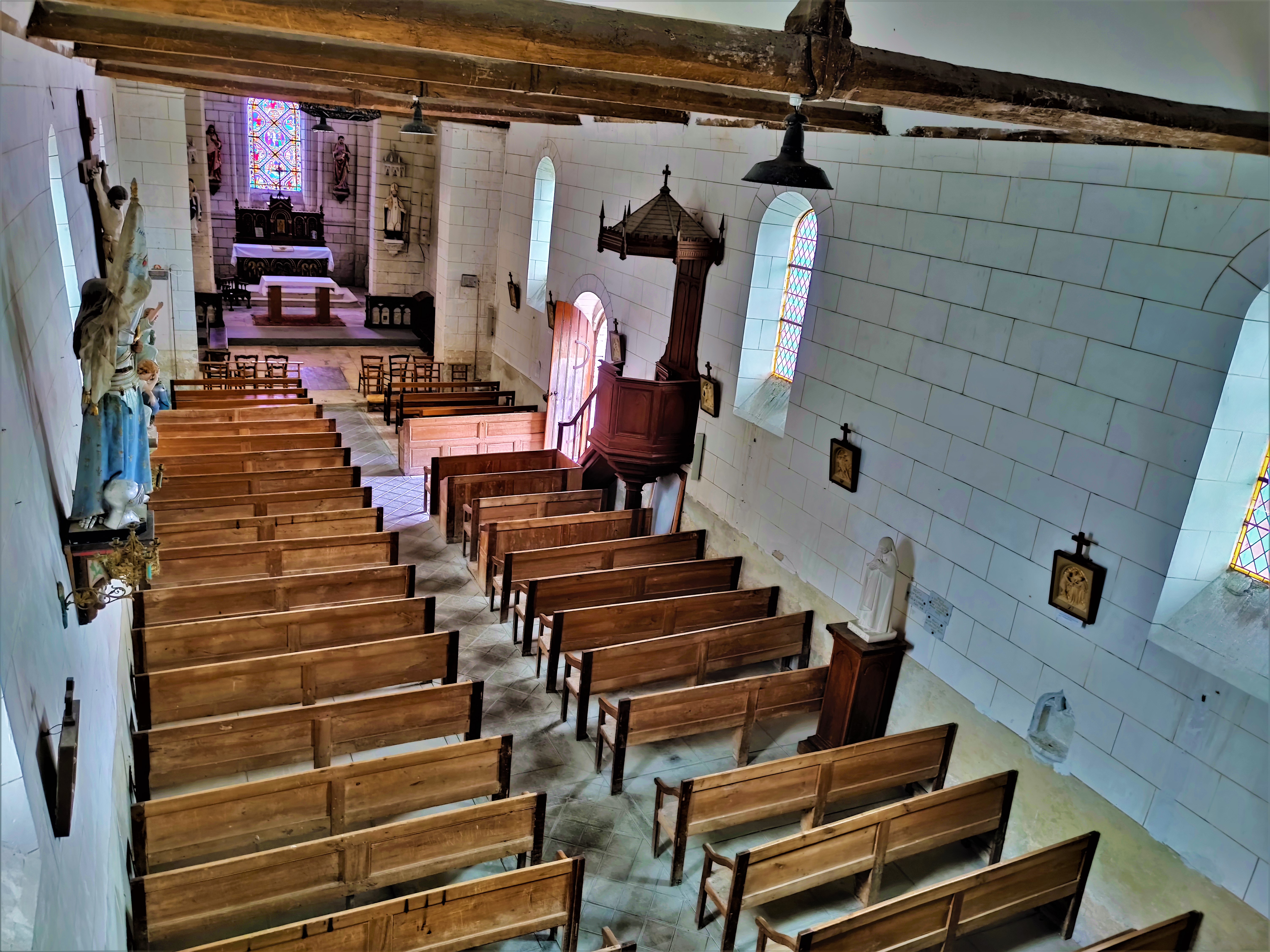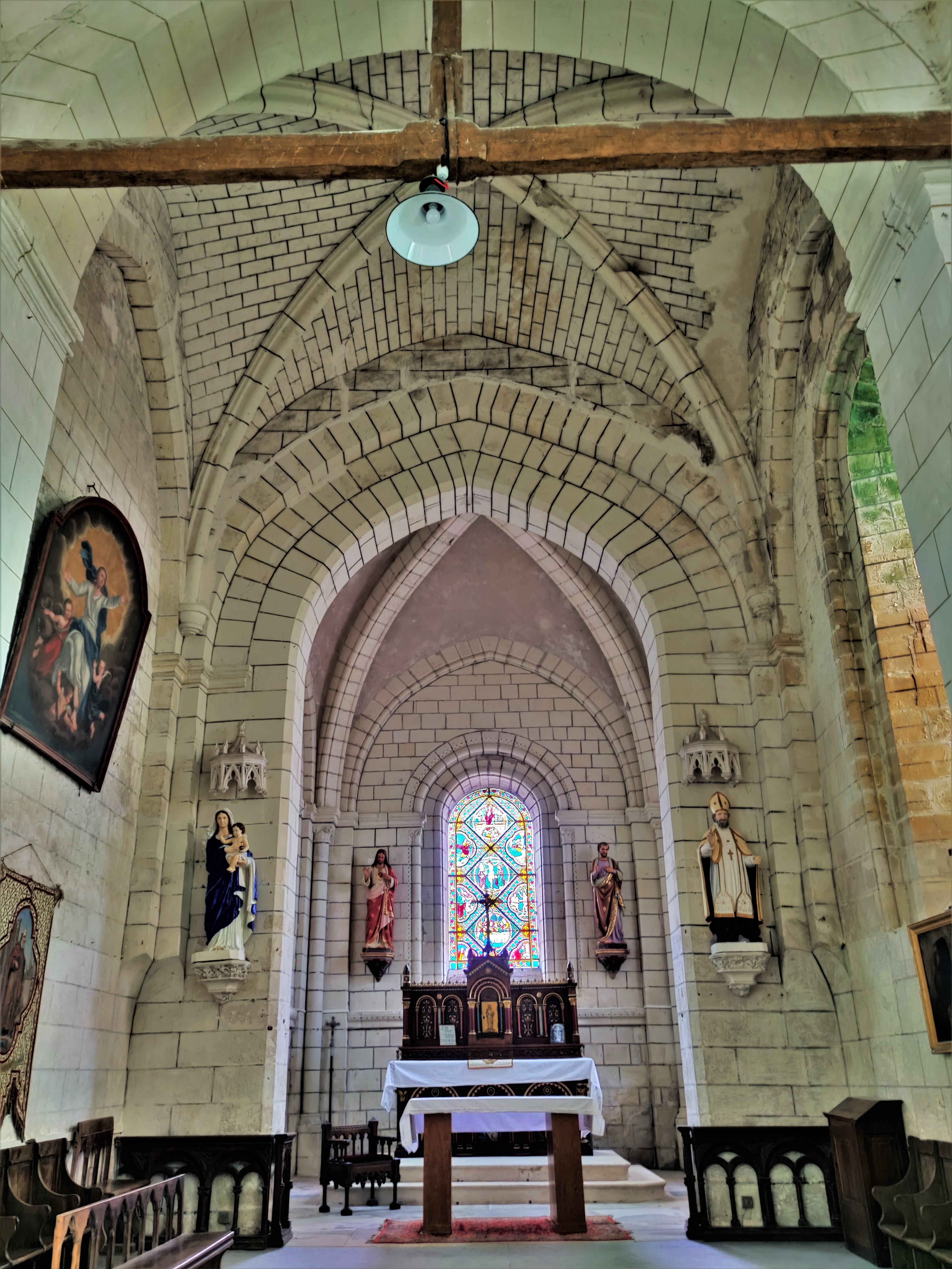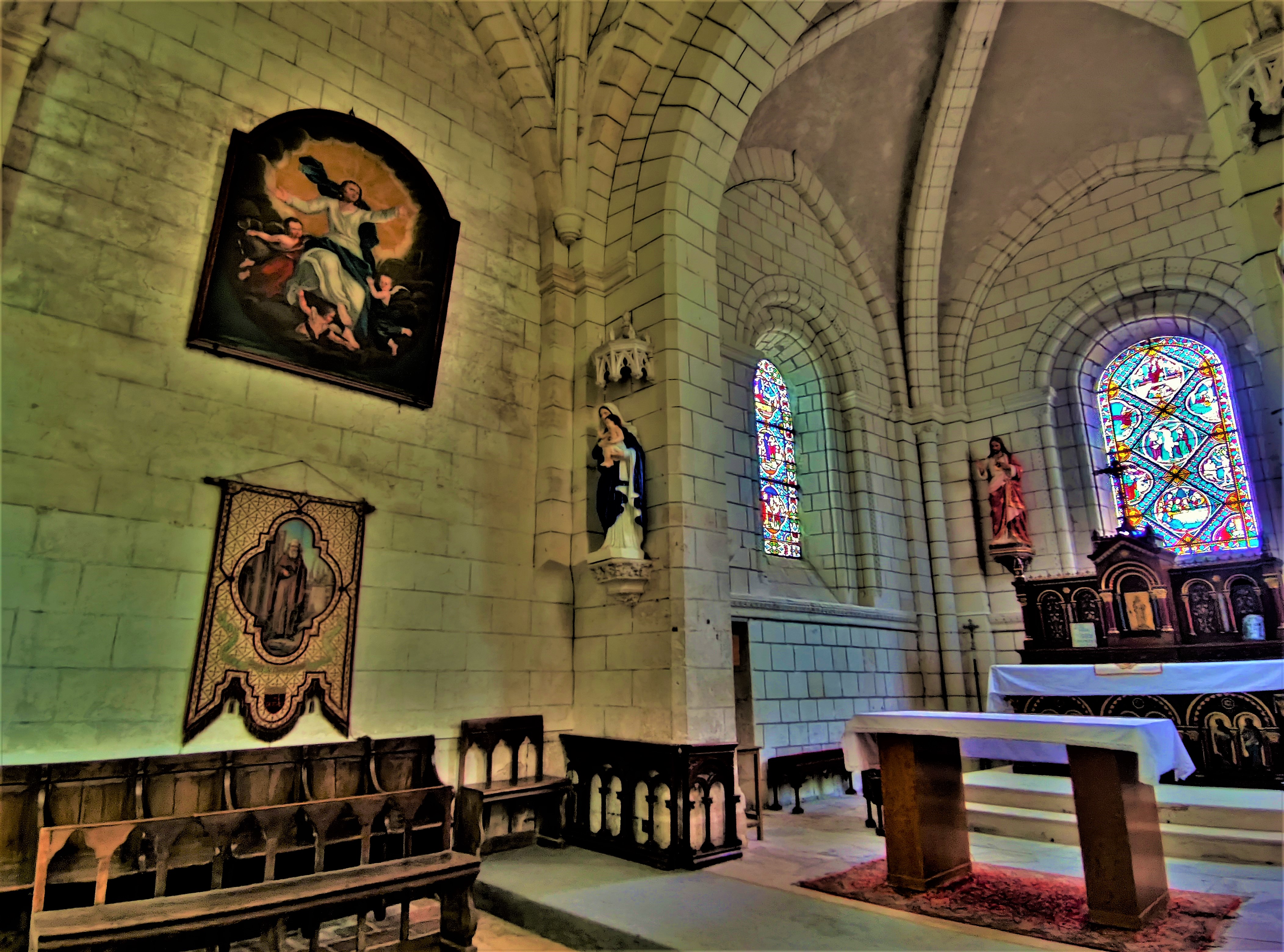 Un lieu de culte chrétien existe dans cette cité depuis 1600 ans, l'église Saint-Venant est la seconde église. Dès le 5ème siècle une église existait à Dolus-le-Sec, construite par Saint-Eustoche (Naissance inconnue-461), 5ème évêque de Tours. Au 11ème, on construisit une nouvelle église, le titulaire était Saint-Pierre. On agrandit cet édifice au 12ème, le clocher fut élevé, le chevet devint plat ; on désigna alors un nouveau titulaire, Saint Venant, grand thaumaturge et moine supérieur de l'abbaye Saint Martin de Tours au 5ème siècle. L'église à simple nef prolongée de la travée sous clocher et du chœur possède des vitraux non historiés dans la nef et historiés dans le chœur. Ces derniers sont de belles réalisations d'ateliers prestigieux. Le maître-autel est coloré et assez spectaculaire, la travée sous clocher et le chœur sont voûtés en croisées d'ogives. La nef primitive était à charpente apparente, au 19ème on la plafonna d'une fausse voûte en berceau brisé. Il faut prendre contact avec la mairie pour emprunter les clés de cette église, héritière de 1600 ans de culte chrétien. Témoin du savoir faire des anciens bâtisseurs, mon respect pour eux ne faiblit pas, cette visite m'a bien plu.
