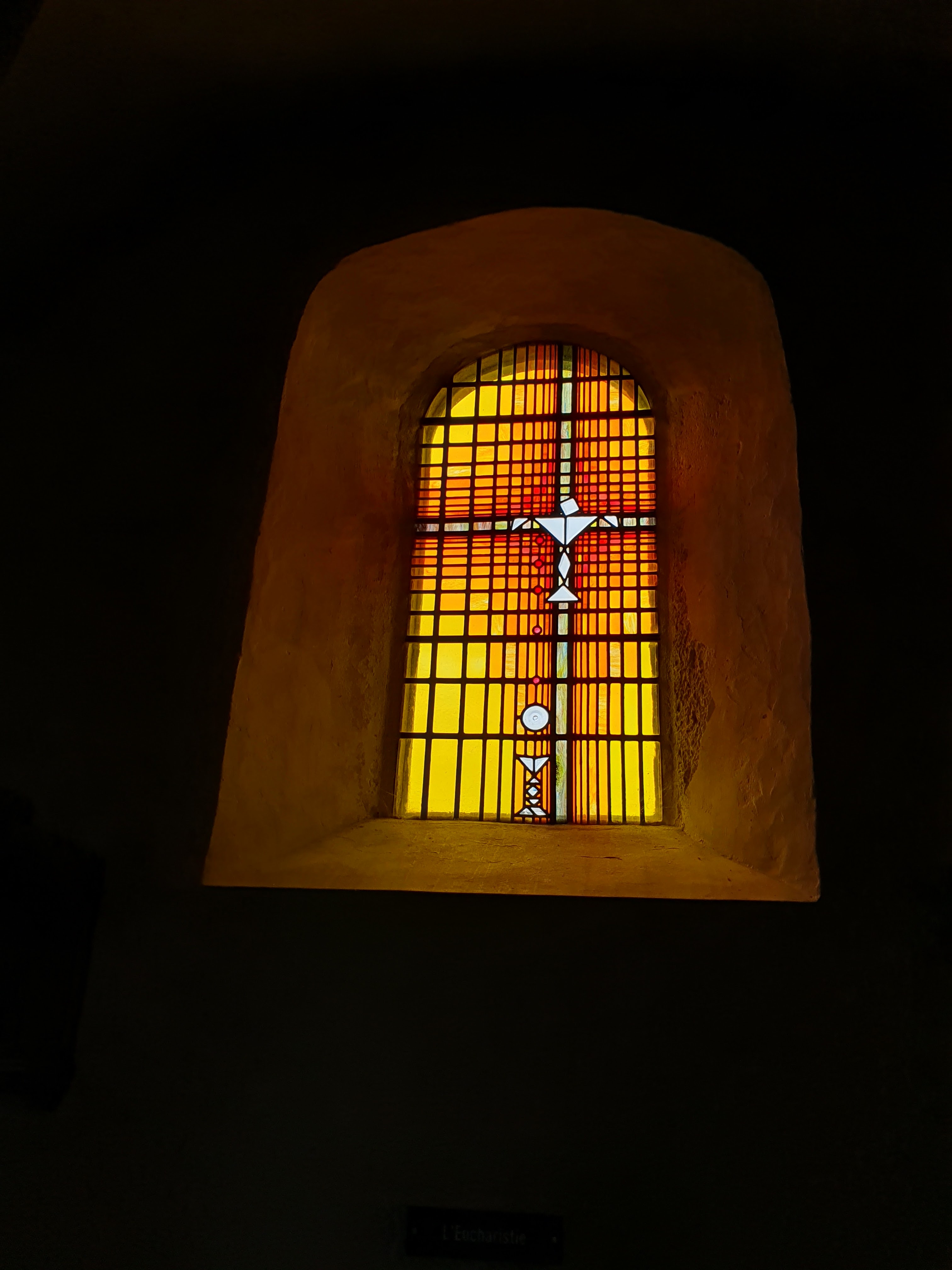 Jolie petite eglise dans un lieu magnifique pourvue de vitraux contemporains magnifiques !