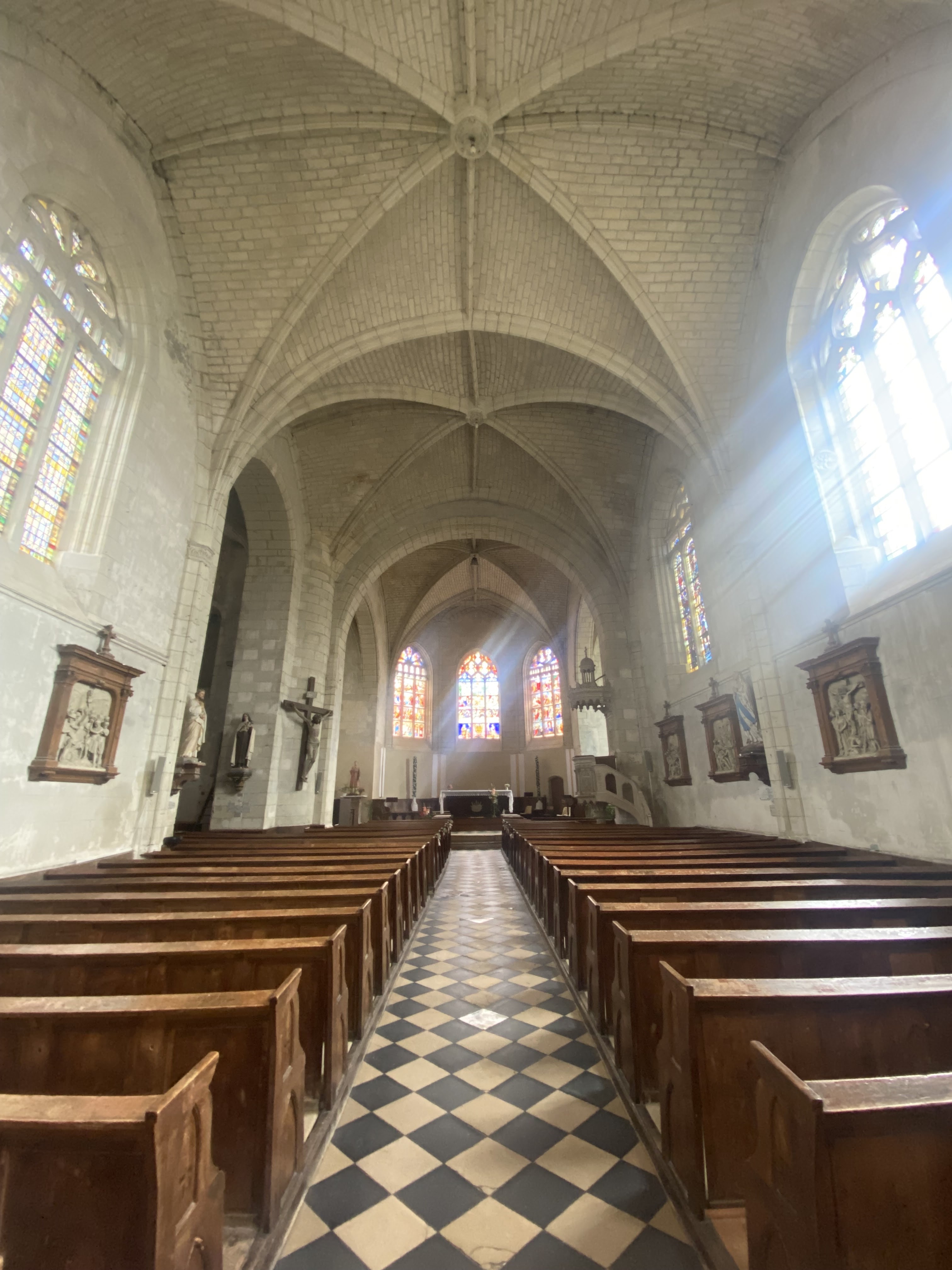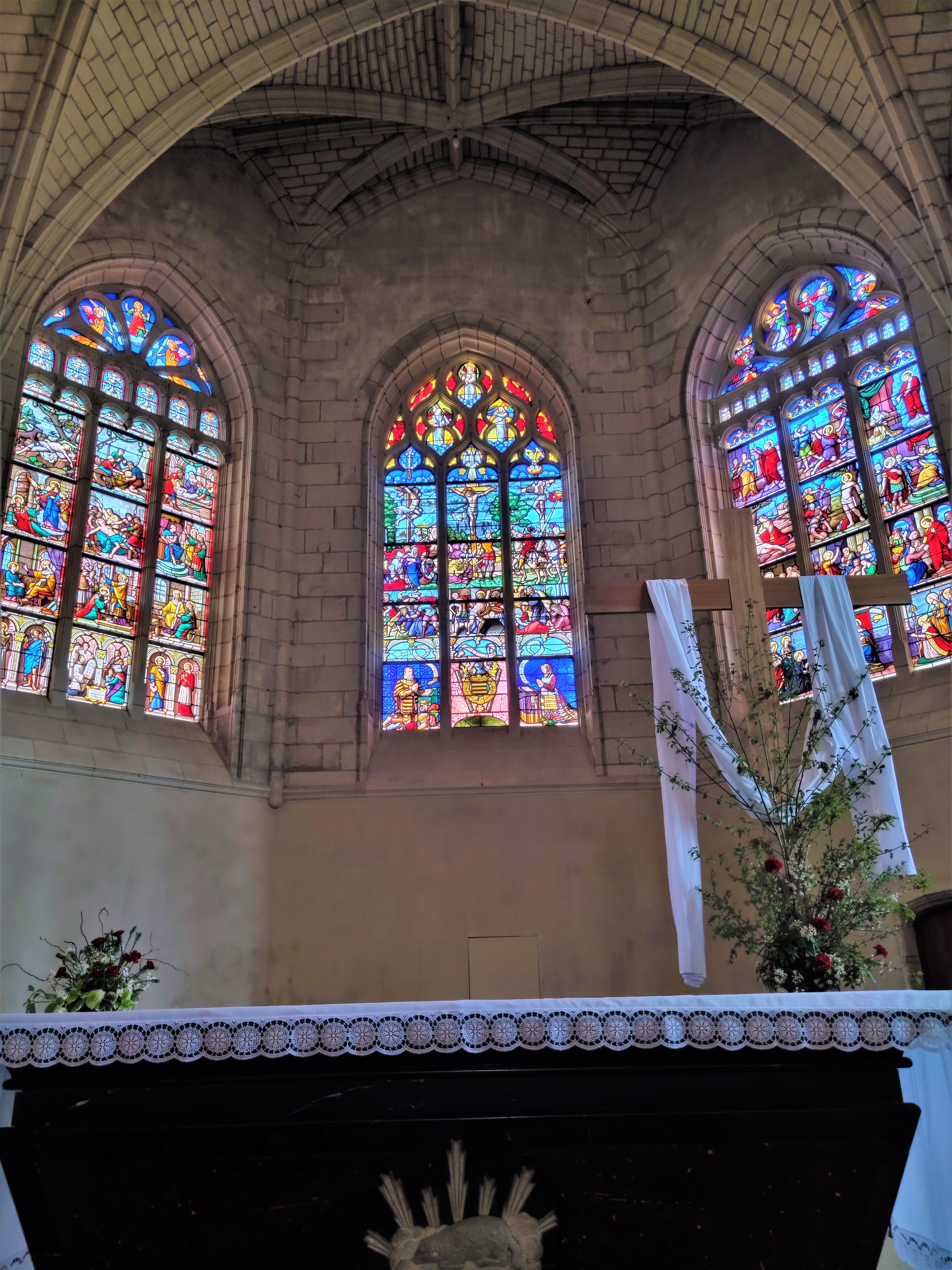 j'aime beaucoup cette eglise, qui dédiée au saint patron des vignerons est reconstruite au 16e siècle sur un édifice antérieur du 14e. Elle est composée d'une large nef, de deux bras de transepts peu saillants et d'un chevet à pans. Une cloche offerte par les Cossé-Brissac date de 1574. Une autre verrière complète date des années 1532-1540 et a été offerte par René de Cossé et Charlotte Gouffier.