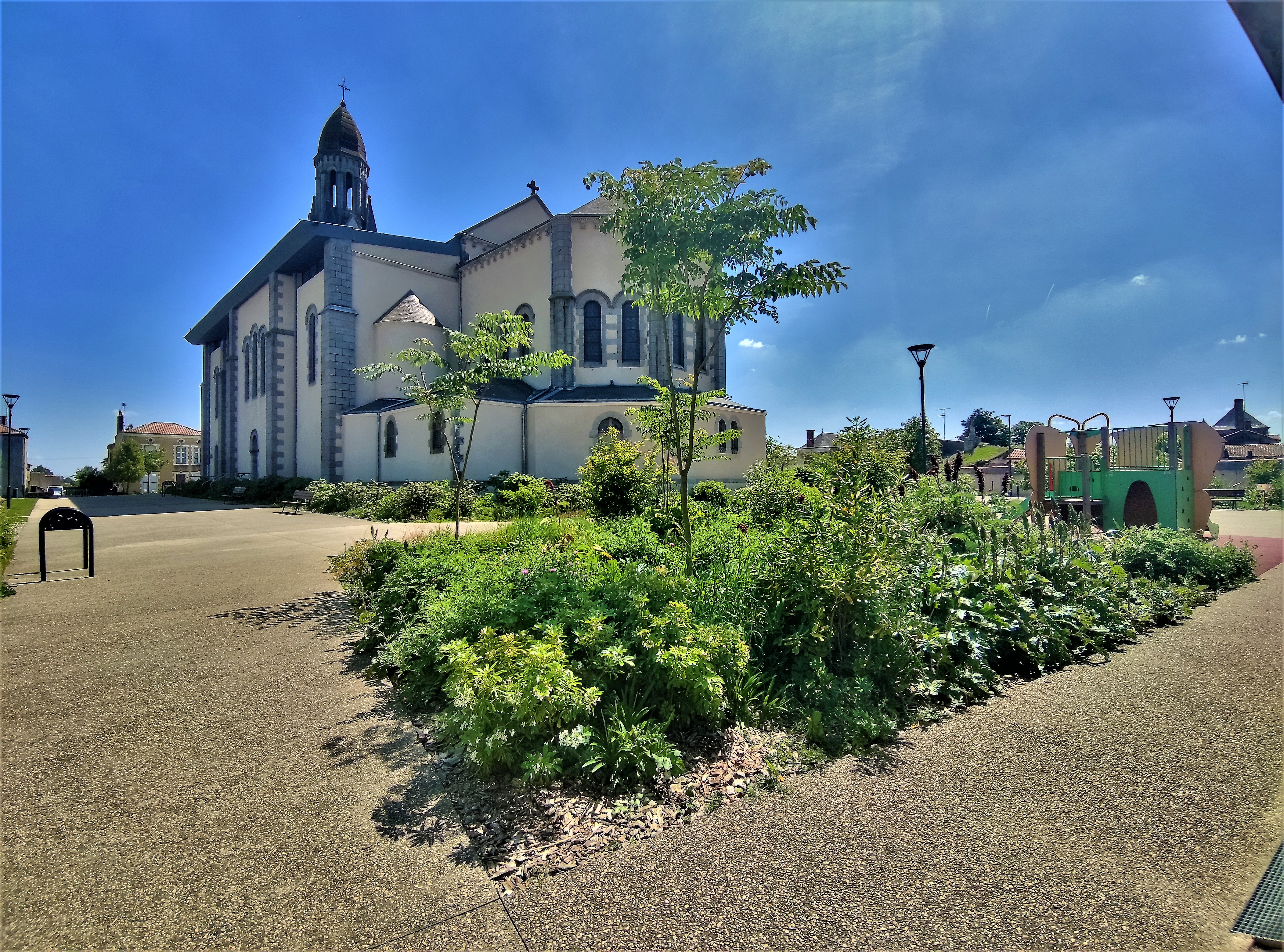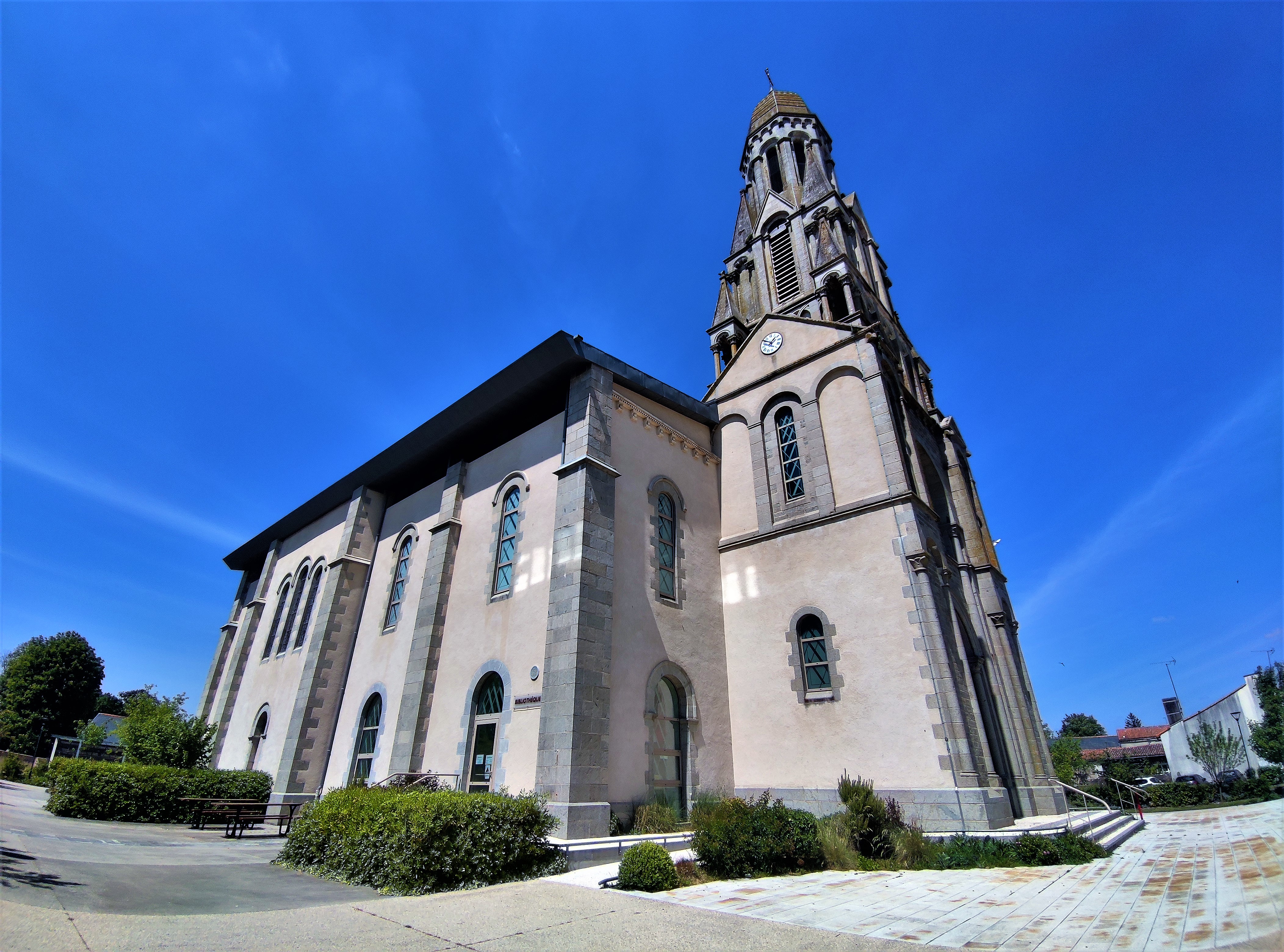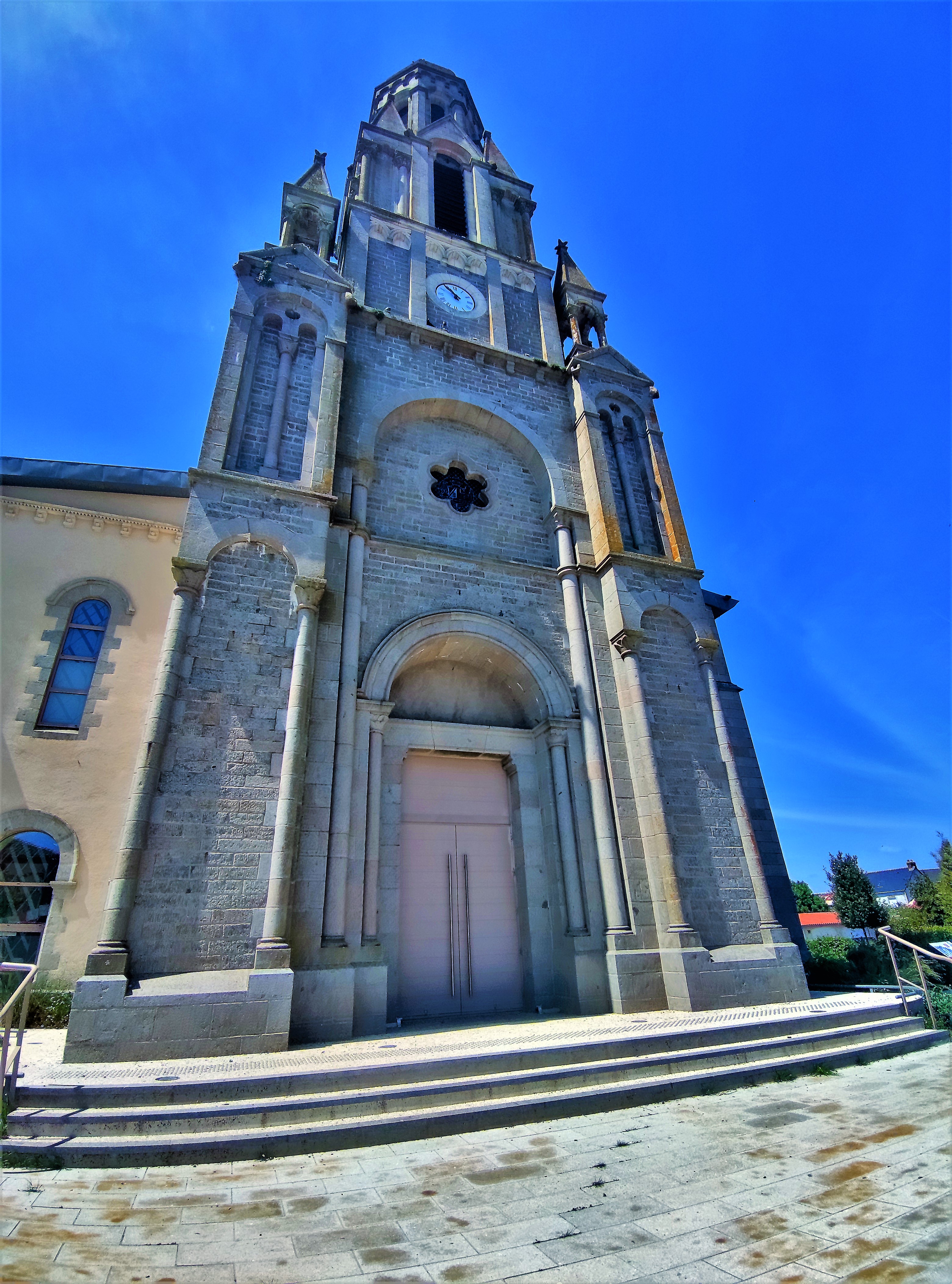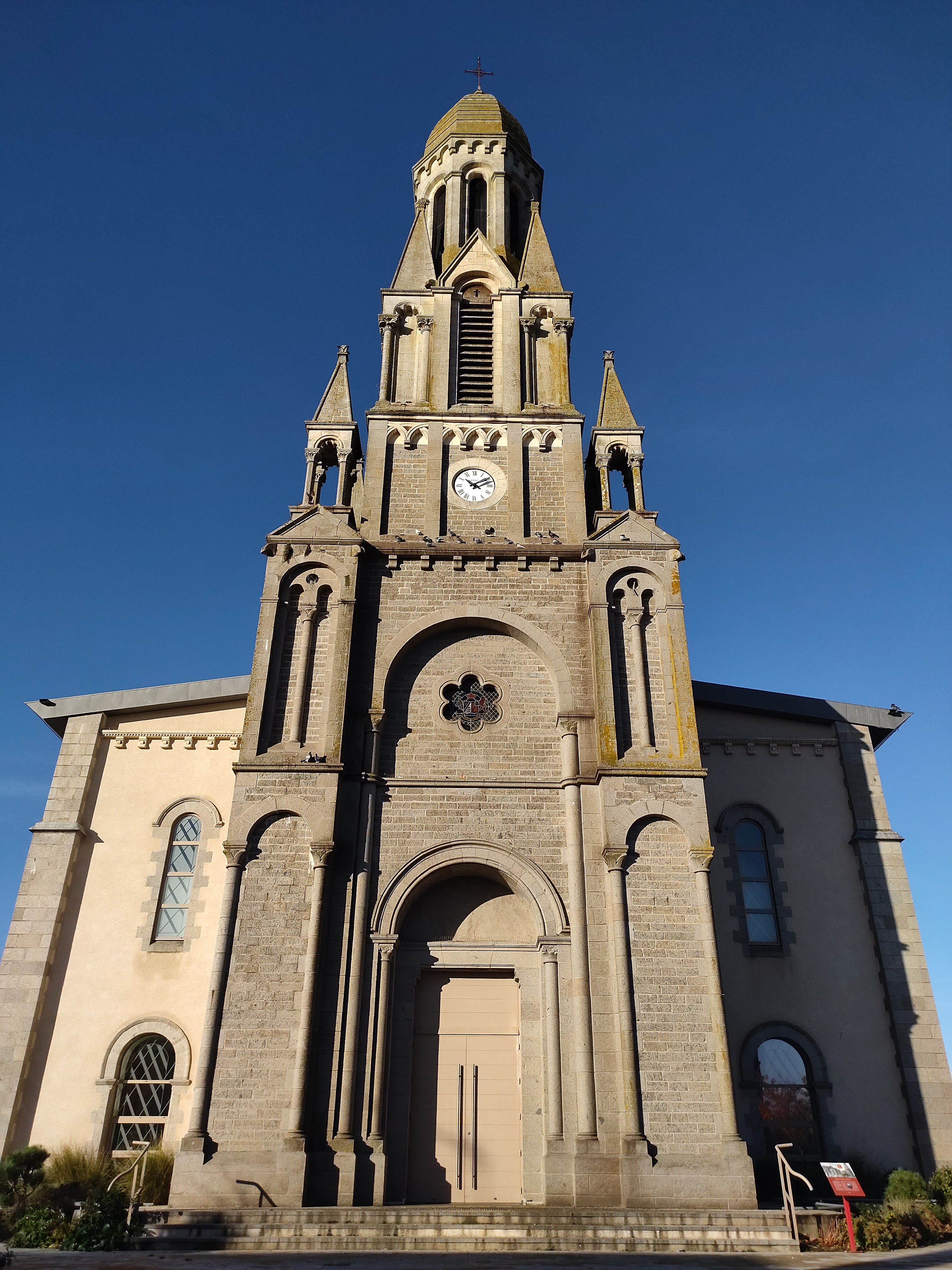 Une église surprenante, extérieurement de style romano-byzantin, l'intérieur est d'une modernité bluffante et superbe. Cette église, construite à partir de 1895, fut bénie en 1898 et consacrée en 1900. Un incendie détruisit l'intérieur, voûte, charpentes et autres maçonneries en 2010. Un projet novateur fut réalisé, offrant un espace intérieur terriblement accueillant, l'église rénovée fut bénie en 2013. Il y a de nombreuses choses à découvrir autour de cette église, la chapelle, le vieux clocher, le château et son parc, le calvaire, etc...