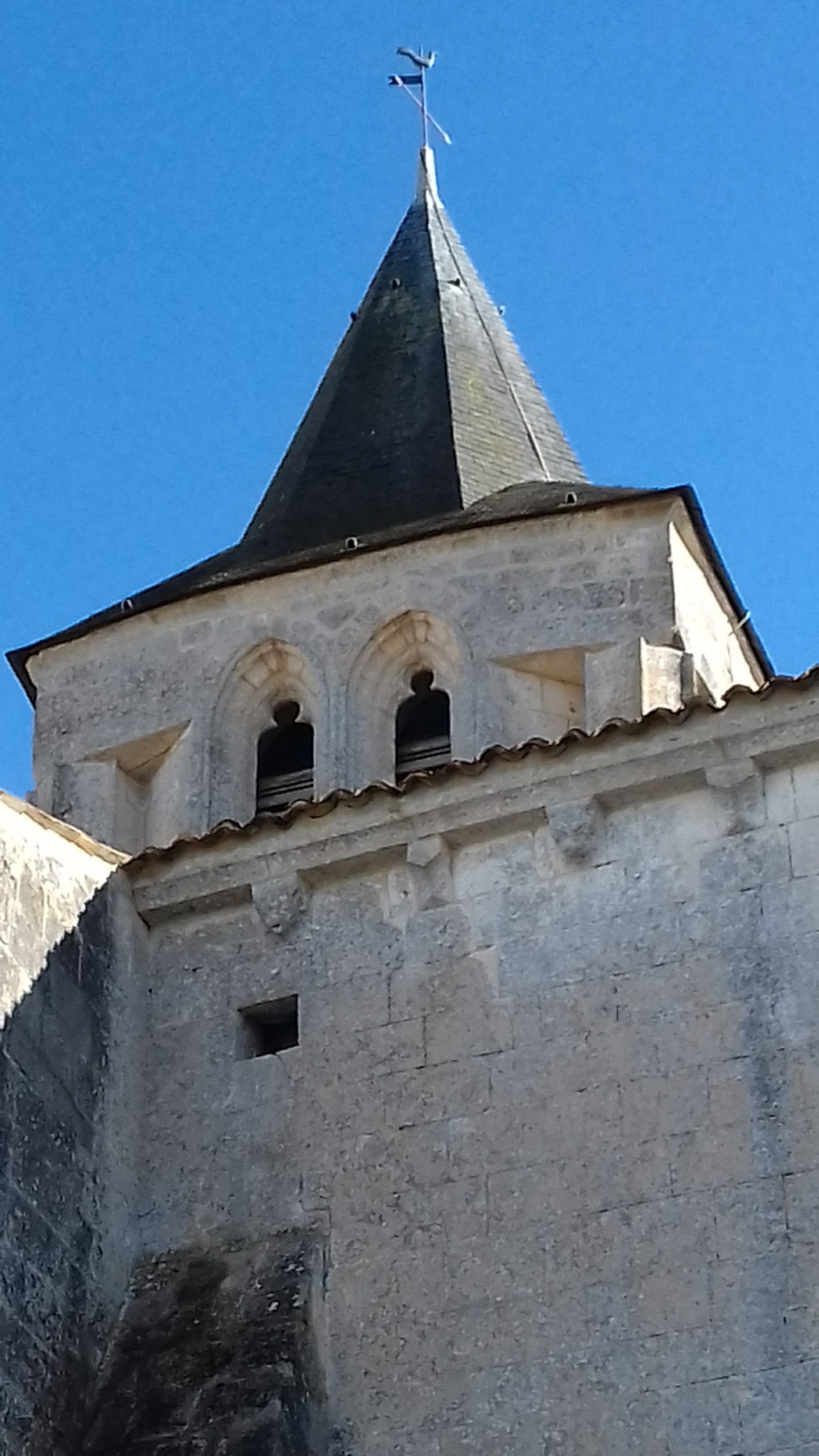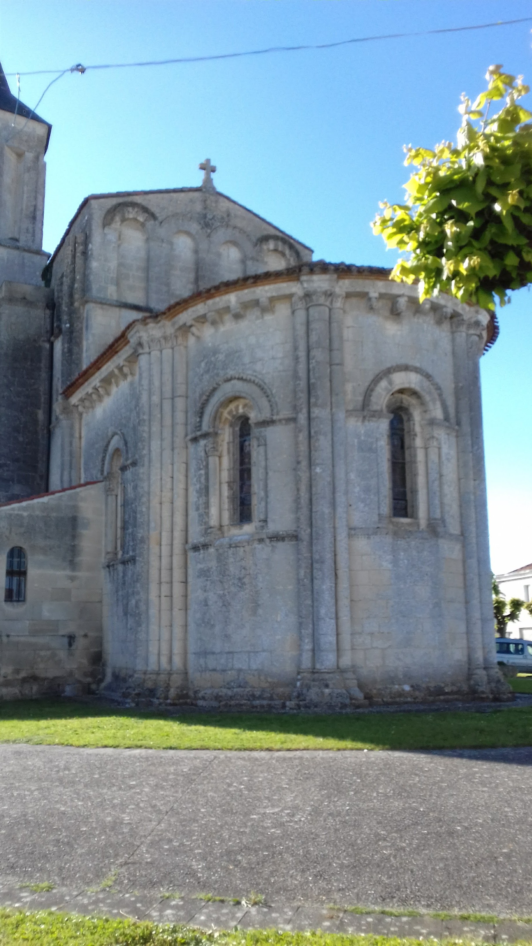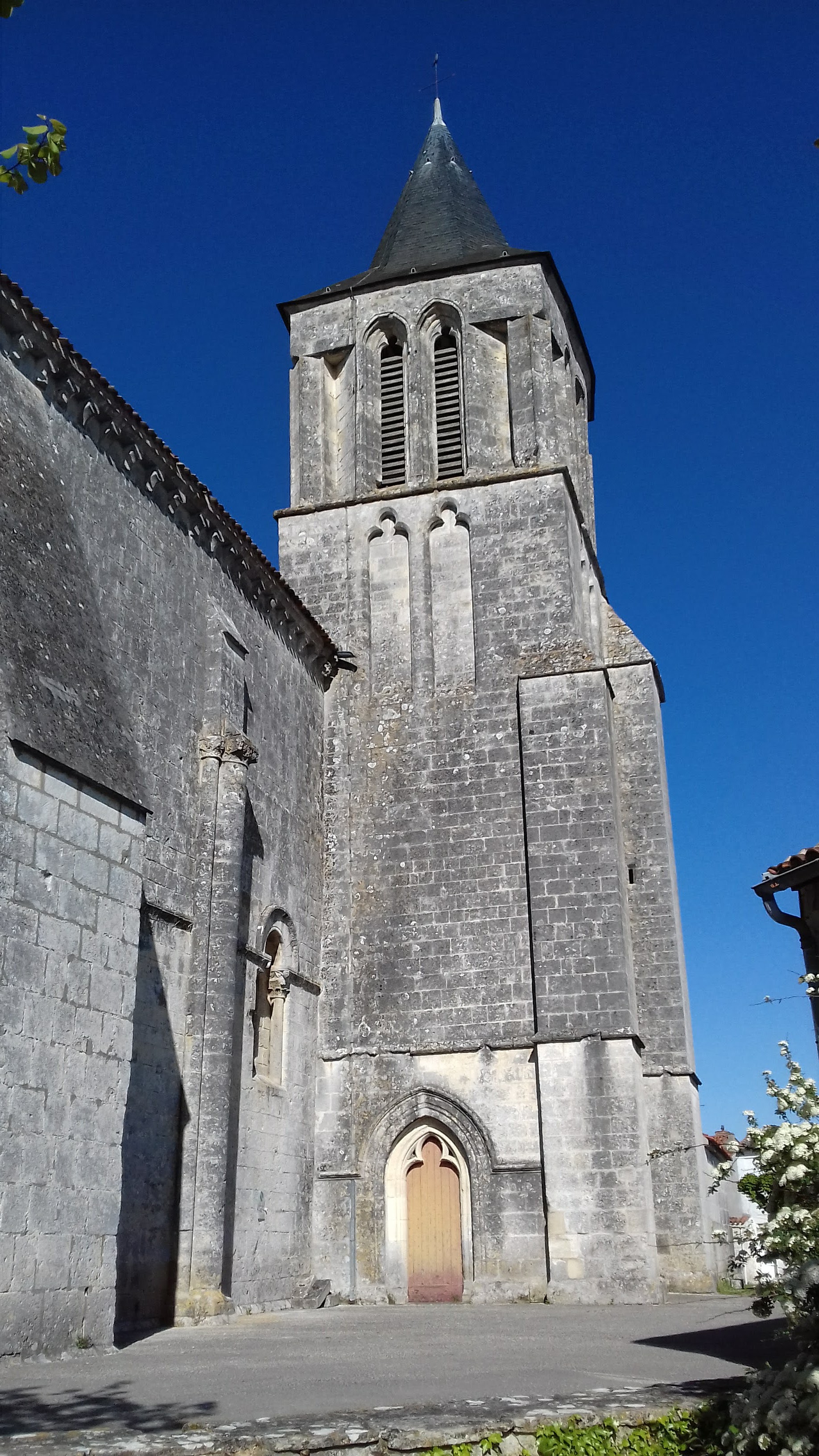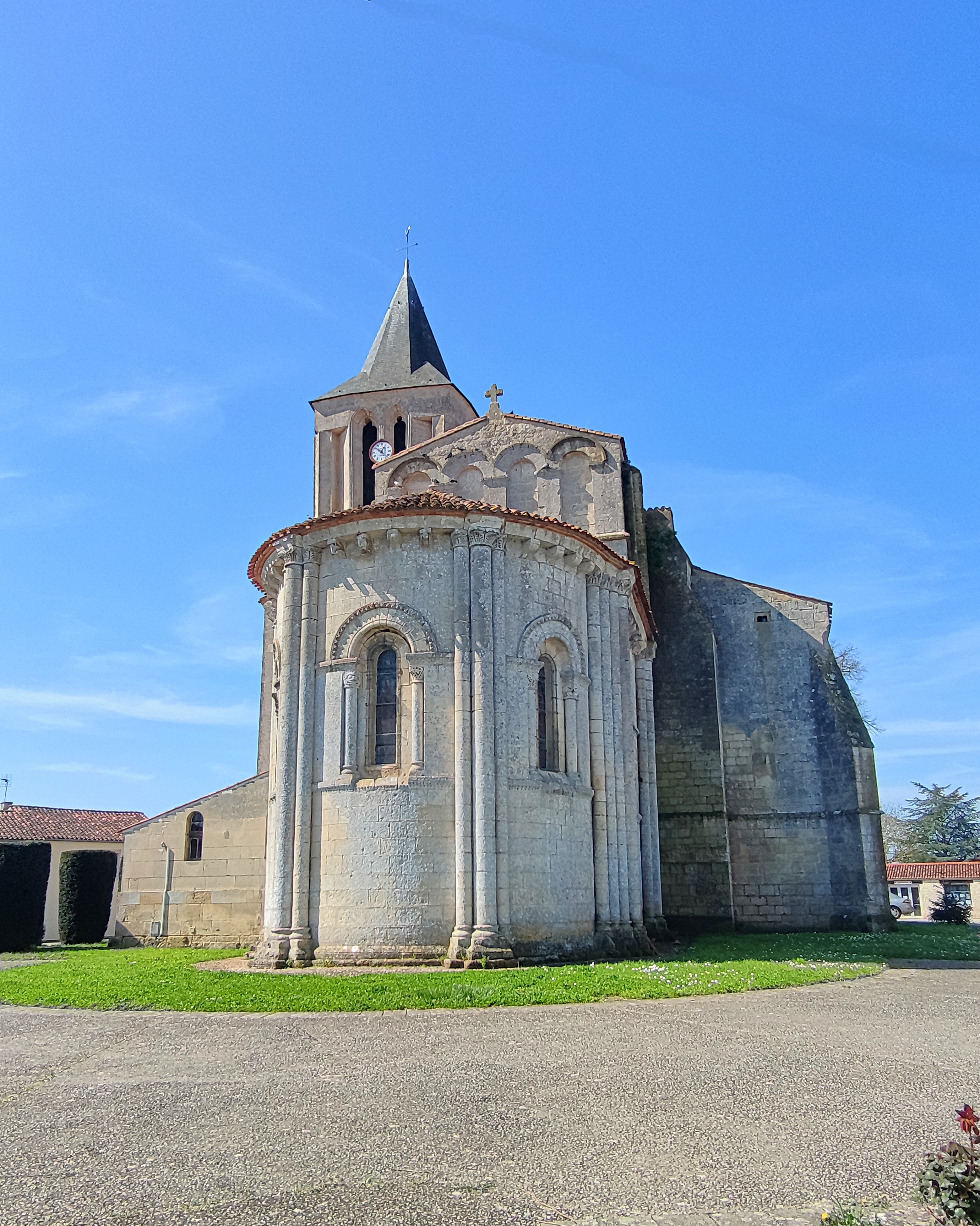 Église classée par les MH depuis 1984, elle est imposante et bien mise en valeur sur une place. Je n'ai vu que l'extérieur mais cela m'a bien plu. Il n'y a aucun affichage pour indiquer les horaires d'ouverture ou les possibilités de visites, au vu des photos, peu ont réussi à entrer. Église romane du 12è dévastée pendant les conflits féodaux de la guerre de cent ans, elle fut restaurée et agrandie au 15è ; mélange de styles, en faire le tour est intéressant, son architecture démontre la maitrise des anciens bâtisseurs. Le chevet (roman) se prolonge à l'Ouest par une travée portant les restes du clocher primitif arasé (roman), puis c'est la travée du transept (gothique) et le clocher gothique accolé au Sud.