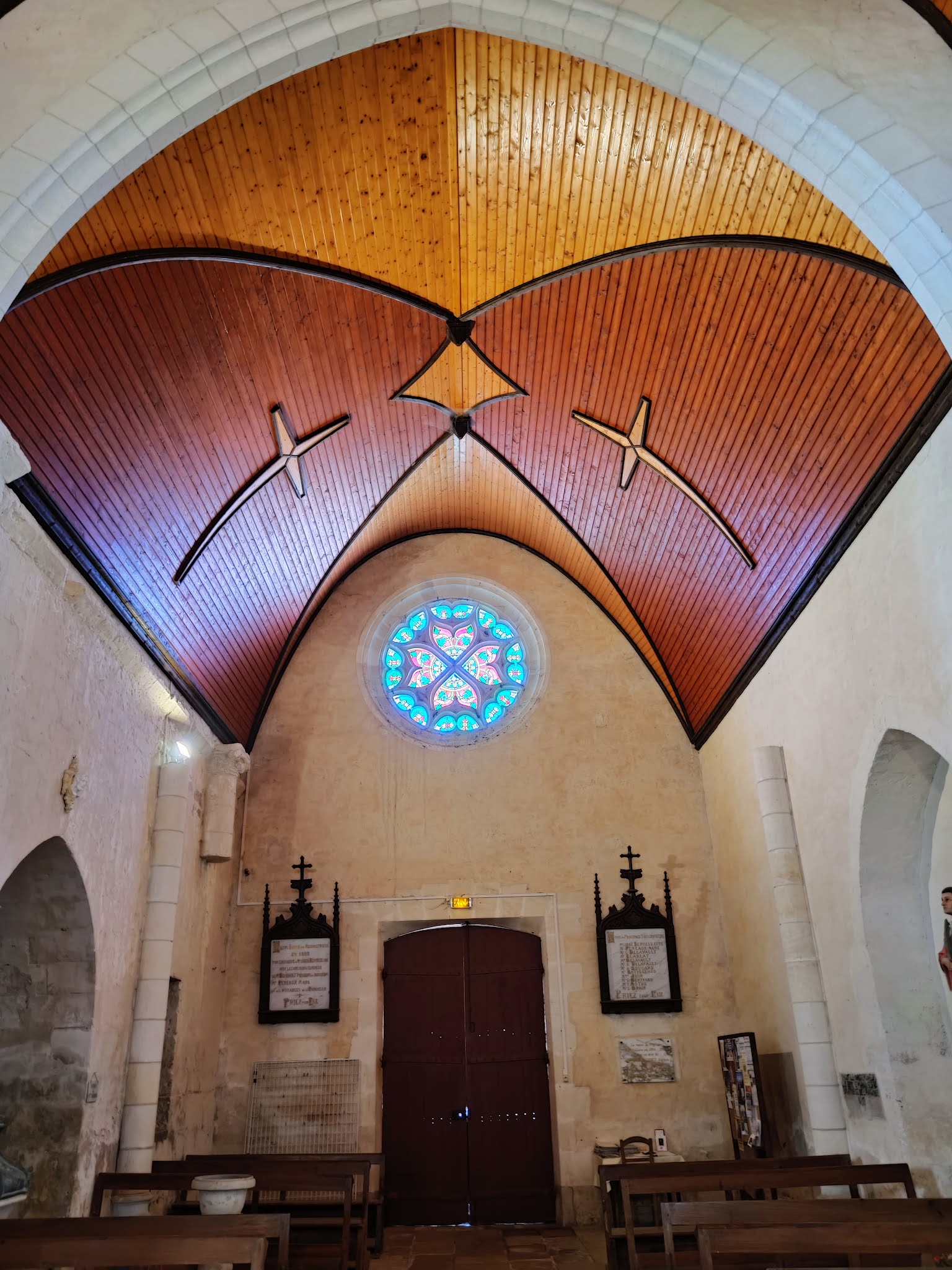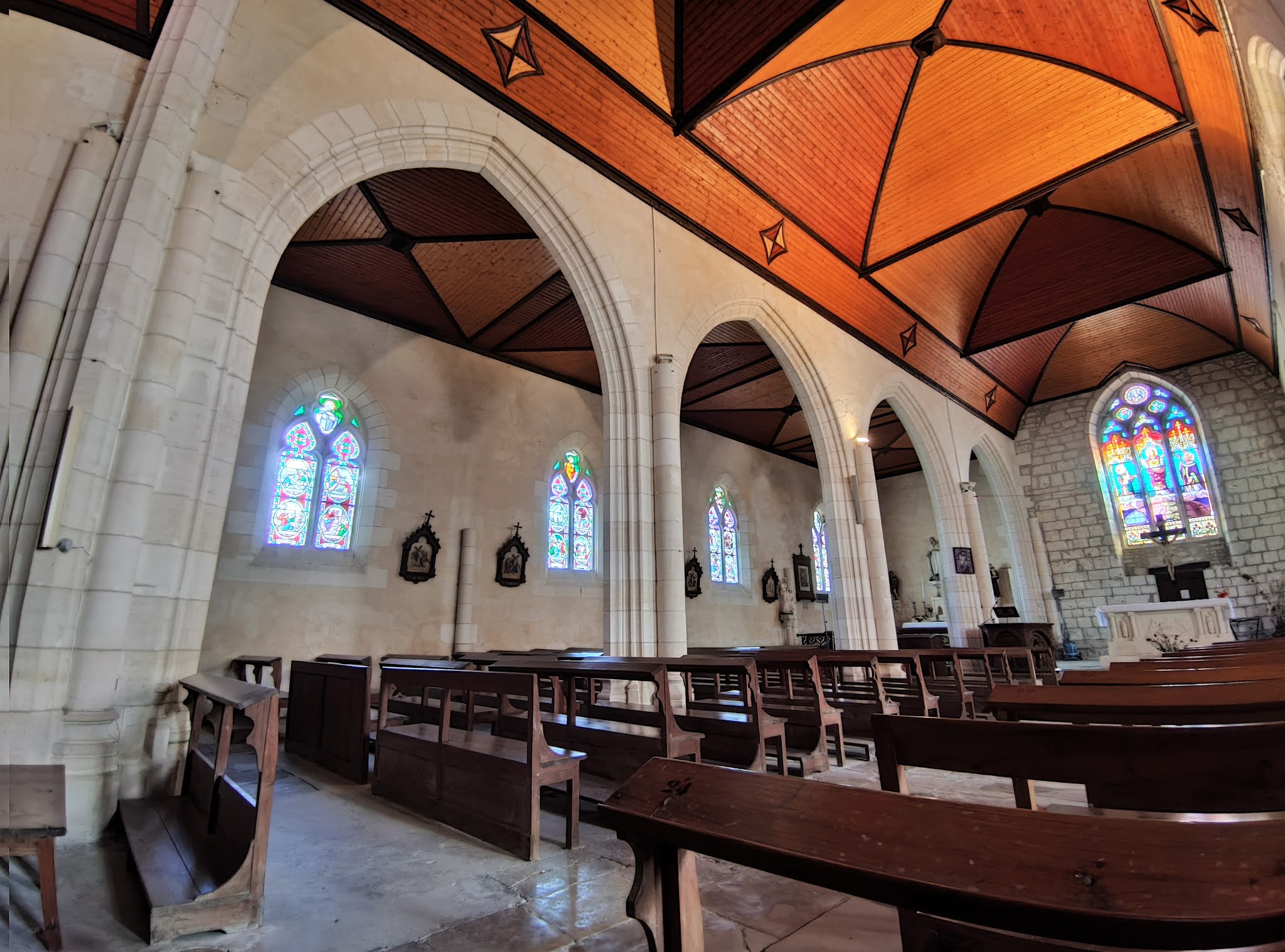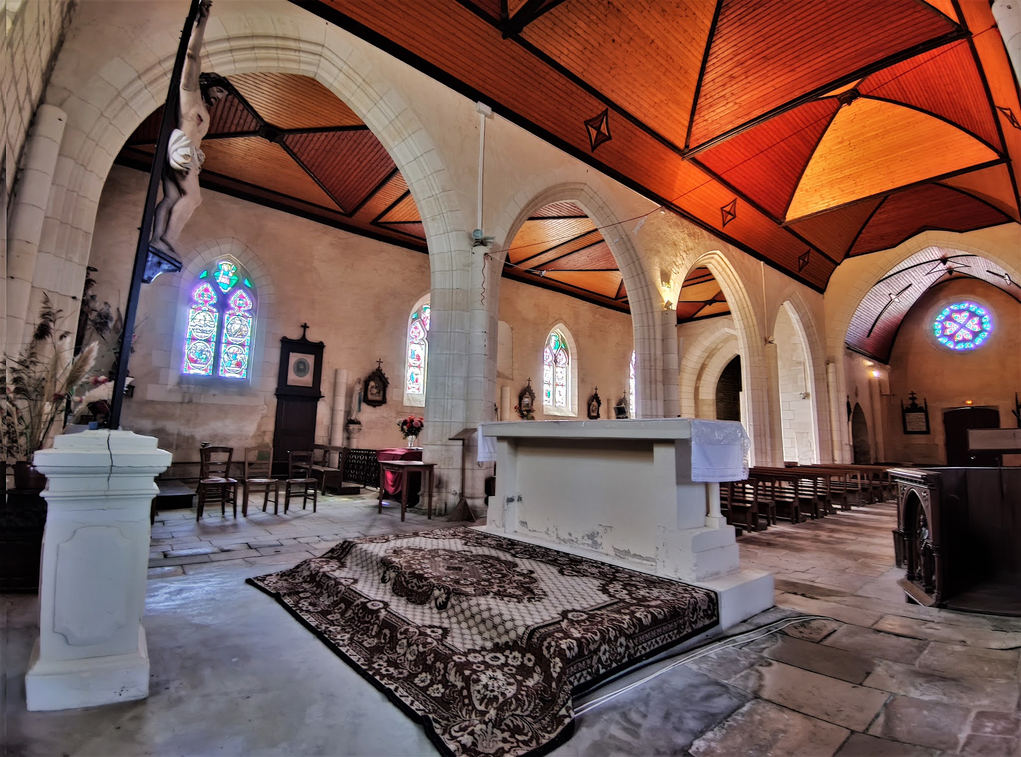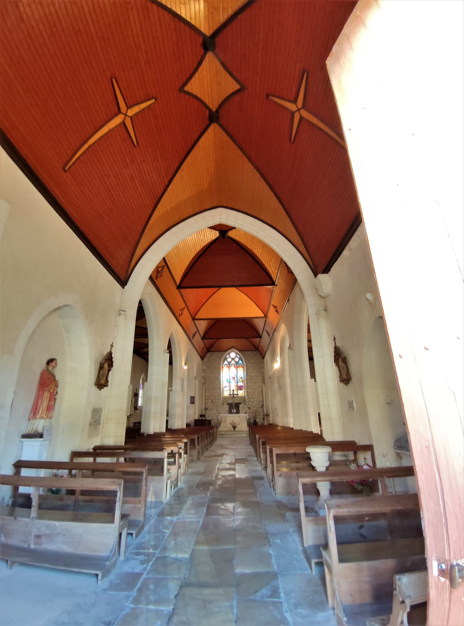 Elle mérite une visite, j'ai apprécié la joyeuse élégance de cette construction du 19ème siècle. La première église date du 13ème siècle, elle a été agrandie au 17ème siècle et presque entièrement reconstruite à partir de 1888. Quelques pans de murs et un pilier restent de l'église primitive. La nouvelle église est d'inspiration gothique, la nef possède 3 vaisseaux recouverts de voûtes lambrissées originales et colorées. Le vaisseau principal est voûté en croisées d'ogives et les collatéraux sont plafonnés. Eglise en bel état, l'éclairage offert par les vitraux historiés met joliment en valeur les teintes chaudes des voûtes. Elle mérite une visite, j'ai apprécié la joyeuse élégance de cette construction du 19ème siècle.