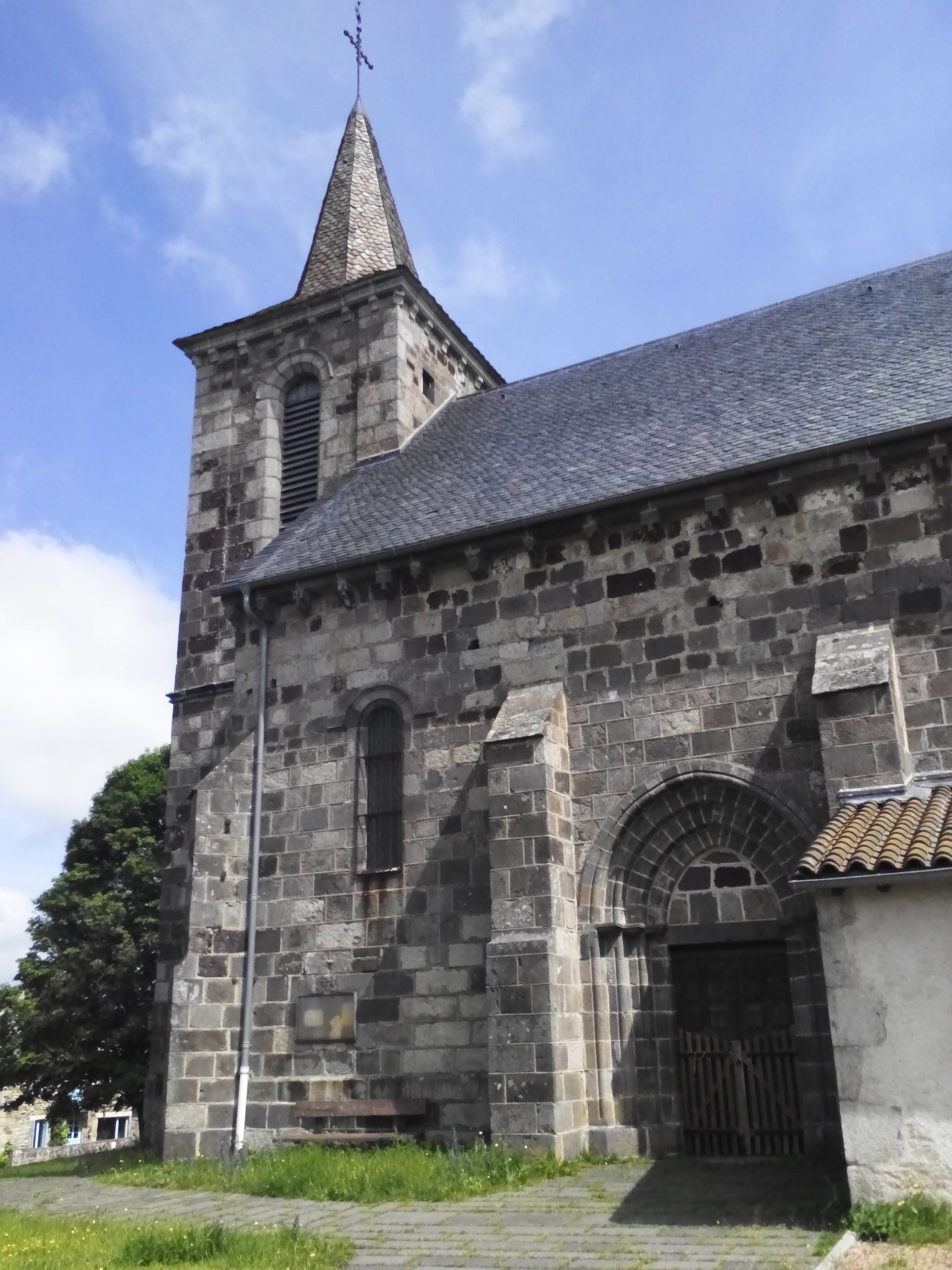 L'entrée s'effectue au niveau de la façade sud, au niveau de la seconde travée, qui est percée d'un portail à voussures et piédroits en arc brisé. Les trois autres travées de la facade comportent chacune une baie en plein-cintre munie de vitraux. La facade ouest est elle aussi percée de deux étroites ouvertures, en plein cintre avec vitraux, de part et d'autre de la tour-clocher. Il est à noter que les encadrements de baies sont en lave (andésite). La tour clocher carrée comprend deux niveaux d'élévation. Au premier elle est ouverte par deux étroites baies en plein cintre sur les faces nord et sud. Le second niveau est lui percé sur les quatre faces de baies en plein cintre avec abat-sons. Le clocher est surmonté par une flèche se terminant par une croix. Les autres faces Nord et Est ne sont pas dotées d'ouvertures. La nef est couverte par une toit en bâtière et le clocher est par une toiture en pavillon, le tout en ardoise.