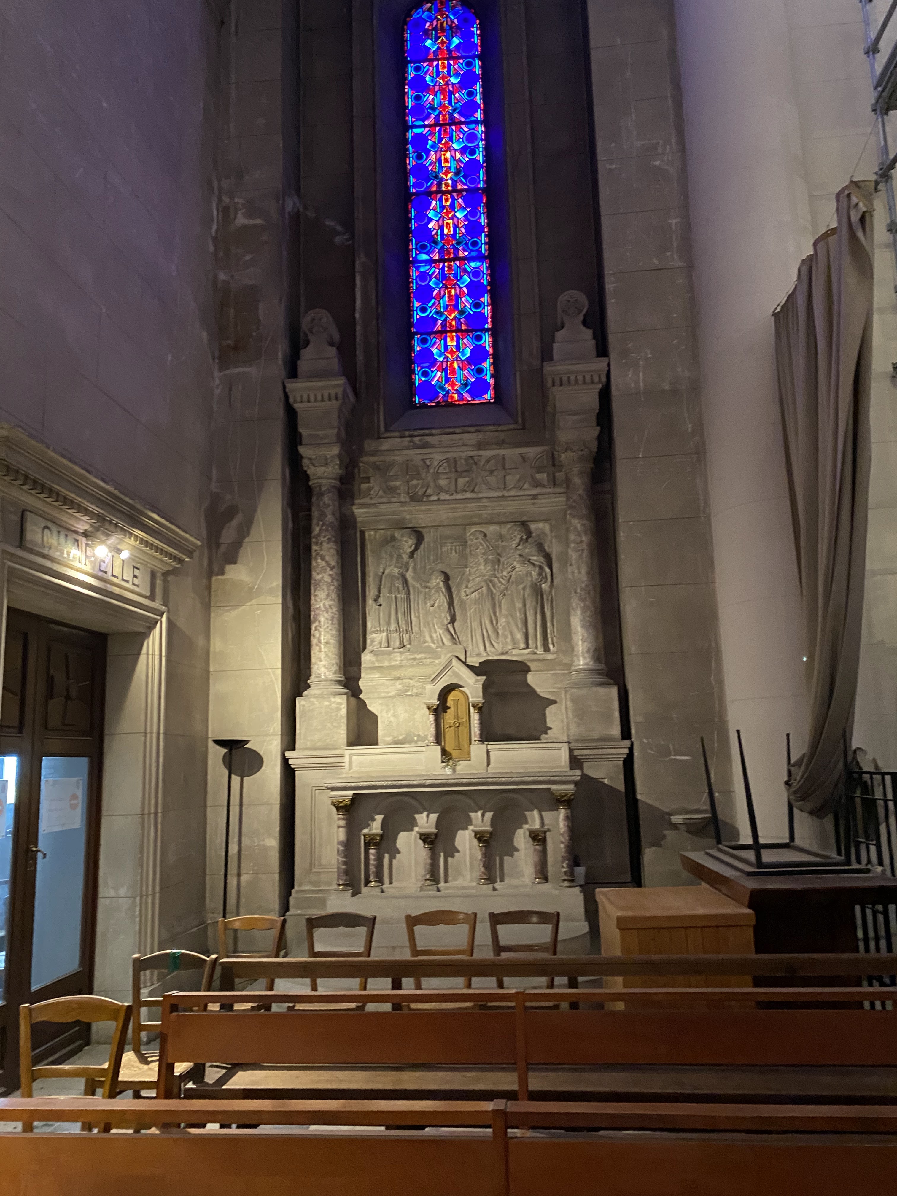 Il y a quelque chose de touchant dans cette église, les couleurs des vitraux modernes tirant sur le vert, le mélange de bas cotes rénovés blanchis avec le déambulatoire encore assombri par le temps