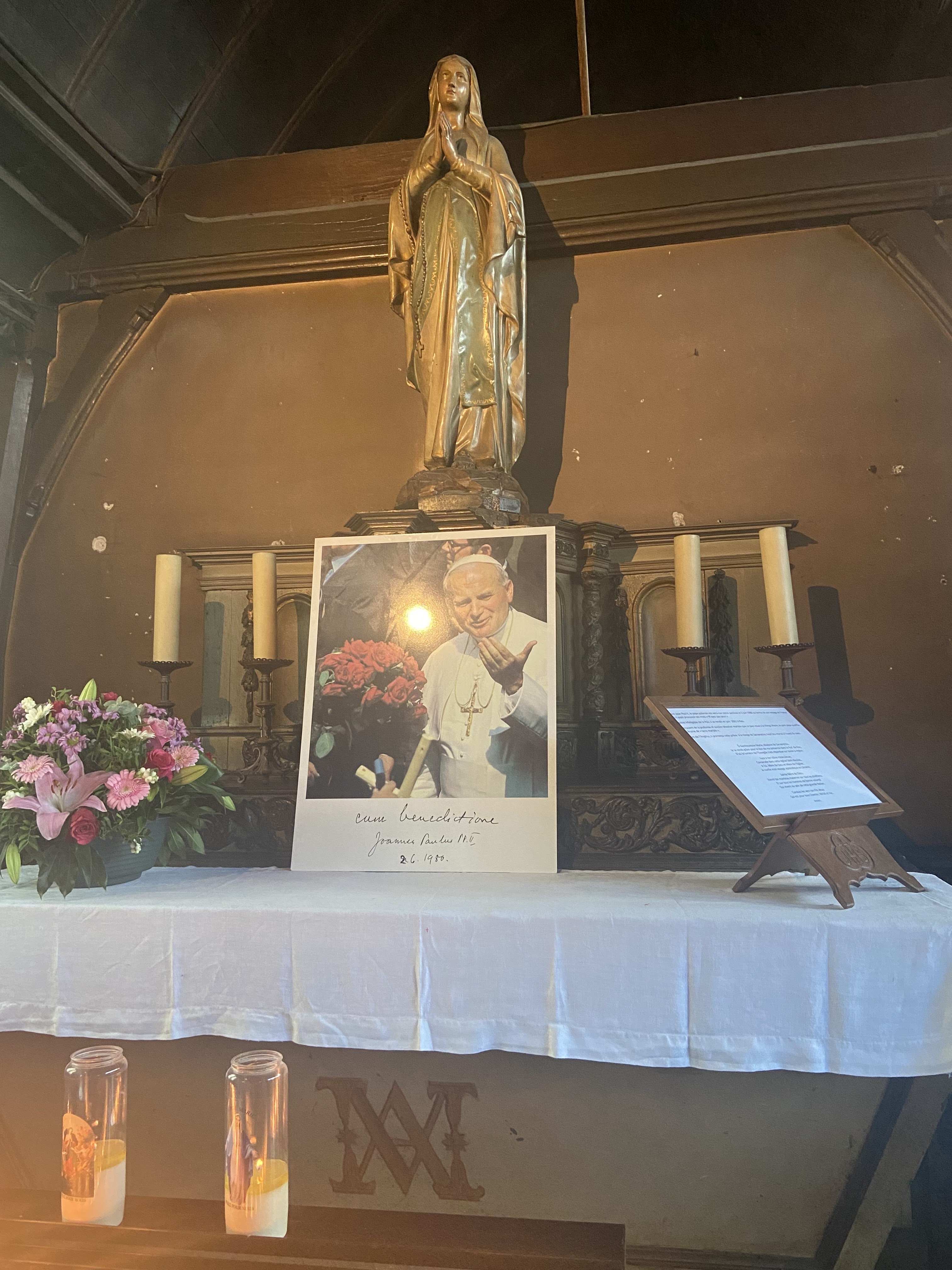 Lieu apaisant et entretenu. Les bougies et cierges sont magnifiques. Nous sommes venus nous recueillir avec ma mère et nous avons été tres touché par l'endroit. Jai bien aime l'idée original que de mettre une message en fond sonore. Je recommande aux amateurs d'église d'y entrer.