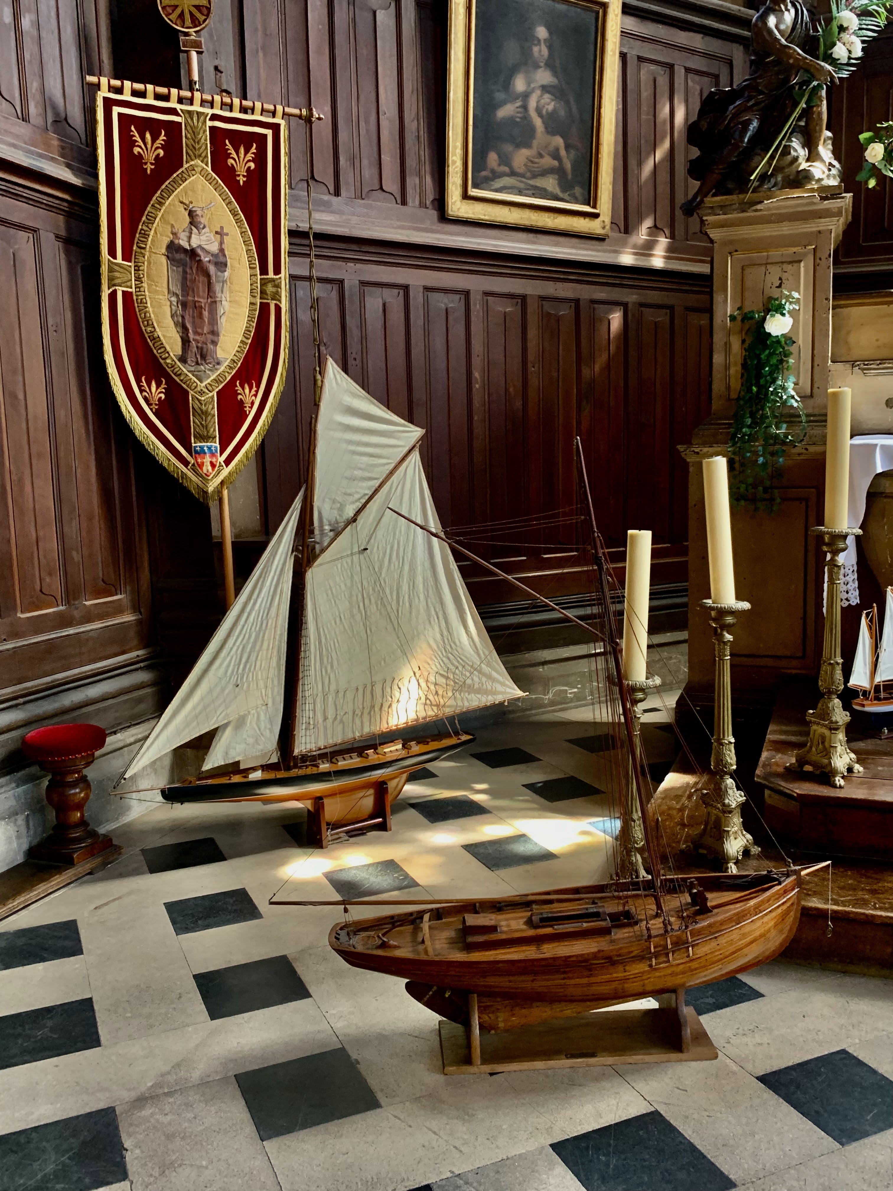 Magnifique église en forme de coque de bateau. Complètement atypique. Bel endroit de recueillement. Préparation pour la procession du 15 août avec des maquettes de bateaux.